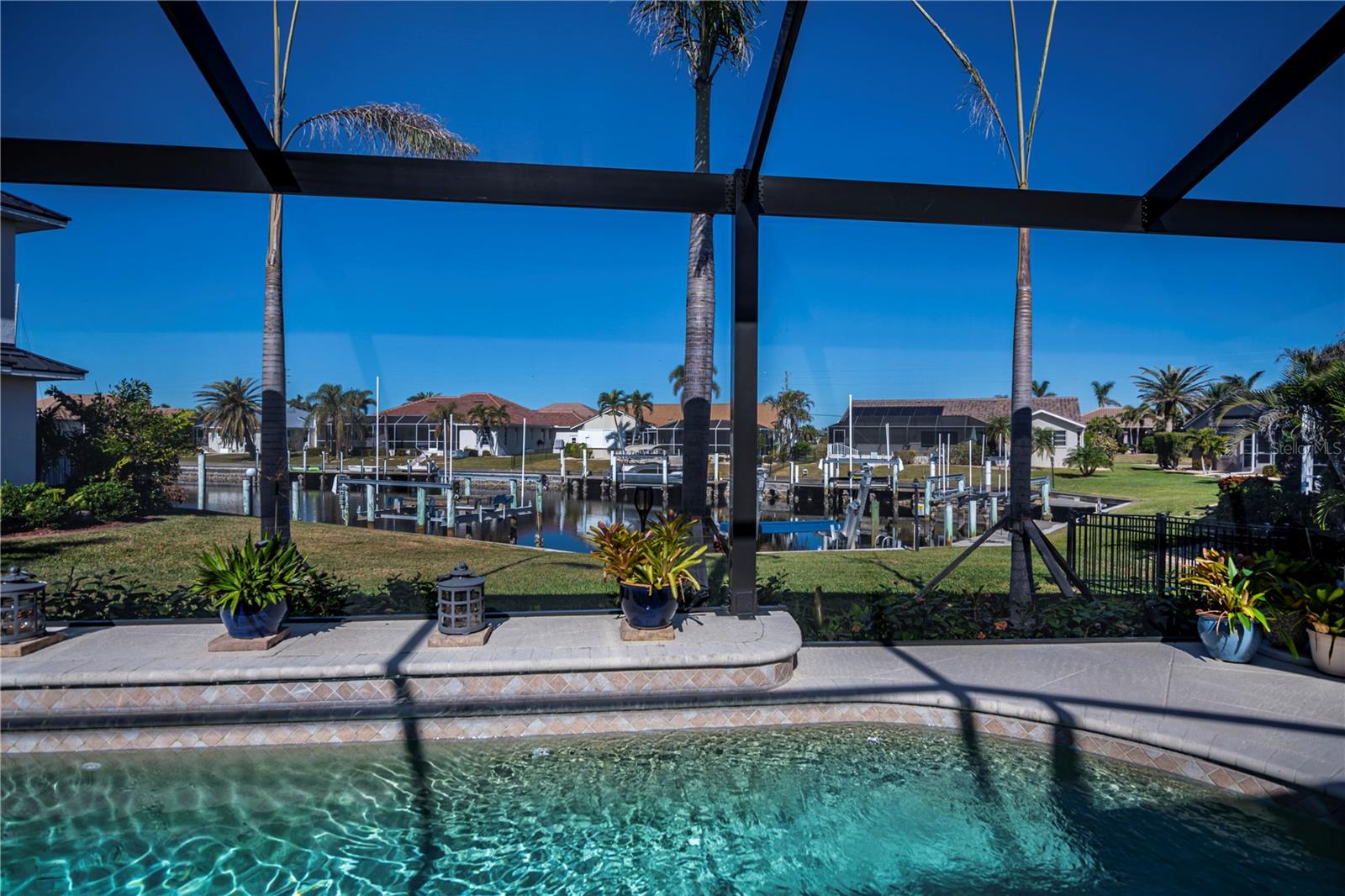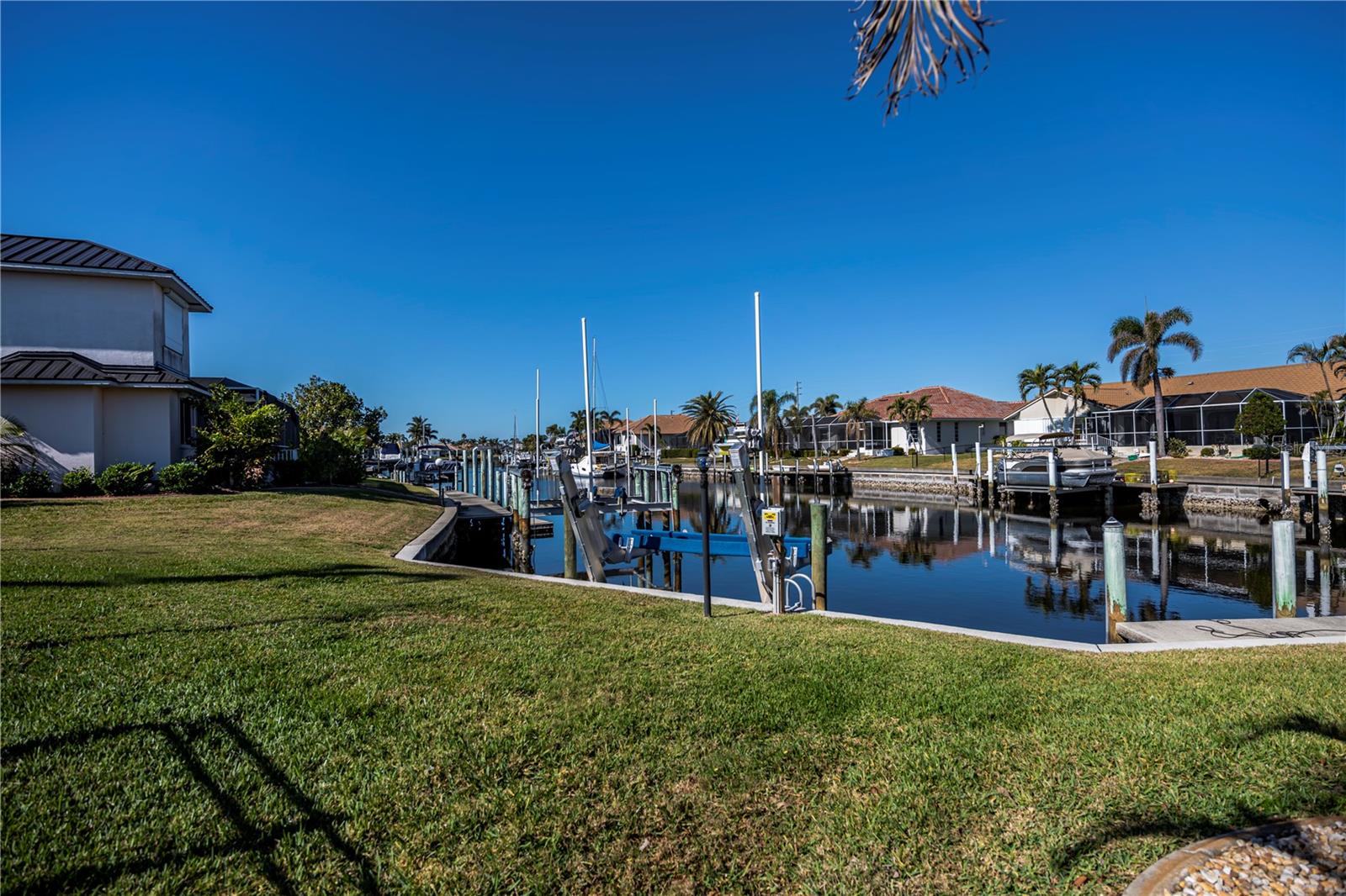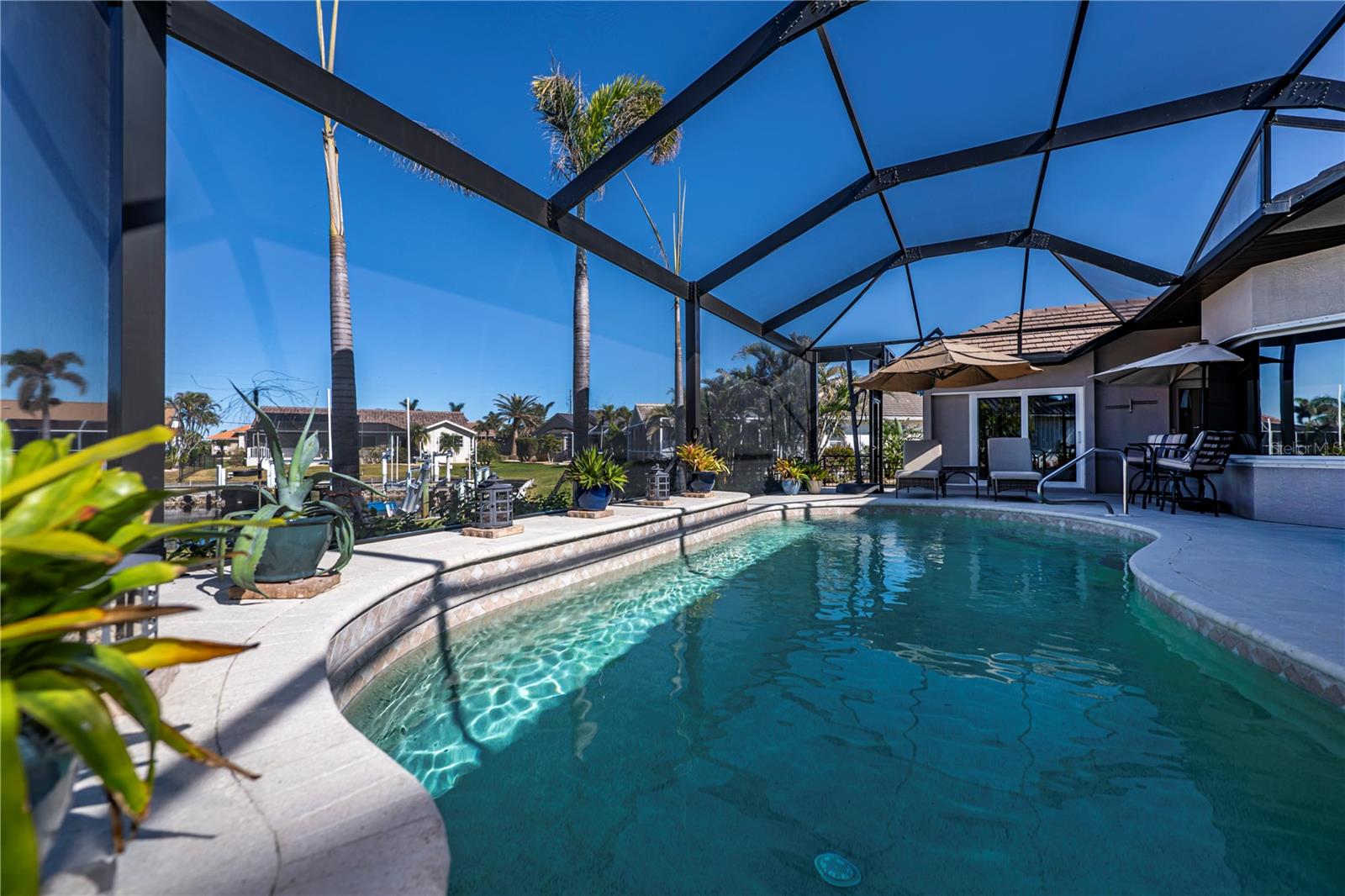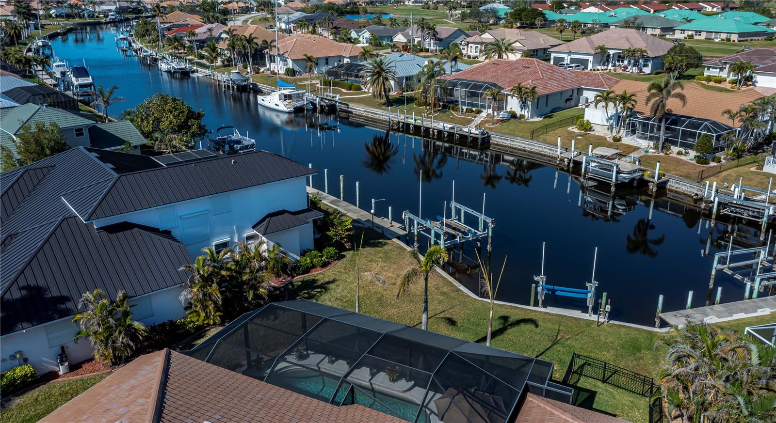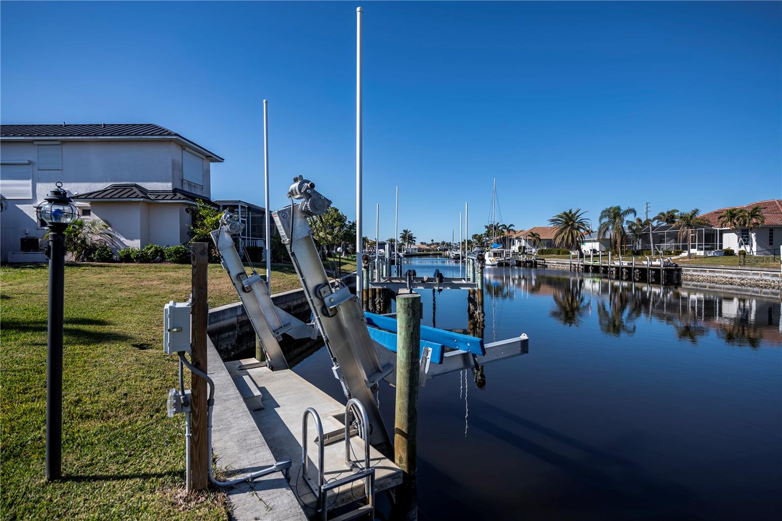 Just REDUCED! Take a look at this beautiful sailboat access great room home with 3 bedrooms plus a study, 2 baths and a 3 car garage! As you enter the house you will notice the volume ceilings and stepped up crown molding in the living area. The kitchen features 42in. wood cabinets, breakfast bar and solid surface counters. The home has zero-corner sliders in the great room and aquarium sliders in the breakfast room so you can really bring the outdoors in! The spacious lanai features and outdoor kitchen (2022) with refrigerator, granite counters and a propane grill-great for entertaining! Check out the new panoramic screen cage(2023) on the lanai! Bring your boat for a fun day on the water as the 10,000 lb boat lift(2022)-can accommodate up to a 28 ft boat-per installer. Even the seawall was replaced in 2024 and the city-maintained seawall replaced 2022. No storm damage here-there are impact windows(2022) as well as an electric roll down hurricane screen for the lanai(2023). Accordion shutters are used for the aquarium glass. The master bedroom has wood floors as well as crown molding. There is an extra mini-split air conditioner as the owner's love the extra cool air in the summer. The master bath has a walk-in shower as well as a soaking tub. Other updates include new air conditioner and ducts in 2022, 7 ceiling fans, water filtration and softener system(2022), hot water tank(2023), aluminum fenced dog area, and new roof in 2022. Off of the oversized three car garage is a paved 12x13 outdoor storage area-great for a kayak! This home was recently professionally landscaped and exterior lighting was added. There is a circular driveway. See this home today! You won't be disappointed!