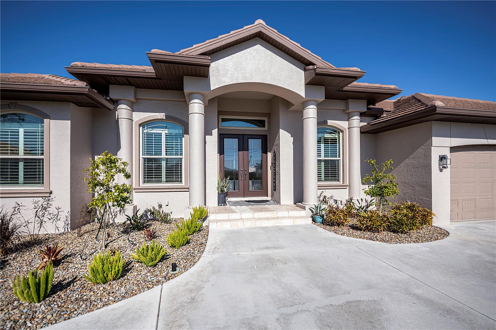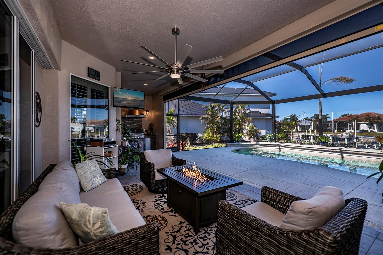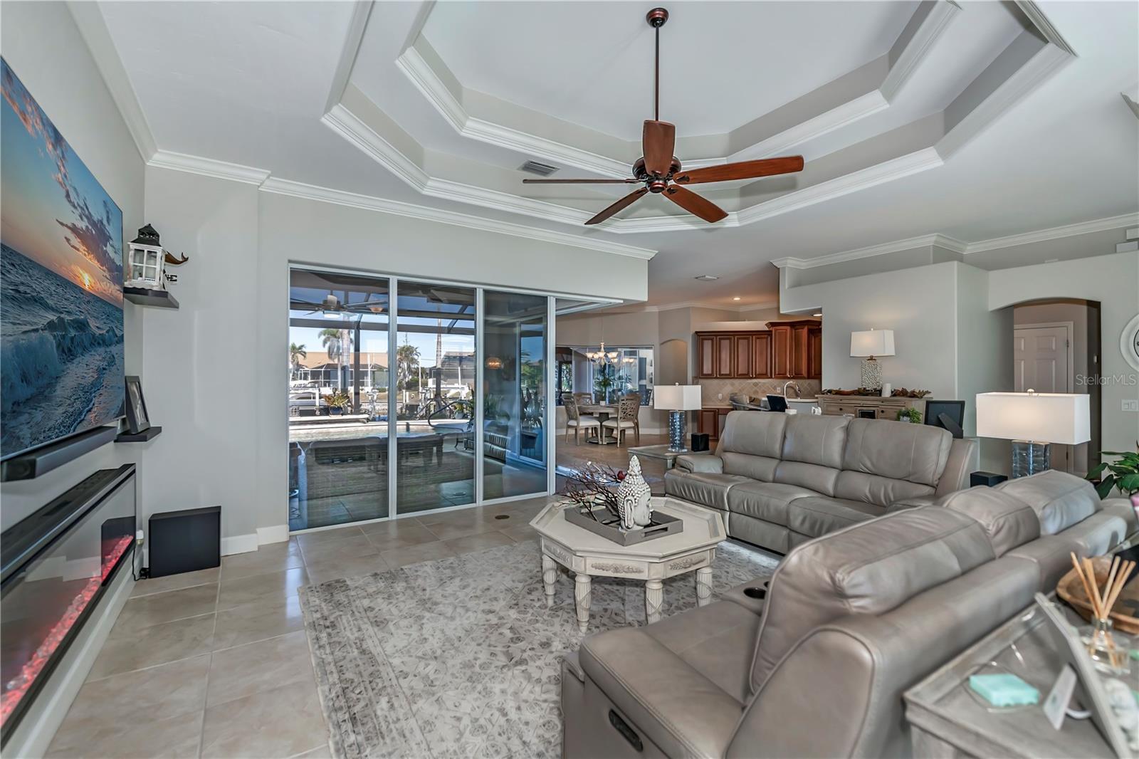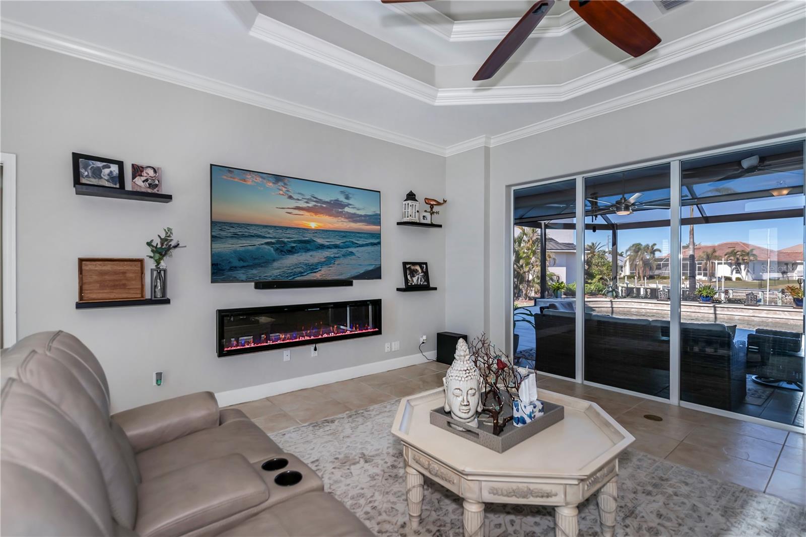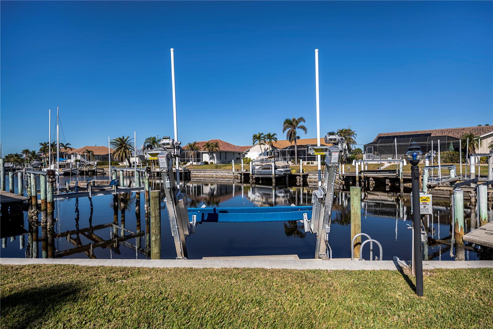 Just REDUCED! Take a look at this beautiful sailboat access great room home with 3 bedrooms plus a study, 2 baths and a 3 car garage! As you enter the house you will notice the volume ceilings and stepped up crown molding in the living area. The kitchen features 42in. wood cabinets, breakfast bar and solid surface counters. The home has zero-corner sliders in the great room and aquarium sliders in the breakfast room so you can really bring the outdoors in! The spacious lanai features and outdoor kitchen (2022) with refrigerator, granite counters and a propane grill-great for entertaining! Check out the new panoramic screen cage(2023) on the lanai! Bring your boat for a fun day on the water as the 10,000 lb boat lift(2022)-can accommodate up to a 28 ft boat-per installer. Even the seawall was replaced in 2024 and the city-maintained seawall replaced 2022. No storm damage here-there are impact windows(2022) as well as an electric roll down hurricane screen for the lanai(2023). Accordion shutters are used for the aquarium glass. The master bedroom has wood floors as well as crown molding. There is an extra mini-split air conditioner as the owner's love the extra cool air in the summer. The master bath has a walk-in shower as well as a soaking tub. Other updates include new air conditioner and ducts in 2022, 7 ceiling fans, water filtration and softener system(2022), hot water tank(2023), aluminum fenced dog area, and new roof in 2022. Off of the oversized three car garage is a paved 12x13 outdoor storage area-great for a kayak! This home was recently professionally landscaped and exterior lighting was added. There is a circular driveway. See this home today! You won't be disappointed!