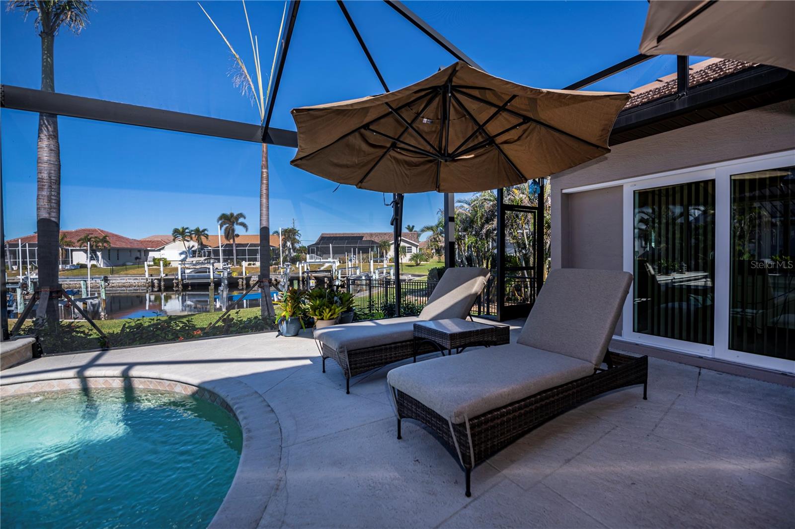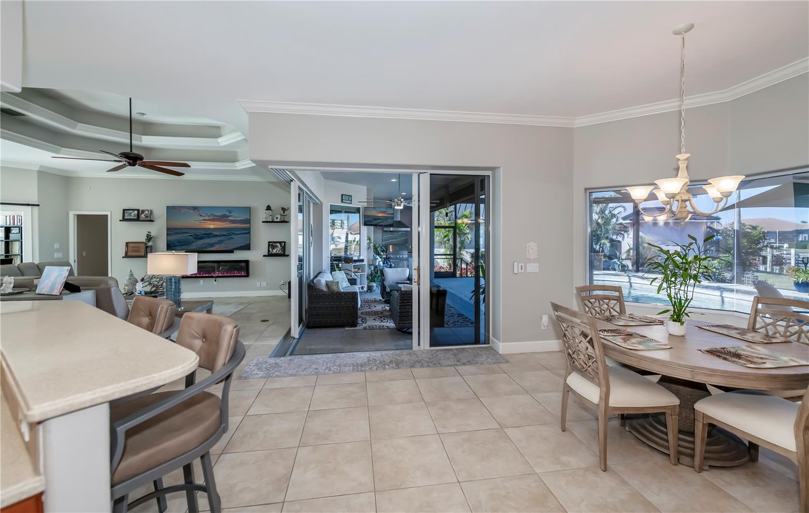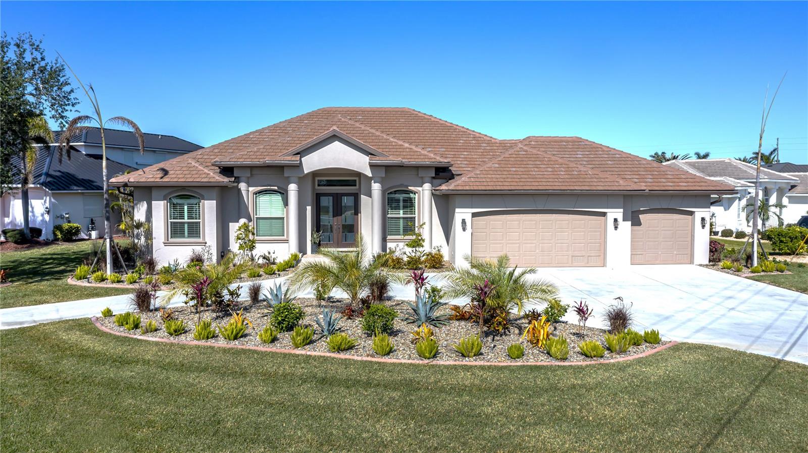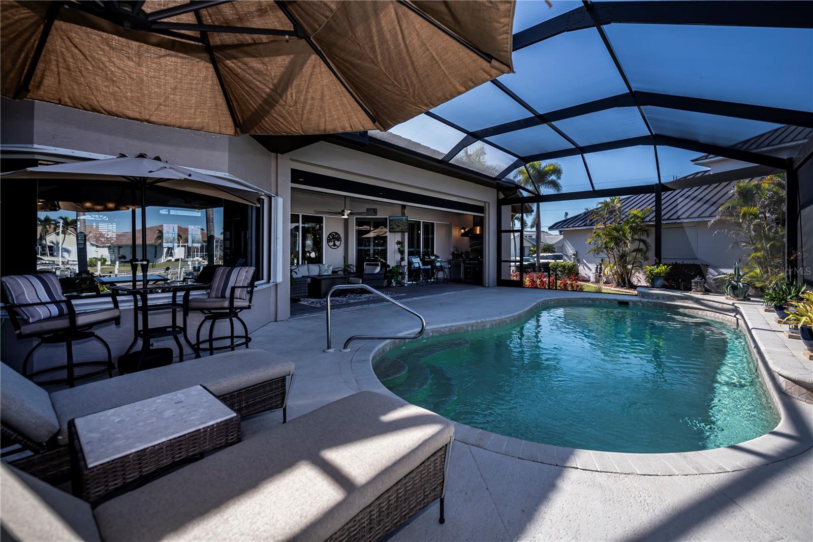 Just REDUCED! Take a look at this beautiful sailboat access great room home with 3 bedrooms plus a study, 2 baths and a 3 car garage! As you enter the house you will notice the volume ceilings and stepped up crown molding in the living area. The kitchen features 42in. wood cabinets, breakfast bar and solid surface counters. The home has zero-corner sliders in the great room and aquarium sliders in the breakfast room so you can really bring the outdoors in! The spacious lanai features and outdoor kitchen (2022) with refrigerator, granite counters and a propane grill-great for entertaining! Check out the new panoramic screen cage(2023) on the lanai! Bring your boat for a fun day on the water as the 10,000 lb boat lift(2022)-can accommodate up to a 28 ft boat-per installer. Even the seawall was replaced in 2024 and the city-maintained seawall replaced 2022. No storm damage here-there are impact windows(2022) as well as an electric roll down hurricane screen for the lanai(2023). Accordion shutters are used for the aquarium glass. The master bedroom has wood floors as well as crown molding. There is an extra mini-split air conditioner as the owner's love the extra cool air in the summer. The master bath has a walk-in shower as well as a soaking tub. Other updates include new air conditioner and ducts in 2022, 7 ceiling fans, water filtration and softener system(2022), hot water tank(2023), aluminum fenced dog area, and new roof in 2022. Off of the oversized three car garage is a paved 12x13 outdoor storage area-great for a kayak! This home was recently professionally landscaped and exterior lighting was added. There is a circular driveway. See this home today! You won't be disappointed!
