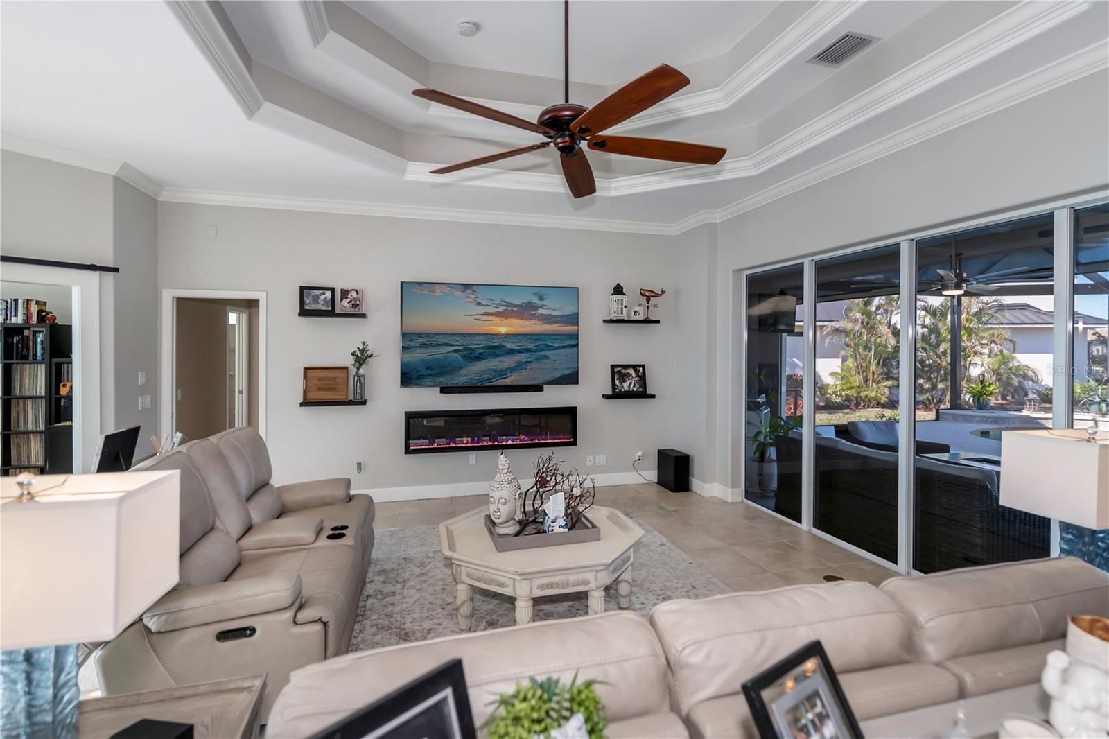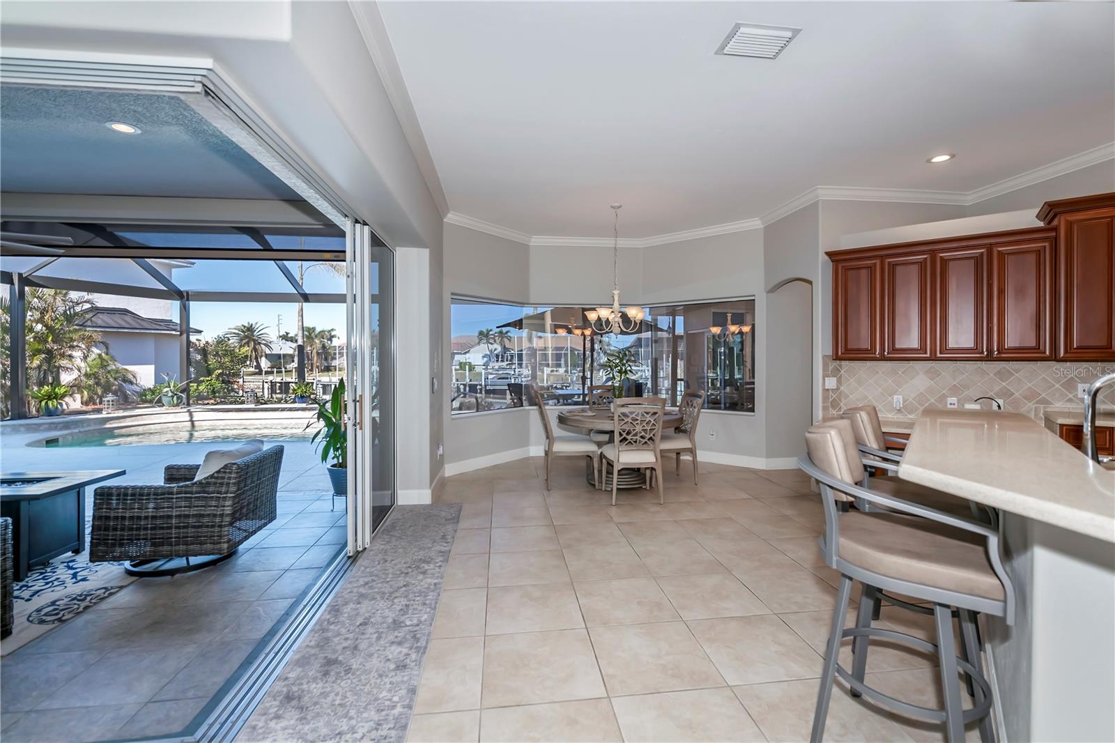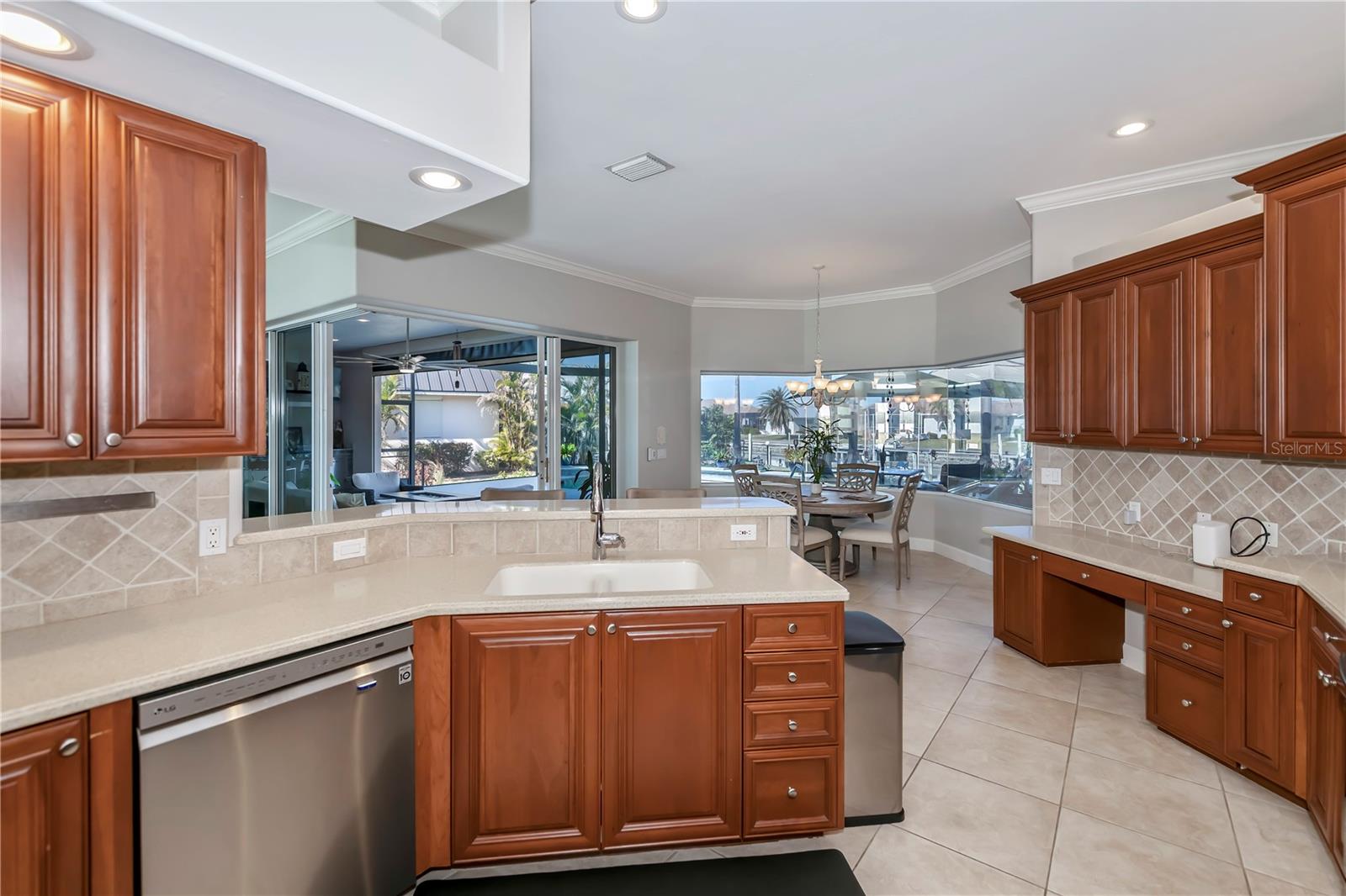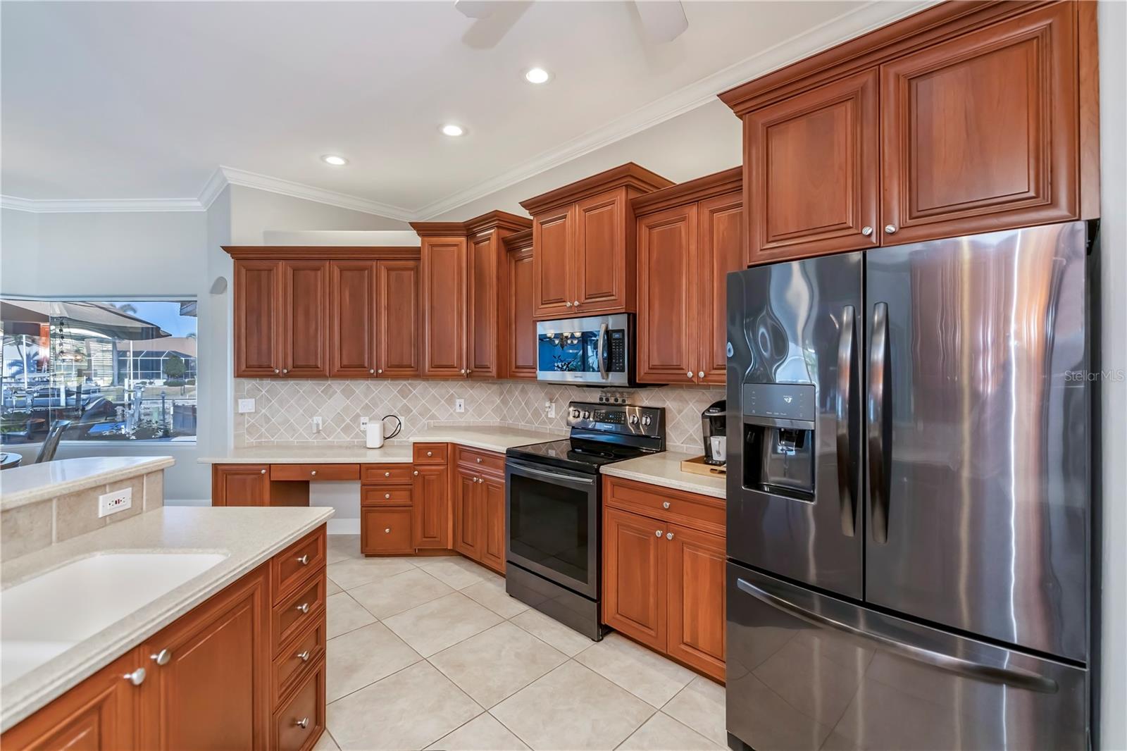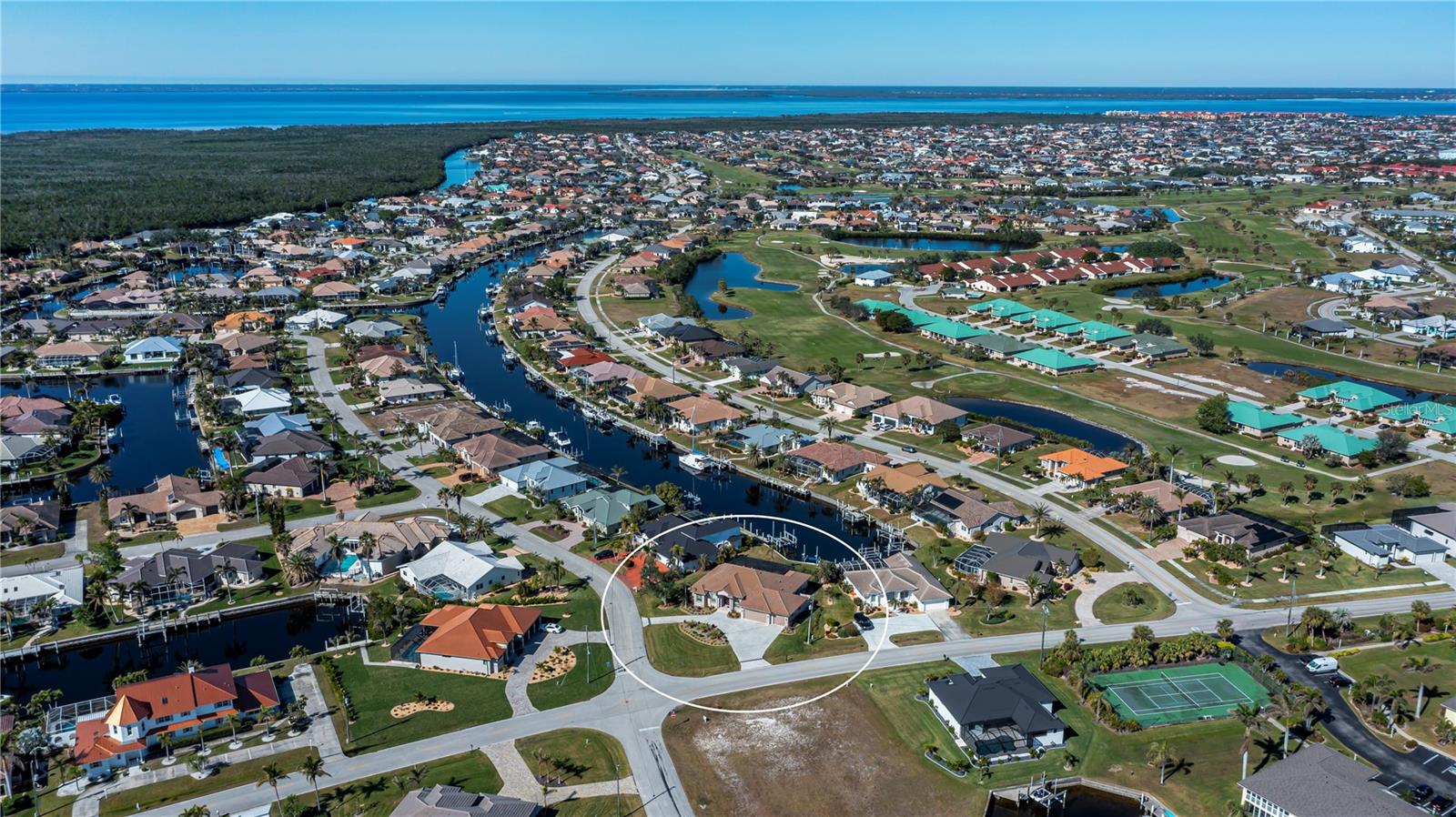 Just REDUCED! Take a look at this beautiful sailboat access great room home with 3 bedrooms plus a study, 2 baths and a 3 car garage! As you enter the house you will notice the volume ceilings and stepped up crown molding in the living area. The kitchen features 42in. wood cabinets, breakfast bar and solid surface counters. The home has zero-corner sliders in the great room and aquarium sliders in the breakfast room so you can really bring the outdoors in! The spacious lanai features and outdoor kitchen (2022) with refrigerator, granite counters and a propane grill-great for entertaining! Check out the new panoramic screen cage(2023) on the lanai! Bring your boat for a fun day on the water as the 10,000 lb boat lift(2022)-can accommodate up to a 28 ft boat-per installer. Even the seawall was replaced in 2024 and the city-maintained seawall replaced 2022. No storm damage here-there are impact windows(2022) as well as an electric roll down hurricane screen for the lanai(2023). Accordion shutters are used for the aquarium glass. The master bedroom has wood floors as well as crown molding. There is an extra mini-split air conditioner as the owner's love the extra cool air in the summer. The master bath has a walk-in shower as well as a soaking tub. Other updates include new air conditioner and ducts in 2022, 7 ceiling fans, water filtration and softener system(2022), hot water tank(2023), aluminum fenced dog area, and new roof in 2022. Off of the oversized three car garage is a paved 12x13 outdoor storage area-great for a kayak! This home was recently professionally landscaped and exterior lighting was added. There is a circular driveway. See this home today! You won't be disappointed!