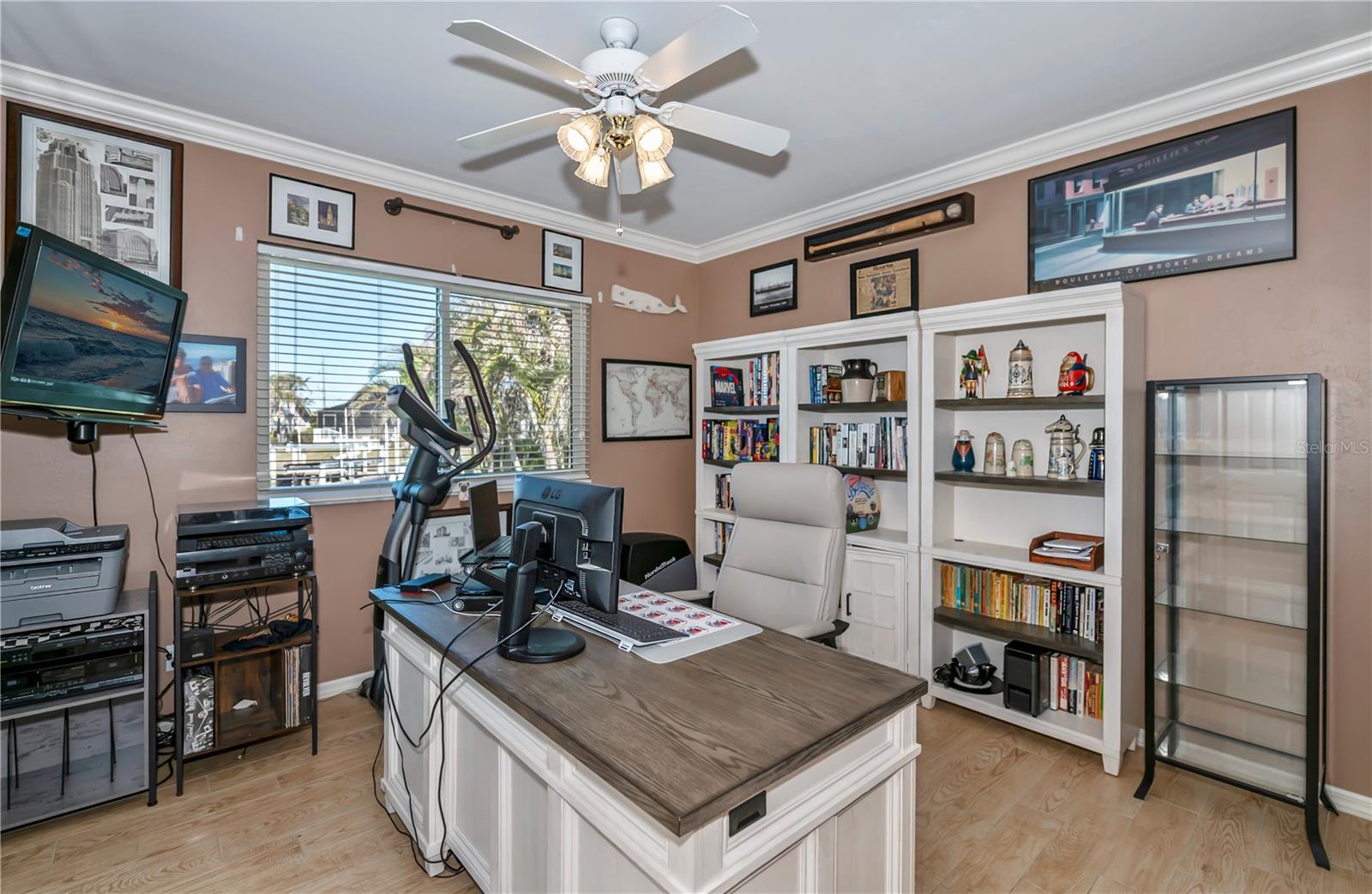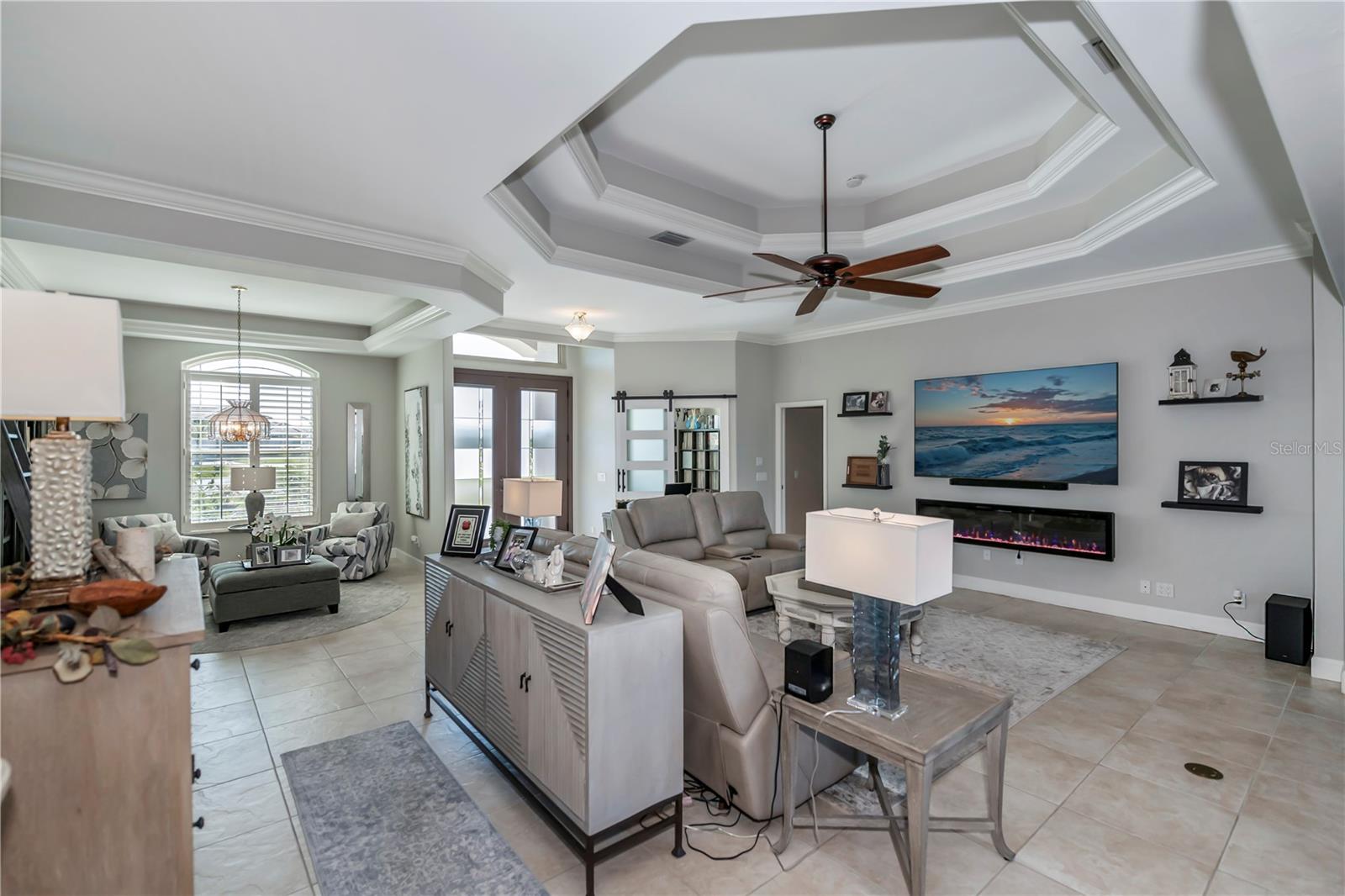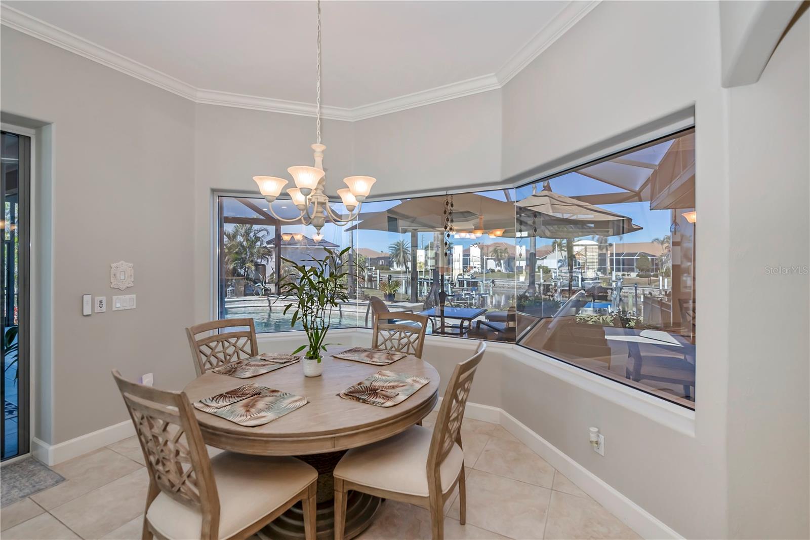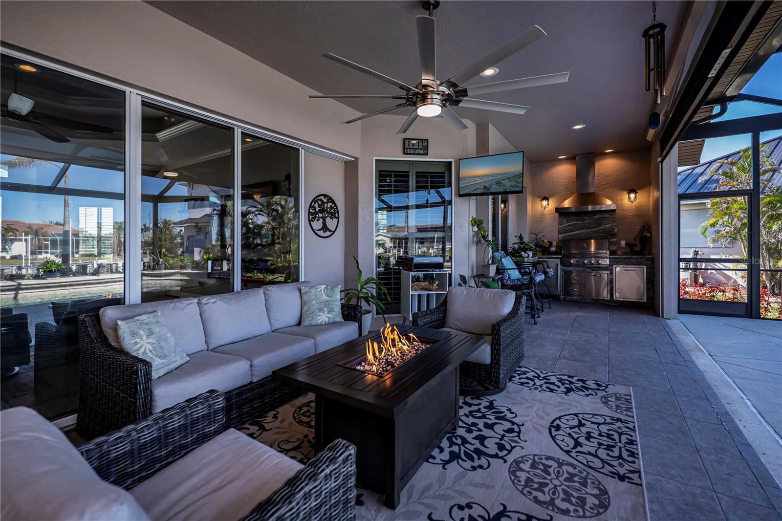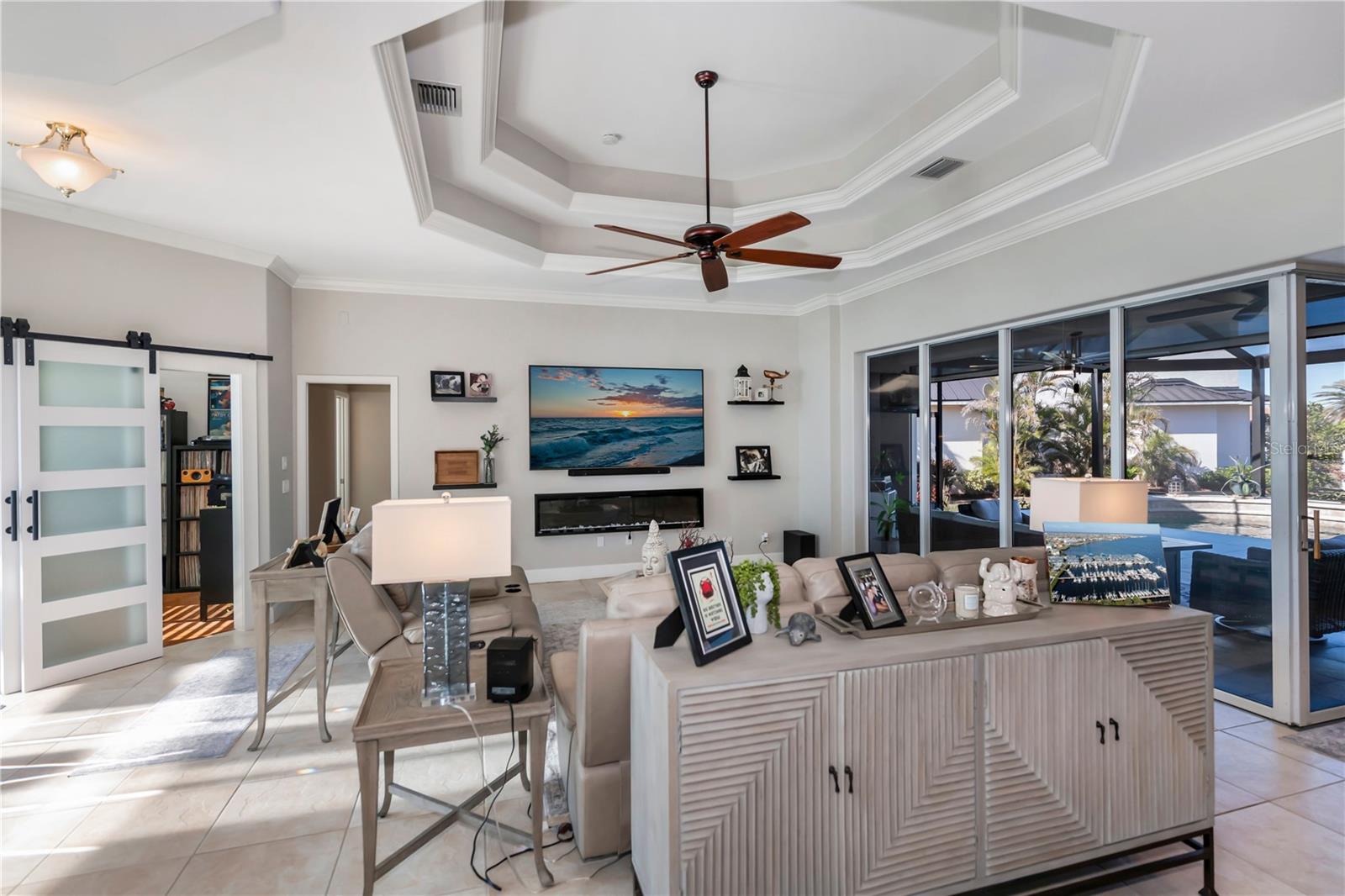 Just REDUCED! Take a look at this beautiful sailboat access great room home with 3 bedrooms plus a study, 2 baths and a 3 car garage! As you enter the house you will notice the volume ceilings and stepped up crown molding in the living area. The kitchen features 42in. wood cabinets, breakfast bar and solid surface counters. The home has zero-corner sliders in the great room and aquarium sliders in the breakfast room so you can really bring the outdoors in! The spacious lanai features and outdoor kitchen (2022) with refrigerator, granite counters and a propane grill-great for entertaining! Check out the new panoramic screen cage(2023) on the lanai! Bring your boat for a fun day on the water as the 10,000 lb boat lift(2022)-can accommodate up to a 28 ft boat-per installer. Even the seawall was replaced in 2024 and the city-maintained seawall replaced 2022. No storm damage here-there are impact windows(2022) as well as an electric roll down hurricane screen for the lanai(2023). Accordion shutters are used for the aquarium glass. The master bedroom has wood floors as well as crown molding. There is an extra mini-split air conditioner as the owner's love the extra cool air in the summer. The master bath has a walk-in shower as well as a soaking tub. Other updates include new air conditioner and ducts in 2022, 7 ceiling fans, water filtration and softener system(2022), hot water tank(2023), aluminum fenced dog area, and new roof in 2022. Off of the oversized three car garage is a paved 12x13 outdoor storage area-great for a kayak! This home was recently professionally landscaped and exterior lighting was added. There is a circular driveway. See this home today! You won't be disappointed!