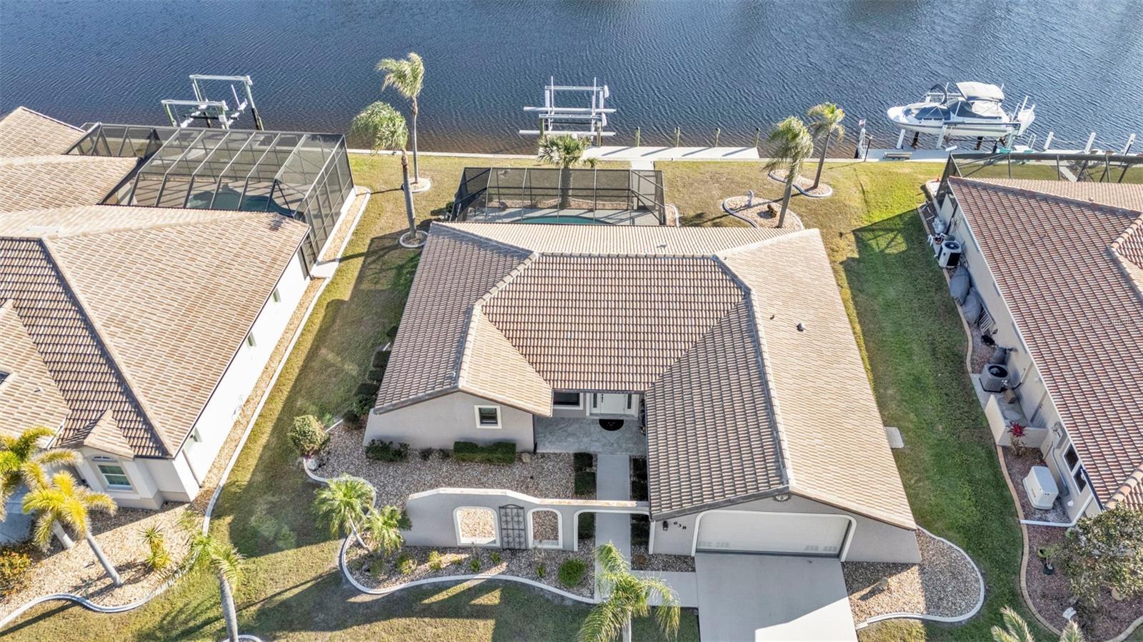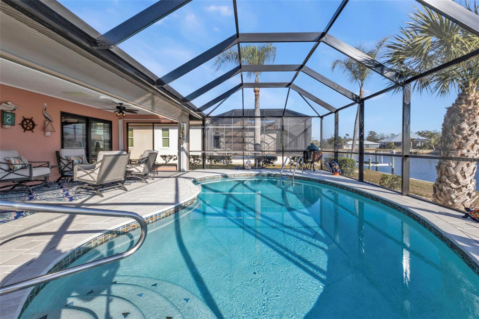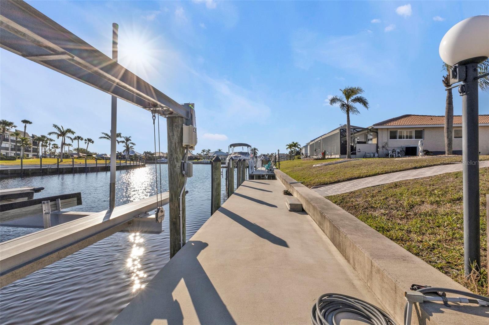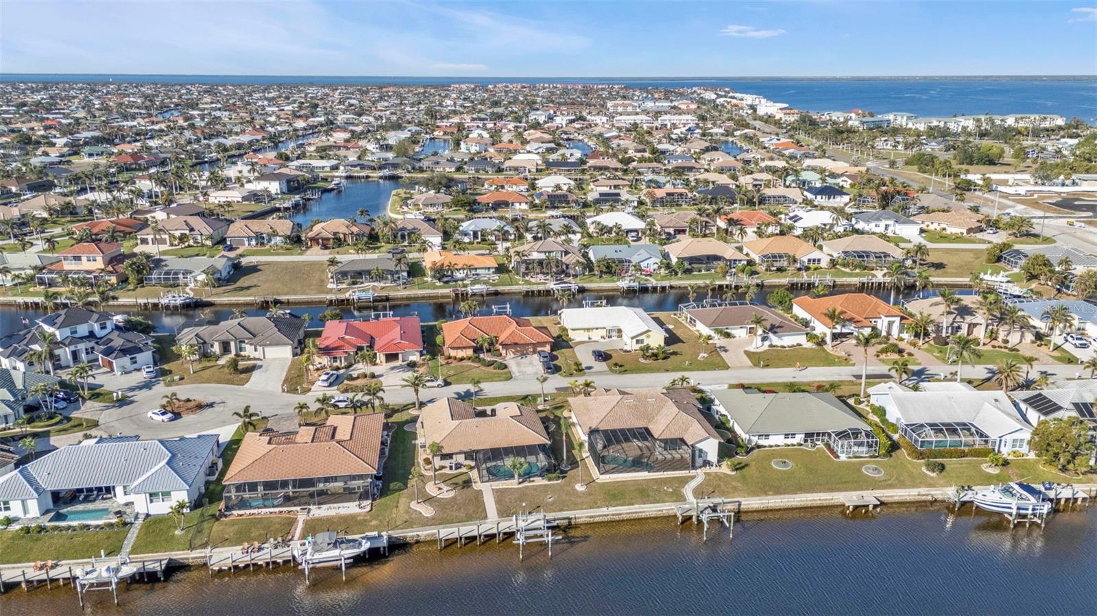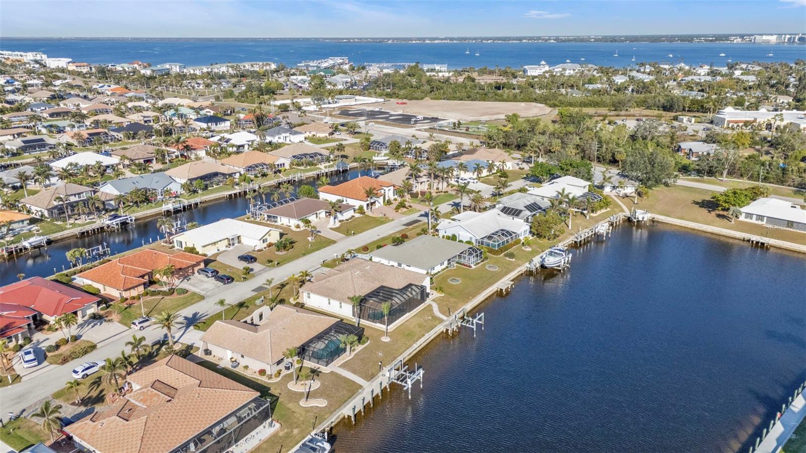 This is the one! Discover your dream waterfront home with direct powerboat access from your backyard to Charlotte Harbor in under 10 minutes! Located in the prime area of Punta Gorda, this home is just a short walk or bike ride to the popular Fisherman’s Village. The property underwent a major renovation in 2017, featuring a new 45’ dock with a 13,500 lb. lift, ready for your boat, impact windows and doors, a new AC system, a resurfaced pool with a new heater, and porcelain tile flooring in the main living area and primary ensuite bedroom. The primary bathroom now boasts a walk-in shower, replacing the old tub/shower. The renovation also included new countertops, appliances, gutters, ceiling fans, and exterior paint. In 2023, a new pool deck with Shellrock pavers was added. Major furniture pieces are included in the sale. Enjoy stunning views of the wide canal from the guest bedroom, dining area, primary bedroom, and living room. Washing dishes is a delight with such a view! Start your day with coffee and end it with an evening beverage on the spacious lanai, perfect for entertaining. The large great room opens to the lanai, providing ample space for guests. You can become part of this vibrant community and live the relaxed lifestyle! Whether you're a snowbird seeking a winter retreat, or looking to move from a condo to a home with more privacy and no monthly HOA fee, this is the one!