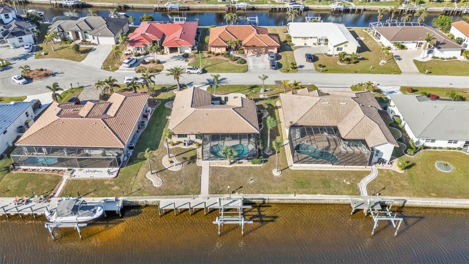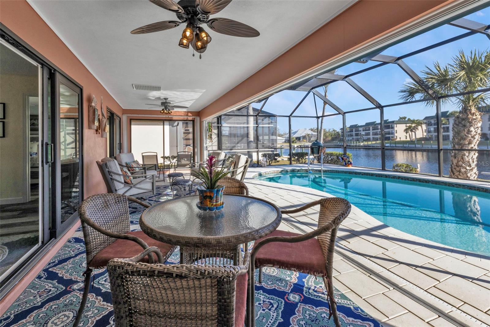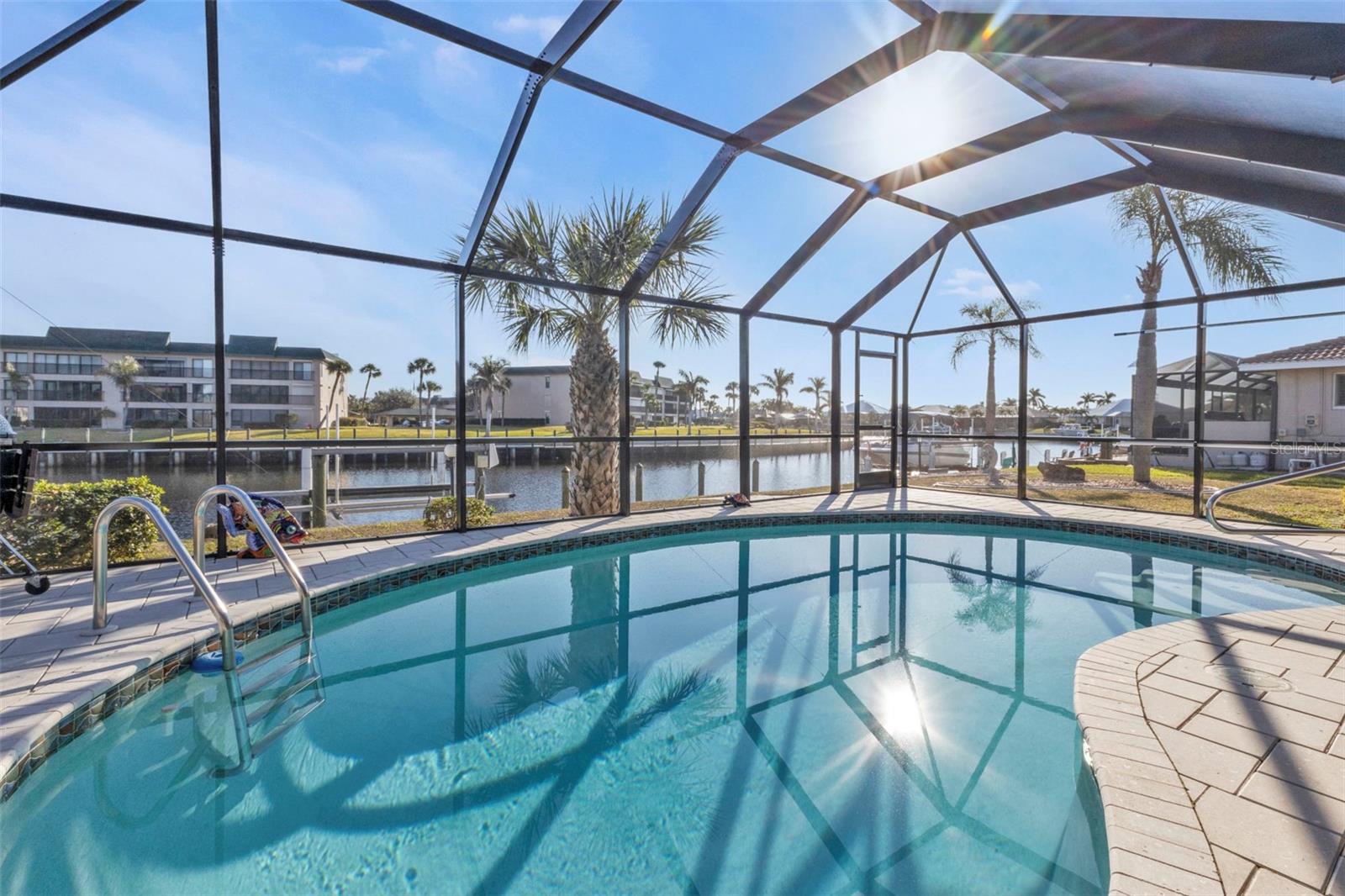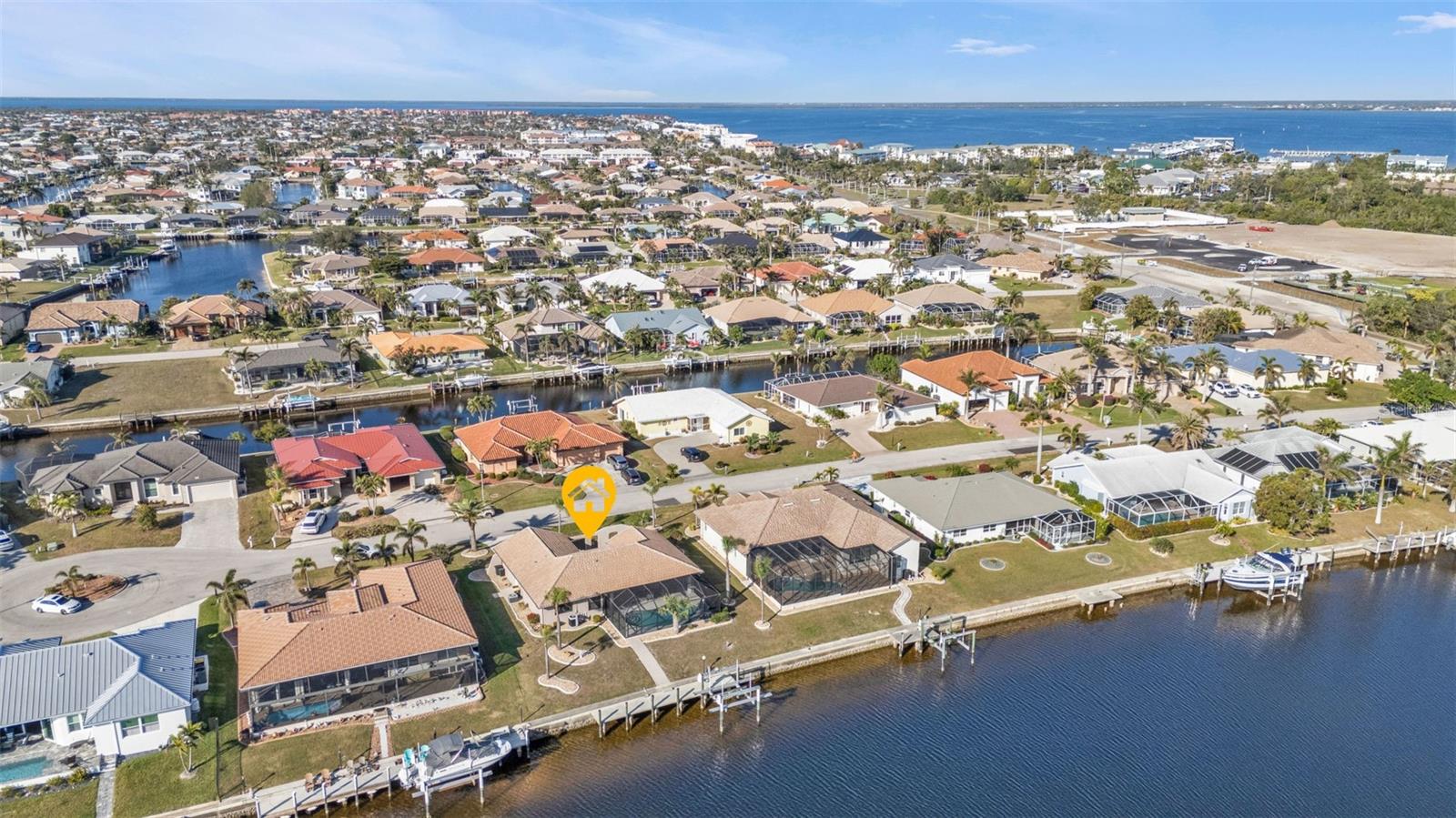 This is the one! Discover your dream waterfront home with direct powerboat access from your backyard to Charlotte Harbor in under 10 minutes! Located in the prime area of Punta Gorda, this home is just a short walk or bike ride to the popular Fisherman’s Village. The property underwent a major renovation in 2017, featuring a new 45’ dock with a 13,500 lb. lift, ready for your boat, impact windows and doors, a new AC system, a resurfaced pool with a new heater, and porcelain tile flooring in the main living area and primary ensuite bedroom. The primary bathroom now boasts a walk-in shower, replacing the old tub/shower. The renovation also included new countertops, appliances, gutters, ceiling fans, and exterior paint. In 2023, a new pool deck with Shellrock pavers was added. Major furniture pieces are included in the sale. Enjoy stunning views of the wide canal from the guest bedroom, dining area, primary bedroom, and living room. Washing dishes is a delight with such a view! Start your day with coffee and end it with an evening beverage on the spacious lanai, perfect for entertaining. The large great room opens to the lanai, providing ample space for guests. You can become part of this vibrant community and live the relaxed lifestyle! Whether you're a snowbird seeking a winter retreat, or looking to move from a condo to a home with more privacy and no monthly HOA fee, this is the one!