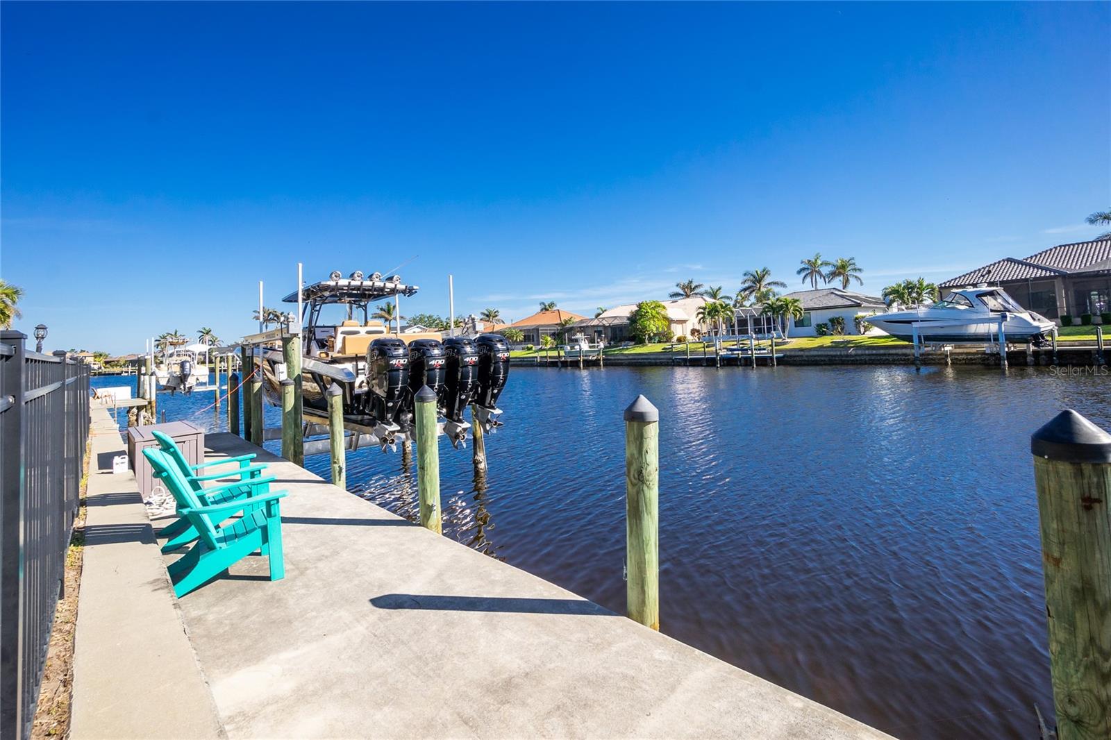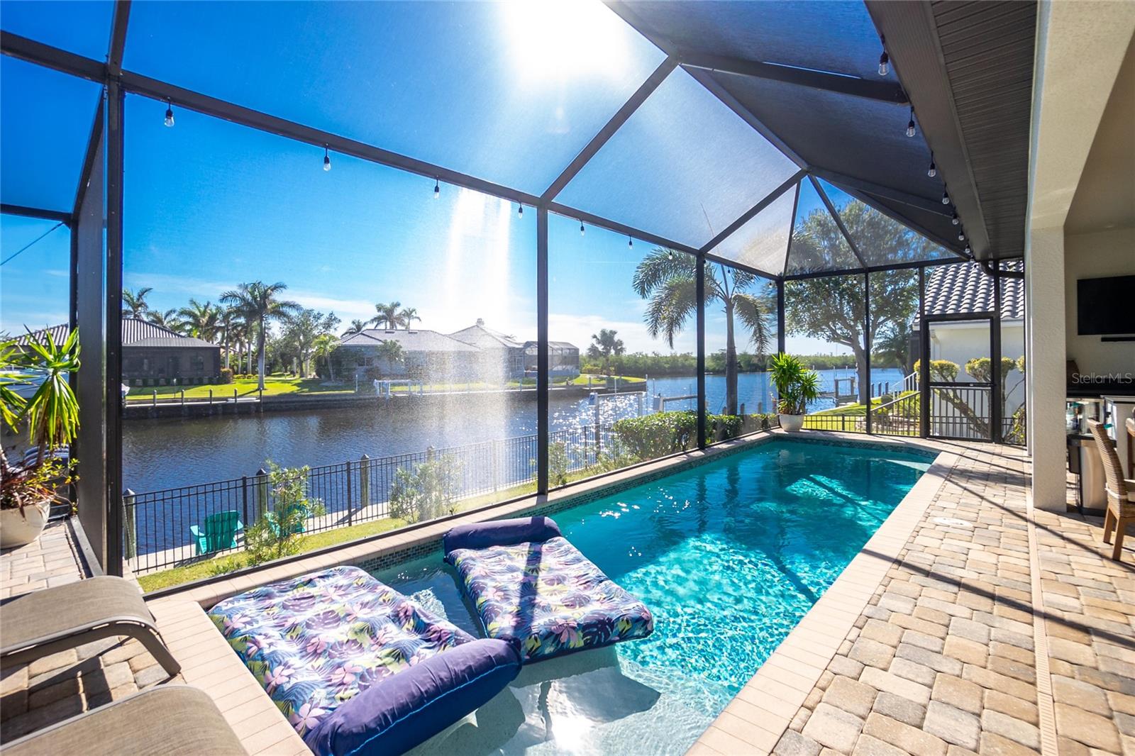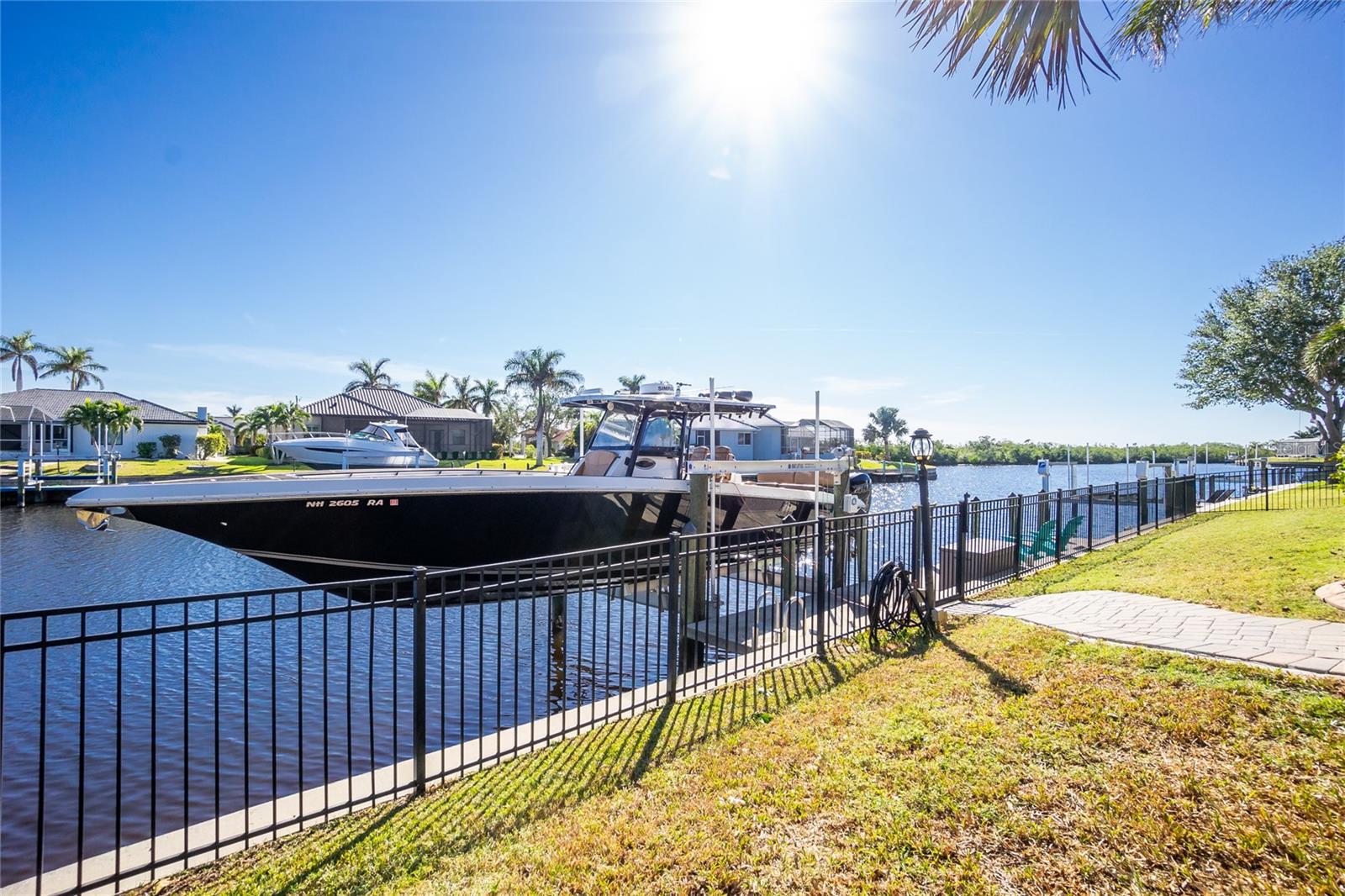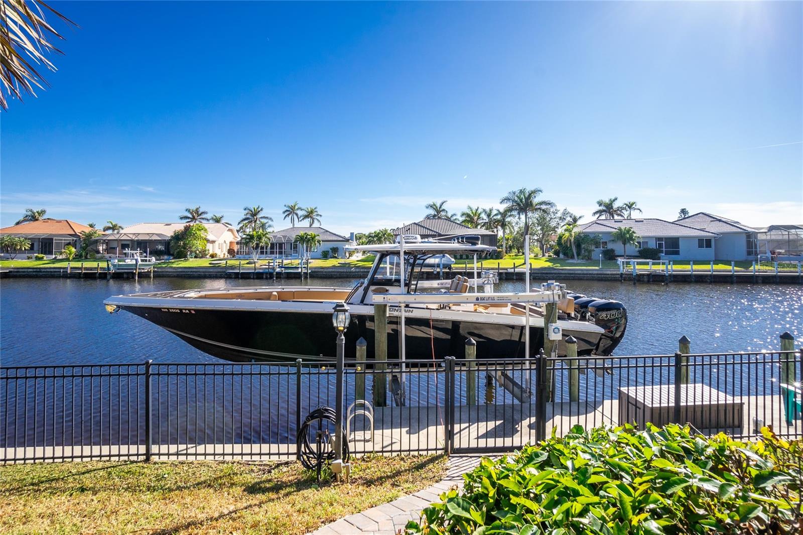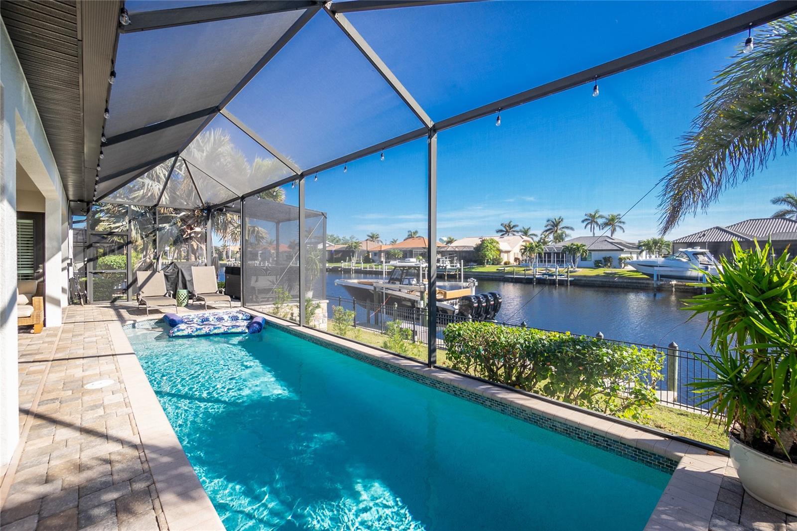 Welcome to your dream waterfront oasis! This stunning FULLY FURNISHED three-bedroom, two-bath pool home offers the perfect blend of luxury and comfort, making it an ideal retreat for both relaxation and entertaining. Step inside, you're greeted by an open concept living space adorned with exquisite luxury vinyl floors that flow seamlessly throughout the home along with coffered ceilings and crown molding. The spacious living area is bathed in natural light, providing a warm and inviting atmosphere. The modern kitchen features high-end Cafe line appliances, quartz countertops that are perfect for the culinary enthusiast. The master suite is a true sanctuary, boasting picturesque views of the water along with an en-suite bathroom that offers both convenience and elegance. The additional bedrooms are generously sized, perfect for family, guests. Step outside to your private paradise, where you'll find a sparkling pool surrounded by lush landscaping, ideal for soaking up the sun or hosting gatherings. Unwind in the new spa after a long day along with your outdoor kitchen equipped with beverage fridge. Drop your boat in on the new 16,000 lb. boat lift (2024), making it easy to explore the beautiful waterways right at your doorstep. This home also features a dedicated office space, making it perfect for remote work or as a quiet study area. With its prime location and luxurious amenities, this waterfront property is not just a home; it's a lifestyle Don’t miss this opportunity to own a slice of paradise!