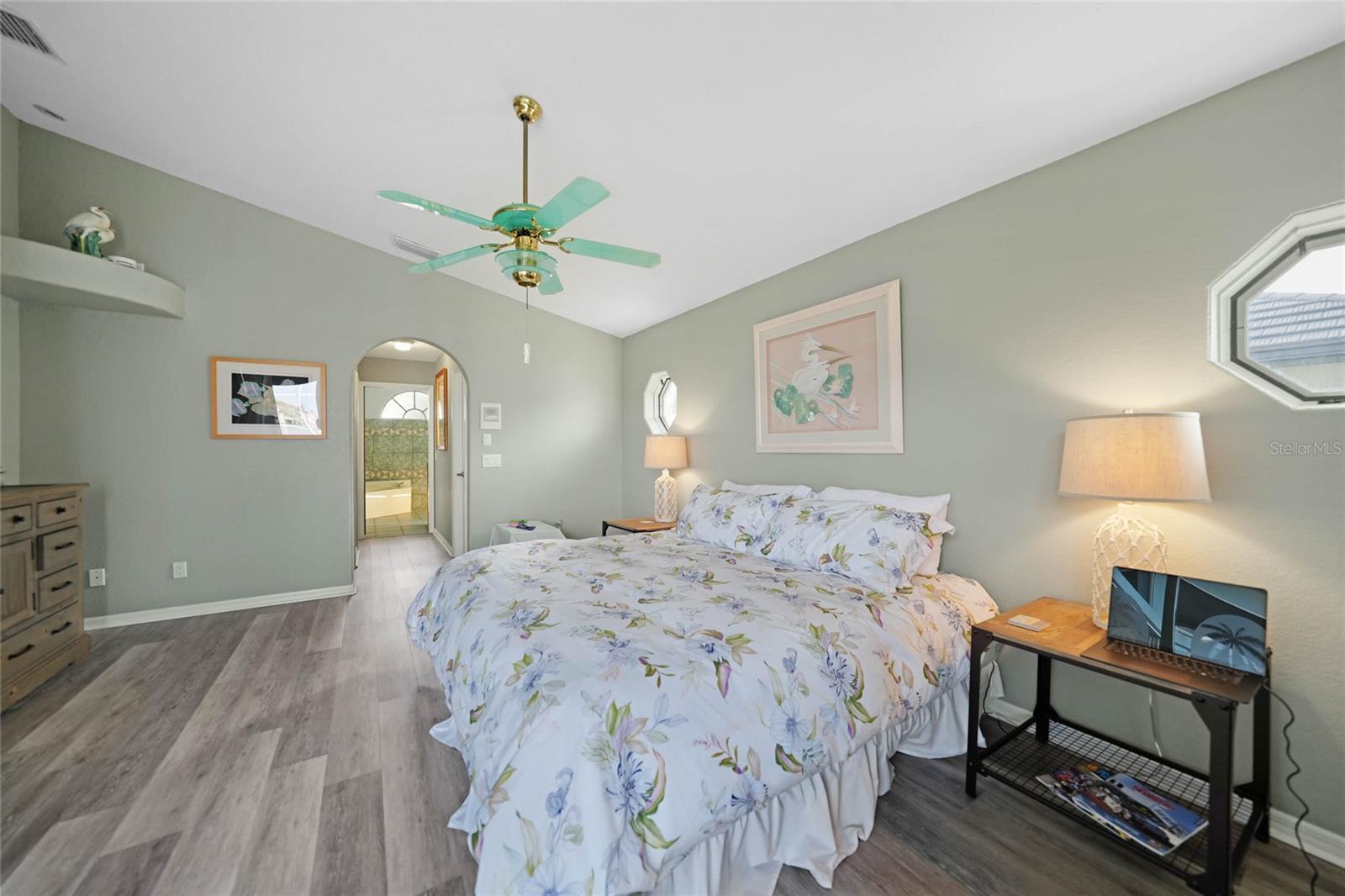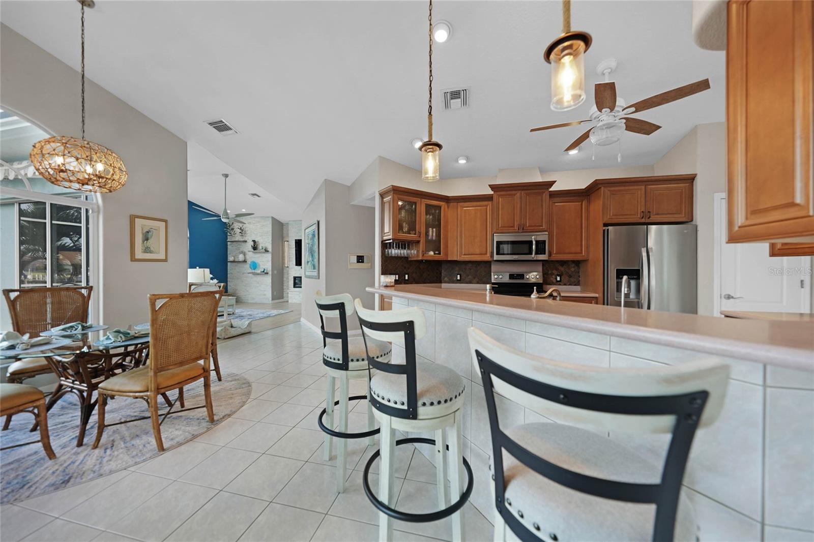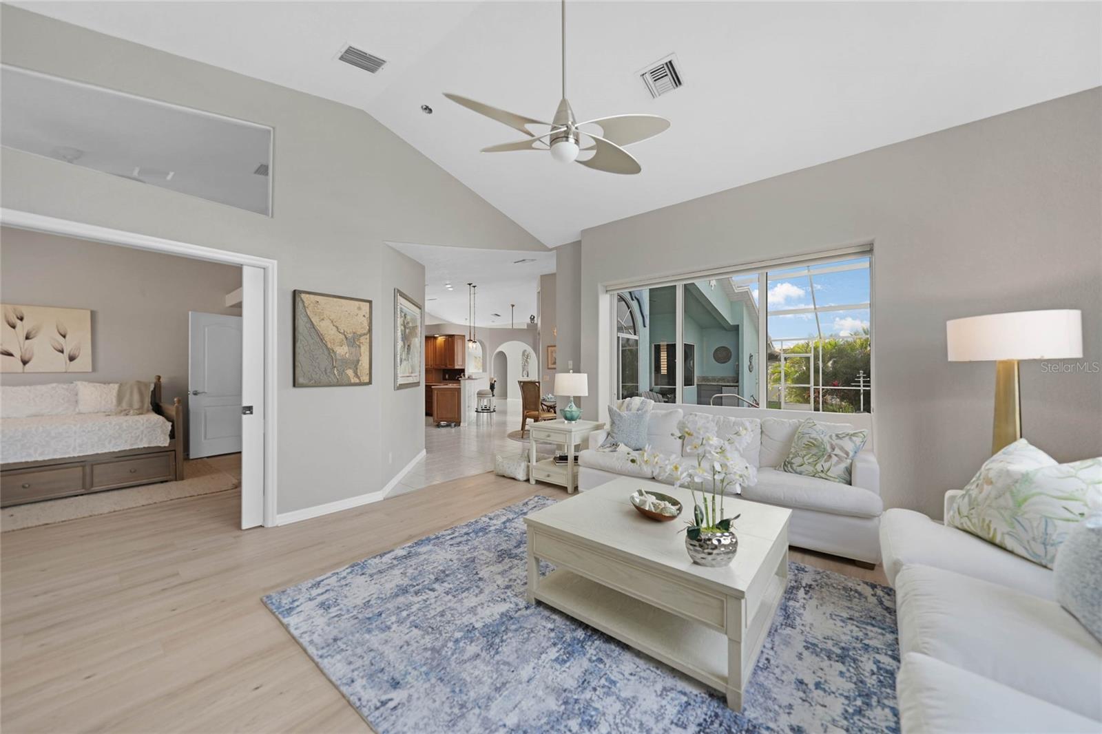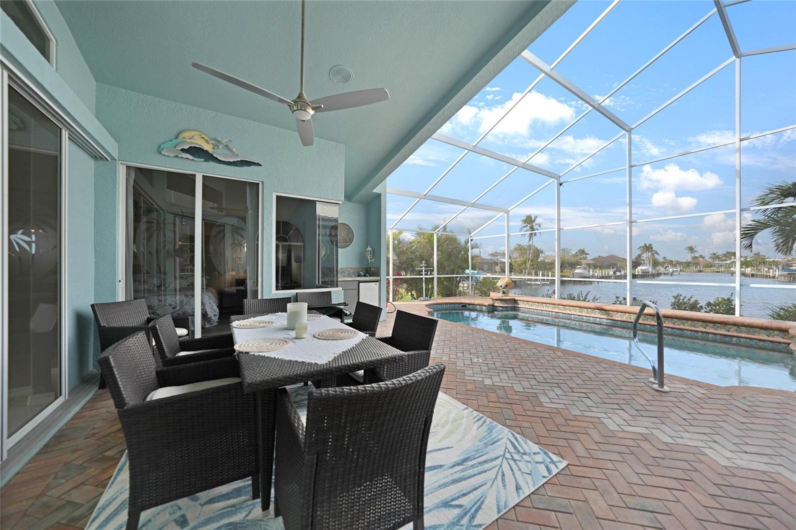 Welcome to your ultimate waterfront retreat in Punta Gorda Isles, where stunning long-water views and just 12-minute powerboat access to Charlotte Harbor and the Gulf of Mexico await! This exquisite 3-bedroom, 3-bath pool home offers 2,367 square feet of luxurious open/split living space. As you step through the living and dining areas, you’ll be immediately struck by the open floor plan, soaring ceilings, and elegant built-in features. Arched entryways and contemporary lighting enhance the home’s stylish ambiance. Disappearing sliders seamlessly connect the interior to the pool and lanai area, creating a perfect flow for indoor-outdoor living. The gourmet kitchen is truly a chef’s paradise, boasting a breakfast bar, stainless steel appliances—including a new dishwasher—a wine cooler, and an abundance of raised-panel cabinetry with elegant crown molding. A spacious pantry provides ample storage, while the kitchen overlooks the inviting casual dining nook with views. From here, continue into the beautifully updated family room, where an electric fireplace serves as a stunning focal point. Luxury vinyl tile flooring throughout the family room and bedrooms adds a modern, sleek touch to the home’s overall appeal. The split floor plan ensures privacy, with the primary suite offering direct access to the lanai through sliding doors and an aquarium window that floods the room with natural light. The spa-inspired master bath is a true sanctuary, featuring custom tile work, dual sinks, a garden tub, and a Roman shower. Two generously sized guest bedrooms, each featuring built-in closets and plantation shutters, share a beautifully appointed bathroom complete with a Roman shower. With all systems replaced within the past 5 years—including HVAC, tankless hot water heater and water filtration system—this home provides peace of mind for its new owner. Step outside to enjoy the new stone-coated metal roof, a spacious covered lanai ideal for outdoor entertaining, a convenient pool bath, a screened and heated pool with new variable speed pump/heater, and an in-ground spa with new motor, all surrounded by updated lush landscaping with updated irrigation. A walkway leads to the new cement dock and 80’ of seawall (maintained by the city) and features a water/electric and a 16,000 lb boat lift for your convenience. M&S full house audio and intercom system, laundry room and 2-car garage complete the package. Situated in a sought-after golf and boating community, this home is just minutes from the Punta Gorda Yacht Club, Fishermen's Village, and historic downtown Punta Gorda. Indulge in world-class fishing, boating, arts, fine dining, and entertainment, or explore the nearby parks and pristine SWFL beaches. This meticulously maintained, single-owner home radiates pride of ownership and offers a lifestyle that’s truly unmatched.