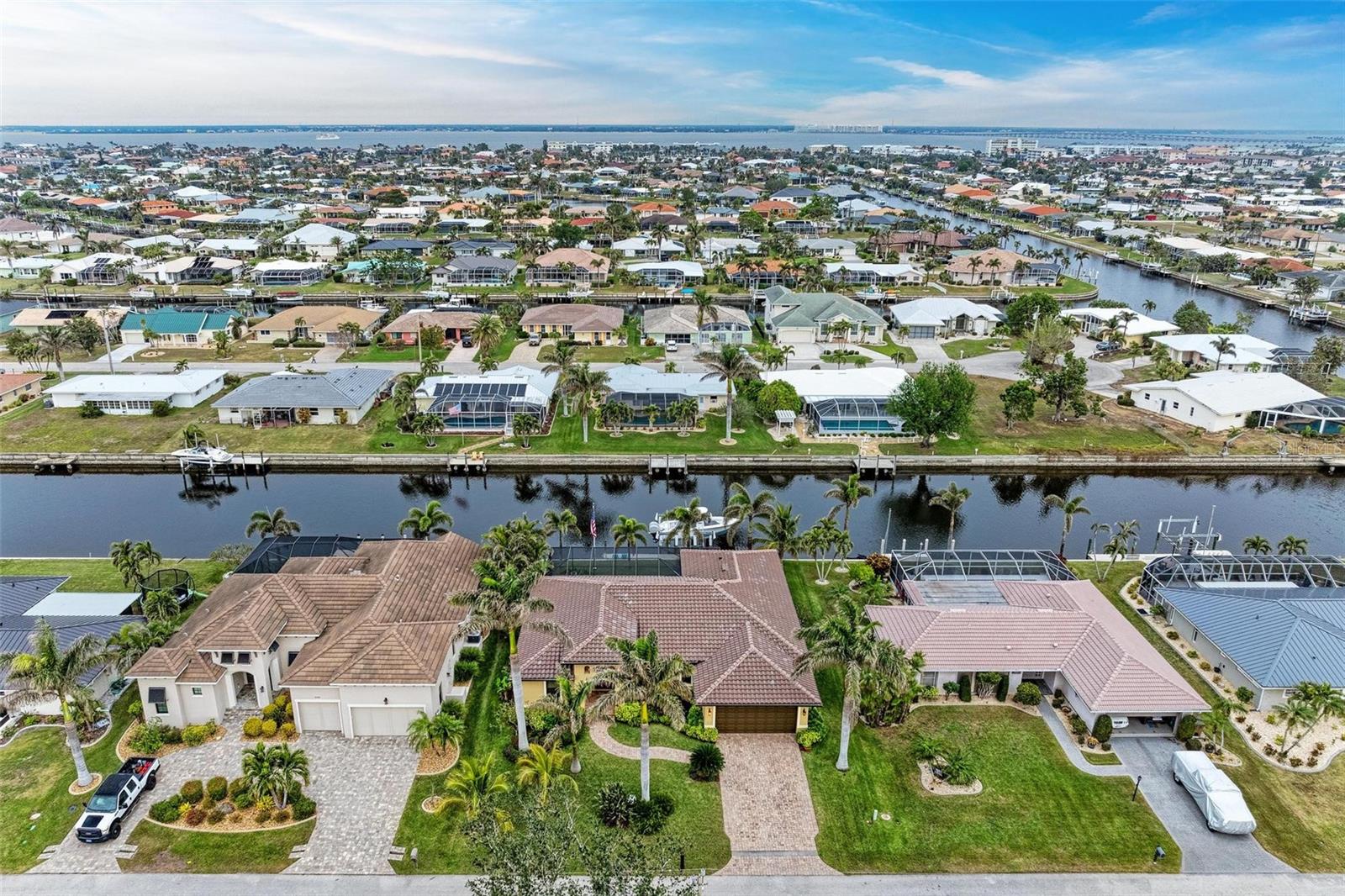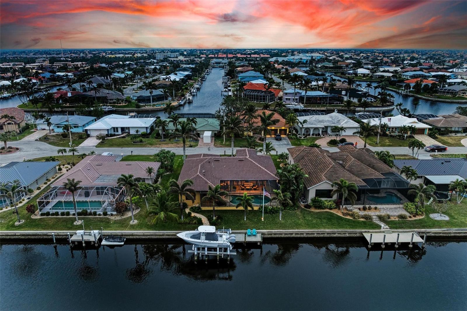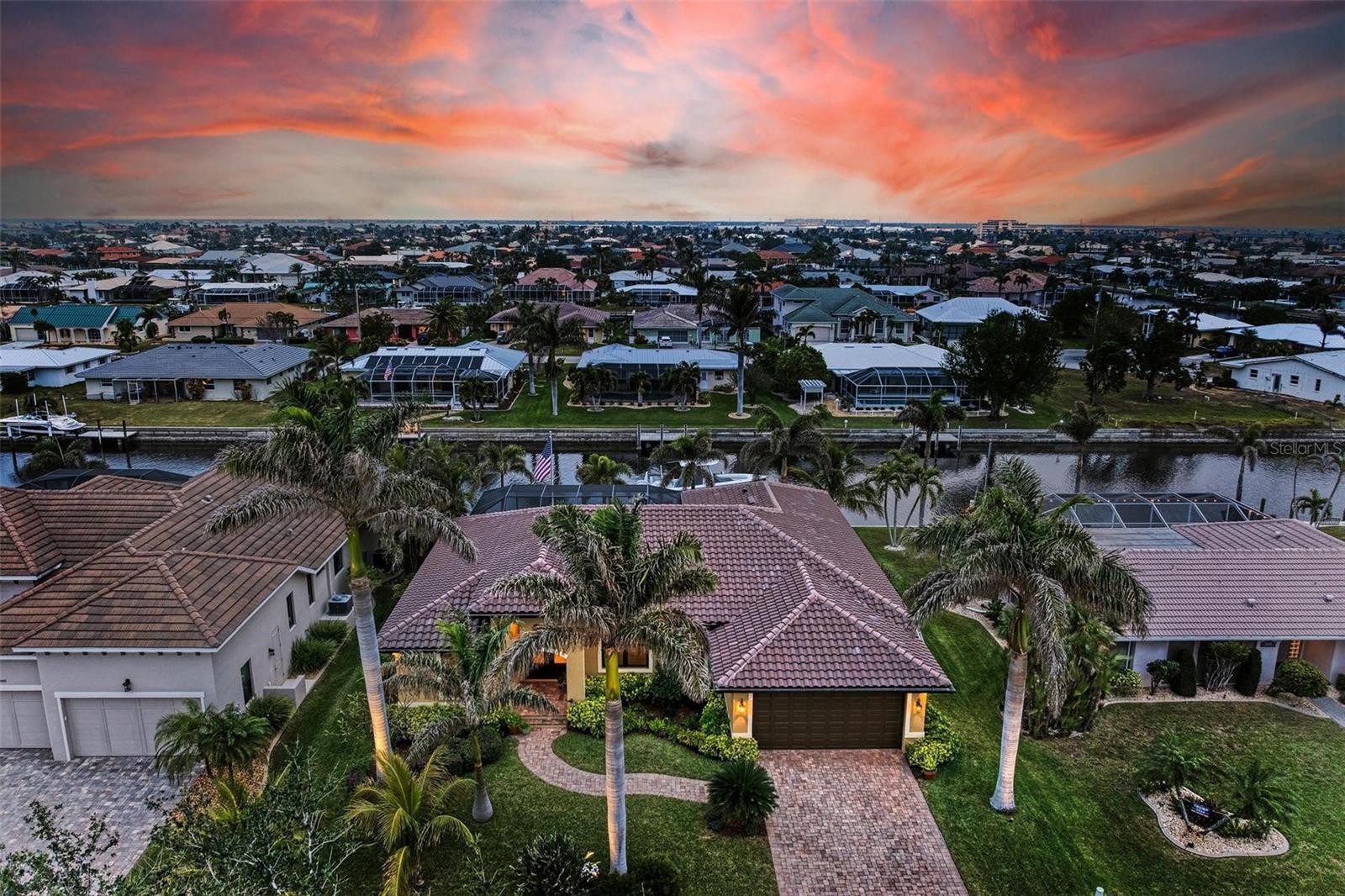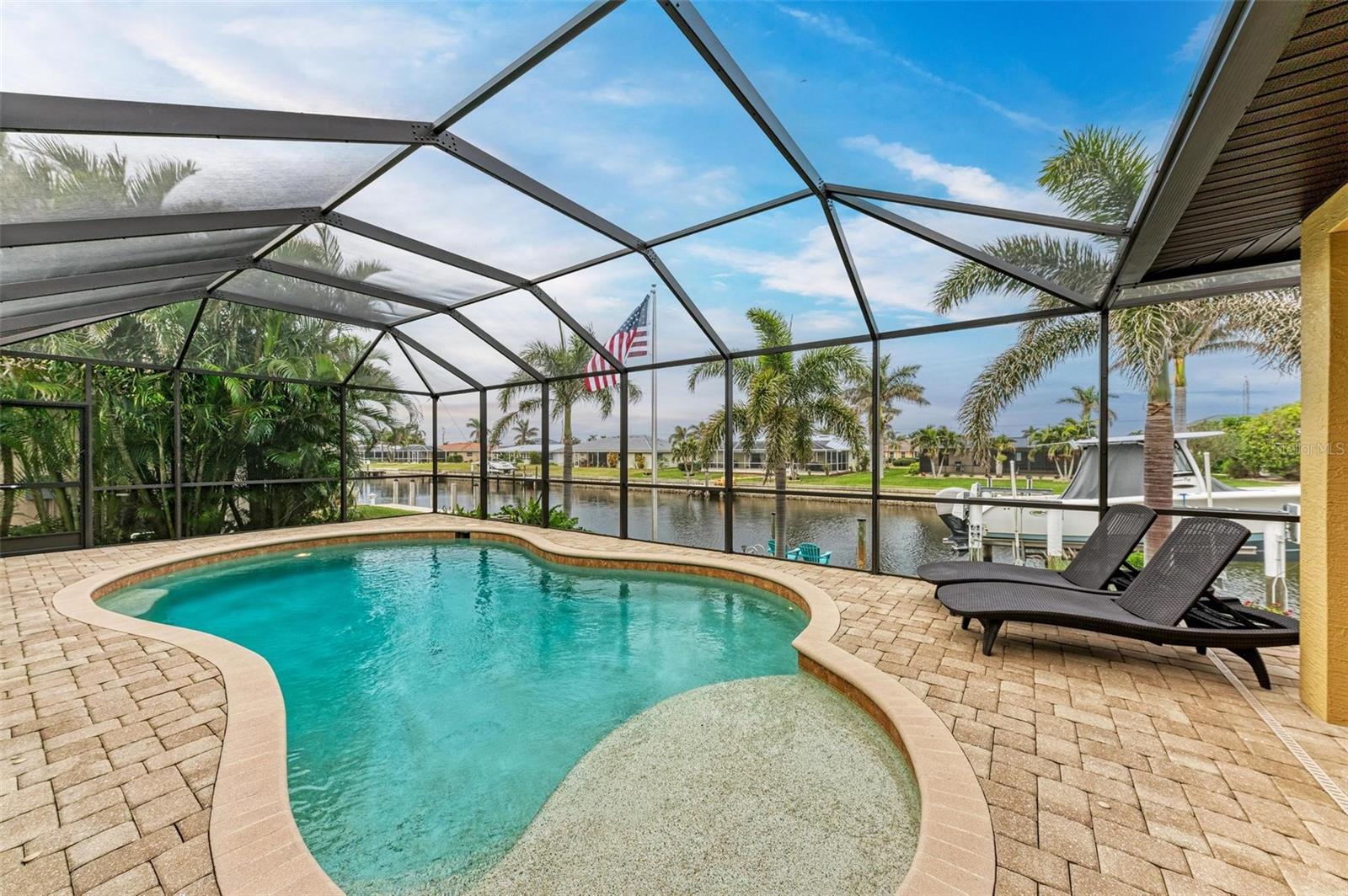 WATERFRONT LUXURY AWAITS at this gorgeous 2013 built custom POOL HOME with incredible and unique features! This 3-bedroom, 3 full bath – 2,205 sqft air conditioned / 3,260 sqft total home on an 85’ x 120’ oversized lot has an oversized two car garage with a large climate-controlled storage room, a NEW cement tile roof with double underlayment, new soffit and 7” gutters, a refurbished cage, new garage epoxy flooring, all completed in 2024. Inside, enjoy two guest bedrooms, each with their own bathroom on the left side of the home, an open concept design including the dining room, spacious great room, kitchen and dinette all open to the outdoors via six - 8’ tall sliders that create indoor/outdoor spaces with wonderful views of the water and pool, a beautiful primary suite with dual walk-in closets and an en-suite bathroom with separate tub and walk-in shower, and upgraded dual vanities. Additional features include a large inside laundry room with extra storage, a commercial grade flagpole, upgraded landscaping, audio speakers in main living area and outside porches, Impact windows and Storm Smart hurricane shutters for lanai, 20” porcelain tile flooring throughout, tongue and groove ceilings in main living area and outside porches, a huge walk-in pantry large enough for a deep freeze off the beautiful gourmet kitchen, an amazing outdoor kitchen and bar with propane grill and additional two burner cooktop, a heated saltwater gunite pool that is 7’ deep, landscape decorative lighting, a fabulous 35' concrete dock with 20,000 lb lift, shore power, and 2 hose spigots. This home also is GENERATOR READY with a plugin adaptor for home power and has transferrable flood insurance. Nearby to great shopping, restaurants, marinas, golf, parks and more, you will not want to miss this! BE SURE TO CLICK THE FULL VIRTUAL TOUR LINKS FOR DETAILS!