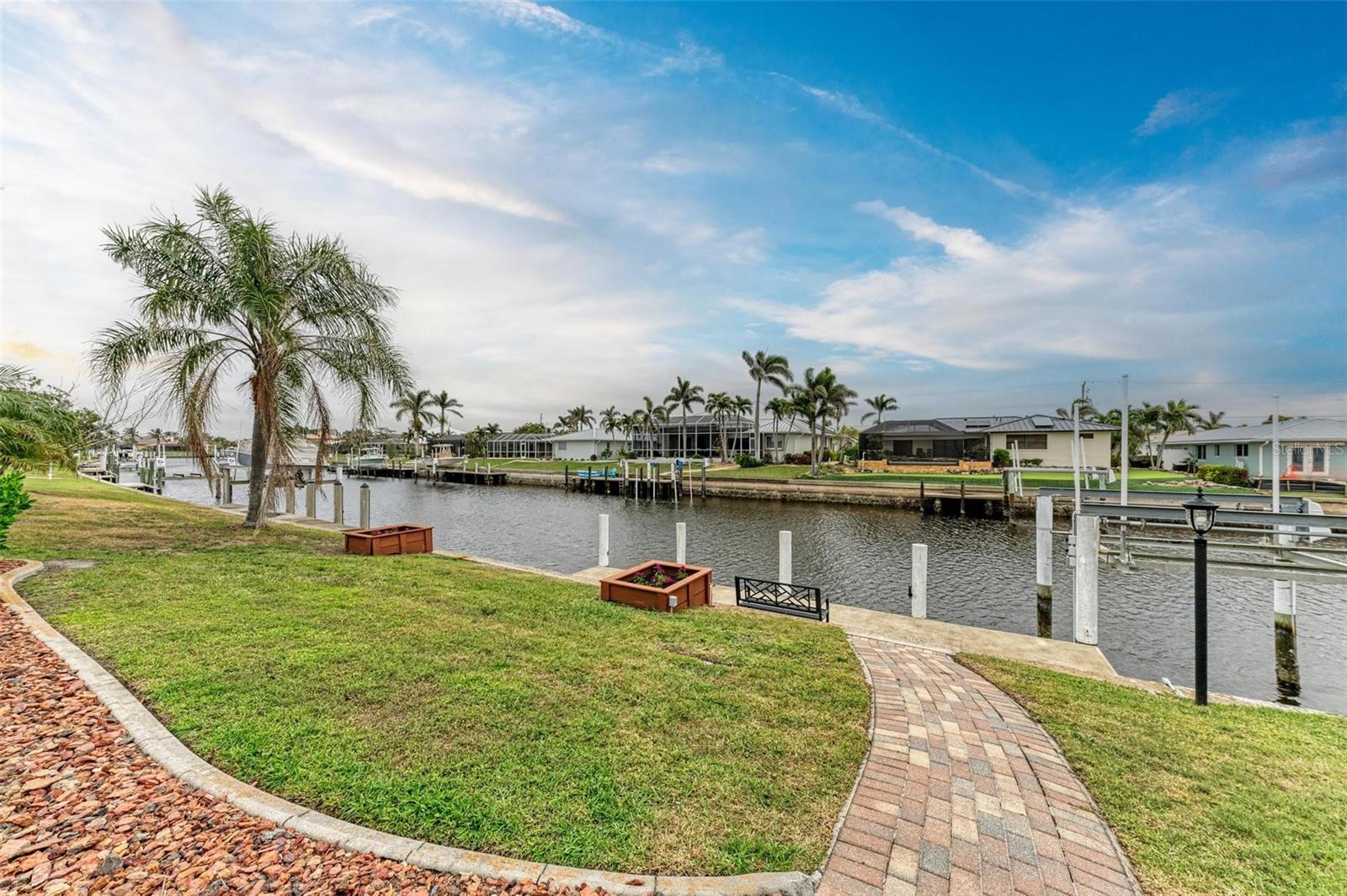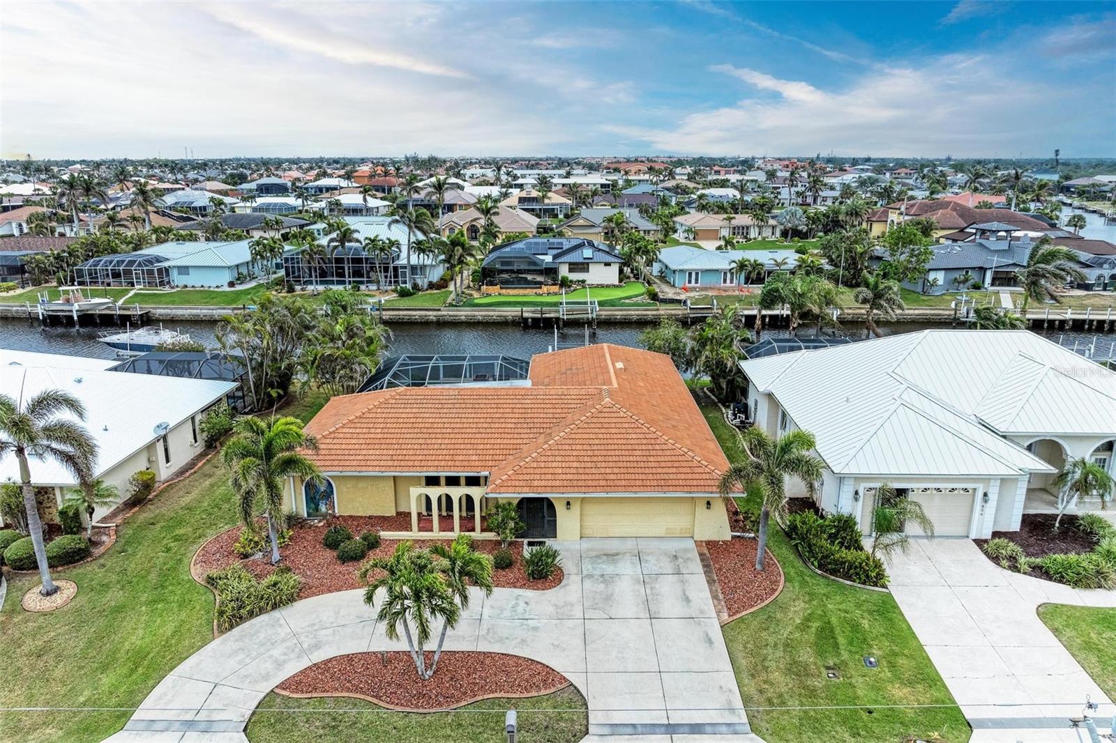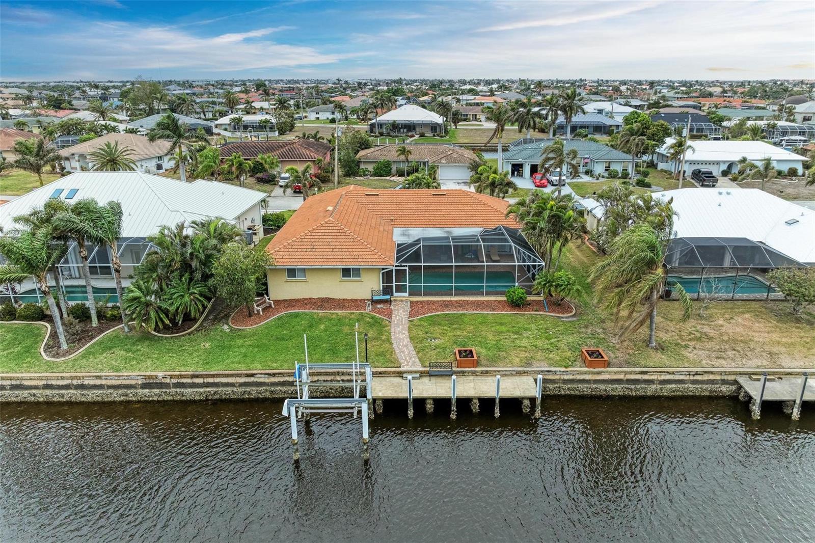 Welcome to your WATERFRONT paradise in Punta Gorda, FL! Pull up to your new home on a circular driveway with plenty of parking and a generously sized garage! This stunning home offers the ultimate Florida lifestyle with a 12,000 BOAT LIFT WITH DOCK IN YOUR BACKYARD, perfect for those who love to spend days out on the water. Home had no flooding at all during any storms. Reach Charlotte Harbor in 15 minutes and boat to Fishermen's Village Waterfront Mall for lunch! Your luxurious OVERSIZED HEATED POOL with a new pool pump is ideal for soaking up the sunshine and relaxing by the water's edge. NEW OWNER'S CAN ENJOY PEACE OF MIND WITH A BRAND NEW TILE ROOF & FULL HURRICANE PROTECTION! Inside you will find a spacious layout with the gourmet kitchen at the heart of the home featuring a built in oven, glass cooktop, island, stainless appliances and ample GRANITE COUNTERTOP and cabinet space! The split floor plan allows for privacy and space, while the master suite boasts a huge walk-in closet that will thrill any fashion enthusiast. There is an ensuite bathroom that if fully updated with his & hers sinks and tile shower. You also have private access to your lanai through glass sliding doors. The guest rooms are also oversized with large built in closets and the primary guest room offers private access to the lanai. The guest bathroom doubles as a pool bath. Additional features include: WHOLE HOME REVERSE OSMOSIS SYSTEM, GENERATOR PLUG IN GARAGE, STORAGE SHELVES IN GARAGE, NEWER A/C SYSTEM WITH WARRANTY and so much more! SUPER CLEAN AND MOVE IN READY! With so many impressive features, this home truly has it all- don't miss out on this incredible opportunity to live in coastal luxury in Punta Gorda! BE SURE TO CLICK THE FULL VIRTUAL TOUR LINKS FOR DETAILS!