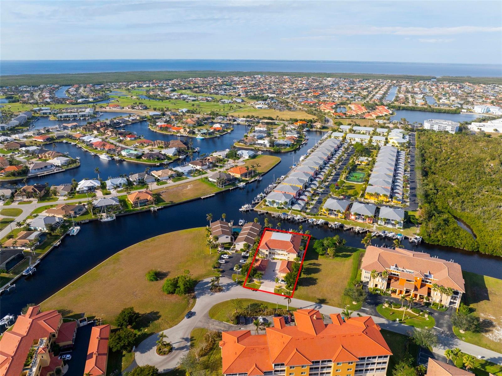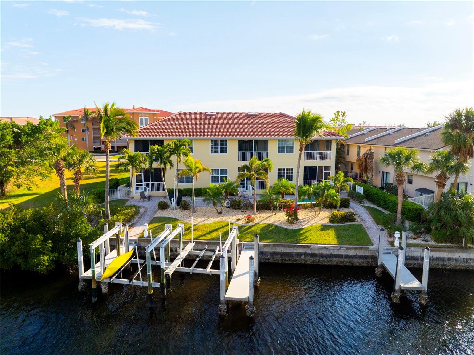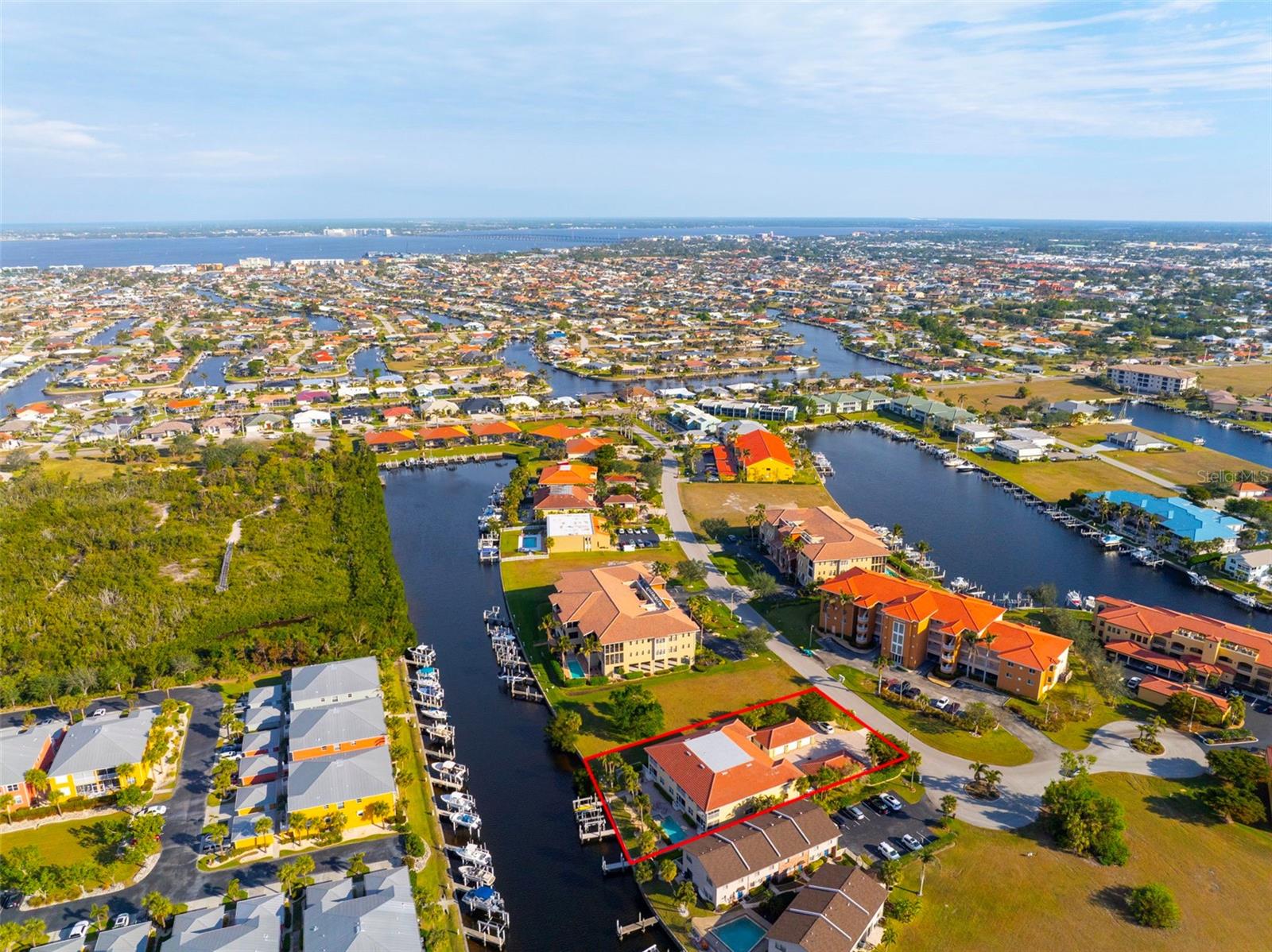Welcome to BELLA LAGUNA. Here it is the highly sought after and rarely ever available second floor end unit condo. Amazing floor plan including a large den and a private 1 car garage. This is Waterfront living in Punta Gorda Isles at its finest. The elegant 2-bedroom 2 bath plus den features roughly 1,500 sqft with an open living concept maximizing the stunning sunsets and saltwater canal views from almost every window in the property. A very elegant master suite with double tray ceilings and of course the gorgeous waterfront views provide the peaceful and serene ambience we all desire. The Kitchen features granite counters, wood cabinets, stainless steel appliances and a great open area for endless entertaining . Here are a few custom features within this property, 10 ft Tray ceilings, 16" porcelain tile, crown molding and tastefully upgraded lighting throughout. Walk through the magnificent tropical community grounds on your way to your deeded dock. The grounds feature manicured brick pavers on all the walkways and around the pool / spa deck. Deep water sailboat water access awaits you to Charlotte Harbor, Large Laundry Room, A private 1 car Garage, Deeded Boat Dock (Lifts Allowed)! *Water & Elec at the Dock. Great Neighborhood & so Close to Fisherman's Village, Historic Downtown, The Harbor, I-75, Handicap Access, Bike Friendly Community. Dont wait come and see this perfect condo in the heart of PGI today.