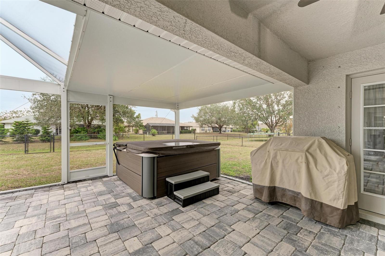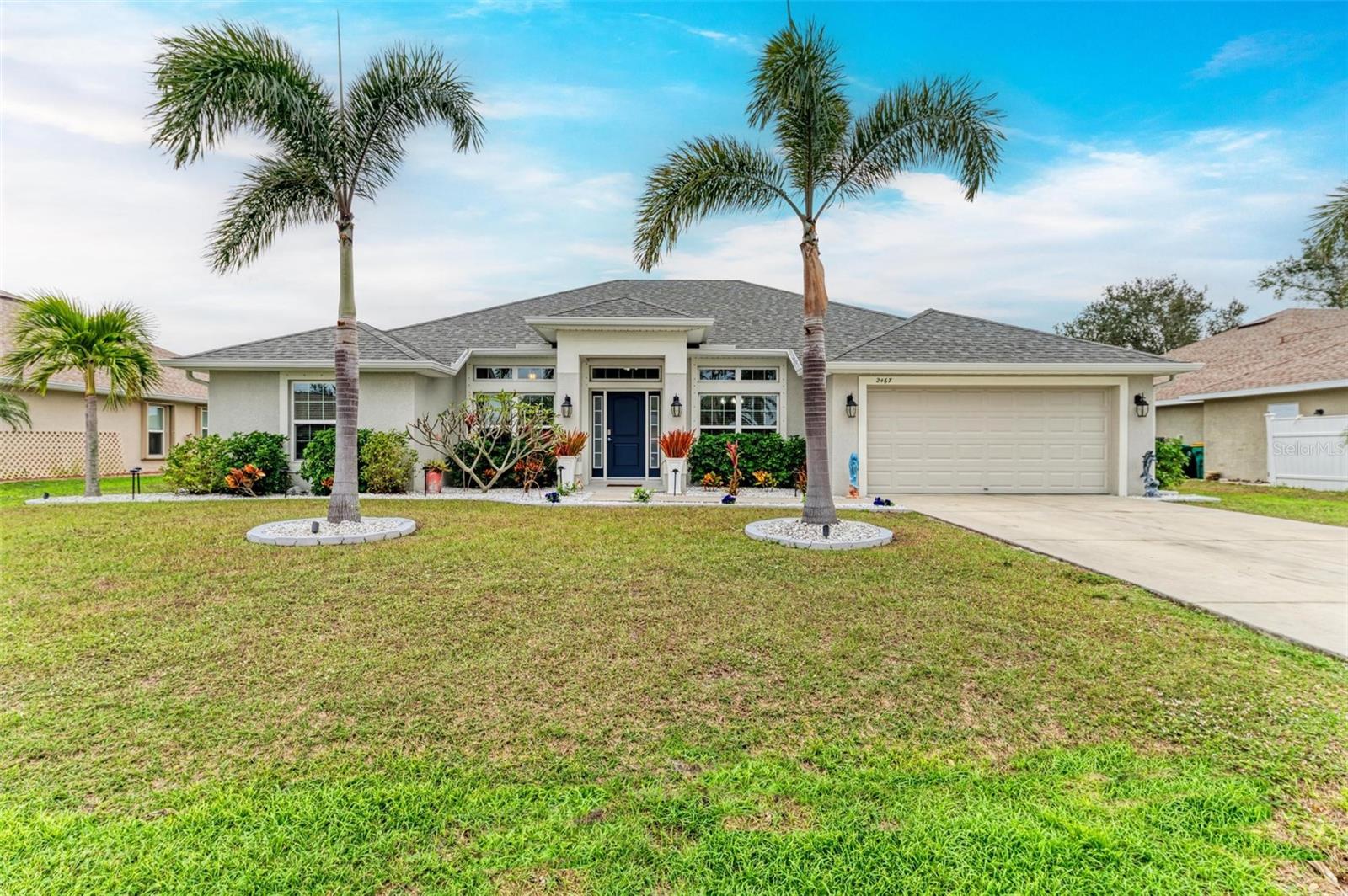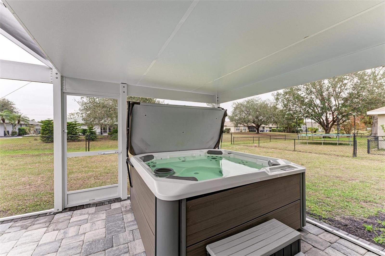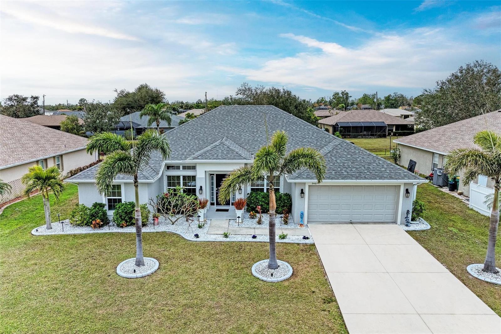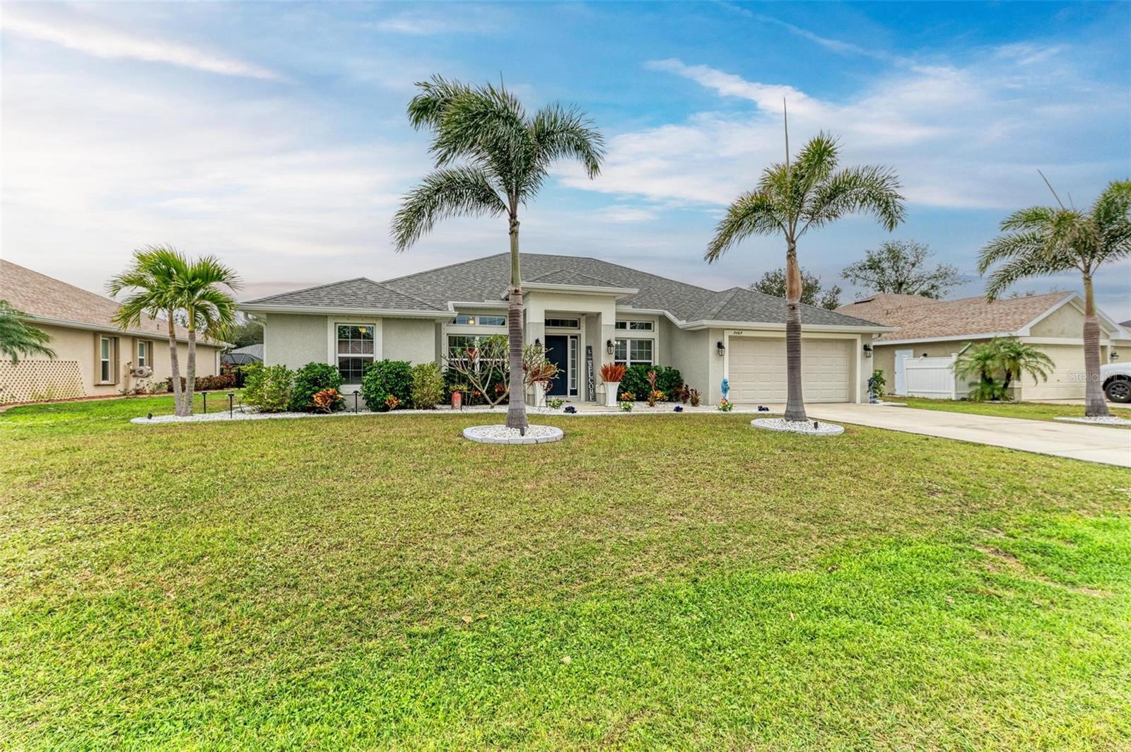 UPGRADES AWAIT AT THIS 2019 BUILT BLOCK HOME WITH HURRICANE SHUTTERS, A NEWLY ADDED MASSIVE SCREENED LANAI WITH ADDED HOT TUB/COVERED AREA & A LARGE FENCED/PRIVATE BACKYARD. Enjoy 4 bedrooms, 2 bathrooms, A DEN/5th Bedroom, a formal dining room, an open living room with vaulted ceilings, upgraded light fixtures, granite counters, upgraded stainless steel appliances and more! From the charming entry way, enter the spacious foyer with the den to the left and the formal dining room to the right. Farther inside, the great room is open to the kitchen with breakfast bar and dinette area, all overlooking the beautiful backyard/lanai. To the left side of the home, 2 spacious guest bedrooms are down a hallway with a shared guest bathroom with tub/shower combo. The 3rd guest bedroom (currently used as a gym) has private access to the lanai. On the opposite side of the home, the massive primary bedroom also has lanai access, an added mini-split A/C to make it super cool and comfortable while sleeping, and an en suite bathroom with dual walk-in closets, a large shower, and a huge vanity with dual sinks and storage. Also on this side, the laundry room and extra closet/storage space connect through to the 2 car garage. As mentioned, the outside backyard is a fantastic place to relax or host cookouts with great spaces for all! Nearby to area top-rated schools, shopping, parks and restaurants in the neighborhood, nearby golf and boating, and more! BE SURE TO CLICK THE FULL VIRTUAL TOUR LINKS FOR DETAILS!