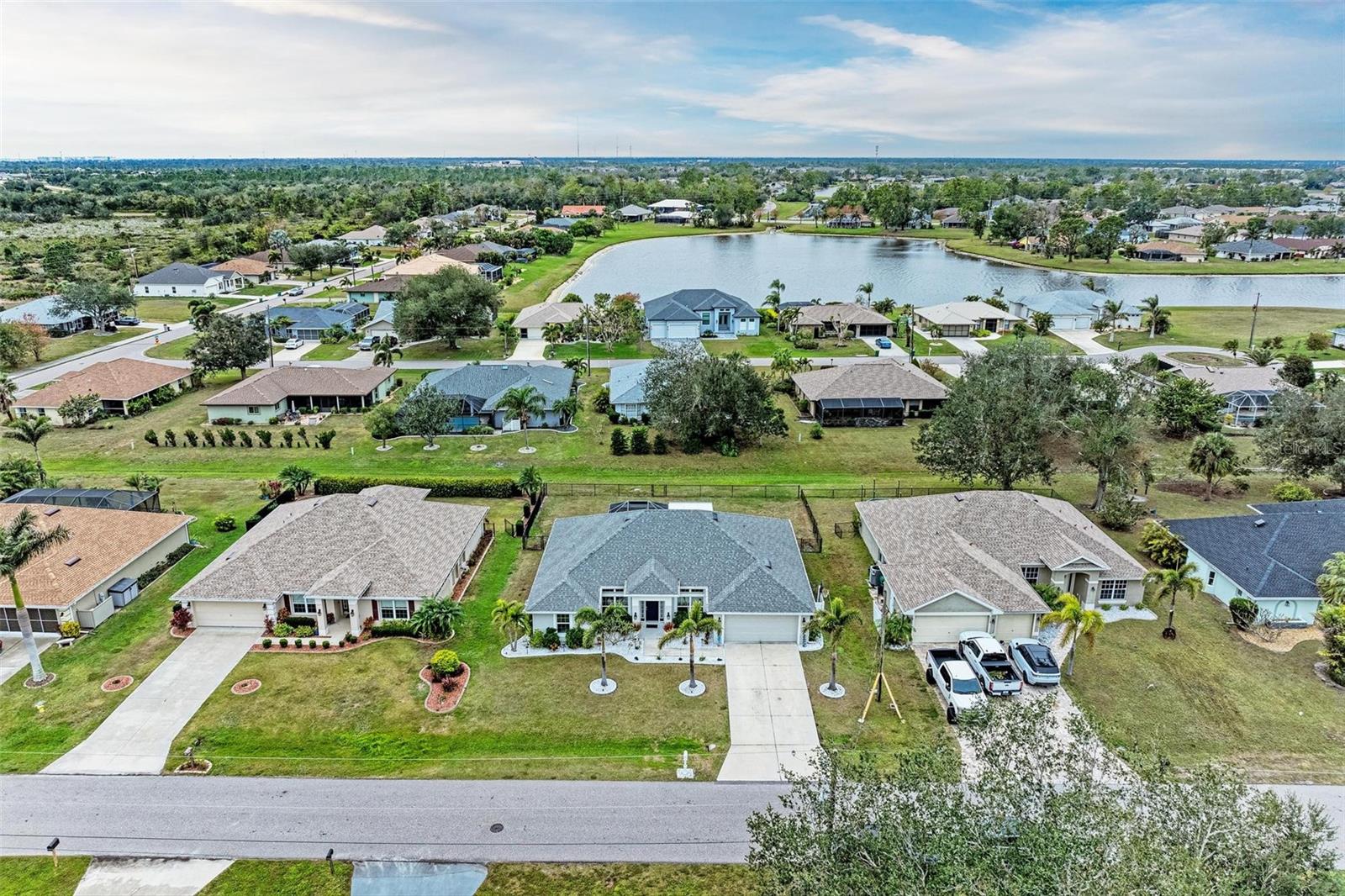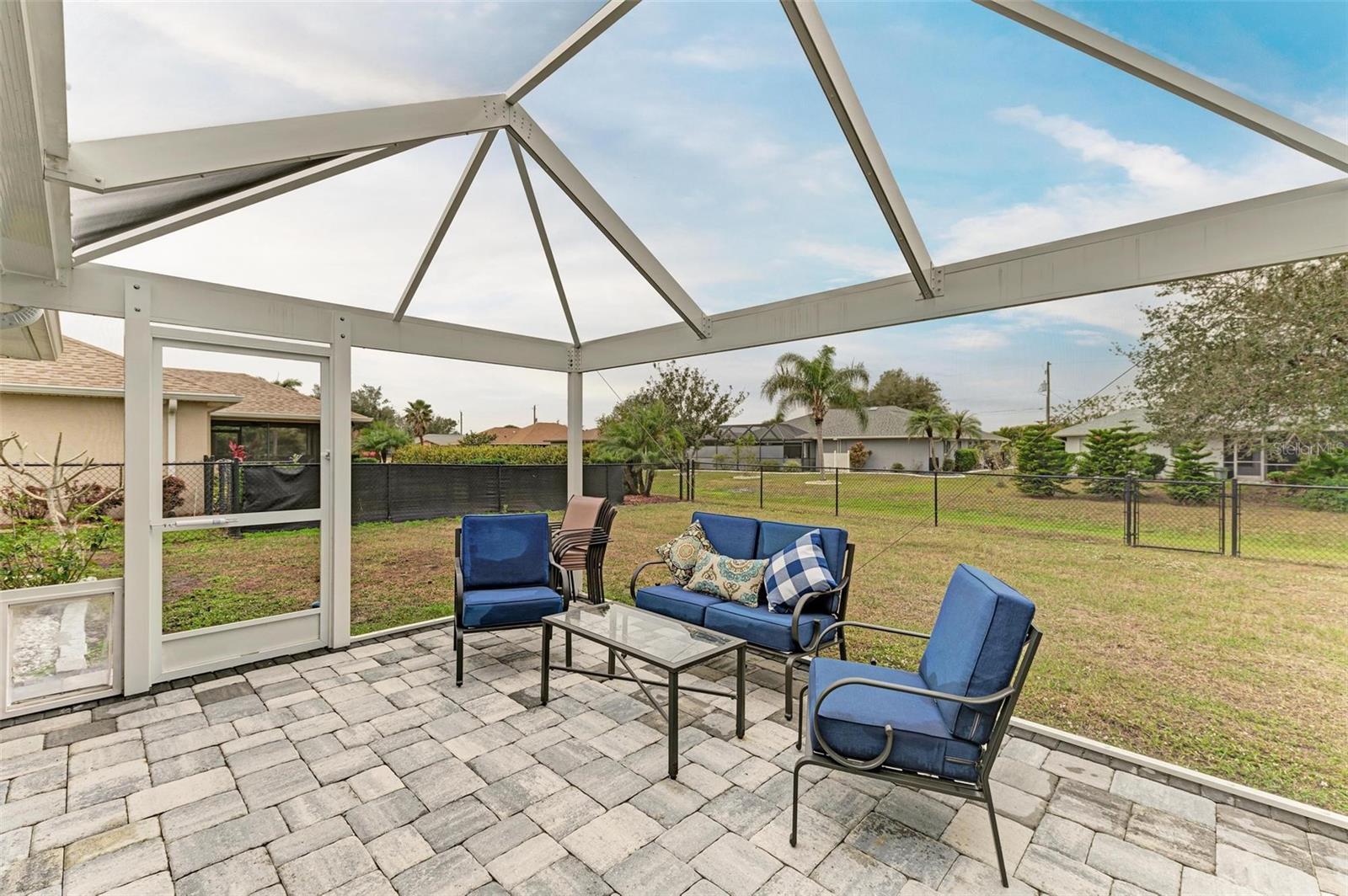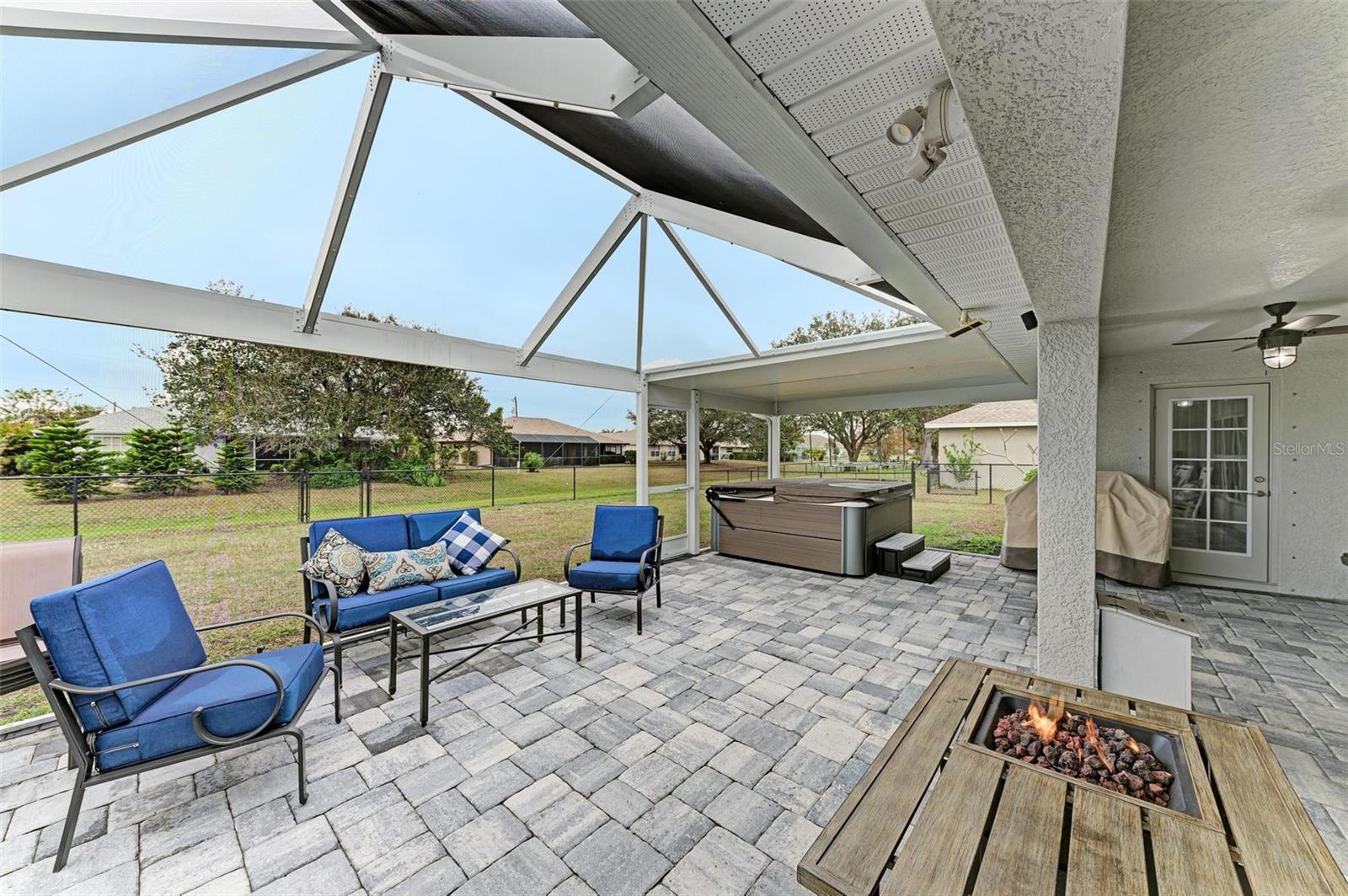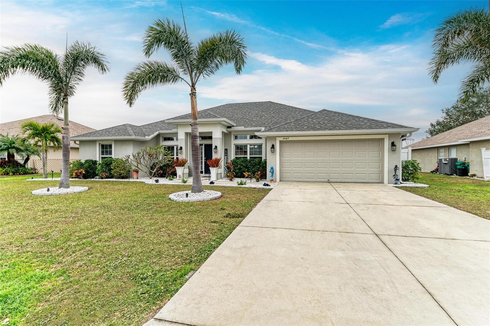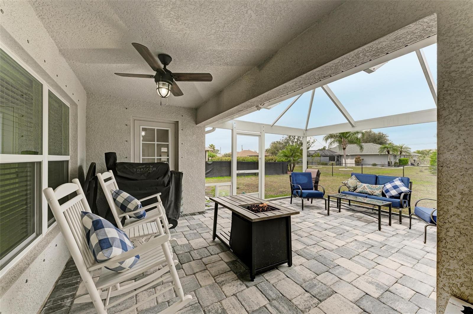 UPGRADES AWAIT AT THIS 2019 BUILT BLOCK HOME WITH HURRICANE SHUTTERS, A NEWLY ADDED MASSIVE SCREENED LANAI WITH ADDED HOT TUB/COVERED AREA & A LARGE FENCED/PRIVATE BACKYARD. Enjoy 4 bedrooms, 2 bathrooms, A DEN/5th Bedroom, a formal dining room, an open living room with vaulted ceilings, upgraded light fixtures, granite counters, upgraded stainless steel appliances and more! From the charming entry way, enter the spacious foyer with the den to the left and the formal dining room to the right. Farther inside, the great room is open to the kitchen with breakfast bar and dinette area, all overlooking the beautiful backyard/lanai. To the left side of the home, 2 spacious guest bedrooms are down a hallway with a shared guest bathroom with tub/shower combo. The 3rd guest bedroom (currently used as a gym) has private access to the lanai. On the opposite side of the home, the massive primary bedroom also has lanai access, an added mini-split A/C to make it super cool and comfortable while sleeping, and an en suite bathroom with dual walk-in closets, a large shower, and a huge vanity with dual sinks and storage. Also on this side, the laundry room and extra closet/storage space connect through to the 2 car garage. As mentioned, the outside backyard is a fantastic place to relax or host cookouts with great spaces for all! Nearby to area top-rated schools, shopping, parks and restaurants in the neighborhood, nearby golf and boating, and more! BE SURE TO CLICK THE FULL VIRTUAL TOUR LINKS FOR DETAILS!
