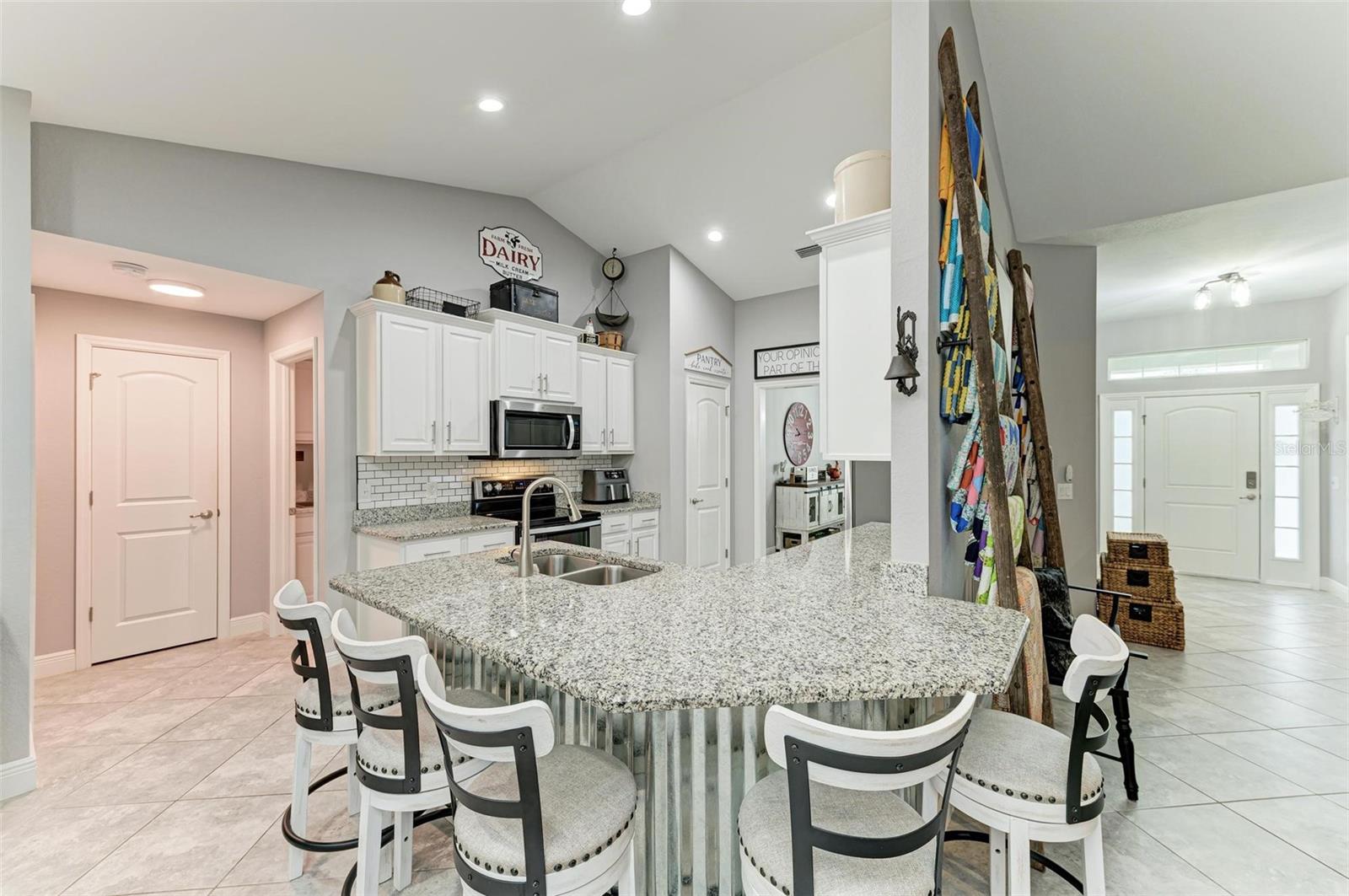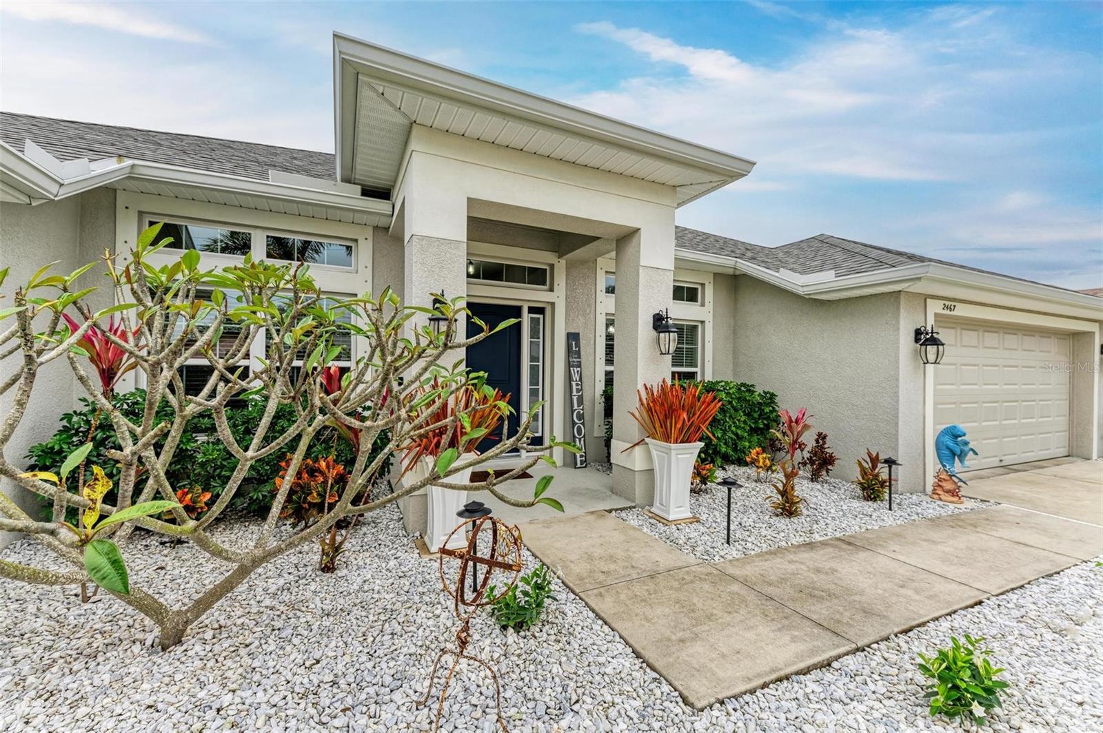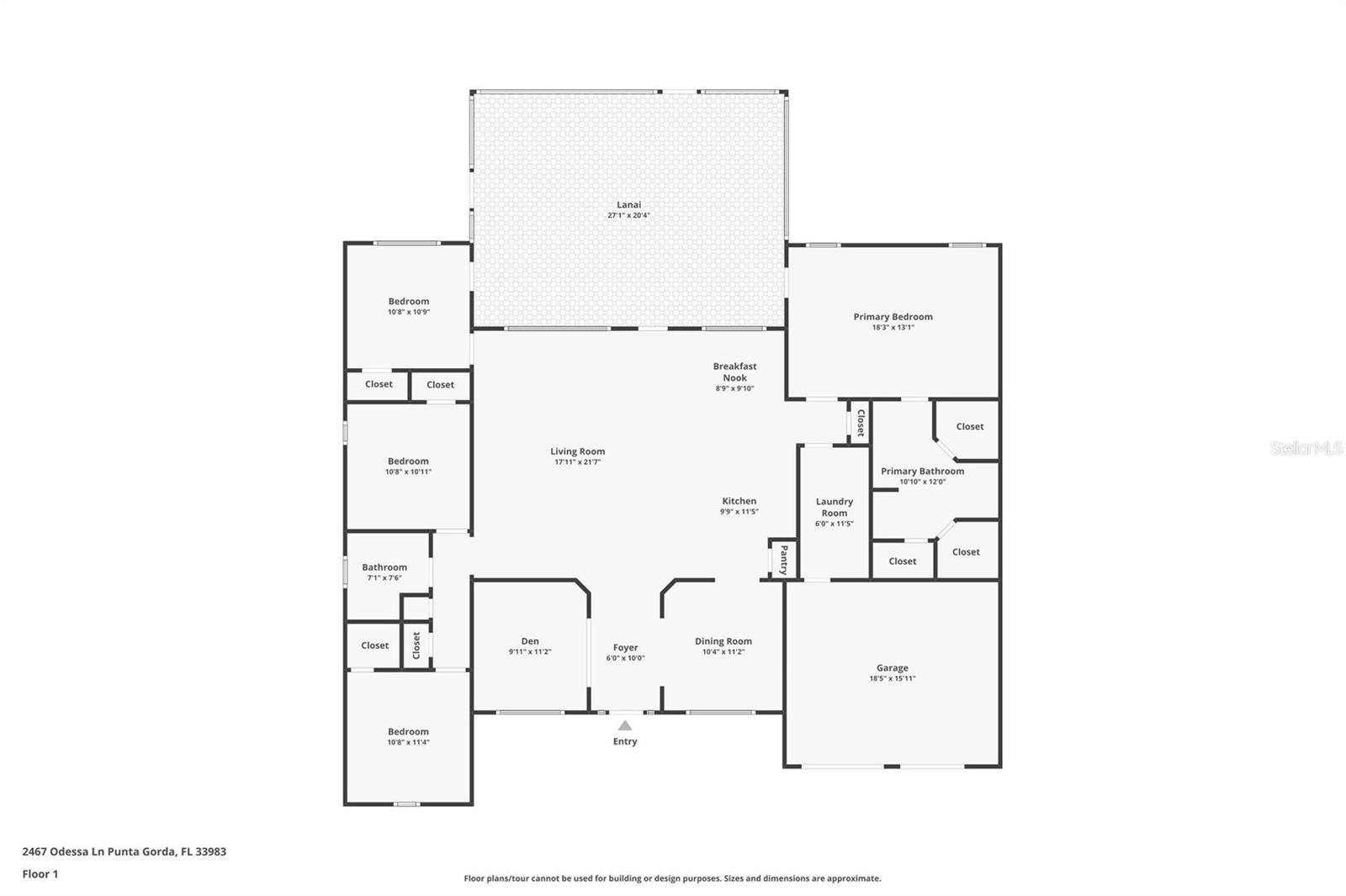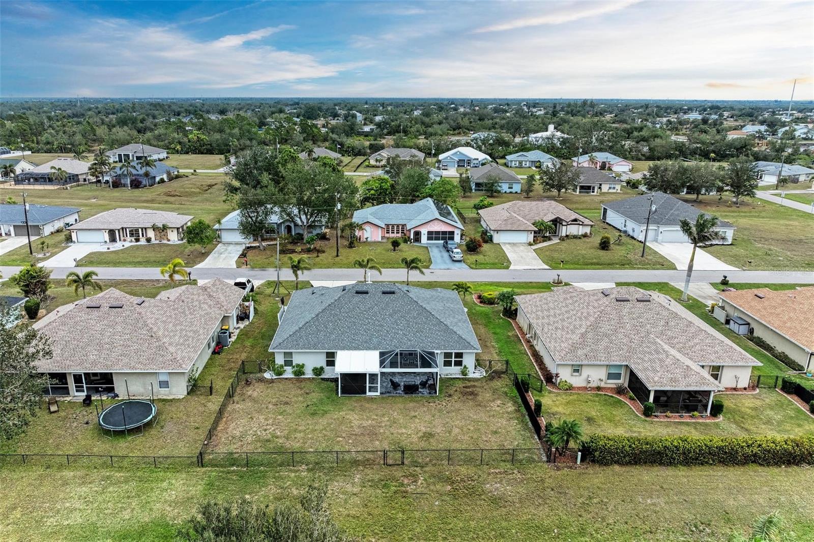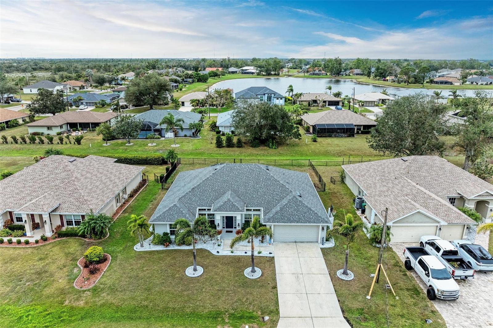 UPGRADES AWAIT AT THIS 2019 BUILT BLOCK HOME WITH HURRICANE SHUTTERS, A NEWLY ADDED MASSIVE SCREENED LANAI WITH ADDED HOT TUB/COVERED AREA & A LARGE FENCED/PRIVATE BACKYARD. Enjoy 4 bedrooms, 2 bathrooms, A DEN/5th Bedroom, a formal dining room, an open living room with vaulted ceilings, upgraded light fixtures, granite counters, upgraded stainless steel appliances and more! From the charming entry way, enter the spacious foyer with the den to the left and the formal dining room to the right. Farther inside, the great room is open to the kitchen with breakfast bar and dinette area, all overlooking the beautiful backyard/lanai. To the left side of the home, 2 spacious guest bedrooms are down a hallway with a shared guest bathroom with tub/shower combo. The 3rd guest bedroom (currently used as a gym) has private access to the lanai. On the opposite side of the home, the massive primary bedroom also has lanai access, an added mini-split A/C to make it super cool and comfortable while sleeping, and an en suite bathroom with dual walk-in closets, a large shower, and a huge vanity with dual sinks and storage. Also on this side, the laundry room and extra closet/storage space connect through to the 2 car garage. As mentioned, the outside backyard is a fantastic place to relax or host cookouts with great spaces for all! Nearby to area top-rated schools, shopping, parks and restaurants in the neighborhood, nearby golf and boating, and more! BE SURE TO CLICK THE FULL VIRTUAL TOUR LINKS FOR DETAILS!
