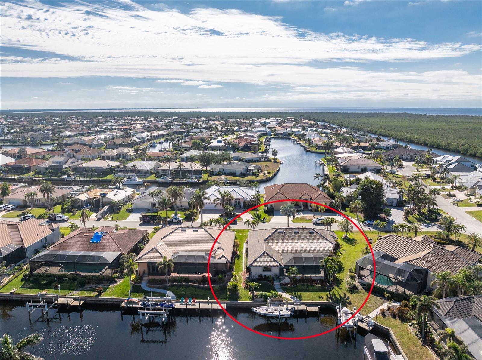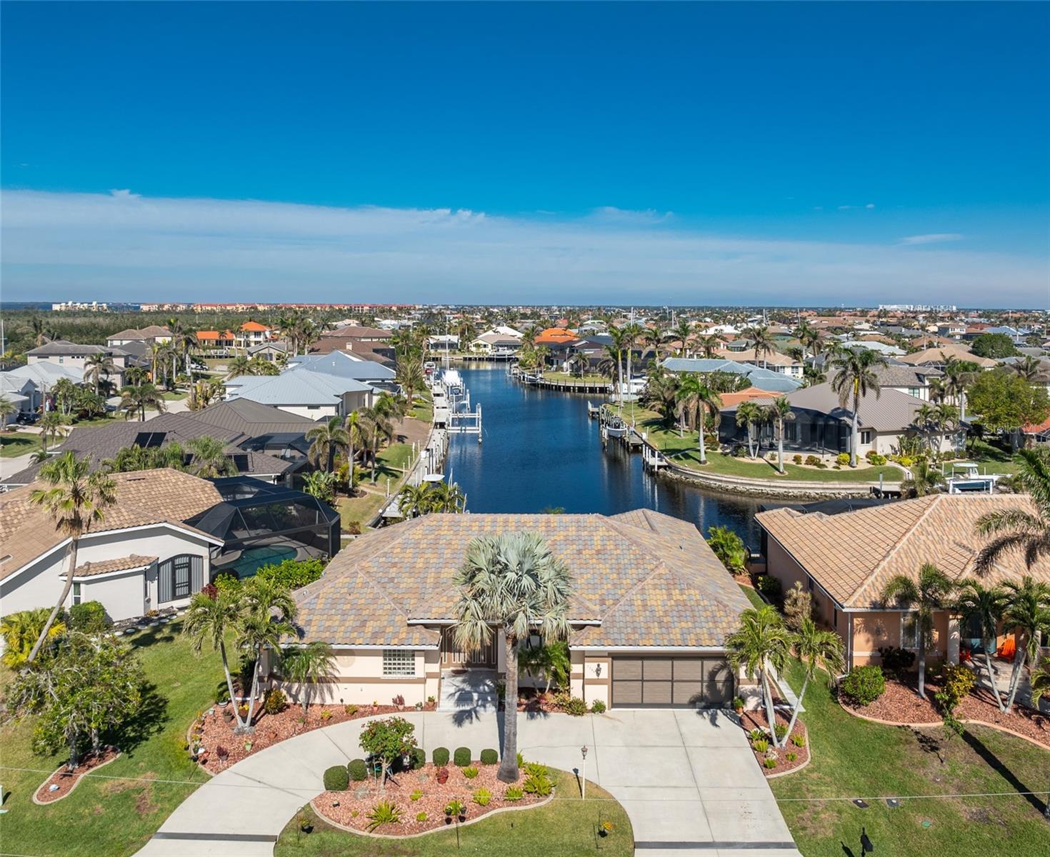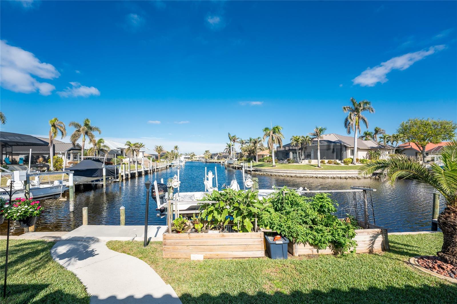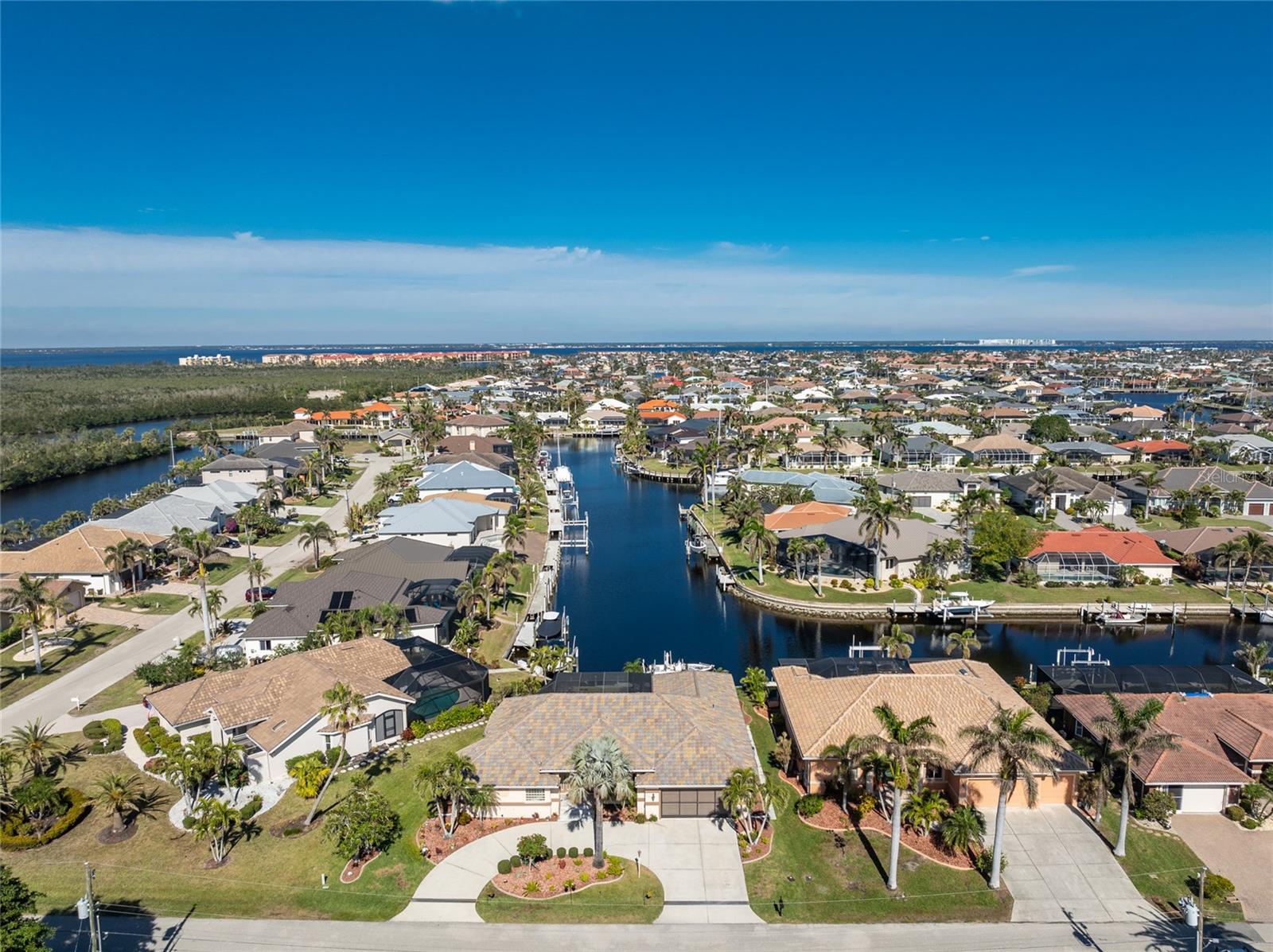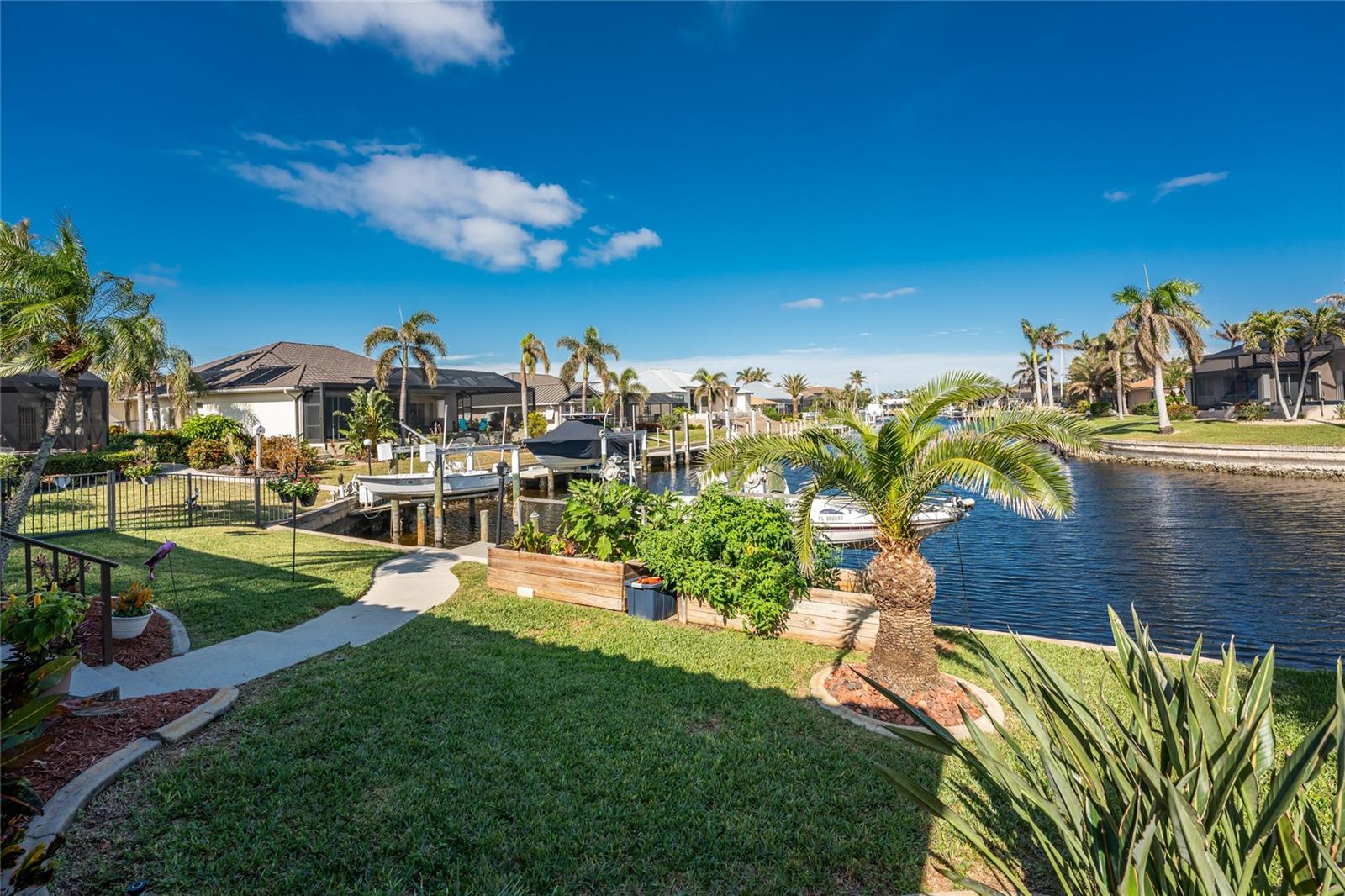 Welcome to the most desired section of Punta Gorda Isles, and it's not just the location, it's the neighbors! DIRECT SAILBOAT WATER, just minutes to the Harbor. The second you step into this bright and airy home and see the 3 sliding doors that lead out to the Lanai you grasp the Indoor - Outdoor living concept that Florida living is all about! Imagine starting your day with a coffee, or sharing an evening cocktail with that view! Everything about this home is Large, including the Kitchen that features a dinette as well as a counter bar. The Lanai is just as accessible from the primary and larger guest bedroom as well. Tile flooring throughout. New roof in 2023, new A/C in 2020, and Hurricane protection all add to peace of mind. The Dock includes a 10,000# boat lift and city maintained seawalls. This one is a must see. DON'T MISS IT!