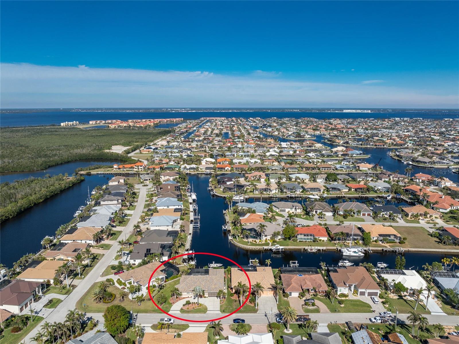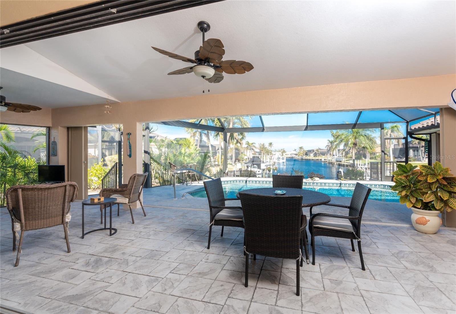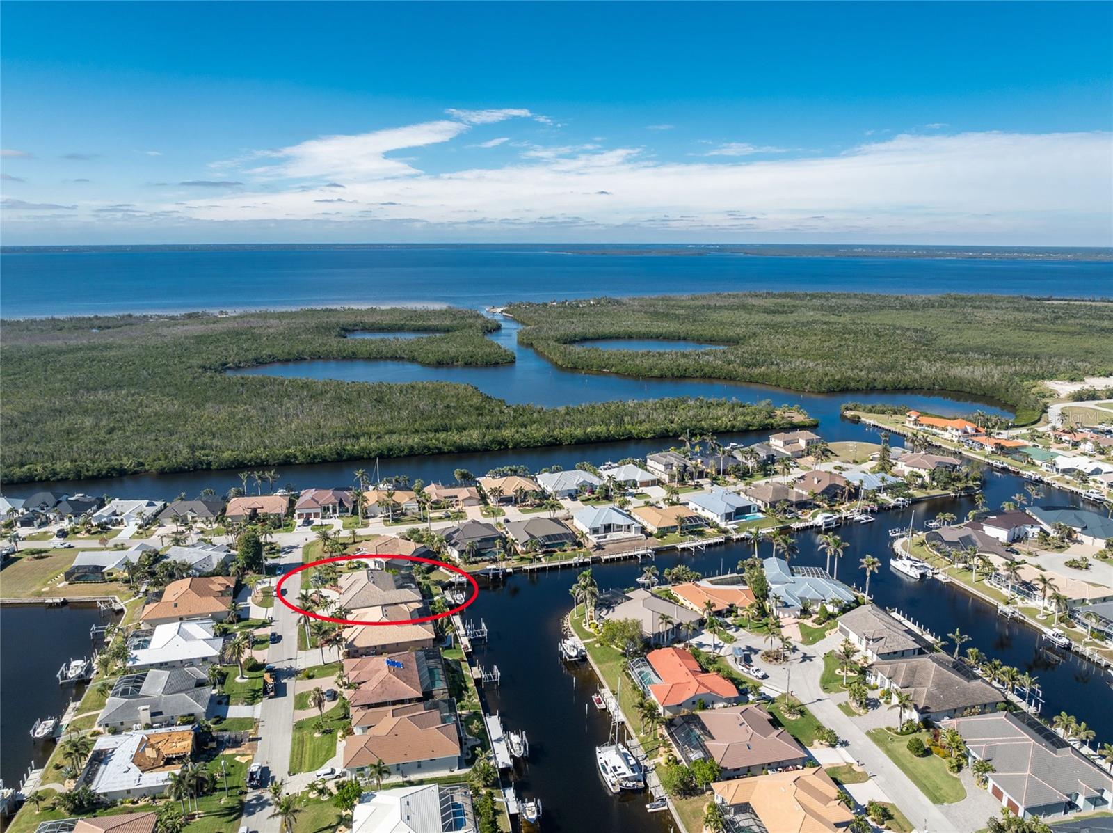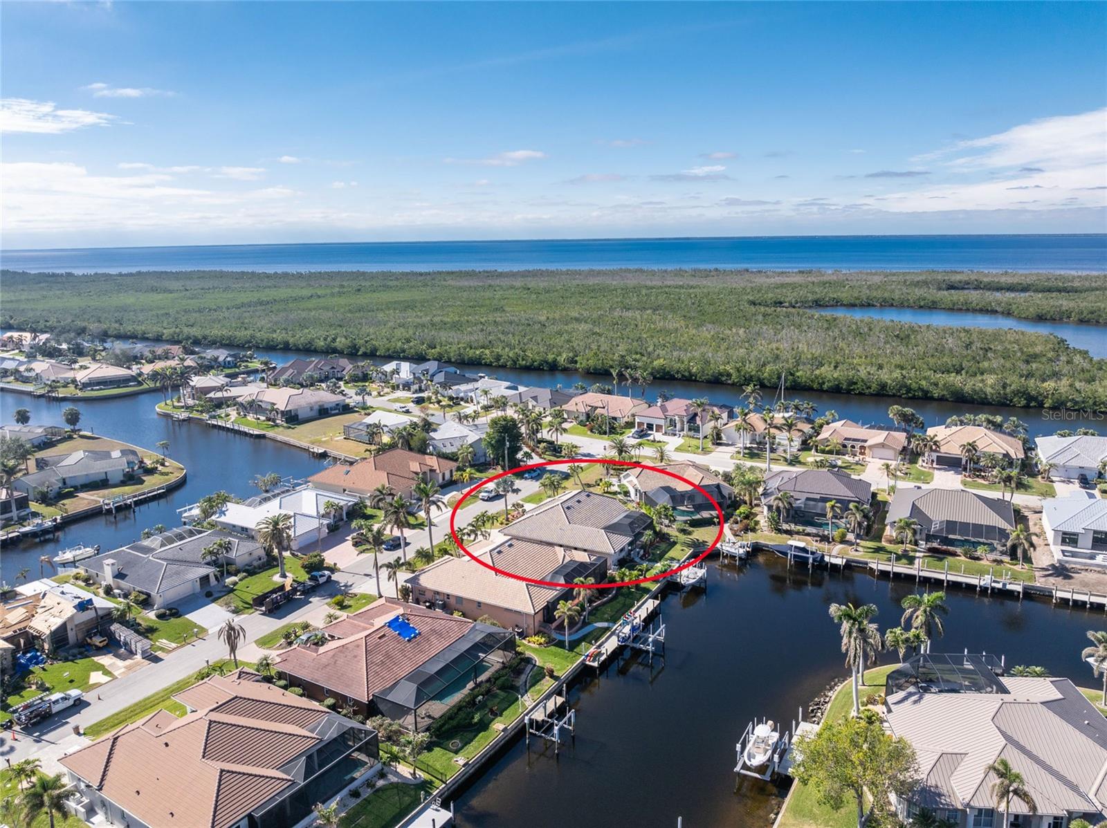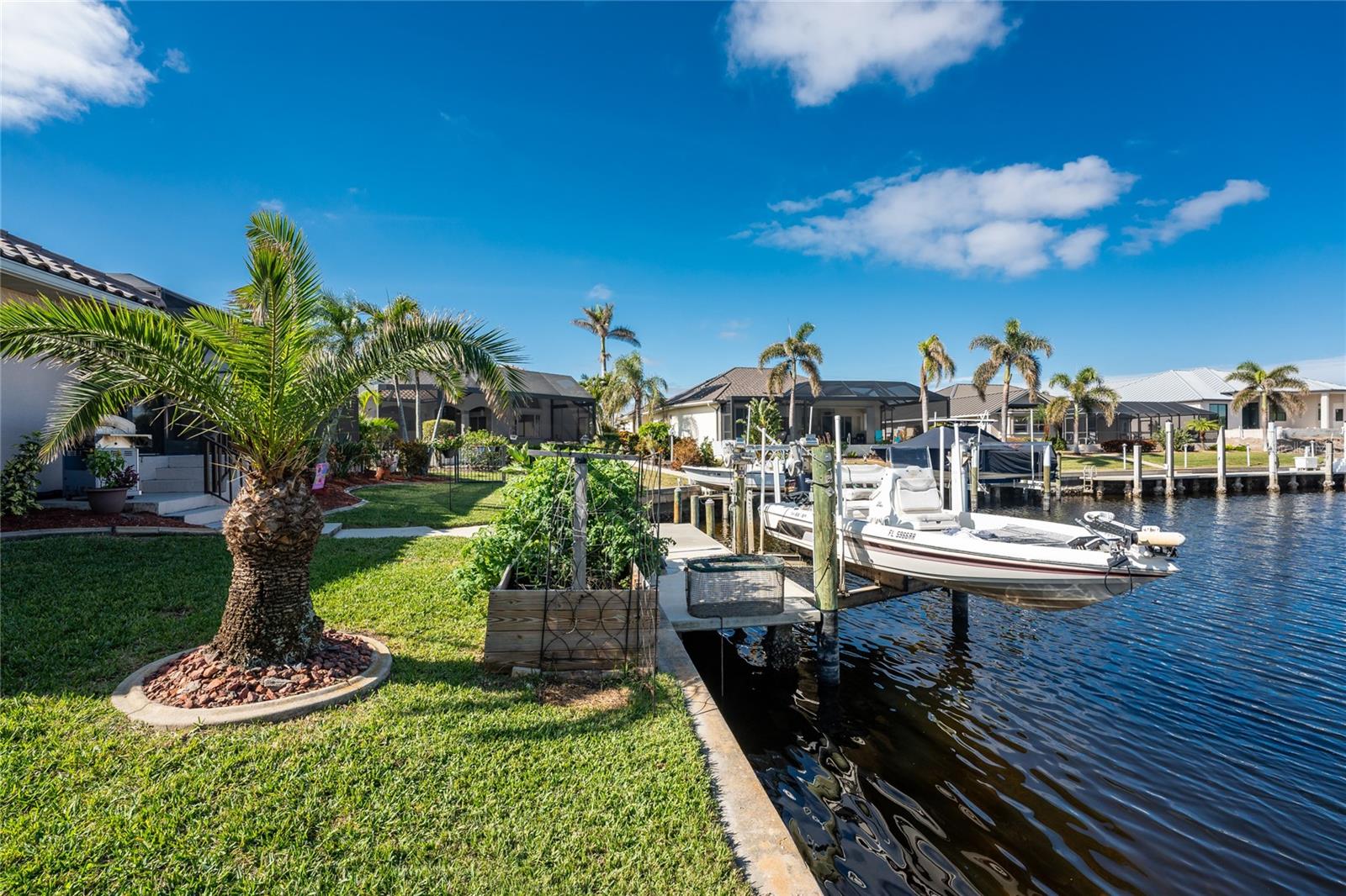 Welcome to the most desired section of Punta Gorda Isles, and it's not just the location, it's the neighbors! DIRECT SAILBOAT WATER, just minutes to the Harbor. The second you step into this bright and airy home and see the 3 sliding doors that lead out to the Lanai you grasp the Indoor - Outdoor living concept that Florida living is all about! Imagine starting your day with a coffee, or sharing an evening cocktail with that view! Everything about this home is Large, including the Kitchen that features a dinette as well as a counter bar. The Lanai is just as accessible from the primary and larger guest bedroom as well. Tile flooring throughout. New roof in 2023, new A/C in 2020, and Hurricane protection all add to peace of mind. The Dock includes a 10,000# boat lift and city maintained seawalls. This one is a must see. DON'T MISS IT!