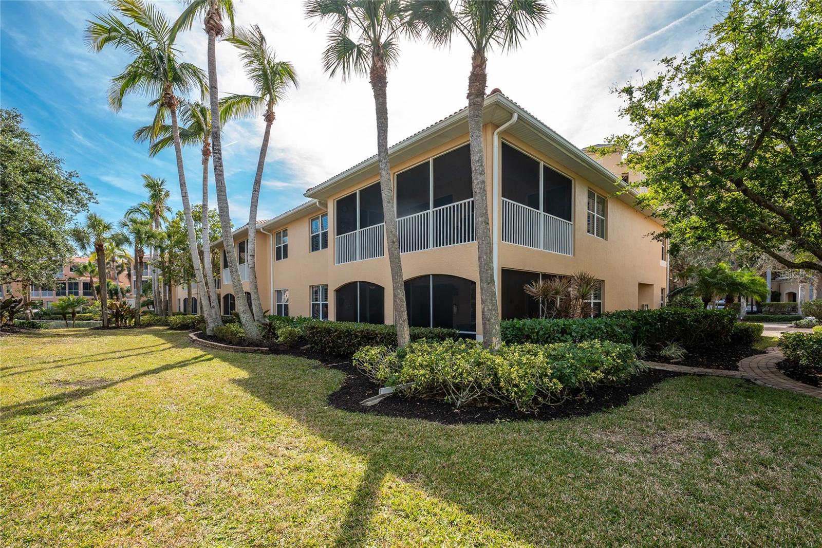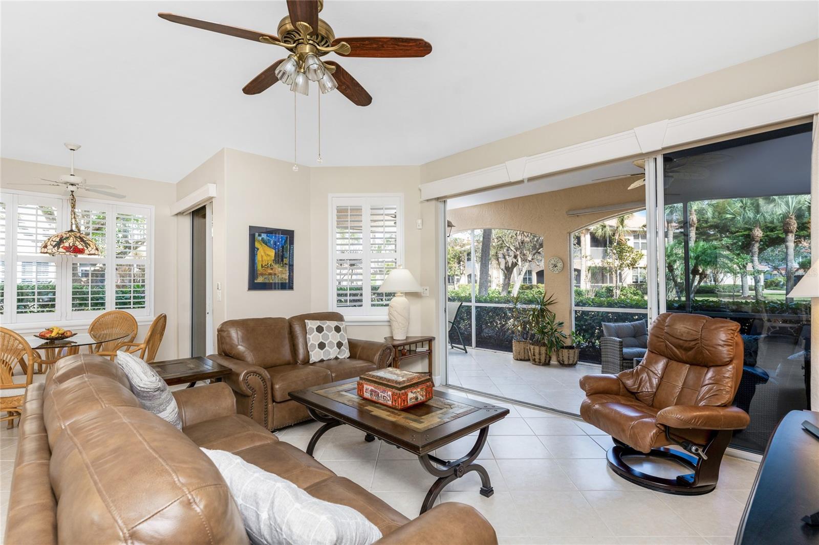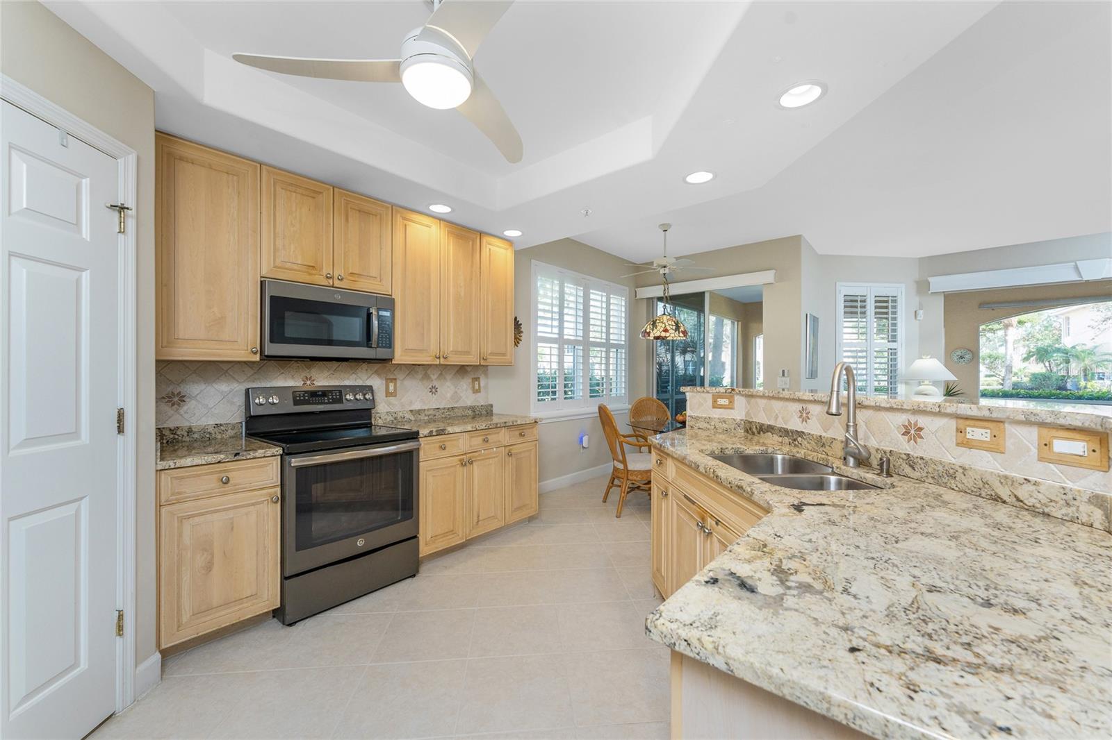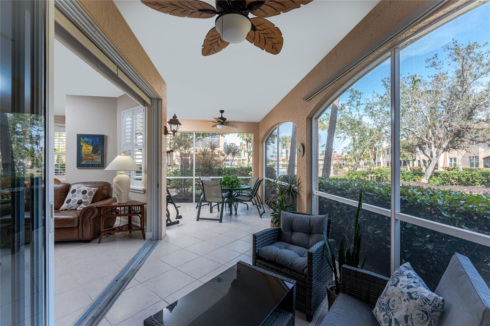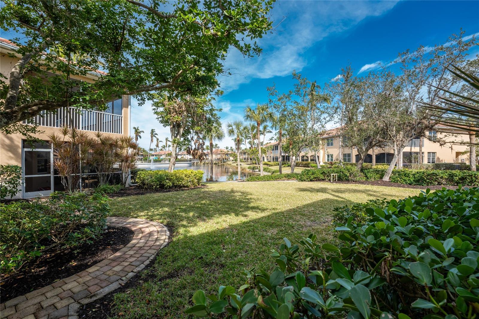 Experience the ease of tropical living in this beautifully appointed ground-level Tobago condo, situated on a private gated peninsula between two marina basins at Burnt Store Marina. Surrounded by a spacious yard with lush vegetation, you will find that this is a place to unwind. Just a short stroll from the floating island pool and spa, and steps away from the wonderful waterfront esplanade… this truly an incredible resort lifestyle. Burnt Store Marina residents also enjoy access to two on-site restaurants, tennis, pickleball and fitness center, a 27-hole executive golf course, and the largest deepwater marina in SWFL.This desirable turnkey-furnished two bedroom plus den residence boasts a well designed open floor plan that is both comfortable and convenient. Here you can enjoy the conveniences of a single family home with the attached two car garage, but enjoy the maintenance-free ease of owning a condo. Step inside to a light filled open floor plan where the updated kitchen shines with granite countertops, neutral tile backsplash, light toned wood cabinetry, stainless steel appliances, and a custom pantry for optimal storage. The neutral color palette and diamond-set tile surround the two sets of sliding doors which welcome in tropical breezes and natural light - drawing you to your own tropical oasis. Step through the sliding doors to discover Florida’s perfect weather from the screened and tiled lanai. The tropical landscape and peaceful lake views create an idyllic backdrop for morning coffee or evening relaxation. Electric roll-down shades on all sliding doors provide effortless privacy at the touch of a button. The handsome primary suite is a serene retreat, featuring neutral luxury vinyl plank flooring, plantation shutters, and a large walk-in closet. It features a tray ceiling, large window and sliding glass doors that frame the park-like views of the landscape. The ensuite bath offers an expansive vanity with dual sinks, tiled walk-in shower, and additional closet space. A well-appointed guest bedroom and versatile den—both with LVP flooring and plantation shutters—offer comfortable accommodations for family or home office needs. The handy attached two-car garage, complete with an electric car charger and extra shelving, makes this home as functional as it is beautiful. Walk across the street to the marina-walk and experience a fiery Florida Sunset over the channel entrance, raise your glass and toast the wonderful place you are soon to call home.