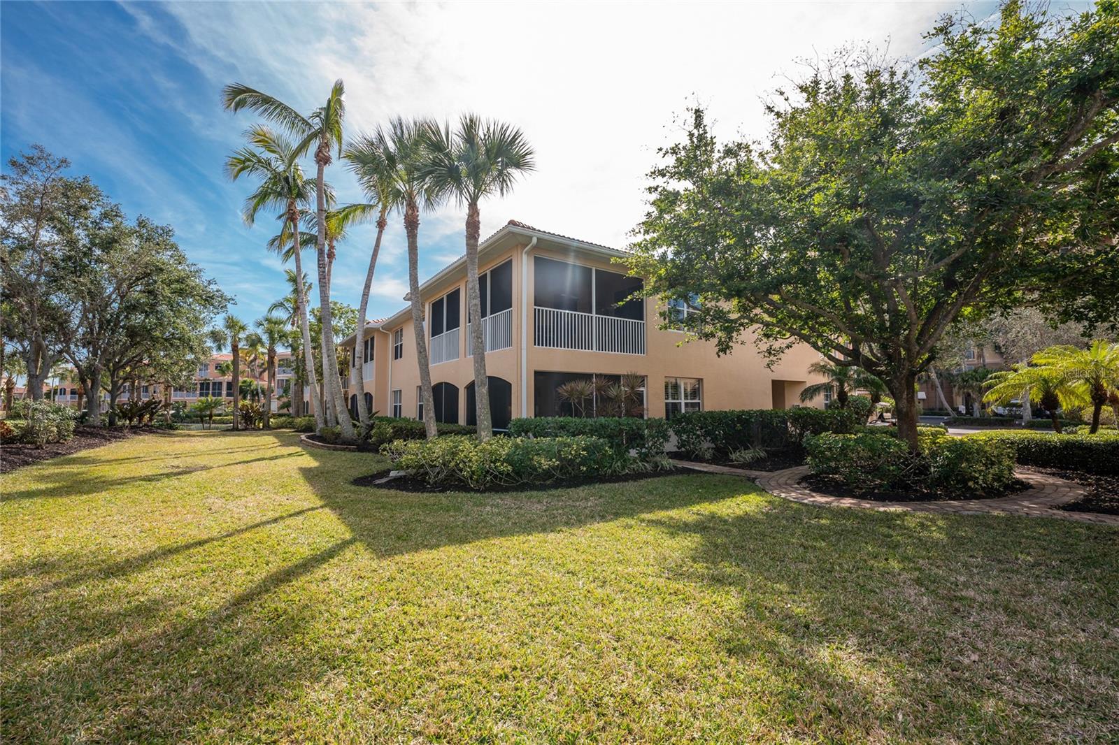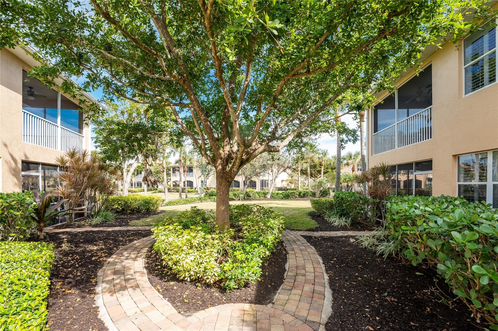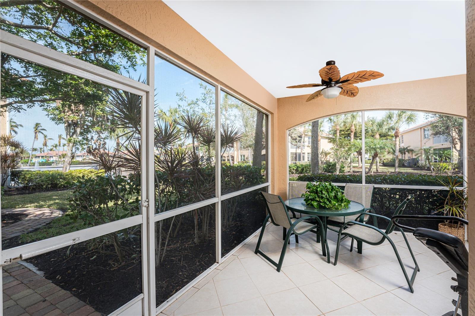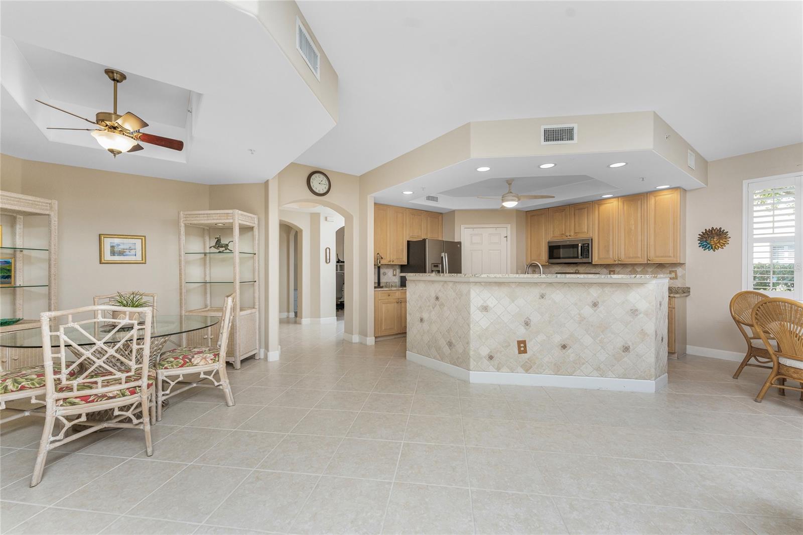 Experience the ease of tropical living in this beautifully appointed ground-level Tobago condo, situated on a private gated peninsula between two marina basins at Burnt Store Marina. Surrounded by a spacious yard with lush vegetation, you will find that this is a place to unwind. Just a short stroll from the floating island pool and spa, and steps away from the wonderful waterfront esplanade… this truly an incredible resort lifestyle. Burnt Store Marina residents also enjoy access to two on-site restaurants, tennis, pickleball and fitness center, a 27-hole executive golf course, and the largest deepwater marina in SWFL.This desirable turnkey-furnished two bedroom plus den residence boasts a well designed open floor plan that is both comfortable and convenient. Here you can enjoy the conveniences of a single family home with the attached two car garage, but enjoy the maintenance-free ease of owning a condo. Step inside to a light filled open floor plan where the updated kitchen shines with granite countertops, neutral tile backsplash, light toned wood cabinetry, stainless steel appliances, and a custom pantry for optimal storage. The neutral color palette and diamond-set tile surround the two sets of sliding doors which welcome in tropical breezes and natural light - drawing you to your own tropical oasis. Step through the sliding doors to discover Florida’s perfect weather from the screened and tiled lanai. The tropical landscape and peaceful lake views create an idyllic backdrop for morning coffee or evening relaxation. Electric roll-down shades on all sliding doors provide effortless privacy at the touch of a button. The handsome primary suite is a serene retreat, featuring neutral luxury vinyl plank flooring, plantation shutters, and a large walk-in closet. It features a tray ceiling, large window and sliding glass doors that frame the park-like views of the landscape. The ensuite bath offers an expansive vanity with dual sinks, tiled walk-in shower, and additional closet space. A well-appointed guest bedroom and versatile den—both with LVP flooring and plantation shutters—offer comfortable accommodations for family or home office needs. The handy attached two-car garage, complete with an electric car charger and extra shelving, makes this home as functional as it is beautiful. Walk across the street to the marina-walk and experience a fiery Florida Sunset over the channel entrance, raise your glass and toast the wonderful place you are soon to call home.