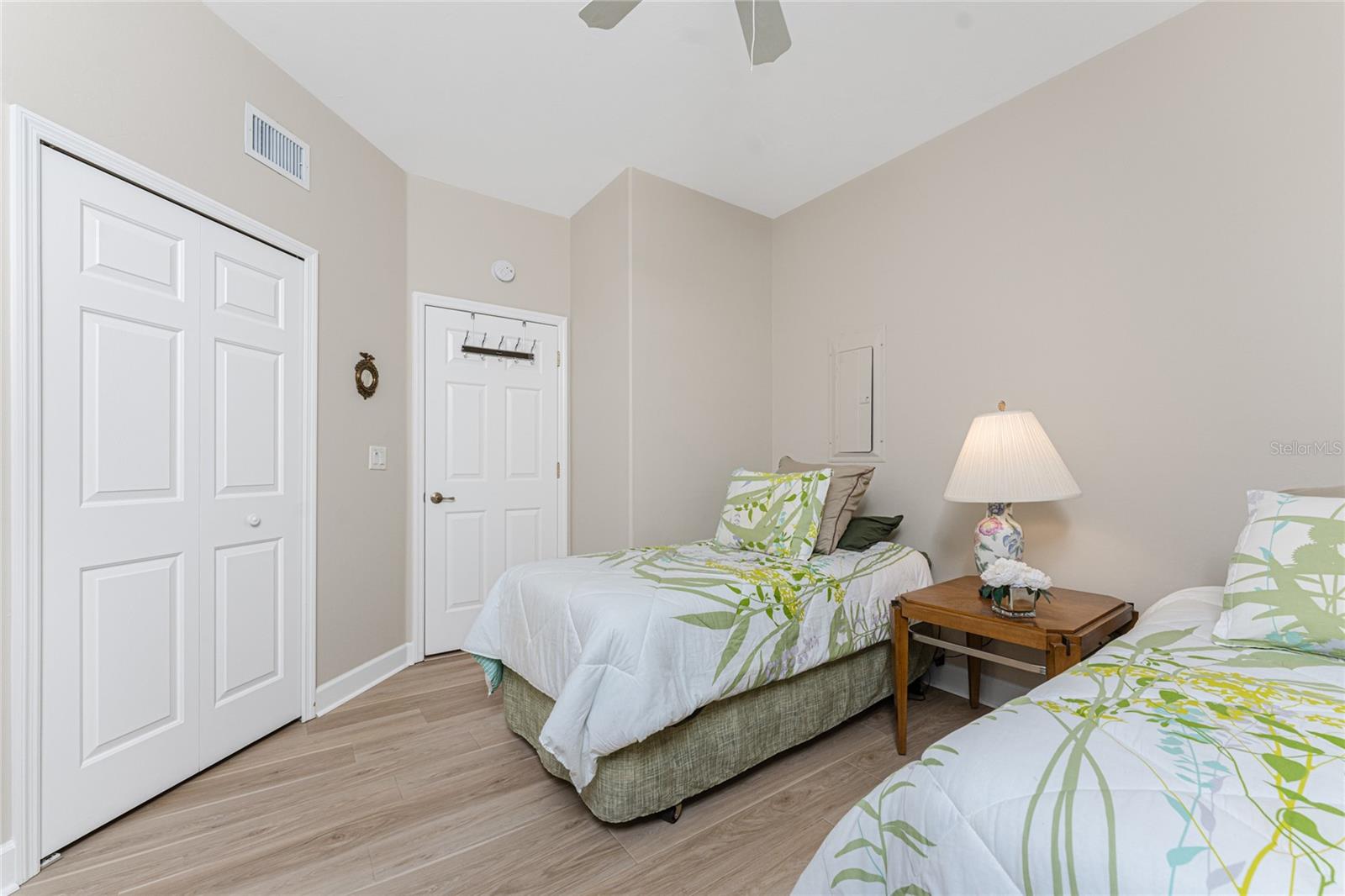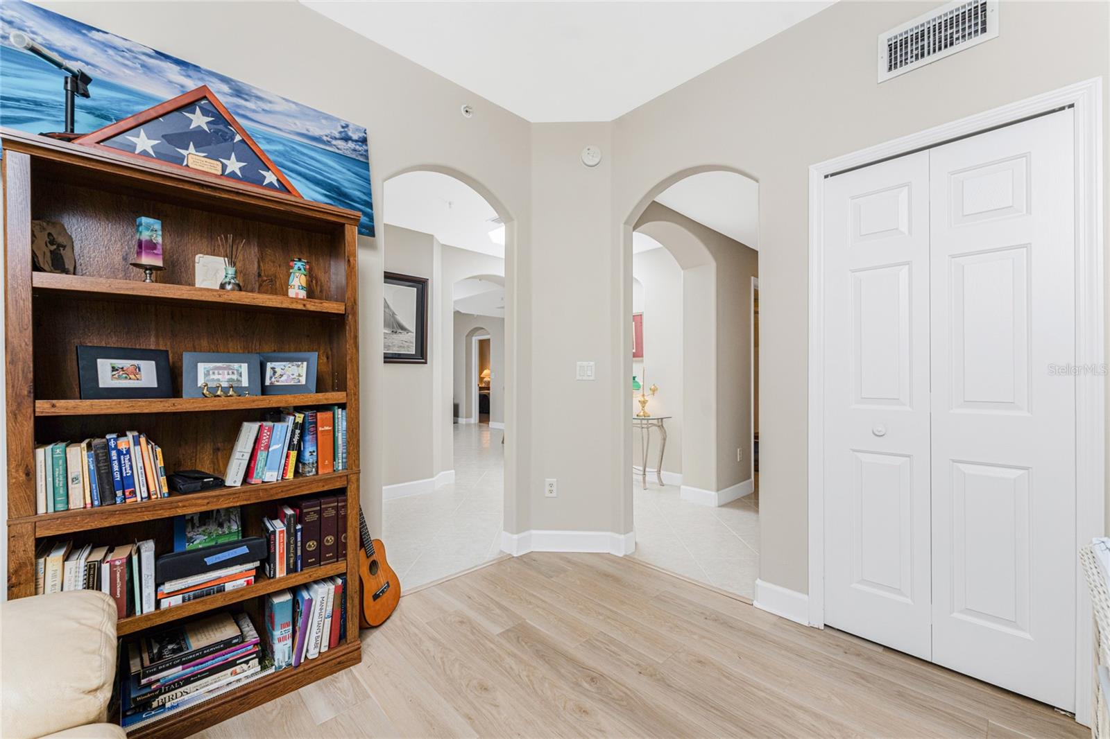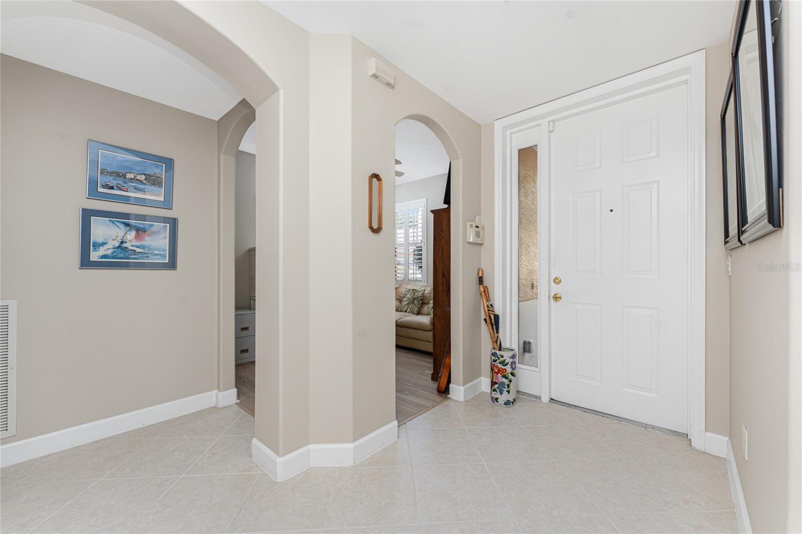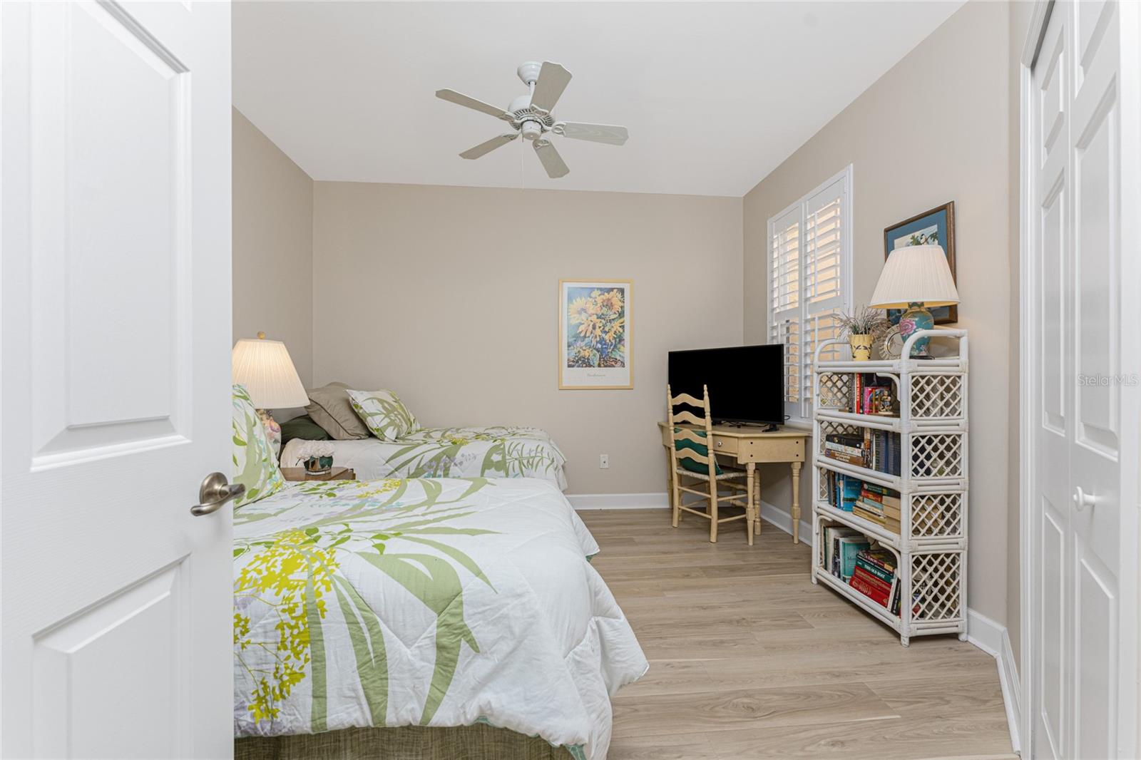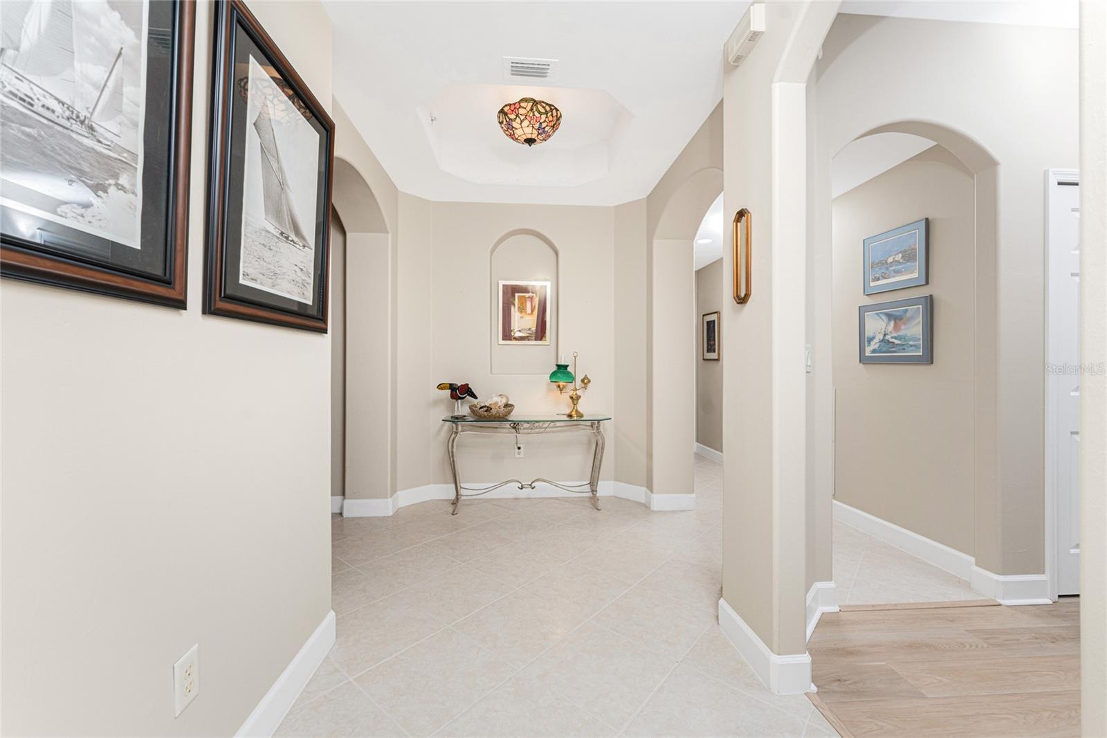 Experience the ease of tropical living in this beautifully appointed ground-level Tobago condo, situated on a private gated peninsula between two marina basins at Burnt Store Marina. Surrounded by a spacious yard with lush vegetation, you will find that this is a place to unwind. Just a short stroll from the floating island pool and spa, and steps away from the wonderful waterfront esplanade… this truly an incredible resort lifestyle. Burnt Store Marina residents also enjoy access to two on-site restaurants, tennis, pickleball and fitness center, a 27-hole executive golf course, and the largest deepwater marina in SWFL.This desirable turnkey-furnished two bedroom plus den residence boasts a well designed open floor plan that is both comfortable and convenient. Here you can enjoy the conveniences of a single family home with the attached two car garage, but enjoy the maintenance-free ease of owning a condo. Step inside to a light filled open floor plan where the updated kitchen shines with granite countertops, neutral tile backsplash, light toned wood cabinetry, stainless steel appliances, and a custom pantry for optimal storage. The neutral color palette and diamond-set tile surround the two sets of sliding doors which welcome in tropical breezes and natural light - drawing you to your own tropical oasis. Step through the sliding doors to discover Florida’s perfect weather from the screened and tiled lanai. The tropical landscape and peaceful lake views create an idyllic backdrop for morning coffee or evening relaxation. Electric roll-down shades on all sliding doors provide effortless privacy at the touch of a button. The handsome primary suite is a serene retreat, featuring neutral luxury vinyl plank flooring, plantation shutters, and a large walk-in closet. It features a tray ceiling, large window and sliding glass doors that frame the park-like views of the landscape. The ensuite bath offers an expansive vanity with dual sinks, tiled walk-in shower, and additional closet space. A well-appointed guest bedroom and versatile den—both with LVP flooring and plantation shutters—offer comfortable accommodations for family or home office needs. The handy attached two-car garage, complete with an electric car charger and extra shelving, makes this home as functional as it is beautiful. Walk across the street to the marina-walk and experience a fiery Florida Sunset over the channel entrance, raise your glass and toast the wonderful place you are soon to call home.