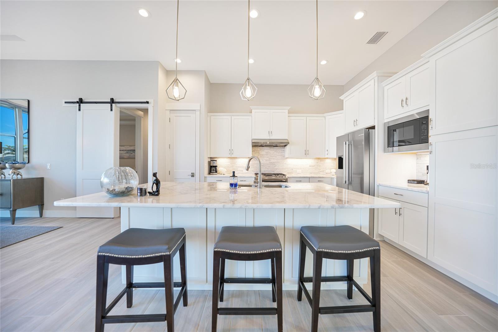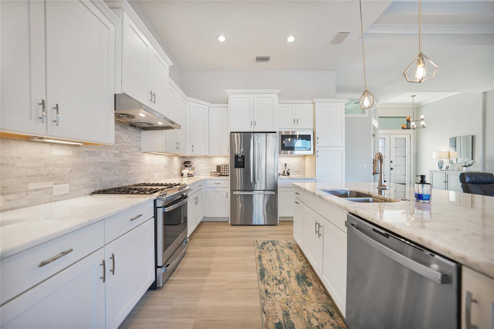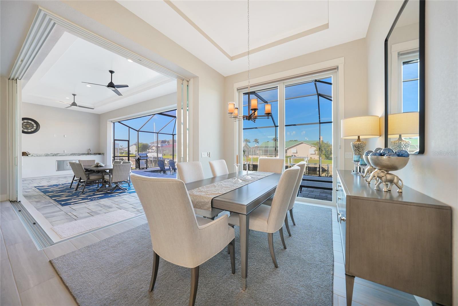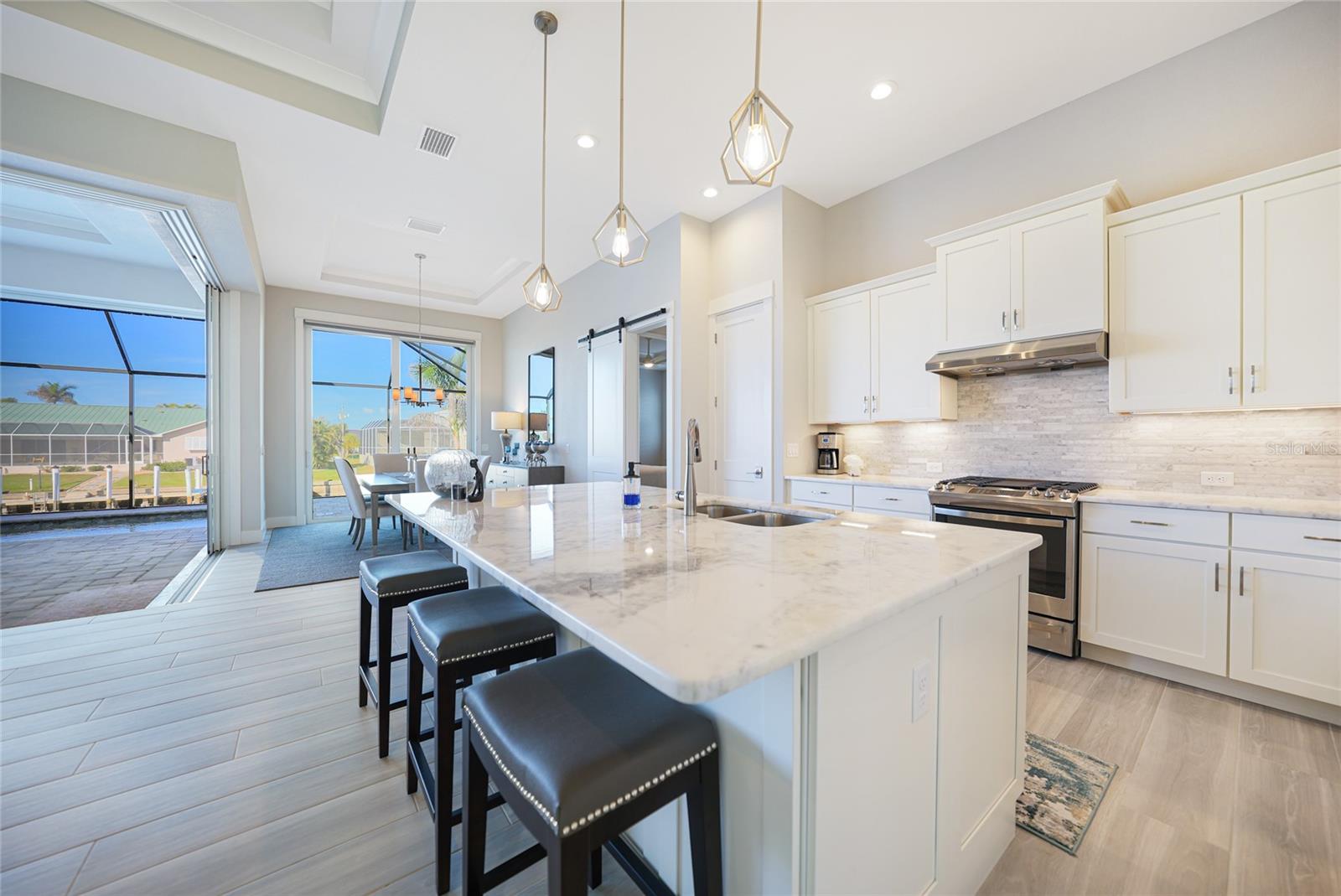 Experience the pinnacle of waterfront living in this stunning custom-built pool home, offering direct access to both Charlotte Harbor and the Gulf! Situated in the highly sought-after Punta Gorda Isles, this exceptional residence was expertly crafted by DM Dean Builders. With 3 bedrooms, 2.5 bathrooms, and an oversized 3-car garage, the home perfectly blends luxury with functionality. Completed in 10/28/22, it spans 2,308 sq. ft. of beautifully updated living space. As you arrive, the meticulously landscaped yard, brick paver driveway and walkway, and striking stacked stone façade set the stage for the sophisticated interiors. Step through the grand double doors into an expansive open-concept layout, where soaring coffered ceilings and sleek wood plank tile flooring create a warm and welcoming atmosphere. The 10-foot sliding glass doors invite natural light and feature retractable electric hurricane protection for peace of mind. When opened, the 90-degree sliders seamlessly connect the living space to the outdoor area, leading to the heated pool and brick-paved lanai—perfect for relaxing or entertaining. The flow from the living room into the dining area and gourmet kitchen makes this home ideal for gatherings. The chef-inspired kitchen is a true standout, showcasing Quartz countertop, Porcelain stacked stone backsplash, a spacious center island with seating and pendant lighting, two pantry closets, and 48” Shaker-style cabinets with crown molding. Premium stainless steel appliances, including a GE gas range and Bosch refrigerator, complete the space. The dining room, with expansive water views, offers a serene setting for meals and entertaining. Just off the living area, elegant French doors open to a versatile office/den, ideal for remote work or quiet retreat. The private master suite is a tranquil escape, featuring a double tray ceiling, private pool access, and two custom walk-in closets. The spa-like ensuite offers a walk-thru Roman shower with a bench and rain shower head, as well as his-and-her Quartz vanities with full-length mirrors, creating a true sanctuary. On the opposite side of the home, two spacious guest bedrooms share a beautifully appointed bathroom with a walk-in tiled shower. One guest room has direct access to the pool area through a convenient half bath, adding an element of privacy and comfort. The three-car garage is equipped with an Epoxy floor and offers plenty of storage space, while the laundry room comes complete with a washer, dryer, and additional storage. Outside, your personal oasis awaits. The brick-paver deck surrounds the heated saltwater pool with a sun shelf, and the expansive covered lanai—outfitted with ceiling fans and an outdoor kitchen—is perfect for enjoying Florida’s year-round outdoor living. Enjoy panoramic waterfront views from the lanai, an ideal spot for relaxation or entertaining. For boating enthusiasts, direct access to Charlotte Harbor and the Gulf of Mexico is just minutes away, with only a 5-minute boat ride to open water. The property features 55 feet of city-maintained seawall, offering the opportunity to add an 8x33 dock with a lift. Conveniently located just 2 miles from Fisherman’s Village and minutes from parks and Historic Downtown Punta Gorda, this home offers the perfect blend of luxury, comfort, and convenience. Don’t miss your chance to own this waterfront masterpiece—schedule your showing today!