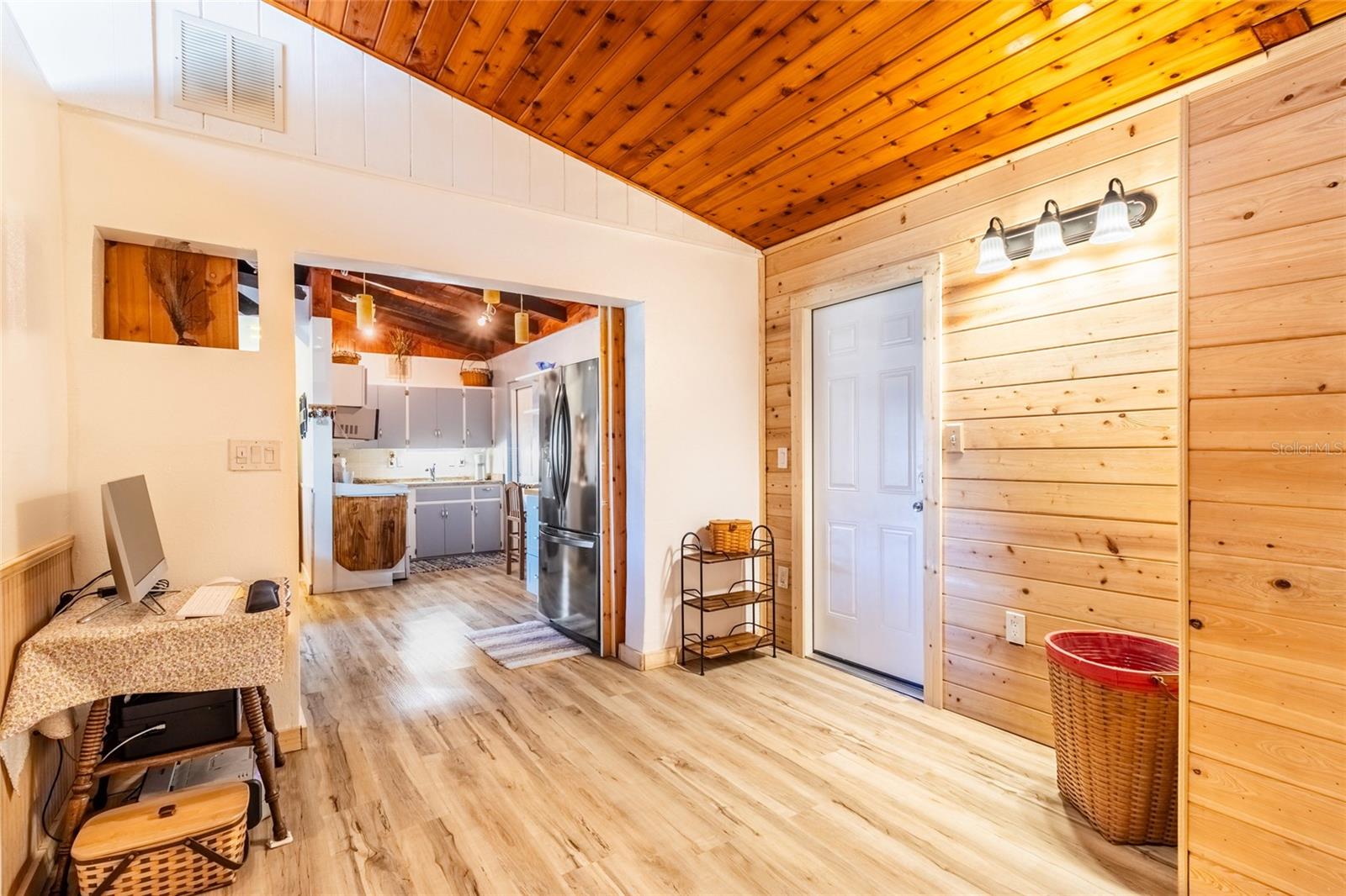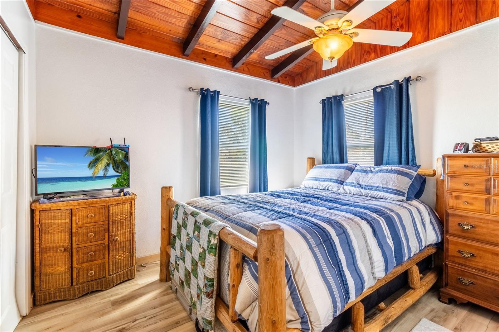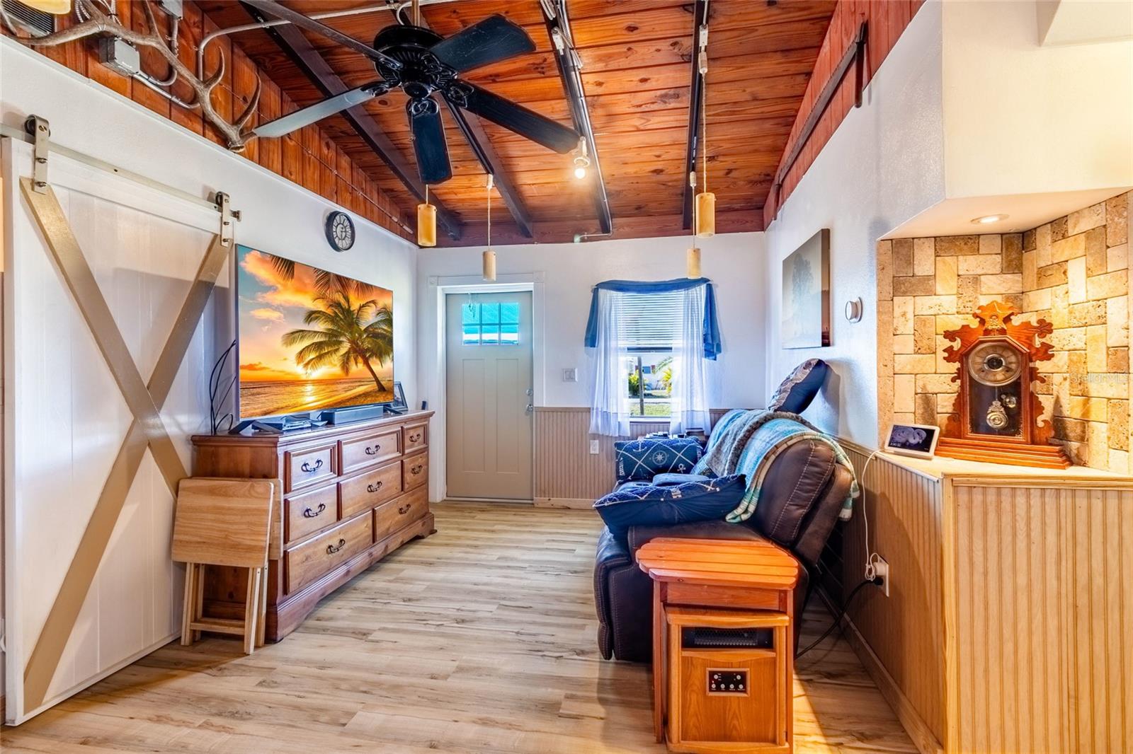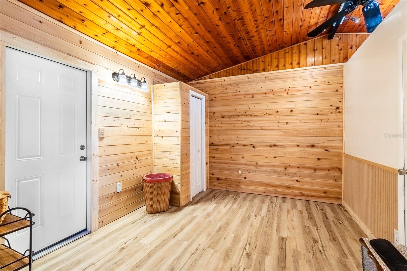 Charming 2 bedroom Cabin style Retreat with Expansive Lanai. Step into the warmth and charm of this cozy home that feels like a classic Michigan cabin. Perfectly designed for comfort and simplicity, this 2 bed, 1 bath retreat offers rustic charm paired with thoughtful modern touches. Inside, you'll find an inviting living area with a cozy cabin feel, highlighted by warm wood tones. The kitchen is functional and efficient, offering everything you need for everyday living or weekend getaways. Both bedrooms provide a peaceful retreat, while the bathroom complements the home's cozy design. The real gem of this property is the expansive screened in lanai. Perfect for entertaining or relaxing year round, this outdoor space features a hot tub where you can unwind after a long day. Additional features include a storage shed wired with 220v power-ideal for a workshop or extra storage. The property also includes a convenient RV hookup, making it an excellent choice for guests with recreational vehicles. This property is a rare find, offering the charm of a cabin in a cozy, manageable package with fantastic outdoor living, including a pool, sandbox and fire pit. Don't miss your chance to see it for yourself!