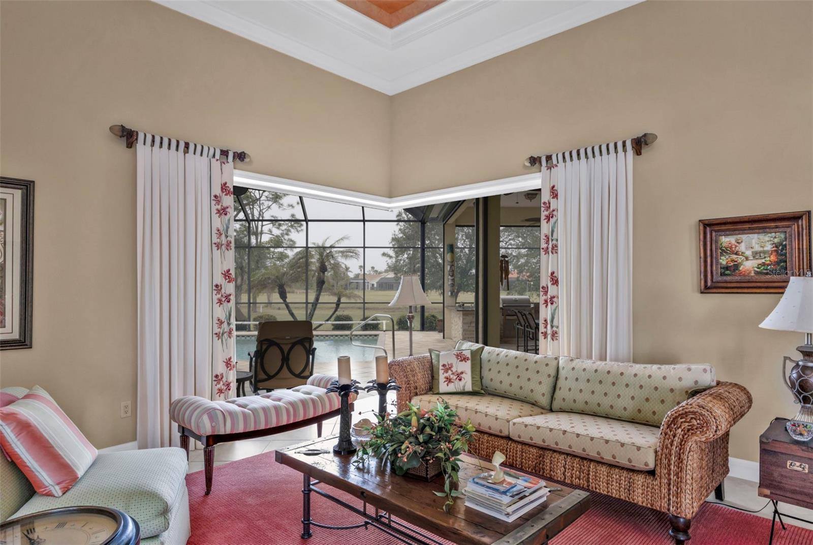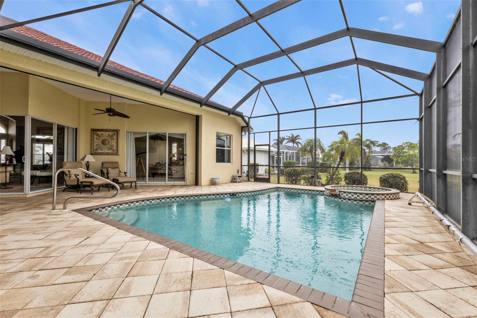 Welcome to your dream home where elegance meets practicality! Nestled in the serene community of Burnt Store Marina, this custom-built "Independent" home offers a harmonious blend of luxury and comfort. Boasting an impressive 3244 square feet of refined living space and a three-car garage, this estate caters to a lifestyle of sophisticated ease. As you step through the front door, you are greeted by a grand entryway that seamlessly leads you into a world of high-end finishes with meticulous attention to detail. With three spacious bedrooms and 2.5 lavish bathrooms, there's ample room for rest and rejuvenation. The primary bedroom serves as a retreat, complete with its very own spa-like bathroom and huge walk-in closet. The heart of the home, the kitchen, is a chef's paradise outfitted with top-tier appliances and a recycled hot water system that ensures you never have to wait for steaming water - it's in the primary bathroom also. The kitchen opens into the family room adorned with an electric fireplace, where warmth and comfort gather around crackling flames. Whether it's a casual breakfast in the dining nook or a festive dinner, this space handles it with grace. Venture outside to your private outdoor sanctuary featuring a custom and newly remodeled outdoor kitchen. Here, every weekend promises an unbeatable alfresco dining experience. The resort-style pool and spa offer a refreshing escape or the perfect spot for social gatherings. Overlooking a lush backyard with a manicured view that stretches to the golf course and a quaint creek, relaxation is just a glance away. Adding to the practicality is a plethora of amenities including a central vacuum system, crown molding that adds just the right touch of grandeur, and four lighted tray ceilings. The home office is a masterpiece with a built-in cabinetry/desk system and a coffered ceiling - this might be your favorite room! Amidst all this luxury, efficiency has not been overlooked. The newer air conditioning units along with the NEW ROOF keep the Florida heat at bay while solar tubes strategically placed through ensure your home is always bathed in natural light.