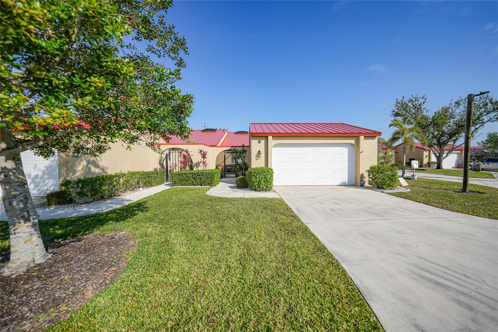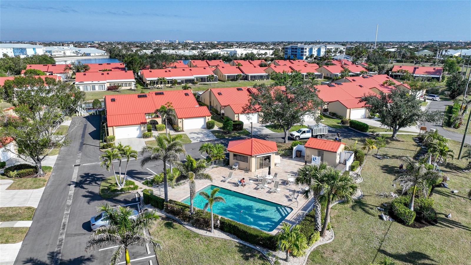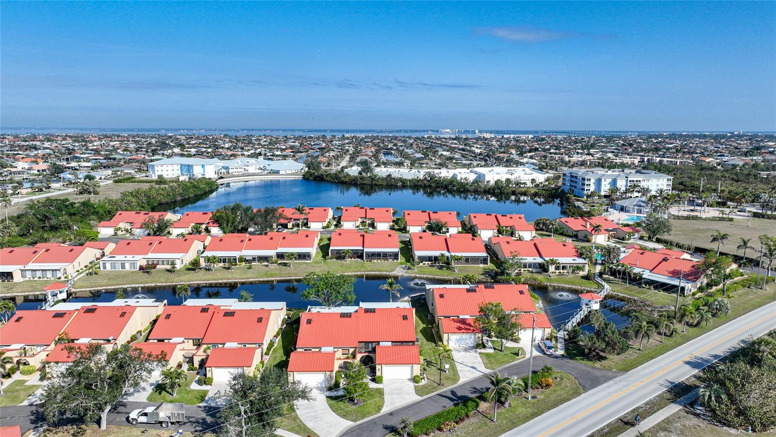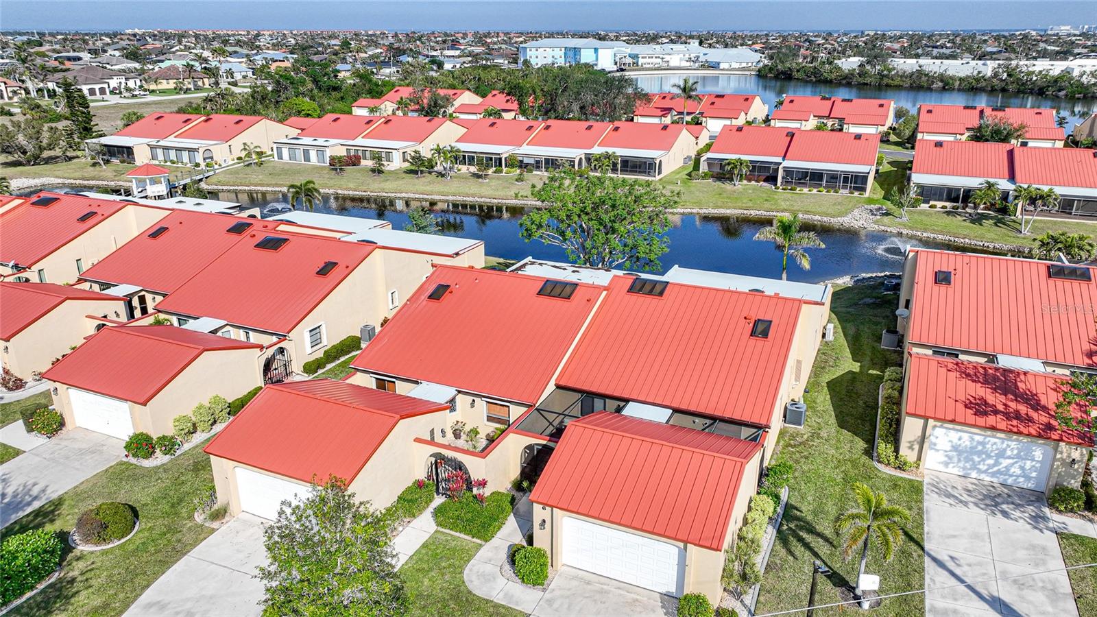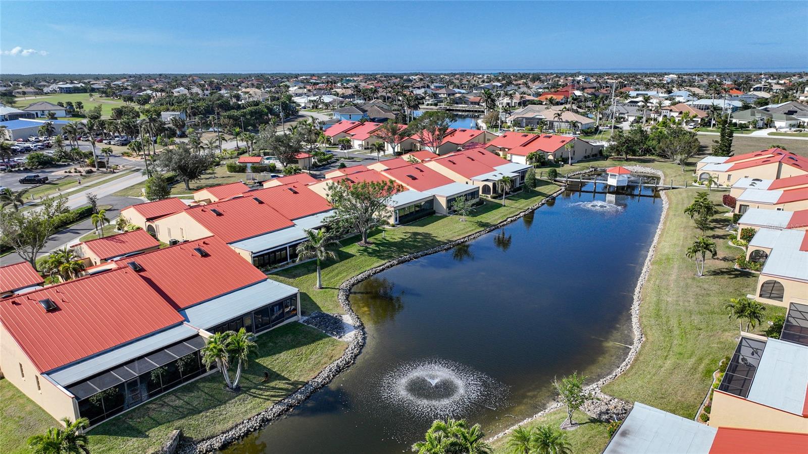 This gorgeous, updated villa with a lakefront view is move-in ready. Located in the heart of Punta Gorda Isles across from St. Andrews South Golf Course, the exterior of the villa is freshly painted. A new metal roof and new skylights were completed in December 2023. The spacious open floor plan 2 bedroom/2.5 bath villa features soaring cathedral ceilings, 4 new remote controlled ceiling fans, a built-in wet bar, updated kitchen and baths with granite countertops and porcelain tile floors throughout. An office with a custom built-in desk and cabinets with Murphy-style beds converts into a bedroom for extra guests. The fully enclosed lanai with a lakefront view boasts a mini split a/c unit for comfort and closets for additional storage. Other features include a screened-in courtyard with freshly sealed paver stones, a detached two car garage with a refinished floor and shelving. Whole home storm protection is included. Villa community amenities include a clubhouse, two heated pools, paved walkways, and beautiful mature landscaping. Don’t miss out on this villa that offers all the best of Florida living and entertaining!