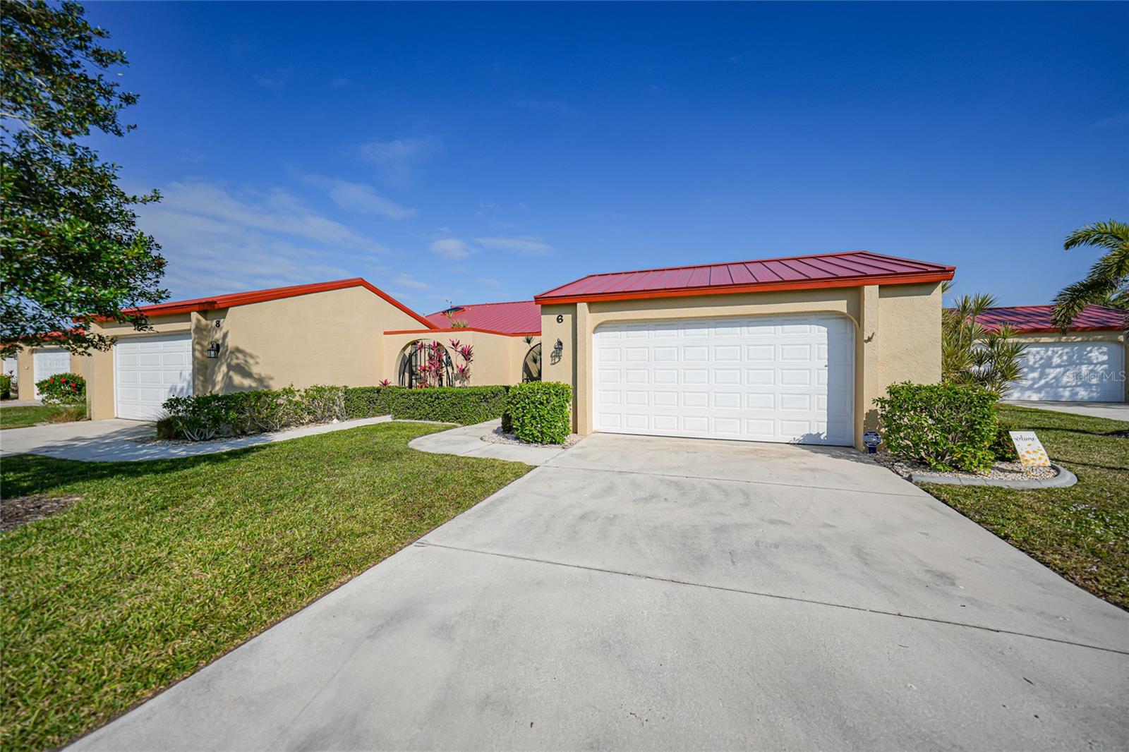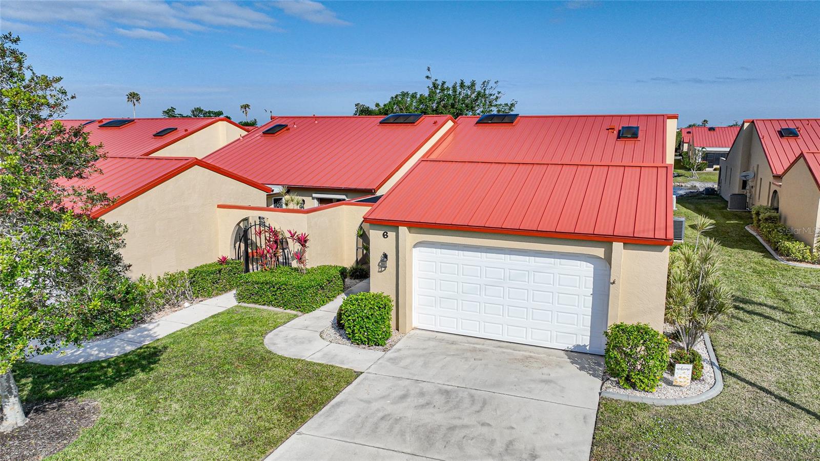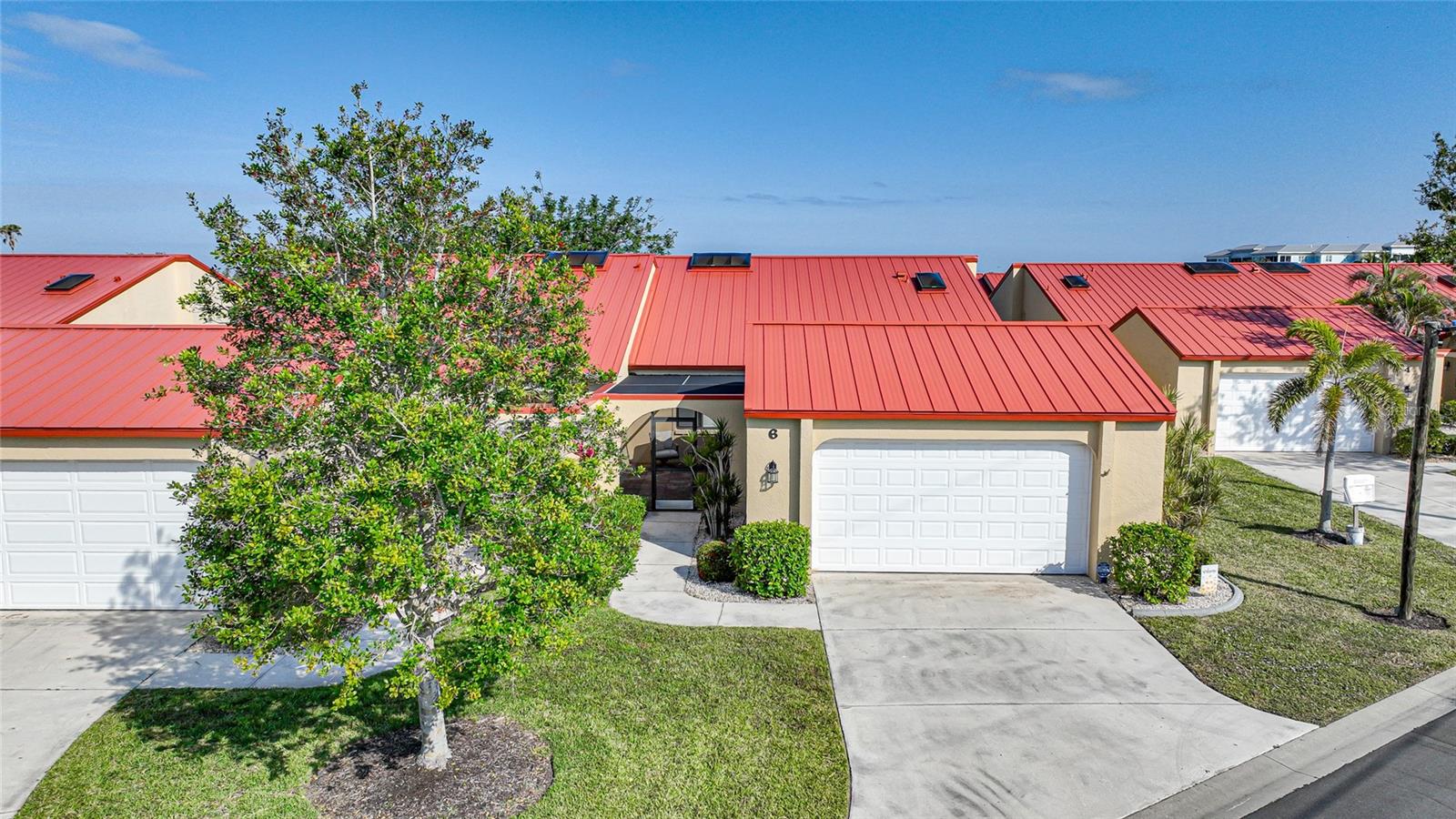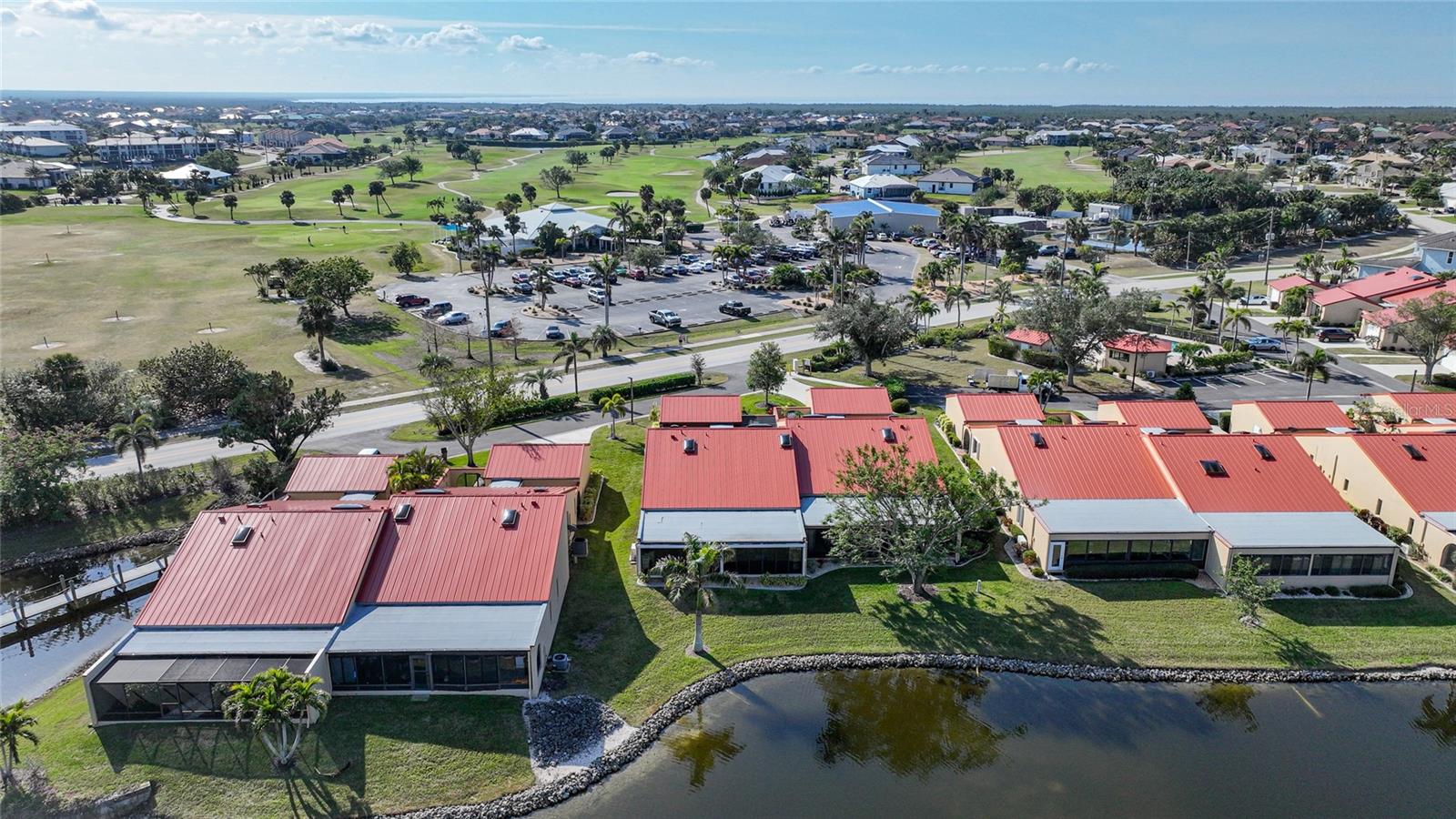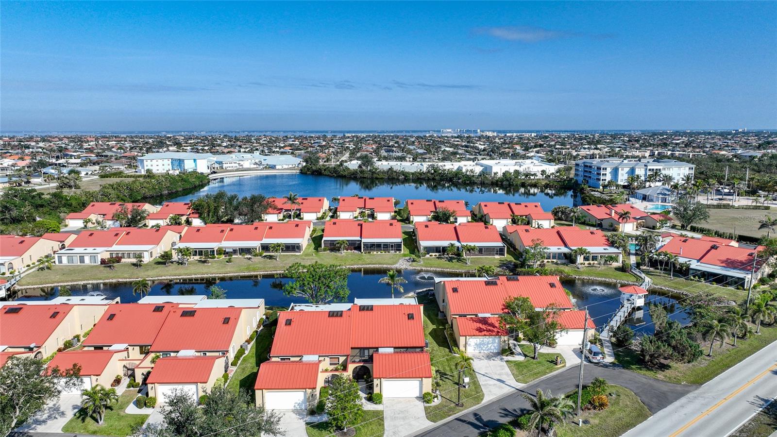 This gorgeous, updated villa with a lakefront view is move-in ready. Located in the heart of Punta Gorda Isles across from St. Andrews South Golf Course, the exterior of the villa is freshly painted. A new metal roof and new skylights were completed in December 2023. The spacious open floor plan 2 bedroom/2.5 bath villa features soaring cathedral ceilings, 4 new remote controlled ceiling fans, a built-in wet bar, updated kitchen and baths with granite countertops and porcelain tile floors throughout. An office with a custom built-in desk and cabinets with Murphy-style beds converts into a bedroom for extra guests. The fully enclosed lanai with a lakefront view boasts a mini split a/c unit for comfort and closets for additional storage. Other features include a screened-in courtyard with freshly sealed paver stones, a detached two car garage with a refinished floor and shelving. Whole home storm protection is included. Villa community amenities include a clubhouse, two heated pools, paved walkways, and beautiful mature landscaping. Don’t miss out on this villa that offers all the best of Florida living and entertaining!