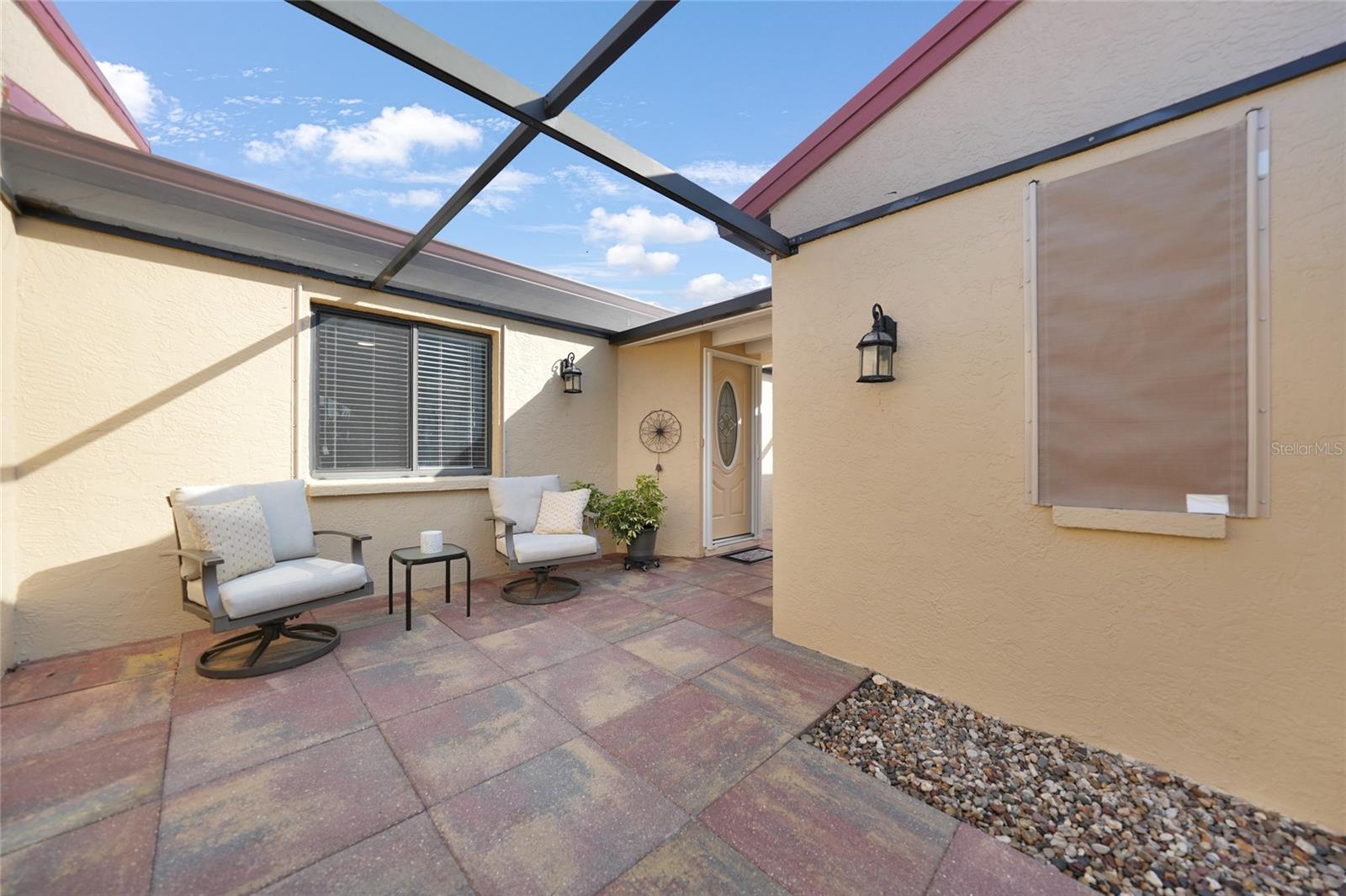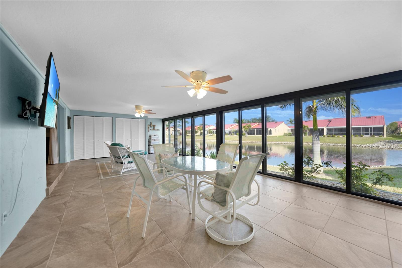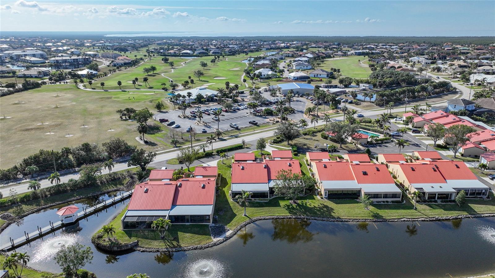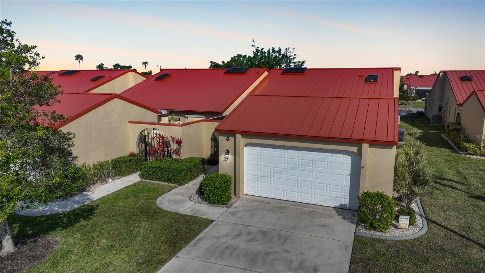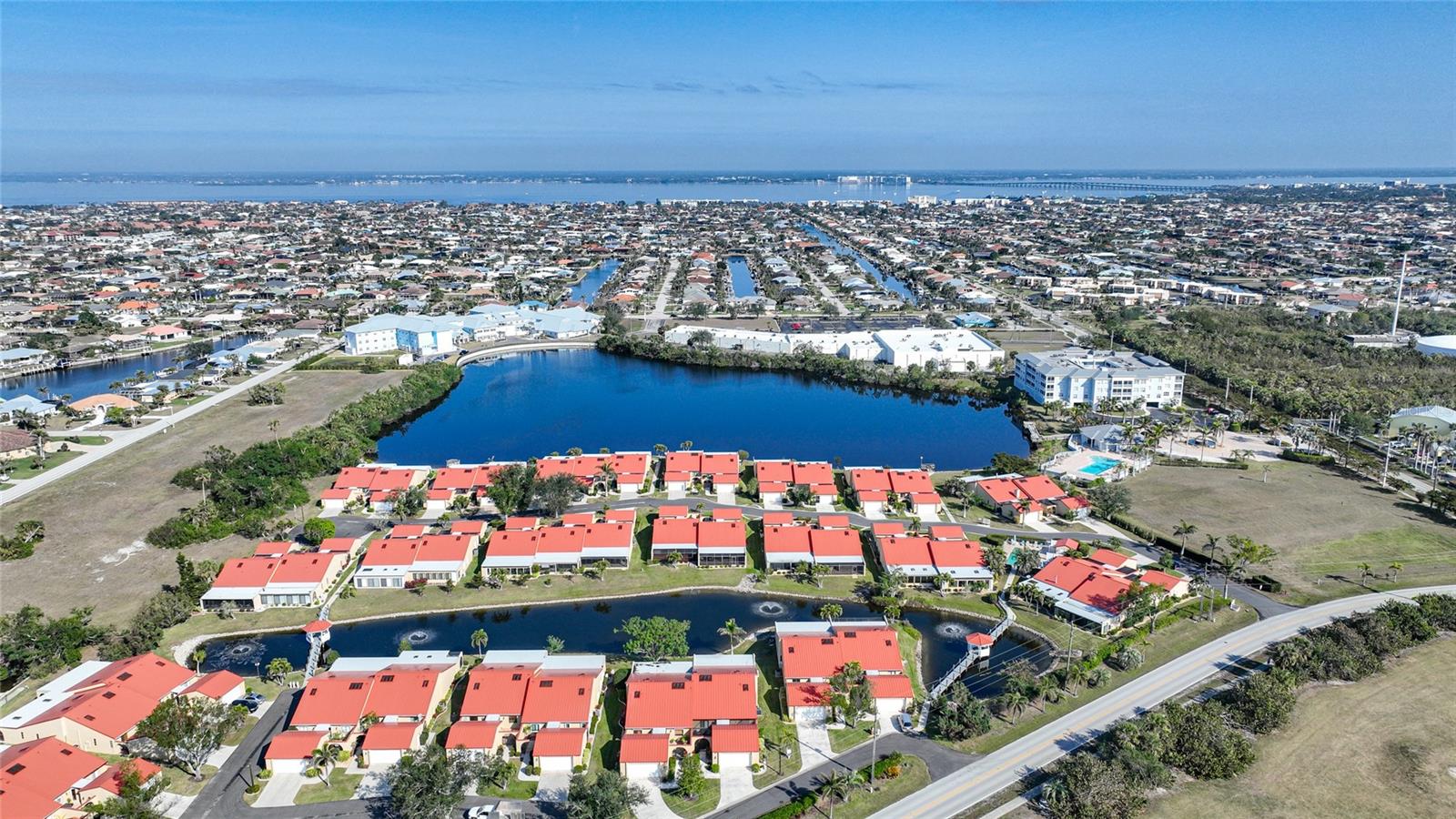 This gorgeous, updated villa with a lakefront view is move-in ready. Located in the heart of Punta Gorda Isles across from St. Andrews South Golf Course, the exterior of the villa is freshly painted. A new metal roof and new skylights were completed in December 2023. The spacious open floor plan 2 bedroom/2.5 bath villa features soaring cathedral ceilings, 4 new remote controlled ceiling fans, a built-in wet bar, updated kitchen and baths with granite countertops and porcelain tile floors throughout. An office with a custom built-in desk and cabinets with Murphy-style beds converts into a bedroom for extra guests. The fully enclosed lanai with a lakefront view boasts a mini split a/c unit for comfort and closets for additional storage. Other features include a screened-in courtyard with freshly sealed paver stones, a detached two car garage with a refinished floor and shelving. Whole home storm protection is included. Villa community amenities include a clubhouse, two heated pools, paved walkways, and beautiful mature landscaping. Don’t miss out on this villa that offers all the best of Florida living and entertaining!