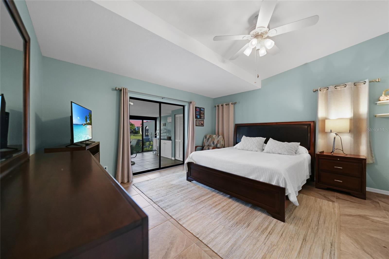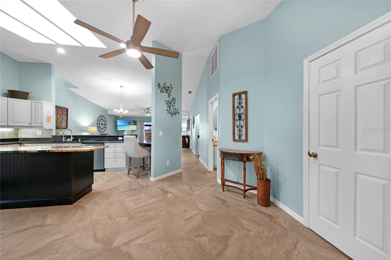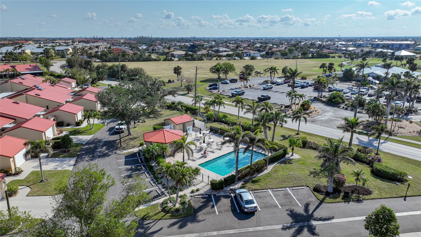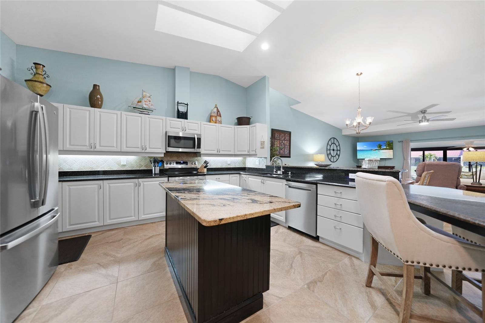 This gorgeous, updated villa with a lakefront view is move-in ready. Located in the heart of Punta Gorda Isles across from St. Andrews South Golf Course, the exterior of the villa is freshly painted. A new metal roof and new skylights were completed in December 2023. The spacious open floor plan 2 bedroom/2.5 bath villa features soaring cathedral ceilings, 4 new remote controlled ceiling fans, a built-in wet bar, updated kitchen and baths with granite countertops and porcelain tile floors throughout. An office with a custom built-in desk and cabinets with Murphy-style beds converts into a bedroom for extra guests. The fully enclosed lanai with a lakefront view boasts a mini split a/c unit for comfort and closets for additional storage. Other features include a screened-in courtyard with freshly sealed paver stones, a detached two car garage with a refinished floor and shelving. Whole home storm protection is included. Villa community amenities include a clubhouse, two heated pools, paved walkways, and beautiful mature landscaping. Don’t miss out on this villa that offers all the best of Florida living and entertaining!