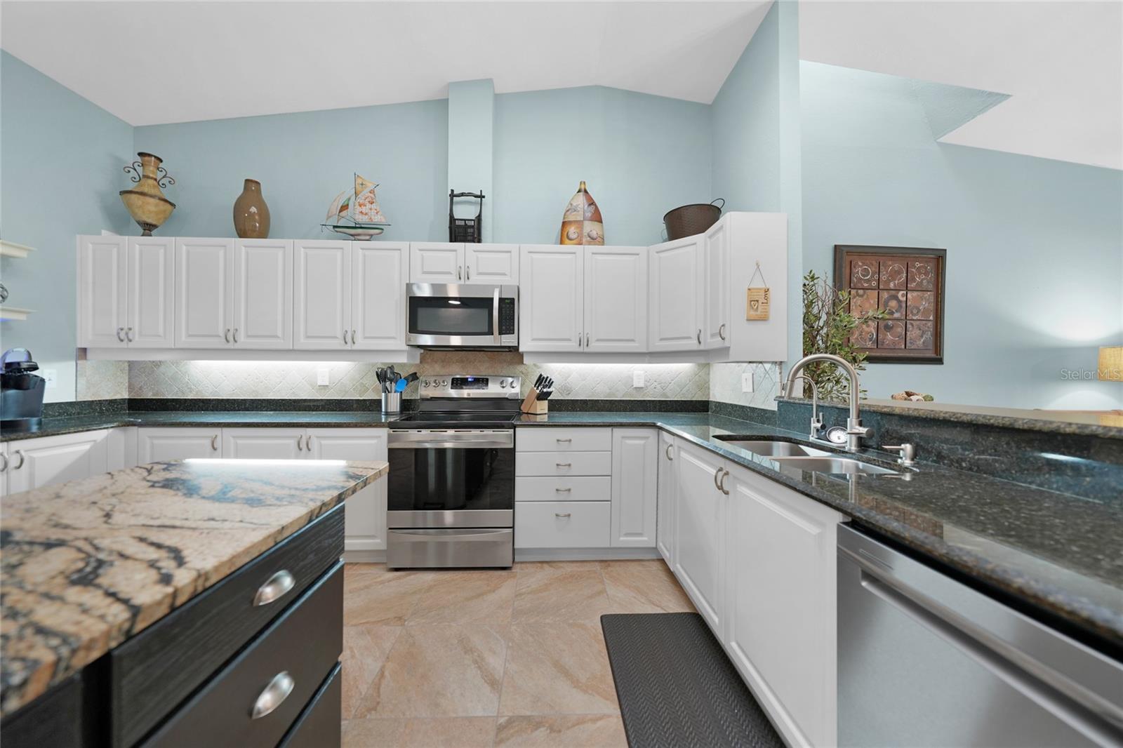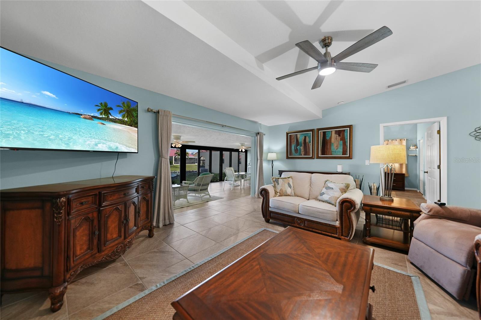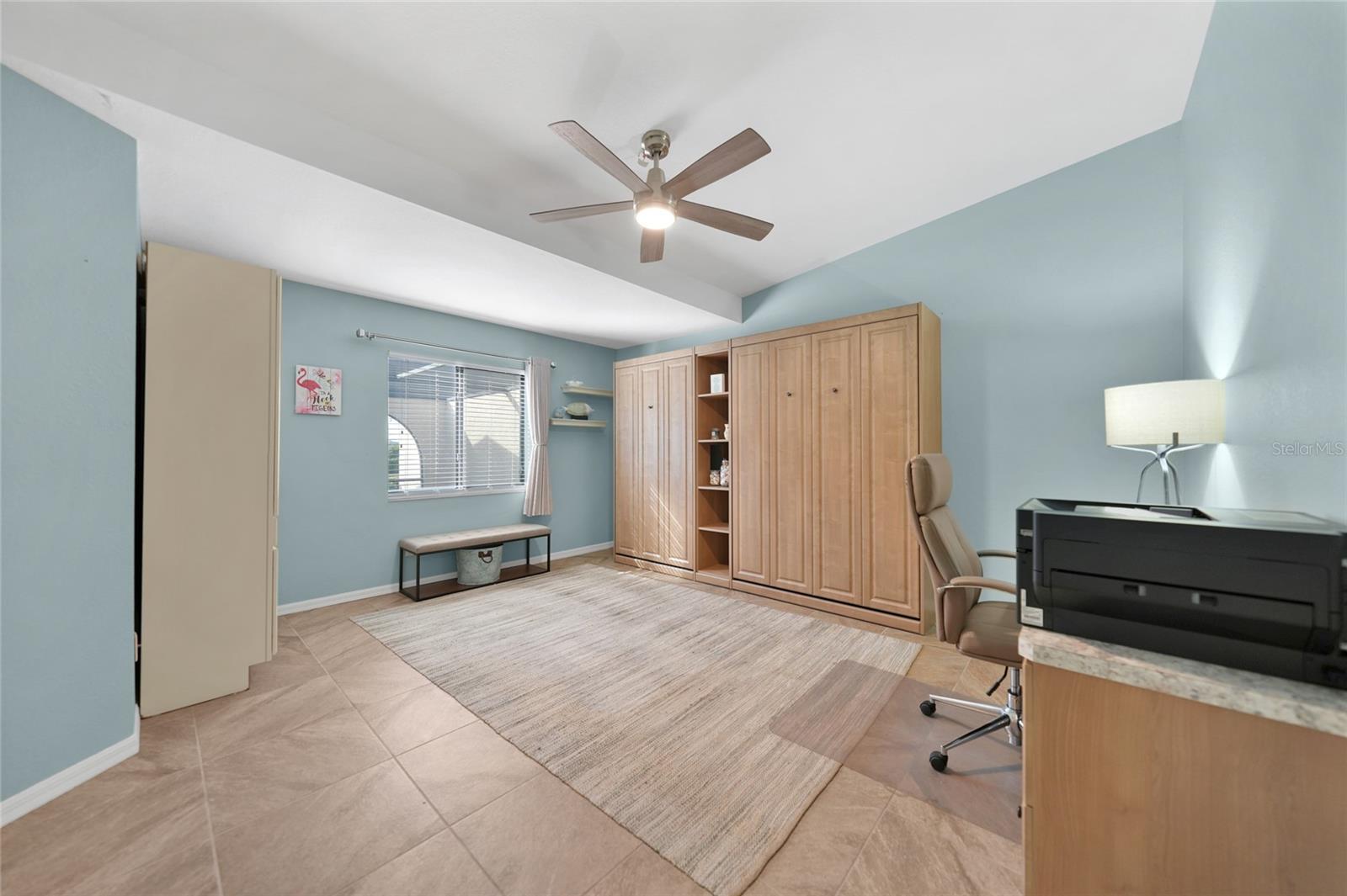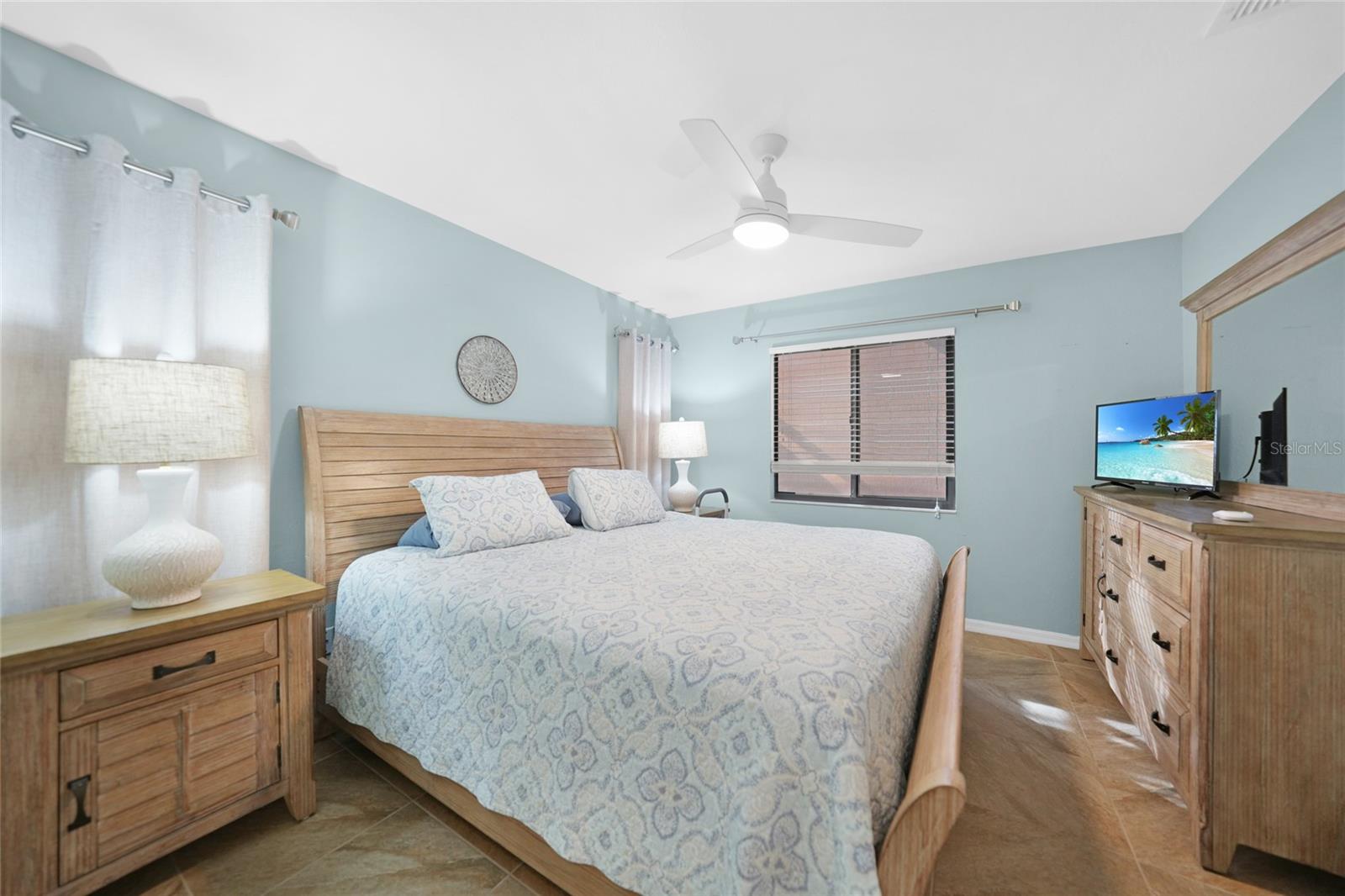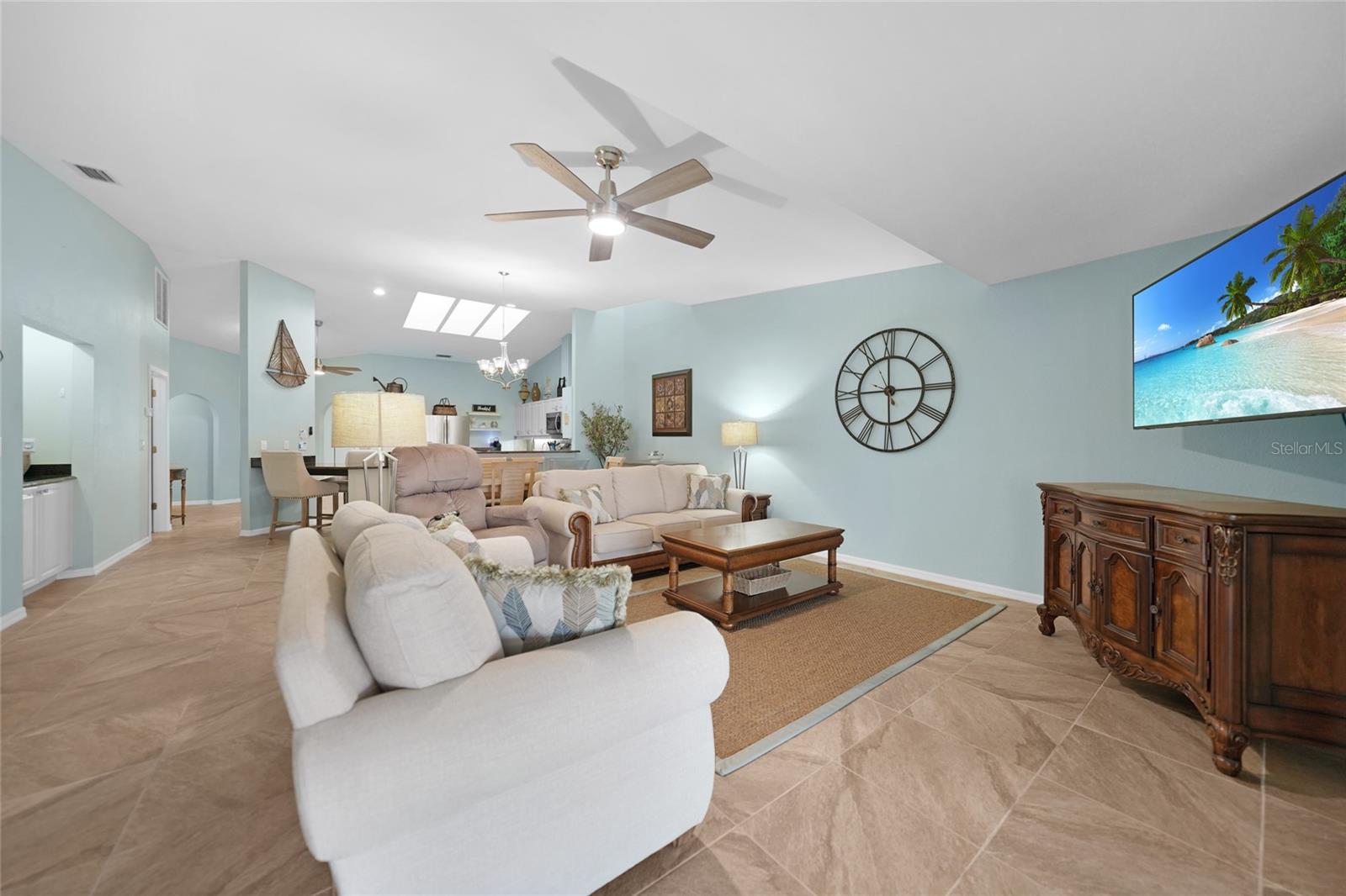 This gorgeous, updated villa with a lakefront view is move-in ready. Located in the heart of Punta Gorda Isles across from St. Andrews South Golf Course, the exterior of the villa is freshly painted. A new metal roof and new skylights were completed in December 2023. The spacious open floor plan 2 bedroom/2.5 bath villa features soaring cathedral ceilings, 4 new remote controlled ceiling fans, a built-in wet bar, updated kitchen and baths with granite countertops and porcelain tile floors throughout. An office with a custom built-in desk and cabinets with Murphy-style beds converts into a bedroom for extra guests. The fully enclosed lanai with a lakefront view boasts a mini split a/c unit for comfort and closets for additional storage. Other features include a screened-in courtyard with freshly sealed paver stones, a detached two car garage with a refinished floor and shelving. Whole home storm protection is included. Villa community amenities include a clubhouse, two heated pools, paved walkways, and beautiful mature landscaping. Don’t miss out on this villa that offers all the best of Florida living and entertaining!