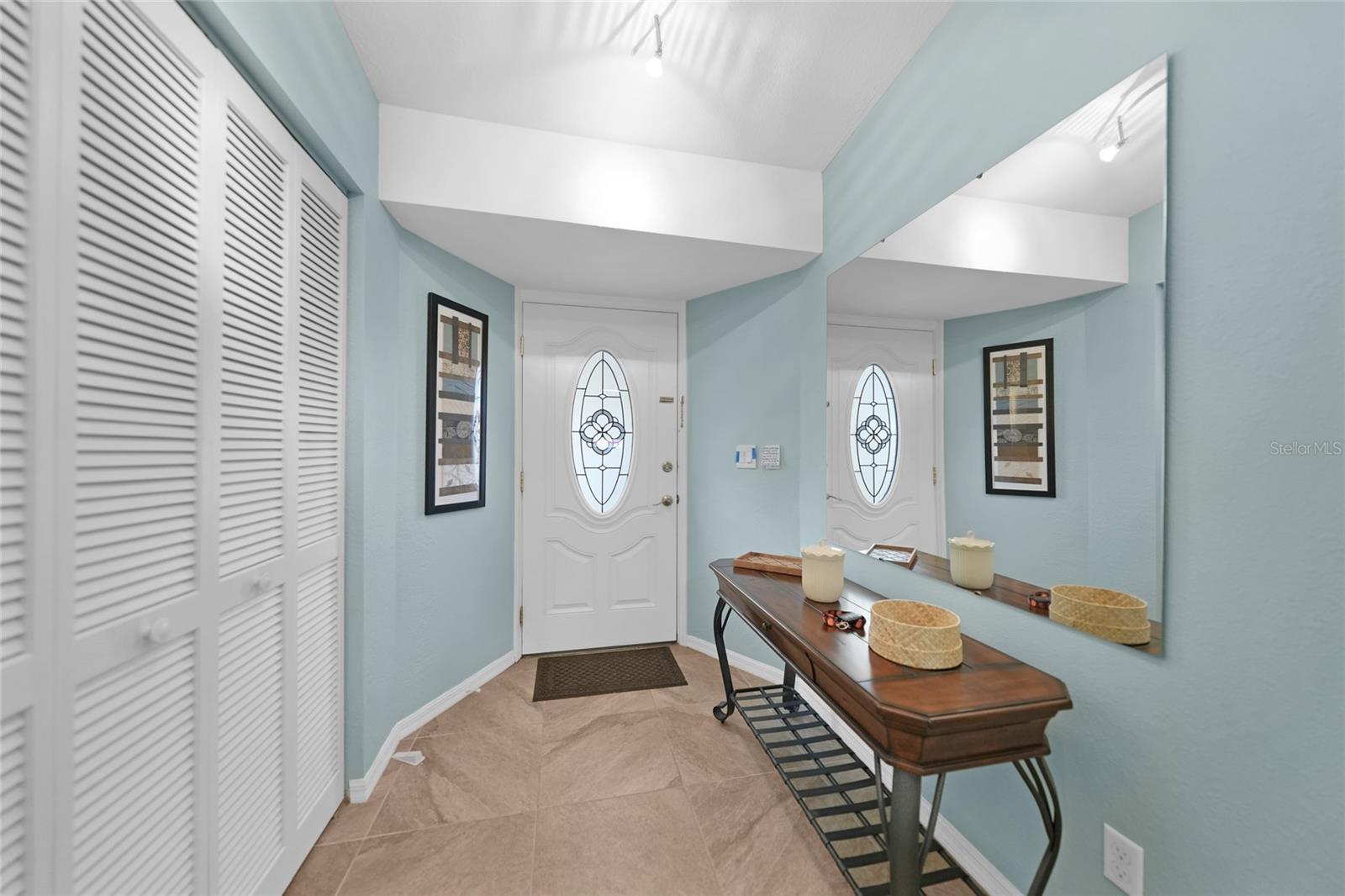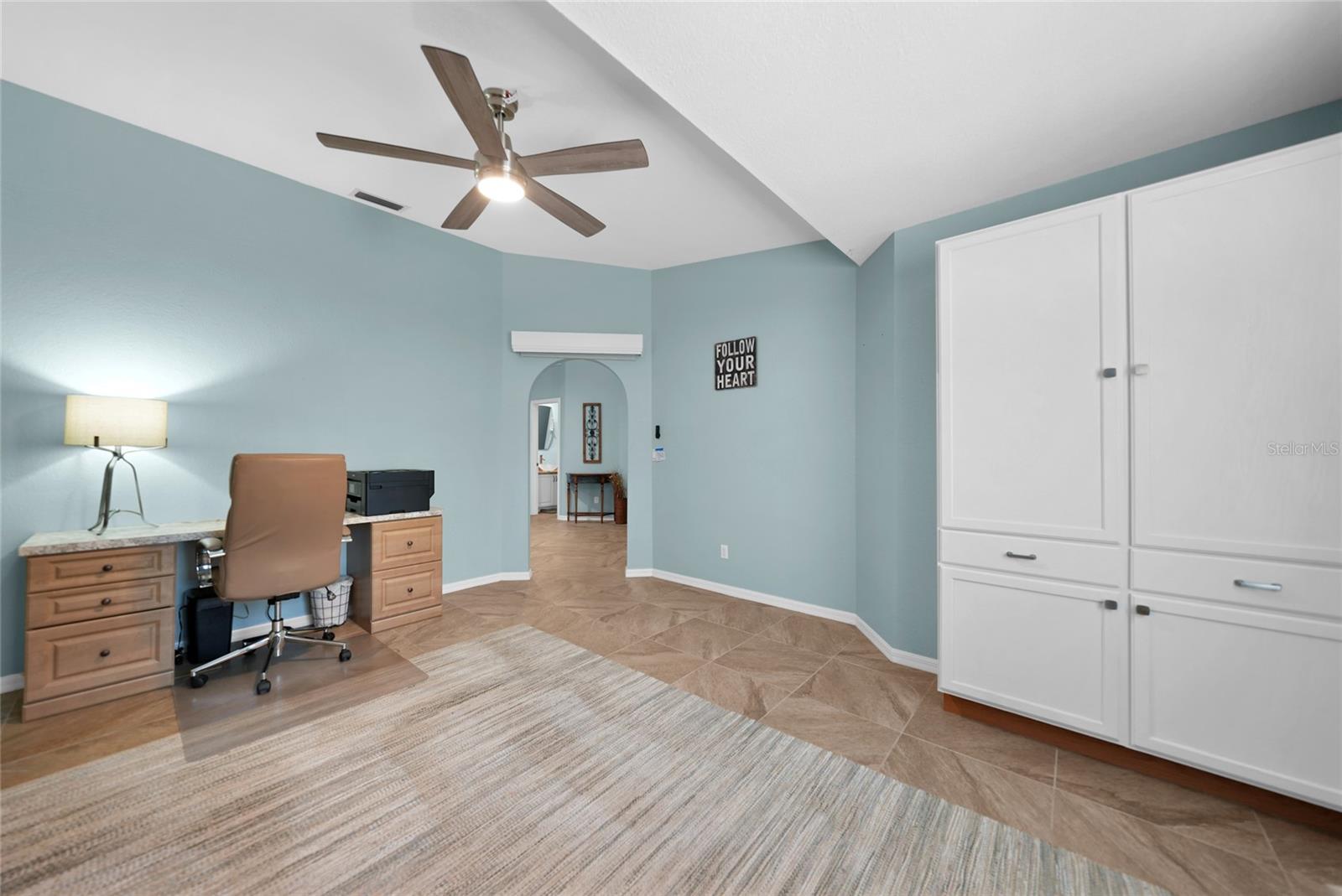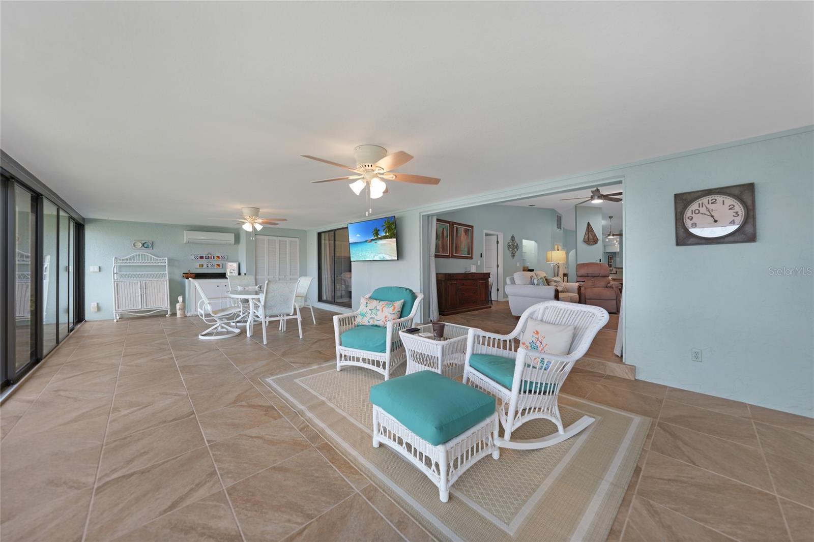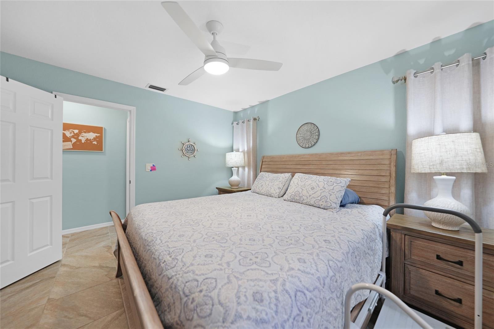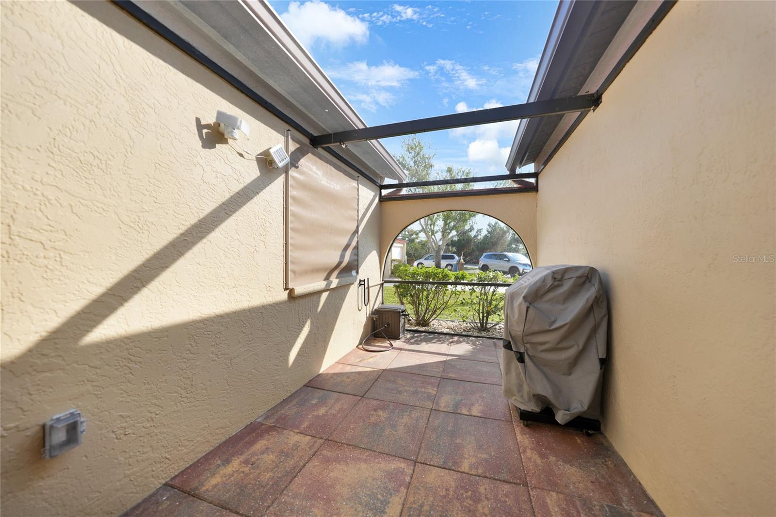 This gorgeous, updated villa with a lakefront view is move-in ready. Located in the heart of Punta Gorda Isles across from St. Andrews South Golf Course, the exterior of the villa is freshly painted. A new metal roof and new skylights were completed in December 2023. The spacious open floor plan 2 bedroom/2.5 bath villa features soaring cathedral ceilings, 4 new remote controlled ceiling fans, a built-in wet bar, updated kitchen and baths with granite countertops and porcelain tile floors throughout. An office with a custom built-in desk and cabinets with Murphy-style beds converts into a bedroom for extra guests. The fully enclosed lanai with a lakefront view boasts a mini split a/c unit for comfort and closets for additional storage. Other features include a screened-in courtyard with freshly sealed paver stones, a detached two car garage with a refinished floor and shelving. Whole home storm protection is included. Villa community amenities include a clubhouse, two heated pools, paved walkways, and beautiful mature landscaping. Don’t miss out on this villa that offers all the best of Florida living and entertaining!