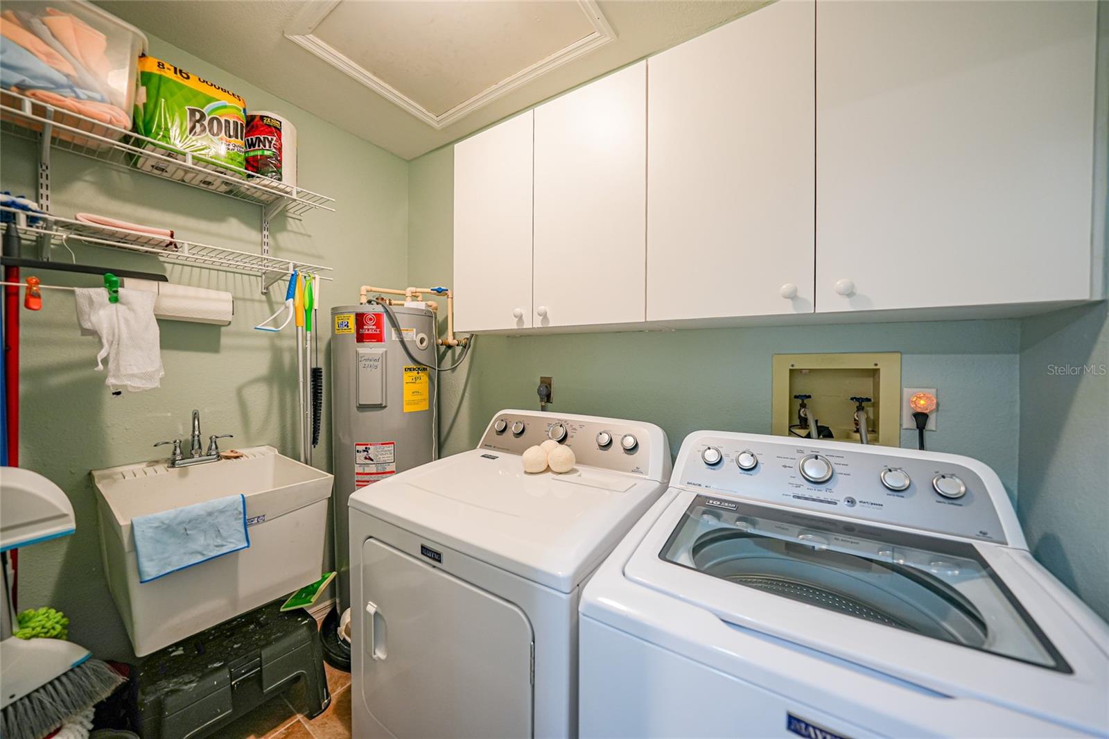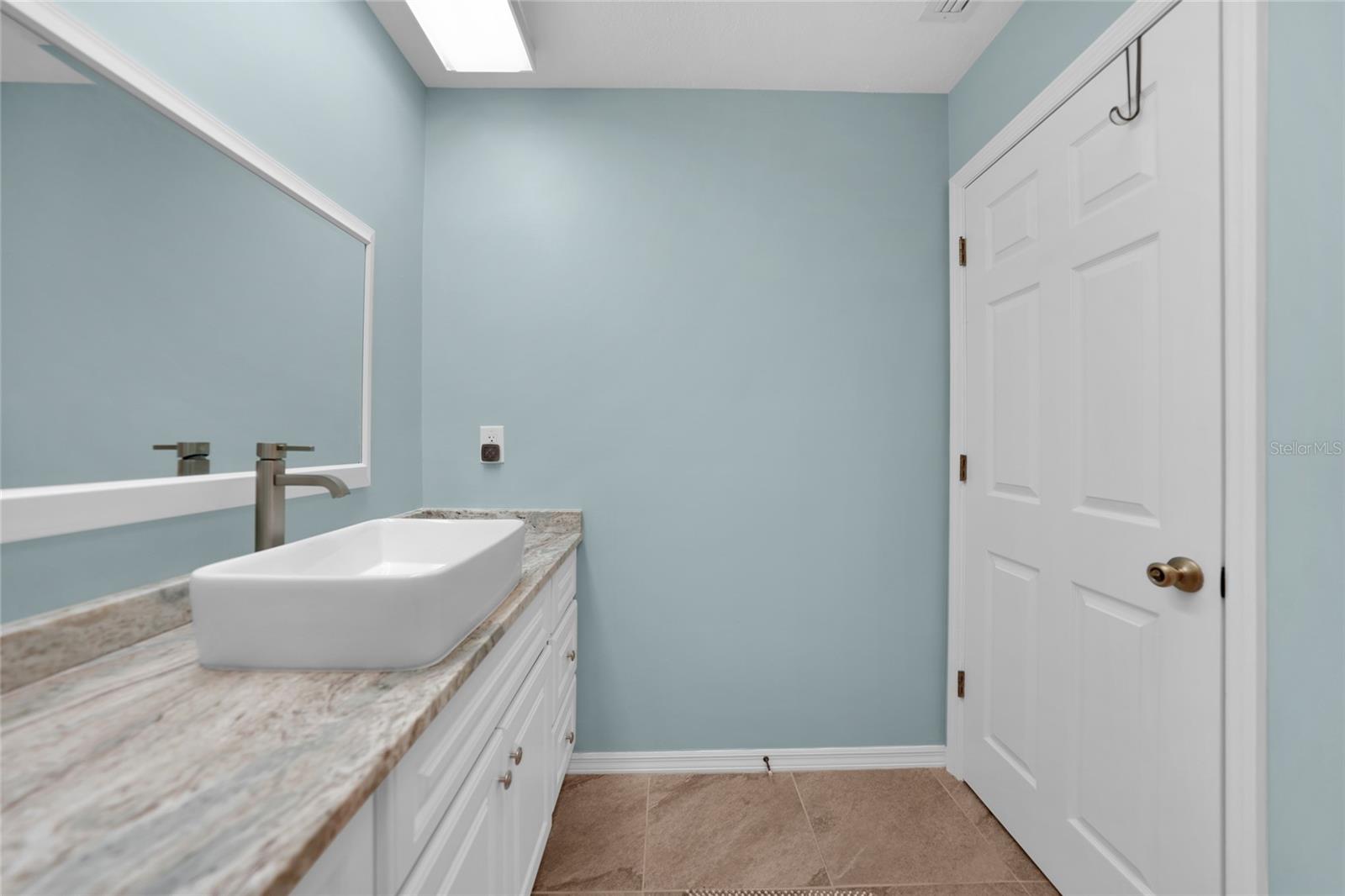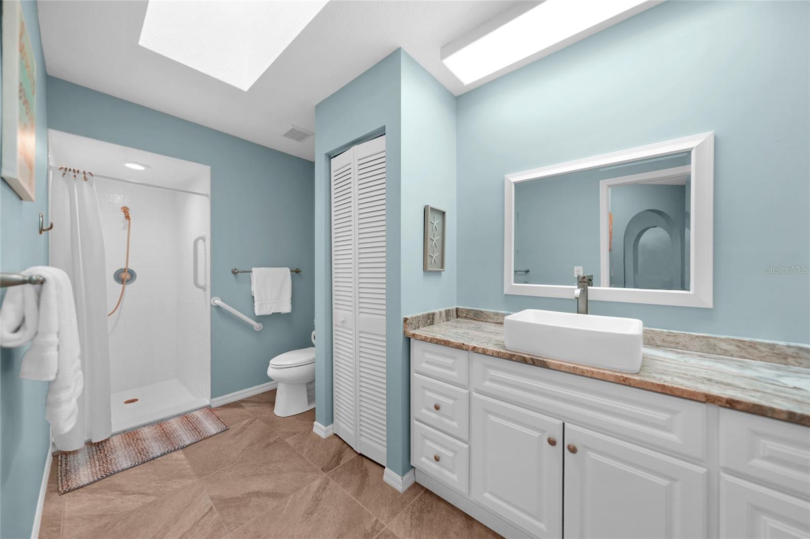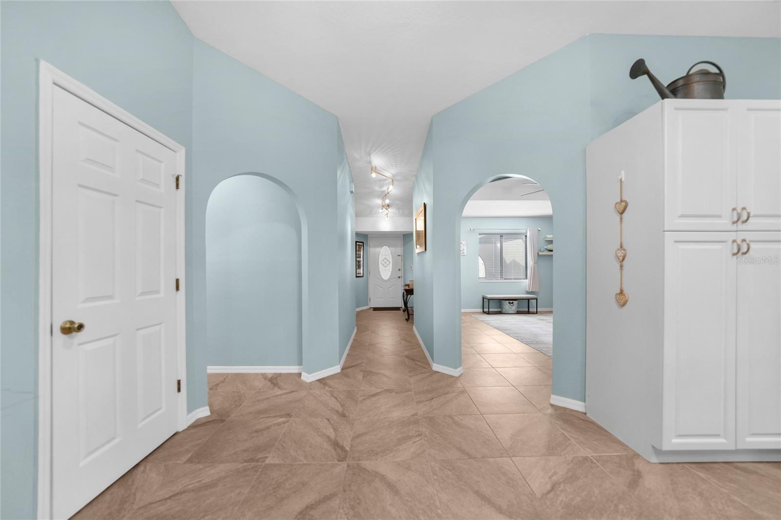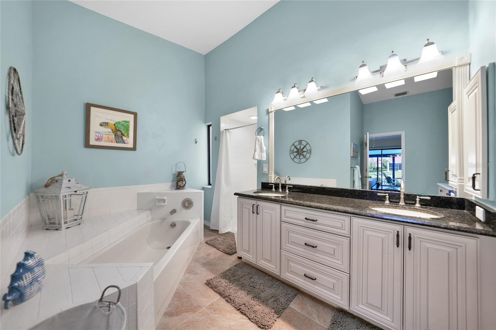 This gorgeous, updated villa with a lakefront view is move-in ready. Located in the heart of Punta Gorda Isles across from St. Andrews South Golf Course, the exterior of the villa is freshly painted. A new metal roof and new skylights were completed in December 2023. The spacious open floor plan 2 bedroom/2.5 bath villa features soaring cathedral ceilings, 4 new remote controlled ceiling fans, a built-in wet bar, updated kitchen and baths with granite countertops and porcelain tile floors throughout. An office with a custom built-in desk and cabinets with Murphy-style beds converts into a bedroom for extra guests. The fully enclosed lanai with a lakefront view boasts a mini split a/c unit for comfort and closets for additional storage. Other features include a screened-in courtyard with freshly sealed paver stones, a detached two car garage with a refinished floor and shelving. Whole home storm protection is included. Villa community amenities include a clubhouse, two heated pools, paved walkways, and beautiful mature landscaping. Don’t miss out on this villa that offers all the best of Florida living and entertaining!