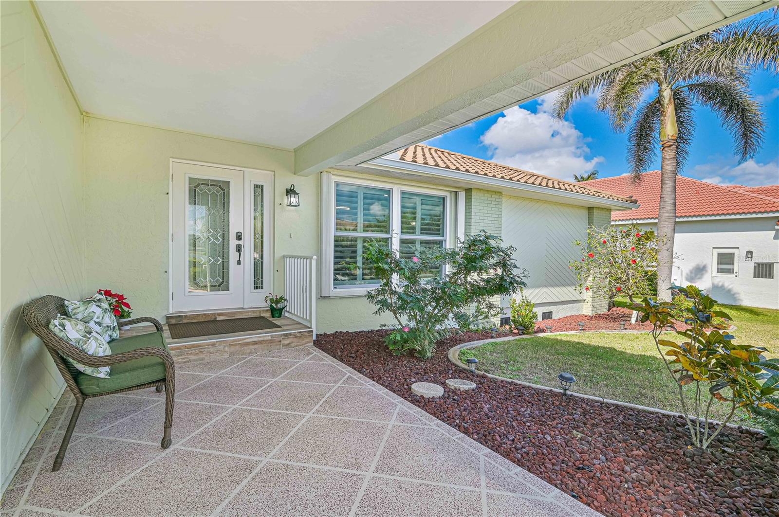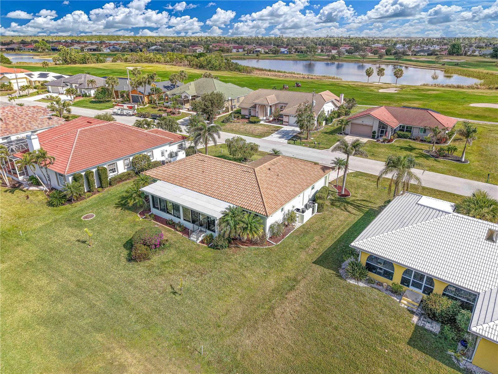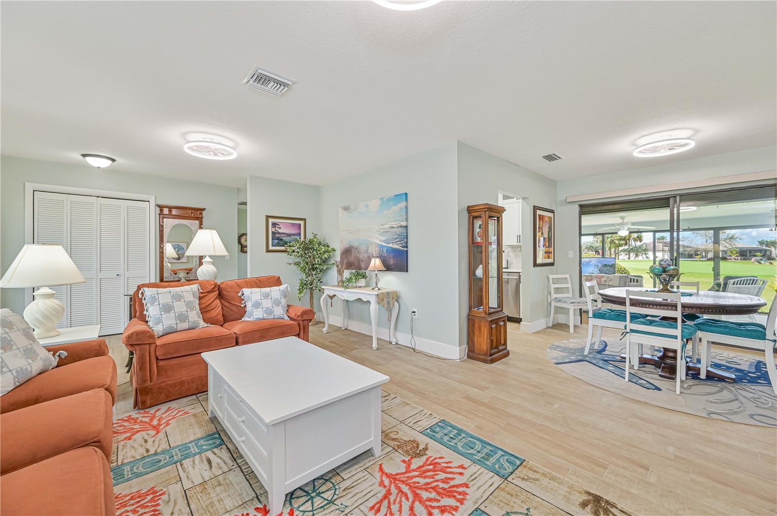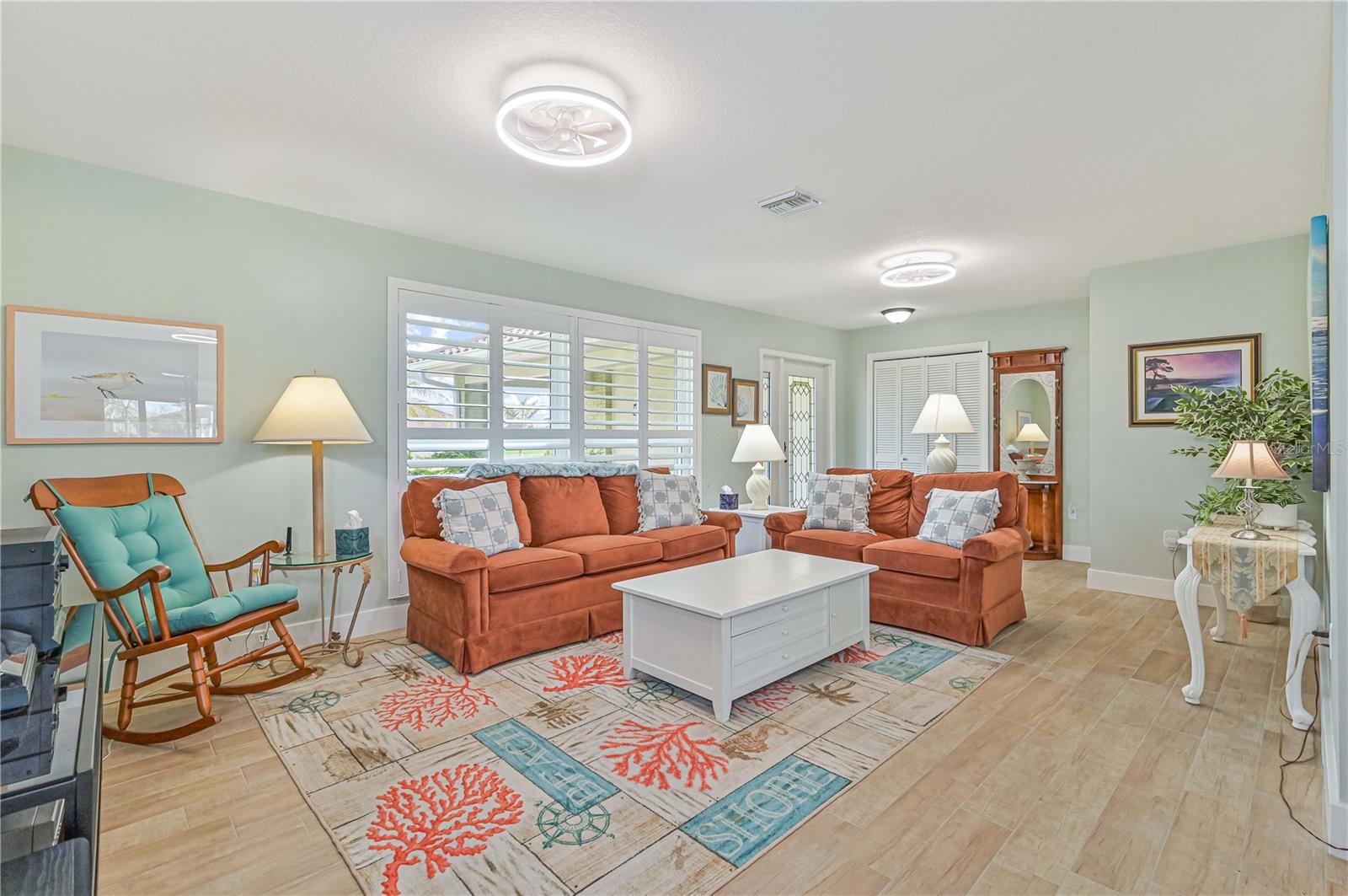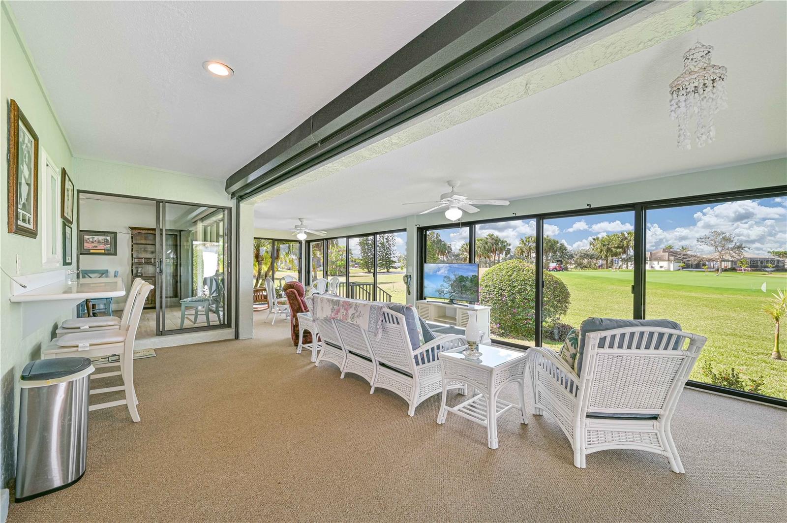 This home has been completely updated and is move-in ready! The entire house features stunning new tile flooring. The remodeled kitchen includes solid wood cabinets, a stylish tiled backsplash, a pass-through window to a counter bar on the lanai, an exhaust fan, glass in the upper cabinets, stainless steel appliances, and a brand-new sink and faucet. Off the kitchen, you’ll find a brand new butlers pantry with a wet bar. The family room, currently used as a formal dining room, has sliders leading to the lanai. The dining area/breakfast nook also offers sliders to the lanai, perfect for outdoor living. The home’s inviting entryway features an 18x9 covered porch that leads to a brand-new front door and opens into a spacious living room. The oversized main bedroom includes a ceiling fan and a slider to the lanai. The remodeled ensuite bathroom boasts a large shower, a double sink solid wood vanity with a Quartz Countertop and soft close cabinetry and a generous 10x6 walk-in closet. The guest bathroom has also been beautifully remodeled with a tiled shower/tub combo, solid wood vanity with a Quartz Countertop and soft close cabinetry. The second bedroom includes a double closet for extra storage. Interior highlights include new solid core plantation shutters, shiplap siding, new ceiling fans, solid surface countertops in the kitchen and bathrooms, and fresh paint with new baseboards throughout. Additional updates include new interior and exterior light fixtures, new gutters, fresh exterior paint, A/C (2022), new hurricane impact windows (2023), new irrigation, a new hot water heater, and a new hurricane rated front door. The enclosed lanai, approximately 480 sq ft, offers ceiling fans and sliders all around, creating the perfect space for dining or relaxation while enjoying views of the golf course and park-like surroundings. The spacious 22x19 garage features an opener, 2 ceiling fans, cabinets, a service door, a pull-down ladder to the attic, and a new storm-rated garage door. The home also includes a wind mitigation report showing new hurricane impact windows (2023), hurricane shutters, a new Storm Smart roll-down storm catcher, and a brand-new metal roof (2023) for added protection. Walk to nearby restaurants and shopping, and enjoy a short drive to downtown and I-75. This home truly has it all!