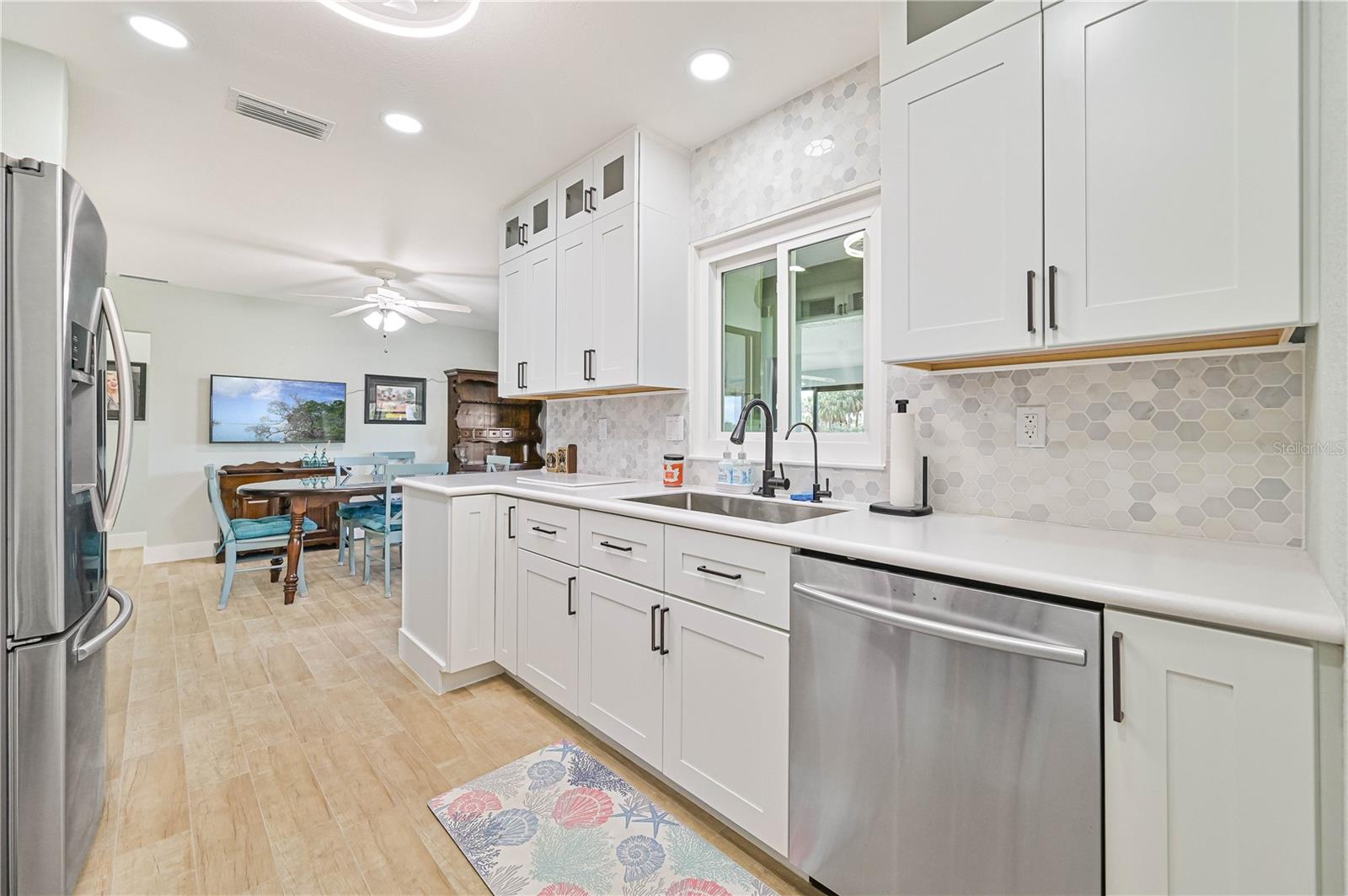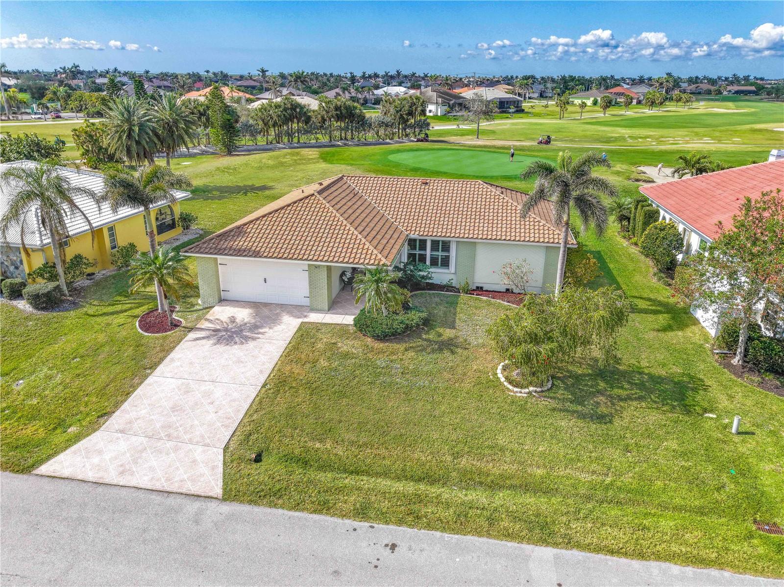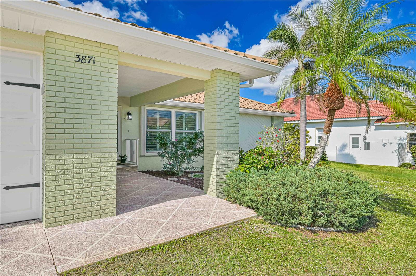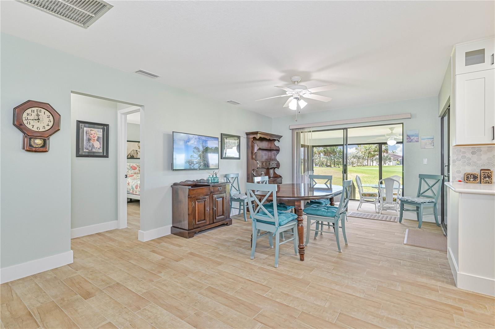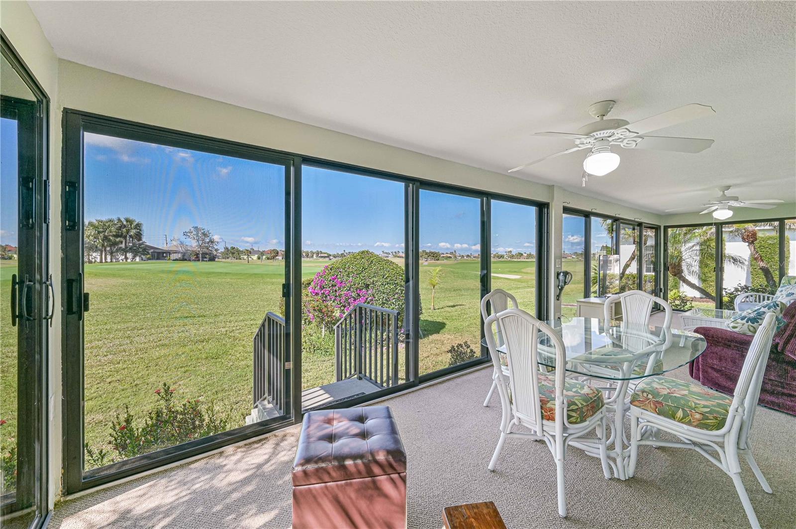 This home has been completely updated and is move-in ready! The entire house features stunning new tile flooring. The remodeled kitchen includes solid wood cabinets, a stylish tiled backsplash, a pass-through window to a counter bar on the lanai, an exhaust fan, glass in the upper cabinets, stainless steel appliances, and a brand-new sink and faucet. Off the kitchen, you’ll find a brand new butlers pantry with a wet bar. The family room, currently used as a formal dining room, has sliders leading to the lanai. The dining area/breakfast nook also offers sliders to the lanai, perfect for outdoor living. The home’s inviting entryway features an 18x9 covered porch that leads to a brand-new front door and opens into a spacious living room. The oversized main bedroom includes a ceiling fan and a slider to the lanai. The remodeled ensuite bathroom boasts a large shower, a double sink solid wood vanity with a Quartz Countertop and soft close cabinetry and a generous 10x6 walk-in closet. The guest bathroom has also been beautifully remodeled with a tiled shower/tub combo, solid wood vanity with a Quartz Countertop and soft close cabinetry. The second bedroom includes a double closet for extra storage. Interior highlights include new solid core plantation shutters, shiplap siding, new ceiling fans, solid surface countertops in the kitchen and bathrooms, and fresh paint with new baseboards throughout. Additional updates include new interior and exterior light fixtures, new gutters, fresh exterior paint, A/C (2022), new hurricane impact windows (2023), new irrigation, a new hot water heater, and a new hurricane rated front door. The enclosed lanai, approximately 480 sq ft, offers ceiling fans and sliders all around, creating the perfect space for dining or relaxation while enjoying views of the golf course and park-like surroundings. The spacious 22x19 garage features an opener, 2 ceiling fans, cabinets, a service door, a pull-down ladder to the attic, and a new storm-rated garage door. The home also includes a wind mitigation report showing new hurricane impact windows (2023), hurricane shutters, a new Storm Smart roll-down storm catcher, and a brand-new metal roof (2023) for added protection. Walk to nearby restaurants and shopping, and enjoy a short drive to downtown and I-75. This home truly has it all!