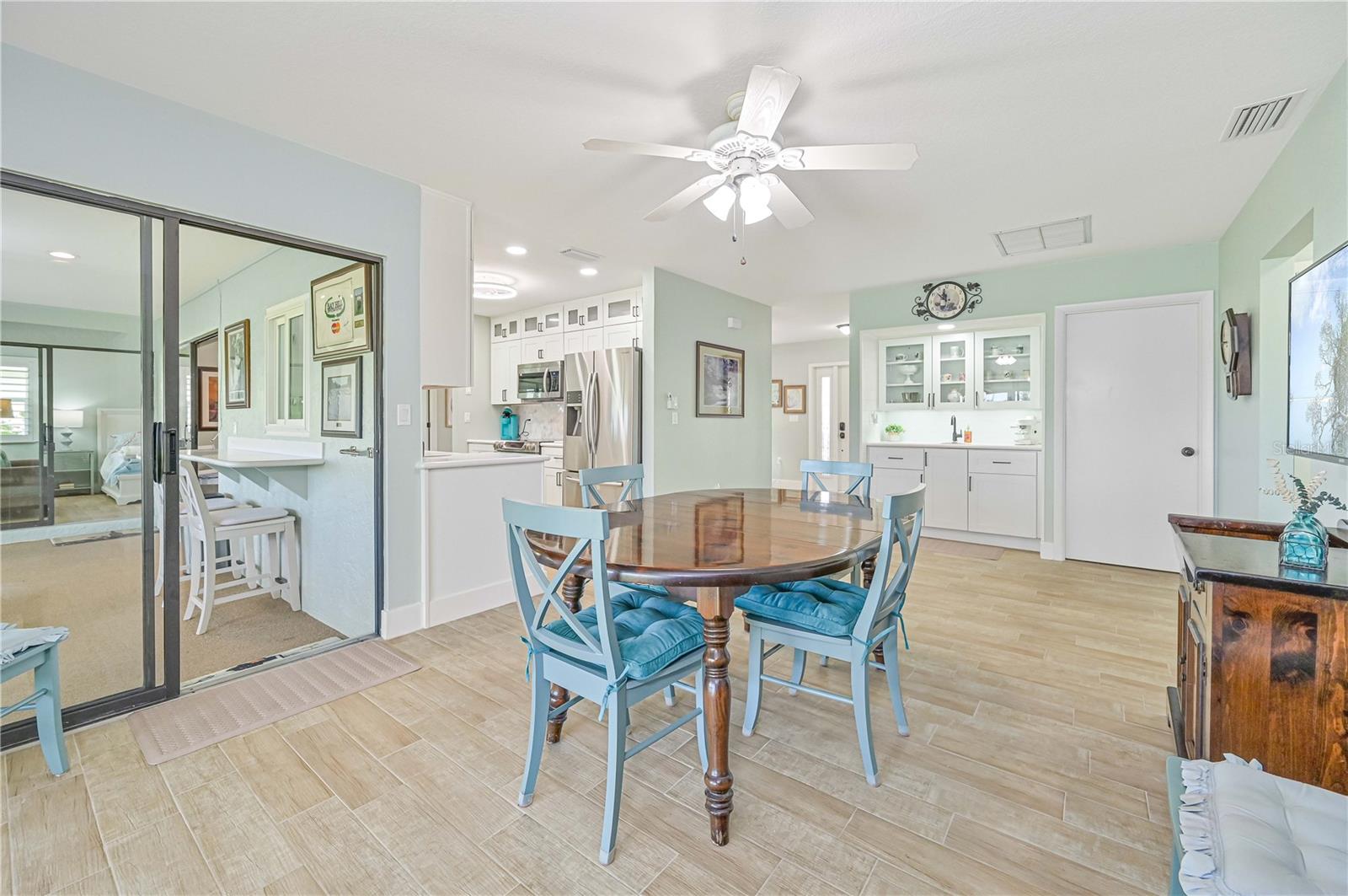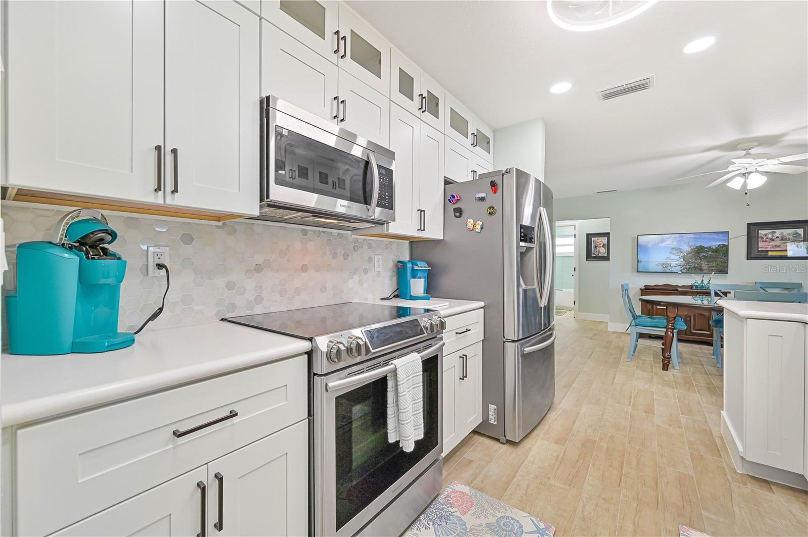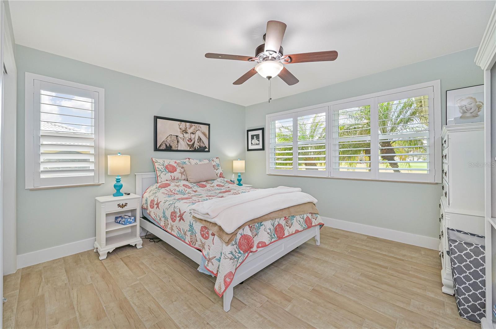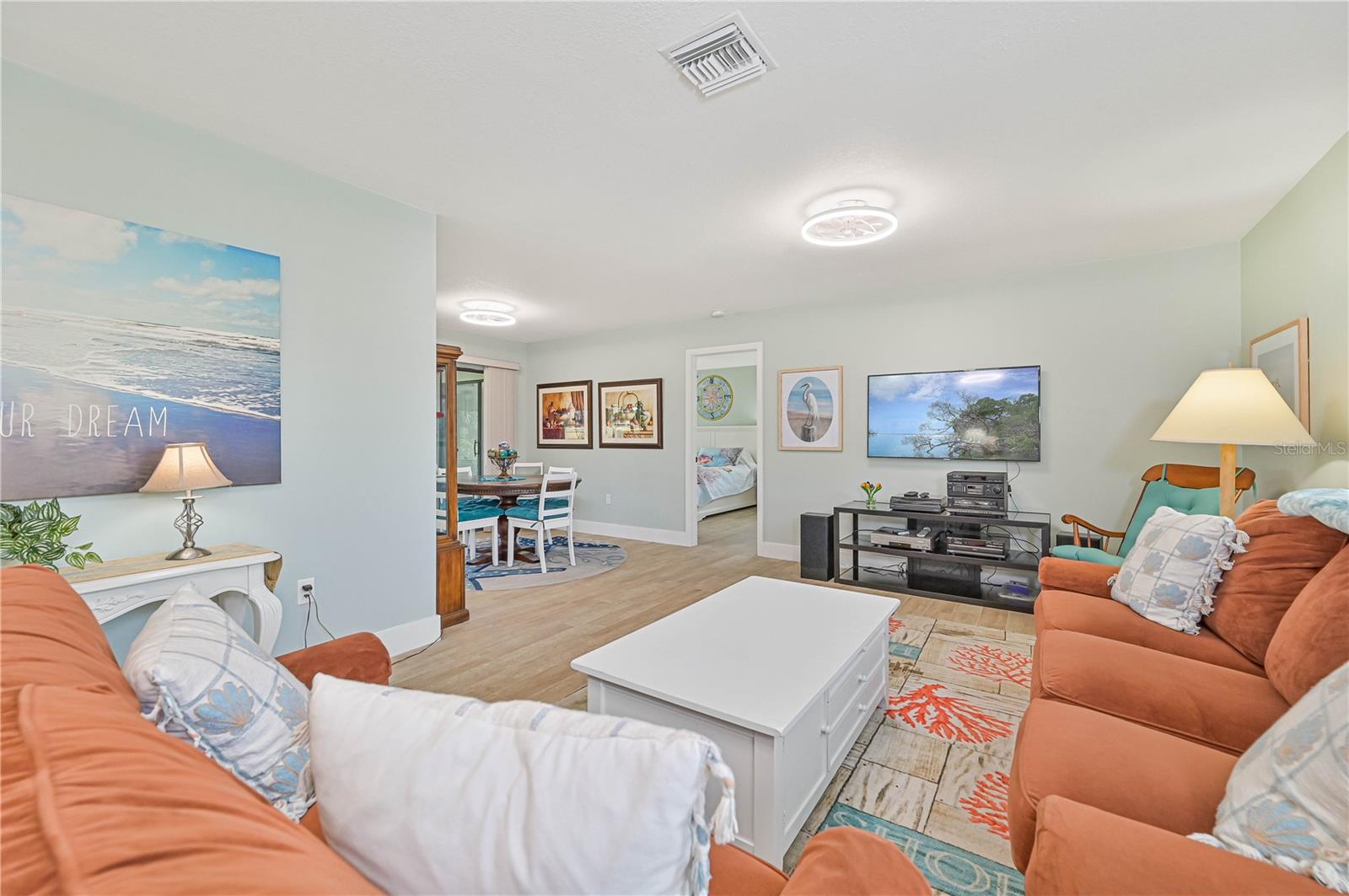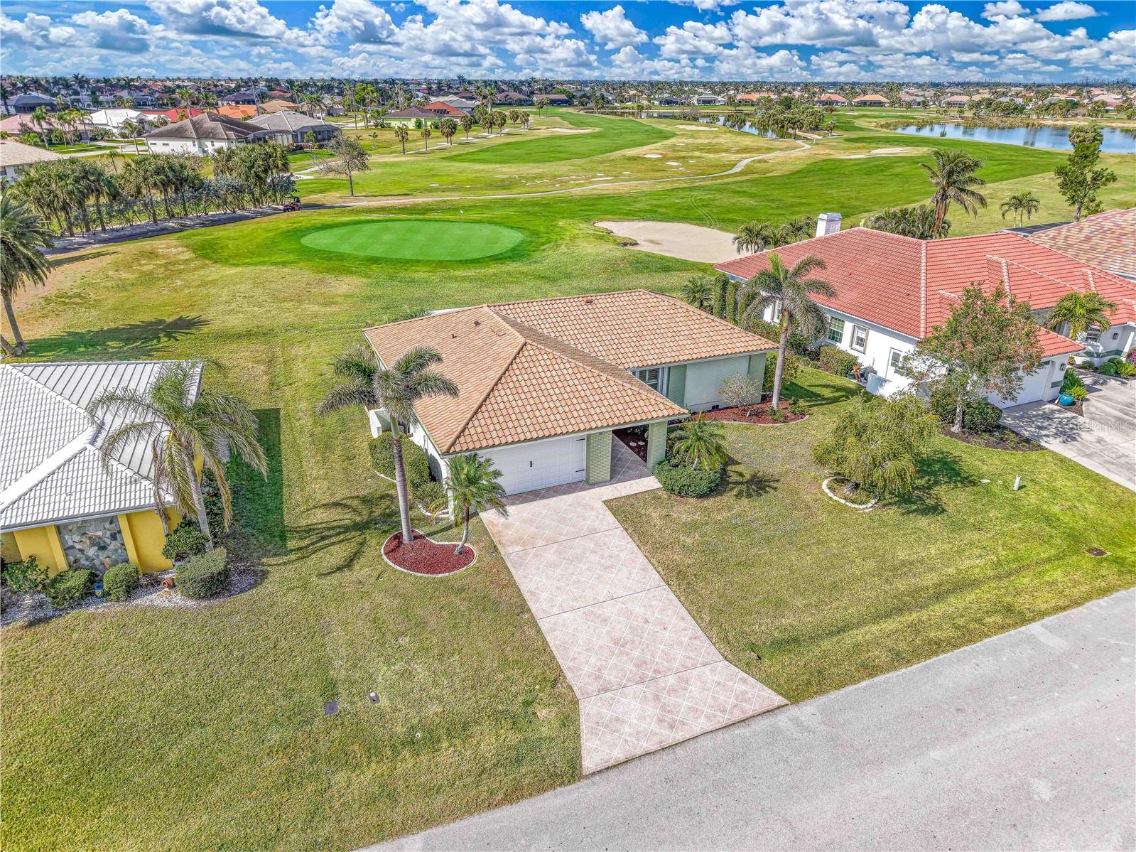 This home has been completely updated and is move-in ready! The entire house features stunning new tile flooring. The remodeled kitchen includes solid wood cabinets, a stylish tiled backsplash, a pass-through window to a counter bar on the lanai, an exhaust fan, glass in the upper cabinets, stainless steel appliances, and a brand-new sink and faucet. Off the kitchen, you’ll find a brand new butlers pantry with a wet bar. The family room, currently used as a formal dining room, has sliders leading to the lanai. The dining area/breakfast nook also offers sliders to the lanai, perfect for outdoor living. The home’s inviting entryway features an 18x9 covered porch that leads to a brand-new front door and opens into a spacious living room. The oversized main bedroom includes a ceiling fan and a slider to the lanai. The remodeled ensuite bathroom boasts a large shower, a double sink solid wood vanity with a Quartz Countertop and soft close cabinetry and a generous 10x6 walk-in closet. The guest bathroom has also been beautifully remodeled with a tiled shower/tub combo, solid wood vanity with a Quartz Countertop and soft close cabinetry. The second bedroom includes a double closet for extra storage. Interior highlights include new solid core plantation shutters, shiplap siding, new ceiling fans, solid surface countertops in the kitchen and bathrooms, and fresh paint with new baseboards throughout. Additional updates include new interior and exterior light fixtures, new gutters, fresh exterior paint, A/C (2022), new hurricane impact windows (2023), new irrigation, a new hot water heater, and a new hurricane rated front door. The enclosed lanai, approximately 480 sq ft, offers ceiling fans and sliders all around, creating the perfect space for dining or relaxation while enjoying views of the golf course and park-like surroundings. The spacious 22x19 garage features an opener, 2 ceiling fans, cabinets, a service door, a pull-down ladder to the attic, and a new storm-rated garage door. The home also includes a wind mitigation report showing new hurricane impact windows (2023), hurricane shutters, a new Storm Smart roll-down storm catcher, and a brand-new metal roof (2023) for added protection. Walk to nearby restaurants and shopping, and enjoy a short drive to downtown and I-75. This home truly has it all!