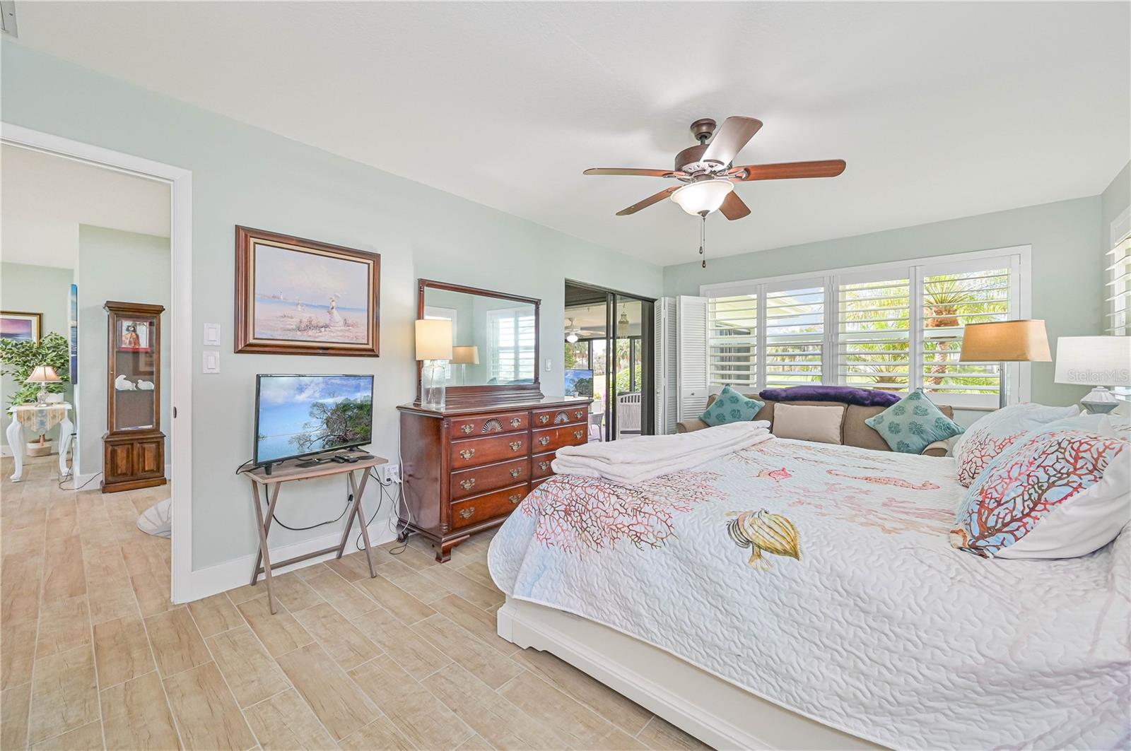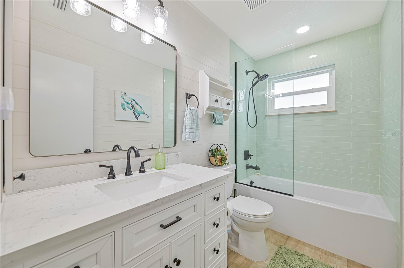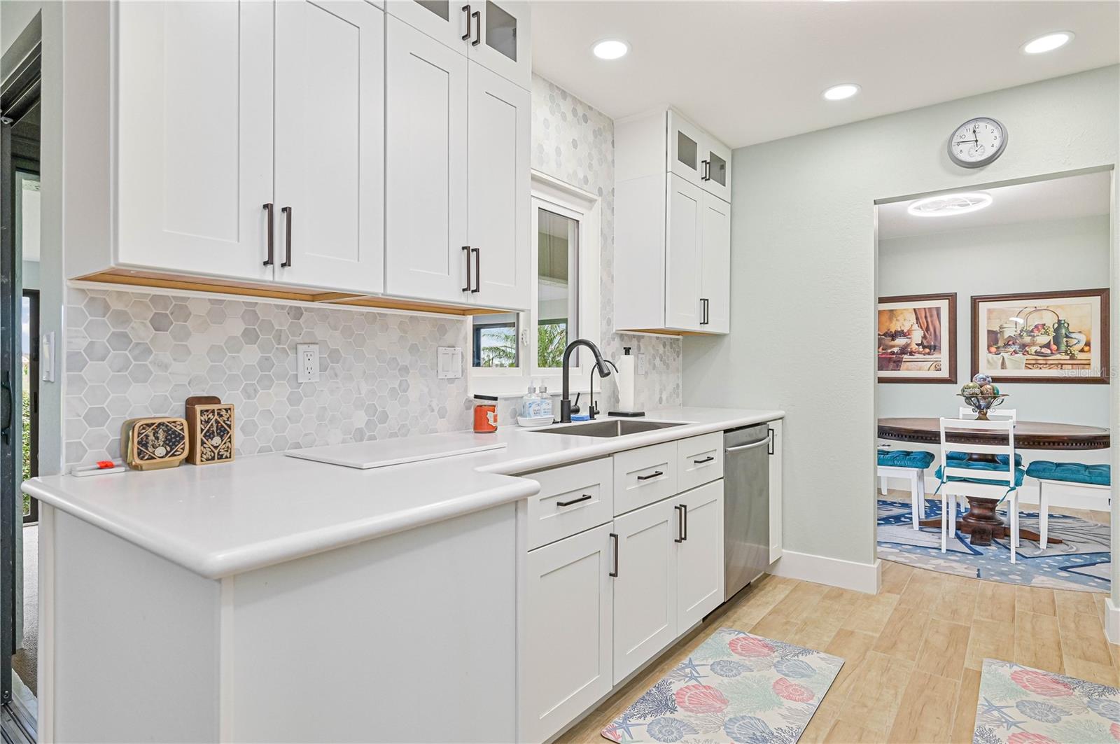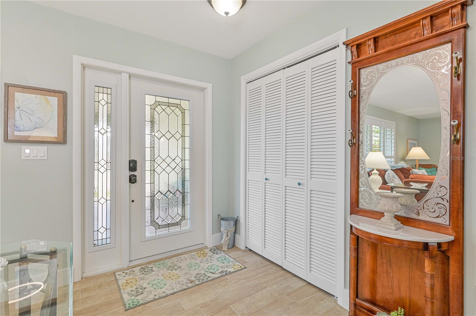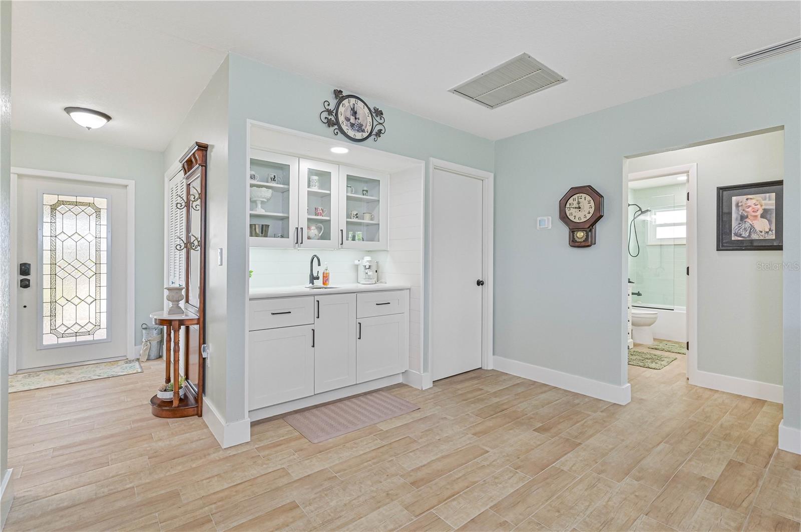 This home has been completely updated and is move-in ready! The entire house features stunning new tile flooring. The remodeled kitchen includes solid wood cabinets, a stylish tiled backsplash, a pass-through window to a counter bar on the lanai, an exhaust fan, glass in the upper cabinets, stainless steel appliances, and a brand-new sink and faucet. Off the kitchen, you’ll find a brand new butlers pantry with a wet bar. The family room, currently used as a formal dining room, has sliders leading to the lanai. The dining area/breakfast nook also offers sliders to the lanai, perfect for outdoor living. The home’s inviting entryway features an 18x9 covered porch that leads to a brand-new front door and opens into a spacious living room. The oversized main bedroom includes a ceiling fan and a slider to the lanai. The remodeled ensuite bathroom boasts a large shower, a double sink solid wood vanity with a Quartz Countertop and soft close cabinetry and a generous 10x6 walk-in closet. The guest bathroom has also been beautifully remodeled with a tiled shower/tub combo, solid wood vanity with a Quartz Countertop and soft close cabinetry. The second bedroom includes a double closet for extra storage. Interior highlights include new solid core plantation shutters, shiplap siding, new ceiling fans, solid surface countertops in the kitchen and bathrooms, and fresh paint with new baseboards throughout. Additional updates include new interior and exterior light fixtures, new gutters, fresh exterior paint, A/C (2022), new hurricane impact windows (2023), new irrigation, a new hot water heater, and a new hurricane rated front door. The enclosed lanai, approximately 480 sq ft, offers ceiling fans and sliders all around, creating the perfect space for dining or relaxation while enjoying views of the golf course and park-like surroundings. The spacious 22x19 garage features an opener, 2 ceiling fans, cabinets, a service door, a pull-down ladder to the attic, and a new storm-rated garage door. The home also includes a wind mitigation report showing new hurricane impact windows (2023), hurricane shutters, a new Storm Smart roll-down storm catcher, and a brand-new metal roof (2023) for added protection. Walk to nearby restaurants and shopping, and enjoy a short drive to downtown and I-75. This home truly has it all!