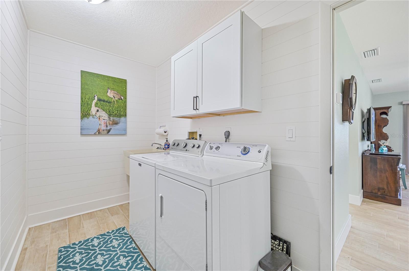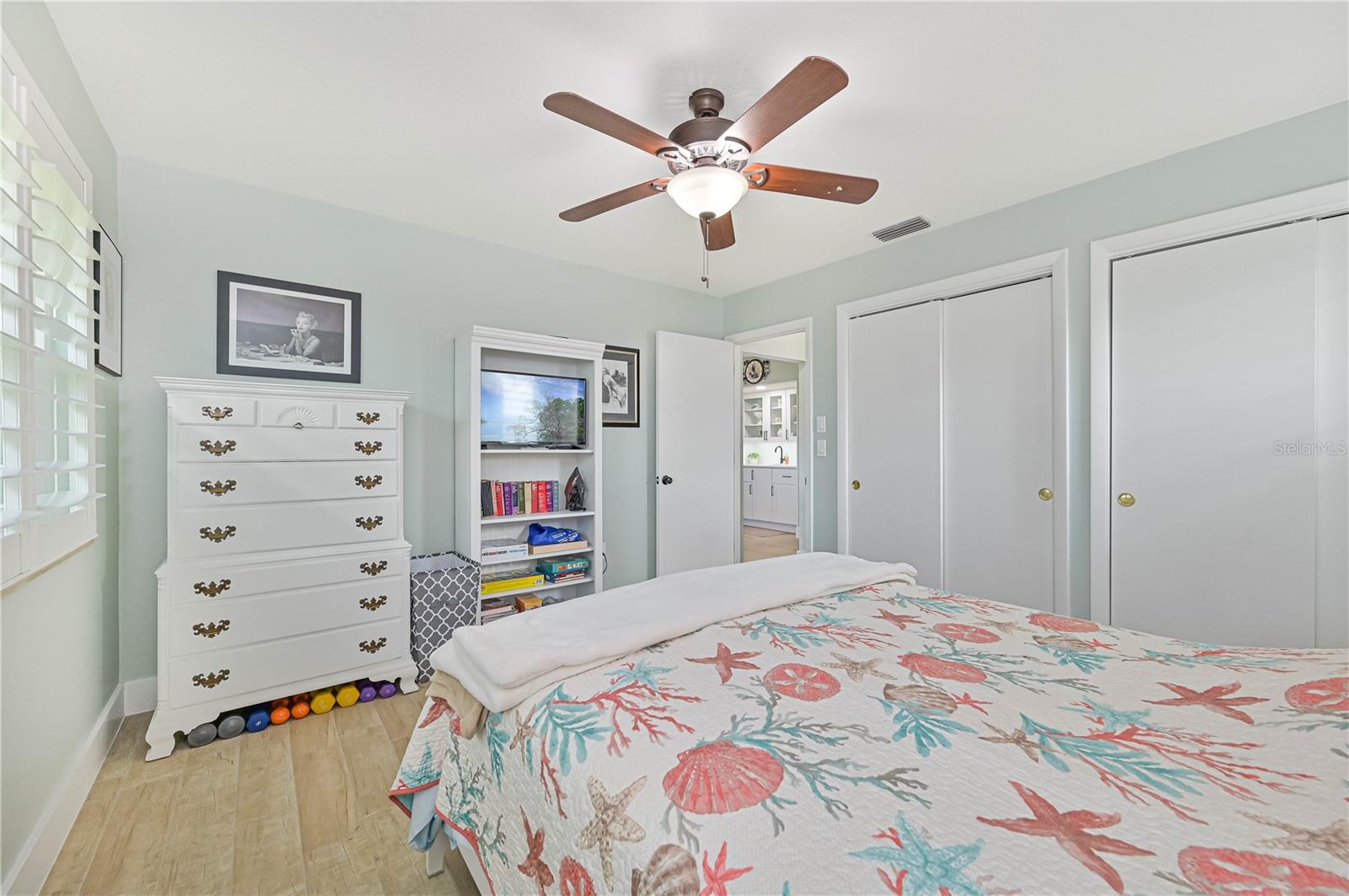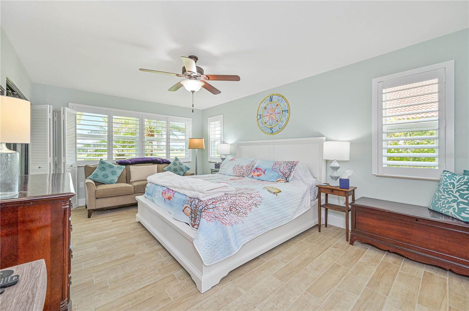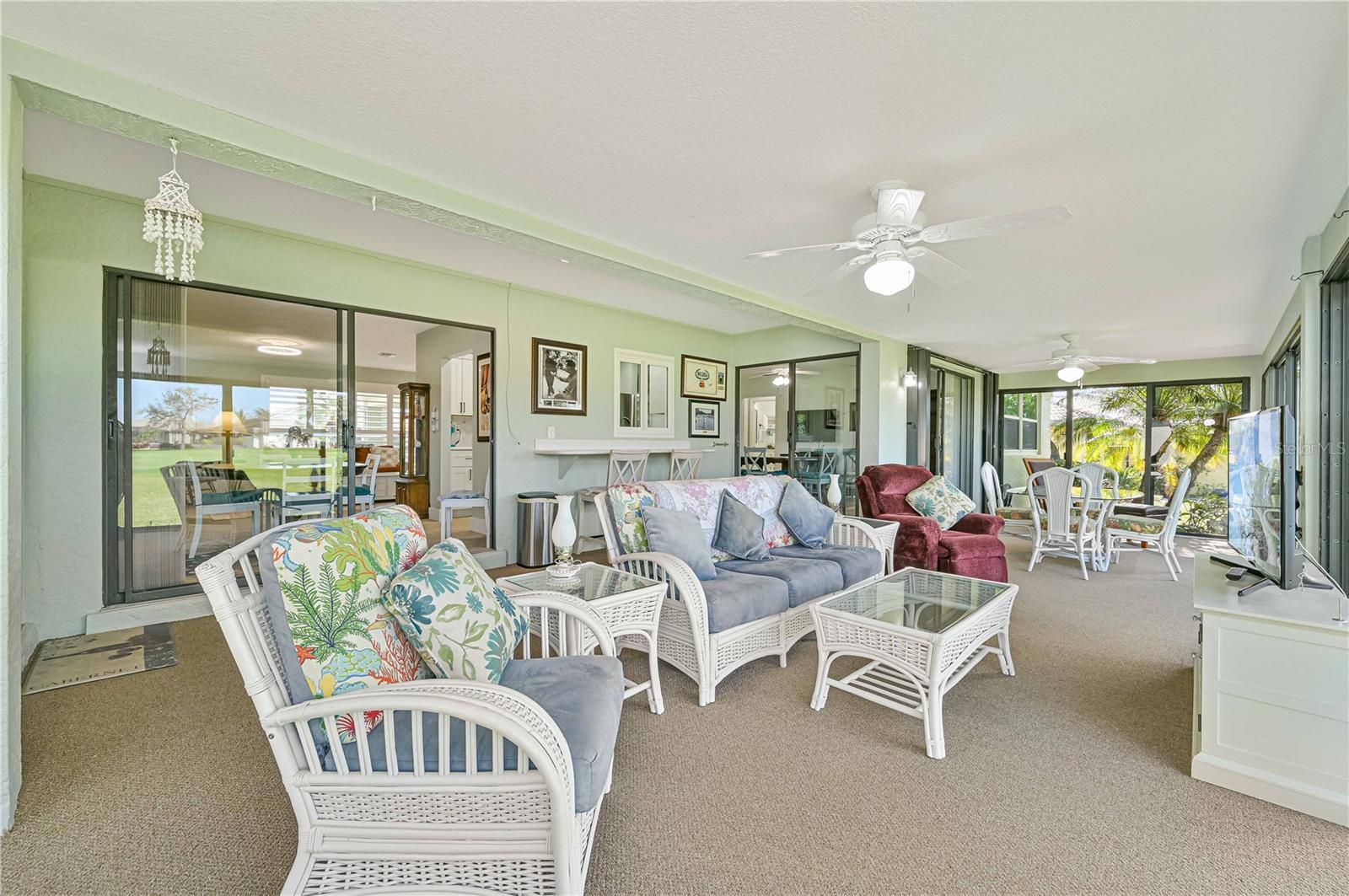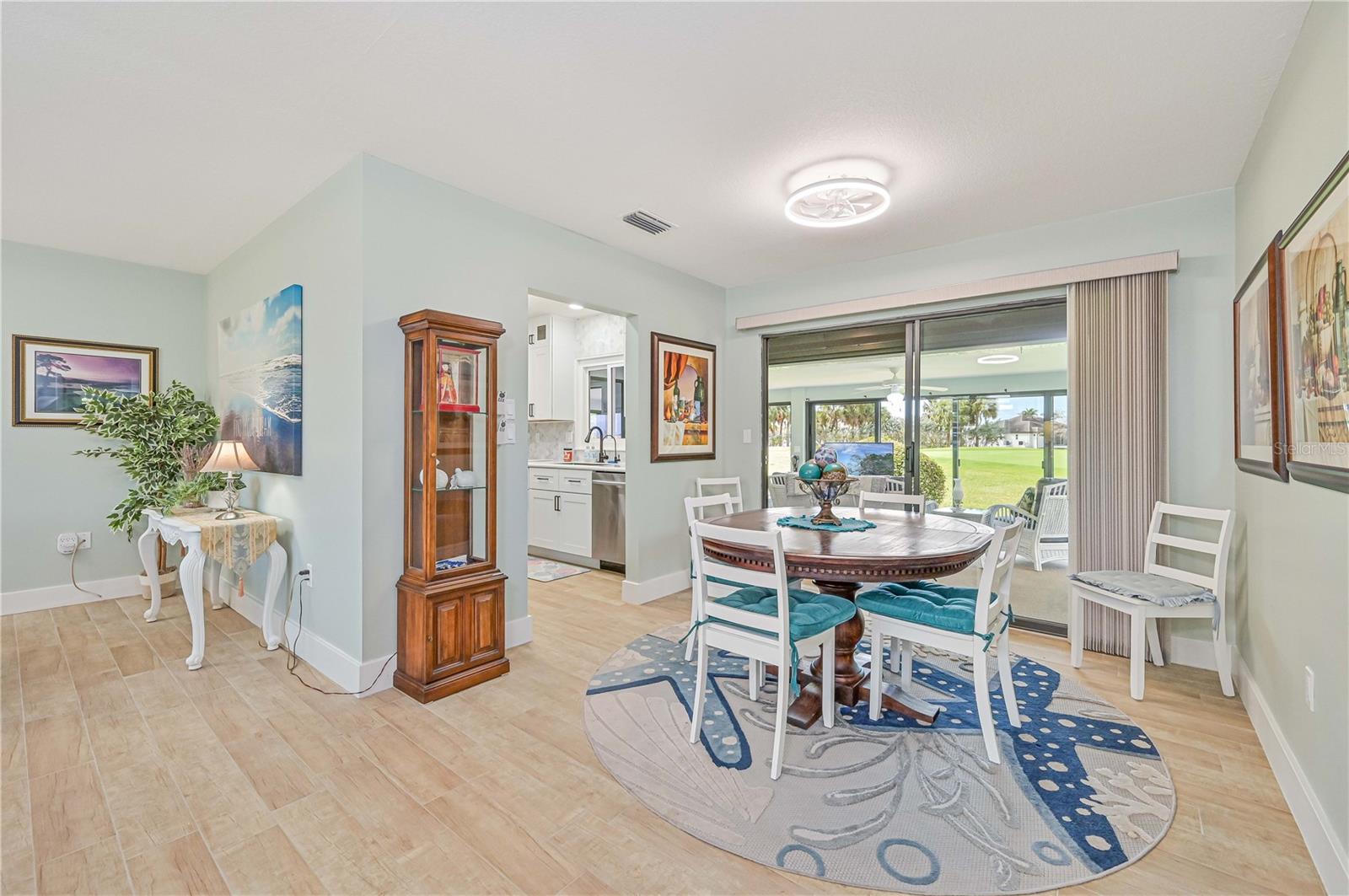 This home has been completely updated and is move-in ready! The entire house features stunning new tile flooring. The remodeled kitchen includes solid wood cabinets, a stylish tiled backsplash, a pass-through window to a counter bar on the lanai, an exhaust fan, glass in the upper cabinets, stainless steel appliances, and a brand-new sink and faucet. Off the kitchen, you’ll find a brand new butlers pantry with a wet bar. The family room, currently used as a formal dining room, has sliders leading to the lanai. The dining area/breakfast nook also offers sliders to the lanai, perfect for outdoor living. The home’s inviting entryway features an 18x9 covered porch that leads to a brand-new front door and opens into a spacious living room. The oversized main bedroom includes a ceiling fan and a slider to the lanai. The remodeled ensuite bathroom boasts a large shower, a double sink solid wood vanity with a Quartz Countertop and soft close cabinetry and a generous 10x6 walk-in closet. The guest bathroom has also been beautifully remodeled with a tiled shower/tub combo, solid wood vanity with a Quartz Countertop and soft close cabinetry. The second bedroom includes a double closet for extra storage. Interior highlights include new solid core plantation shutters, shiplap siding, new ceiling fans, solid surface countertops in the kitchen and bathrooms, and fresh paint with new baseboards throughout. Additional updates include new interior and exterior light fixtures, new gutters, fresh exterior paint, A/C (2022), new hurricane impact windows (2023), new irrigation, a new hot water heater, and a new hurricane rated front door. The enclosed lanai, approximately 480 sq ft, offers ceiling fans and sliders all around, creating the perfect space for dining or relaxation while enjoying views of the golf course and park-like surroundings. The spacious 22x19 garage features an opener, 2 ceiling fans, cabinets, a service door, a pull-down ladder to the attic, and a new storm-rated garage door. The home also includes a wind mitigation report showing new hurricane impact windows (2023), hurricane shutters, a new Storm Smart roll-down storm catcher, and a brand-new metal roof (2023) for added protection. Walk to nearby restaurants and shopping, and enjoy a short drive to downtown and I-75. This home truly has it all!