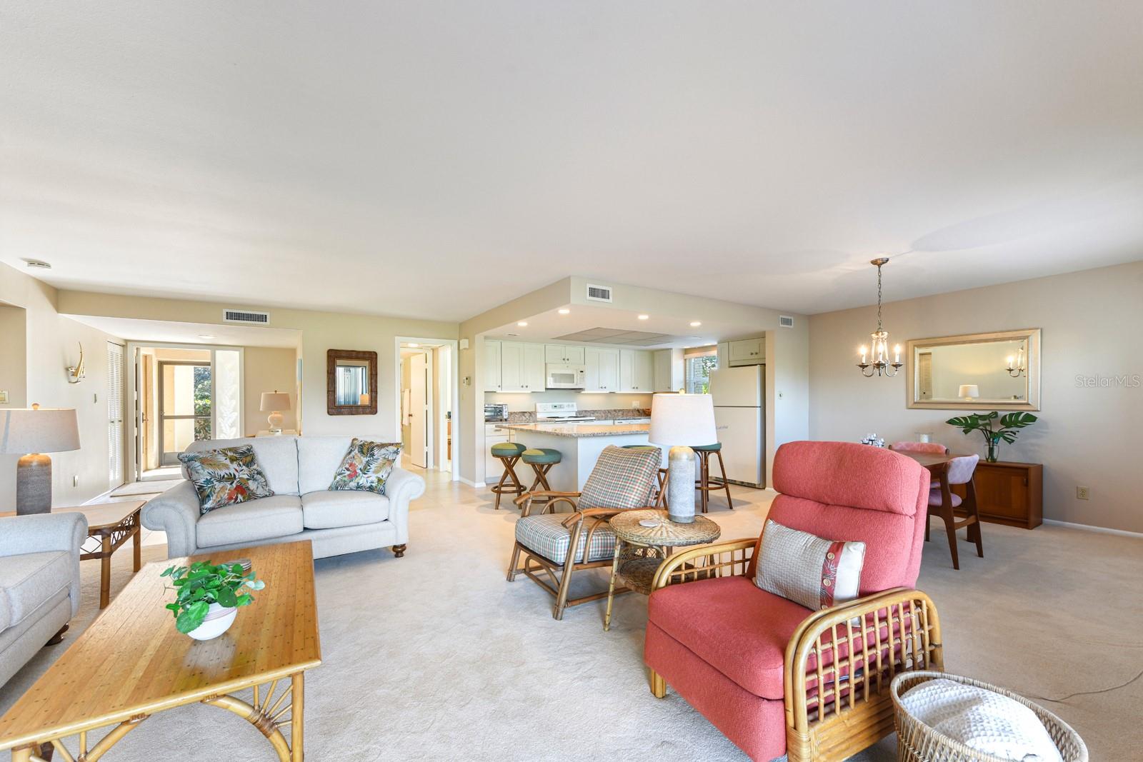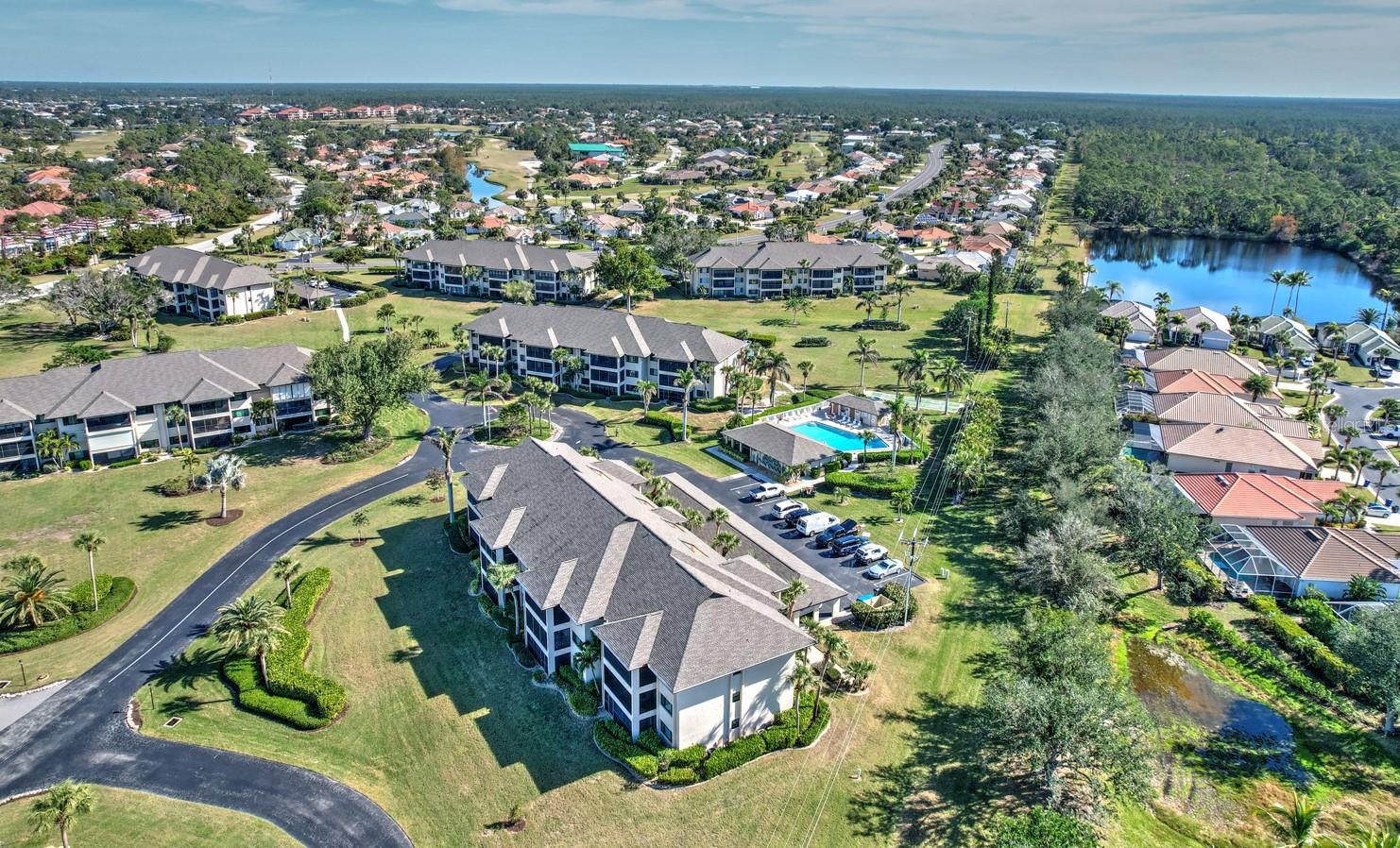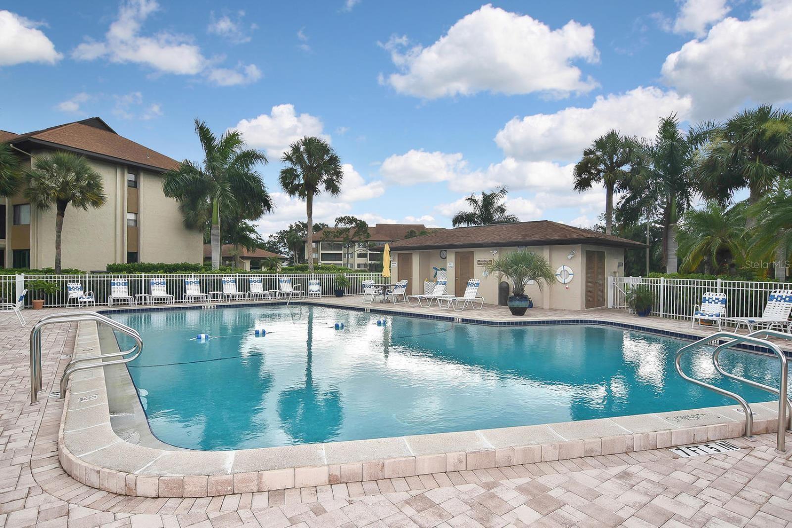 Now with this new price you should really take a look! Welcome to this light and bright end unit 2 bed/2 bath Turnkey Furnished condo in one of the best locations in Commodore Club. Building 4 is tucked back from the main roads, walking distance to fitness center and restaurants and right across from the community pool. At the quiet end of the building, you’ll have a large greenbelt on the side and back – great for walking your pet. And you’ll appreciate the first level access from the covered car port right outside the front door. No waiting for the elevator or climbing stairs when you come home with groceries. Inside, this practical layout features a central open kitchen with recent updates including new hardwood cabinets with soft close drawers and doors, new quartz counters, undermount lighting and new ceilings. The end units include a desirable extra window in the kitchen that brightens the entire room. Overhead cabinets were removed for a cleaner look and replaced with additional recessed lighting. Hurricane-rated windows all around are enhanced with plantation shutters and the entire unit has pleasing neutral colors that lend a crisp and clean look. New attractive tile flooring covers the main traffic areas and new carpet in living room and bedrooms will last for many years. Planning a party? The dining table expands to seat 8! The spacious owner’s bedroom has a door leading out to the lanai plus an ensuite bath with wide corian 2 sink vanity, new lighting, soaking tub and separate shower. Across the condo the second bedroom is a versatile office or bedroom with queen Murphy bed ready for visiting guests. The guest bath was updated with new vanity, sink, mirrors and lighting and the entire guest suite can be closed off with a pocket door making it ensuite. An inside laundry room has cabinet storage above newer washer and dryer. Step out to the wide lanai that’s enclosed with glass sliding doors and relax while watching brilliant sunsets in the evening. The heated community pool right across the parking lot is a favorite gathering spot complete with a spacious clubhouse for parties or events. A locked storage closet on the front screened lanai can also be a workbench for projects. AC and water heater updated in 2022, carpeting and interior paint in 2024. Whether you’re looking for a winter getaway or full time residence, Commodore is a great community and this unit is a perfect option!