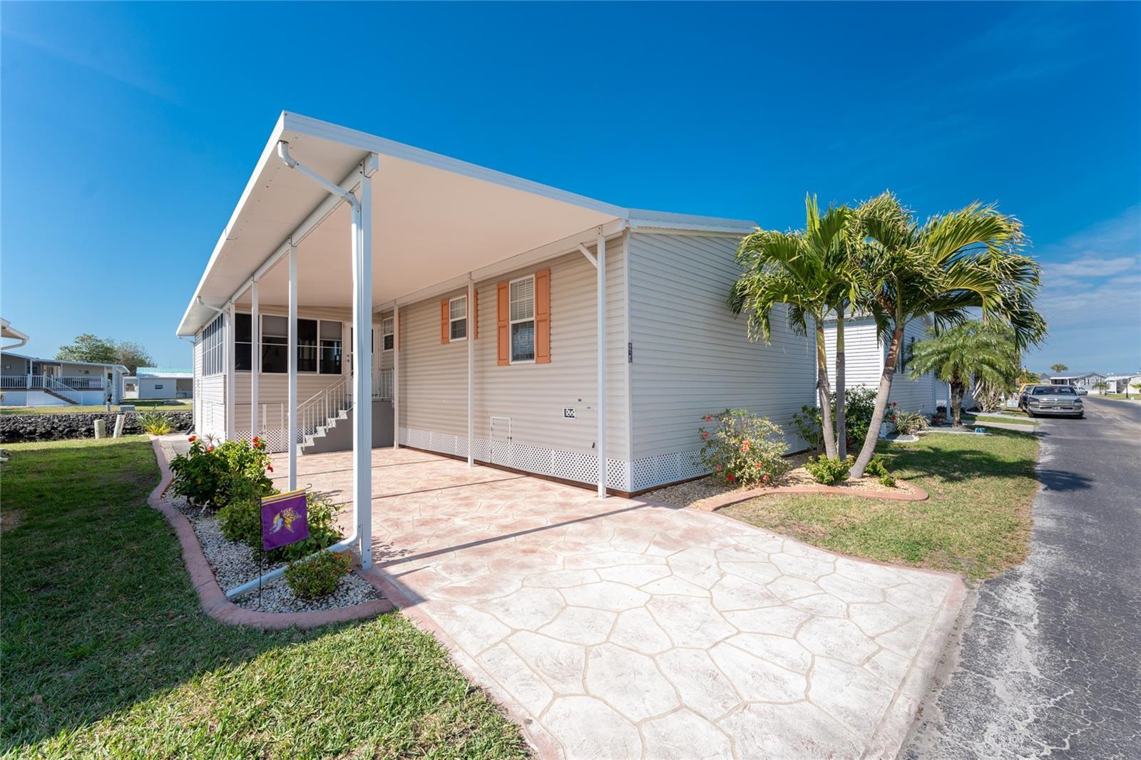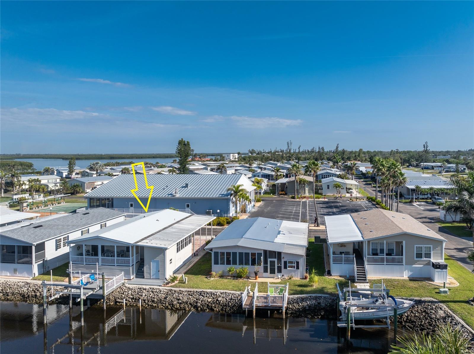 WATERFRONT 2 Bedroom, 2 Bathroom, 2 Car Carport manufactured home with a Florida room, BEAUTIFUL Water Views, a private dock with an 8000 lb remote controlled boat lift MINUTES to Charlotte Harbor, located in the desirable 55+ River Forest Community! CLICK ON THE VIRTUAL TOUR LINK 1 FOR THE VIDEO AND VIRTUAL LINK 2 FOR THE 3D TOUR. Featuring a bright and airy open floor plan, crown molding, luxury vinyl flooring throughout, and MUCH MORE! Step into a beautifully designed open floor plan filled with elegant crown molding, and luxury vinyl flooring throughout. The seamless living and dining areas provide the perfect space for gathering with friends and family, while whipping up family favorites in the kitchen. Enjoy the convenience of all-white appliances, plenty of cabinets for storage, and a central island with a breakfast bar—ideal for casual dining. Extend your living and entertaining space into the spacious Florida room, where large windows flood the space with the beautiful Florida sunshine. The master suite is a private retreat, featuring a walk-in closet and an en-suite bathroom with a dual sink vanity and a walk-in shower. The guest bedroom offers a built-in closet and is conveniently located near the guest bath. Start your mornings with coffee or wind down in the evening on the deck, taking in breathtaking waterfront views. For boating enthusiasts, this home comes with a private dock and an 8,000 lb boat lift, offering endless opportunities for fishing, sailing, and waterfront adventures. 2016 METAL ROOF - 2X6 WALL CONSTRUCTION - 2021 A/C - 50 FEET OF WATER FRONTAGE - DOUBLE PANED WINDOWS - ADDITIONAL STORAGE UNDER FLORIDA ROOM - SLAB UNDER FLORIDA ROOM. This vibrant community offers a HEATED POOL + SPA, 2 Bocce Ball Courts, 6 Shuffleboard Courts, Horseshoes, and a large Clubhouse with a kitchen, stage for entertaining, HDTV, library, and TONS of resident social events, including a Pickle ball group and line dancing, to keep active year-round! MINUTES to Fisherman’s Village where you can enjoy fine dining, shopping, boutiques, and live entertainment. Just a short ride to Punta Gorda's Historic downtown area and local favorites such as Ponce De Leon Park and world-class beaches. Conveniently located near I-75 or US 41 to take you on new adventures. Don’t miss out on this incredible waterfront lifestyle—schedule your showing today!