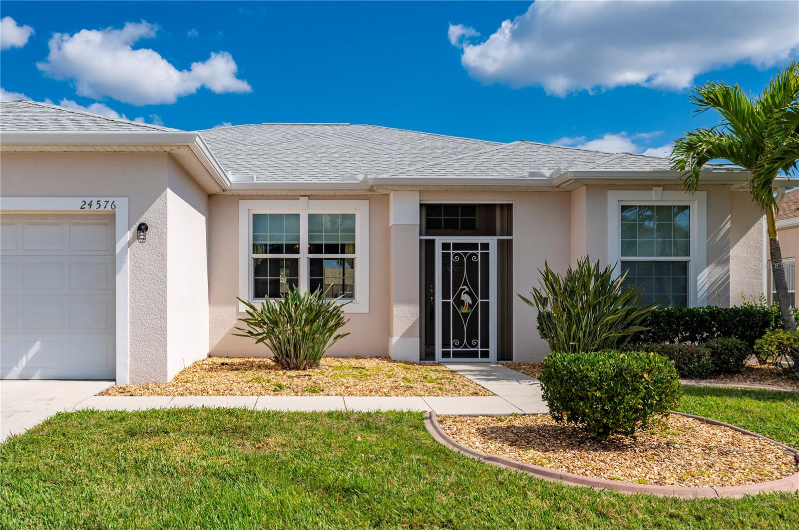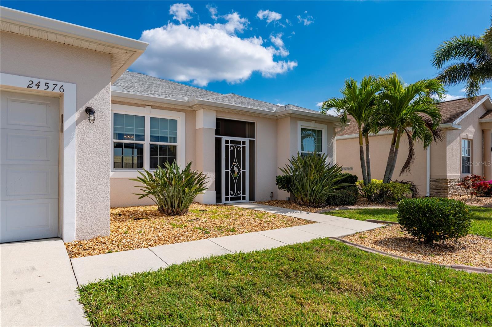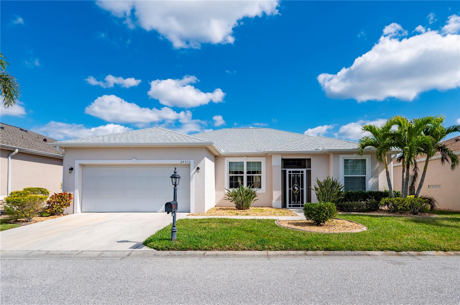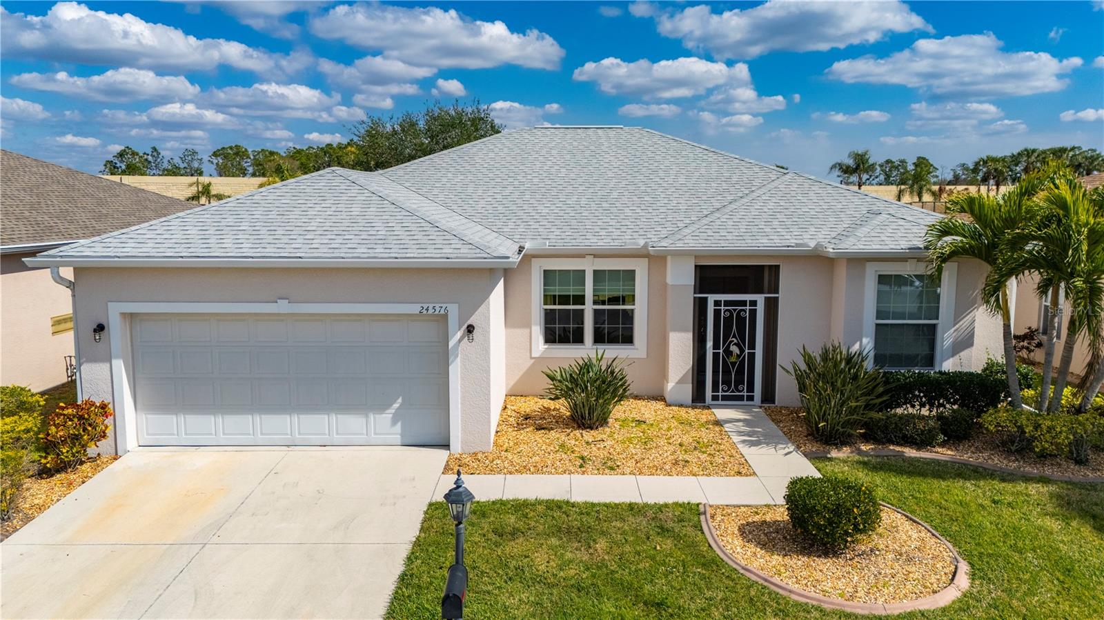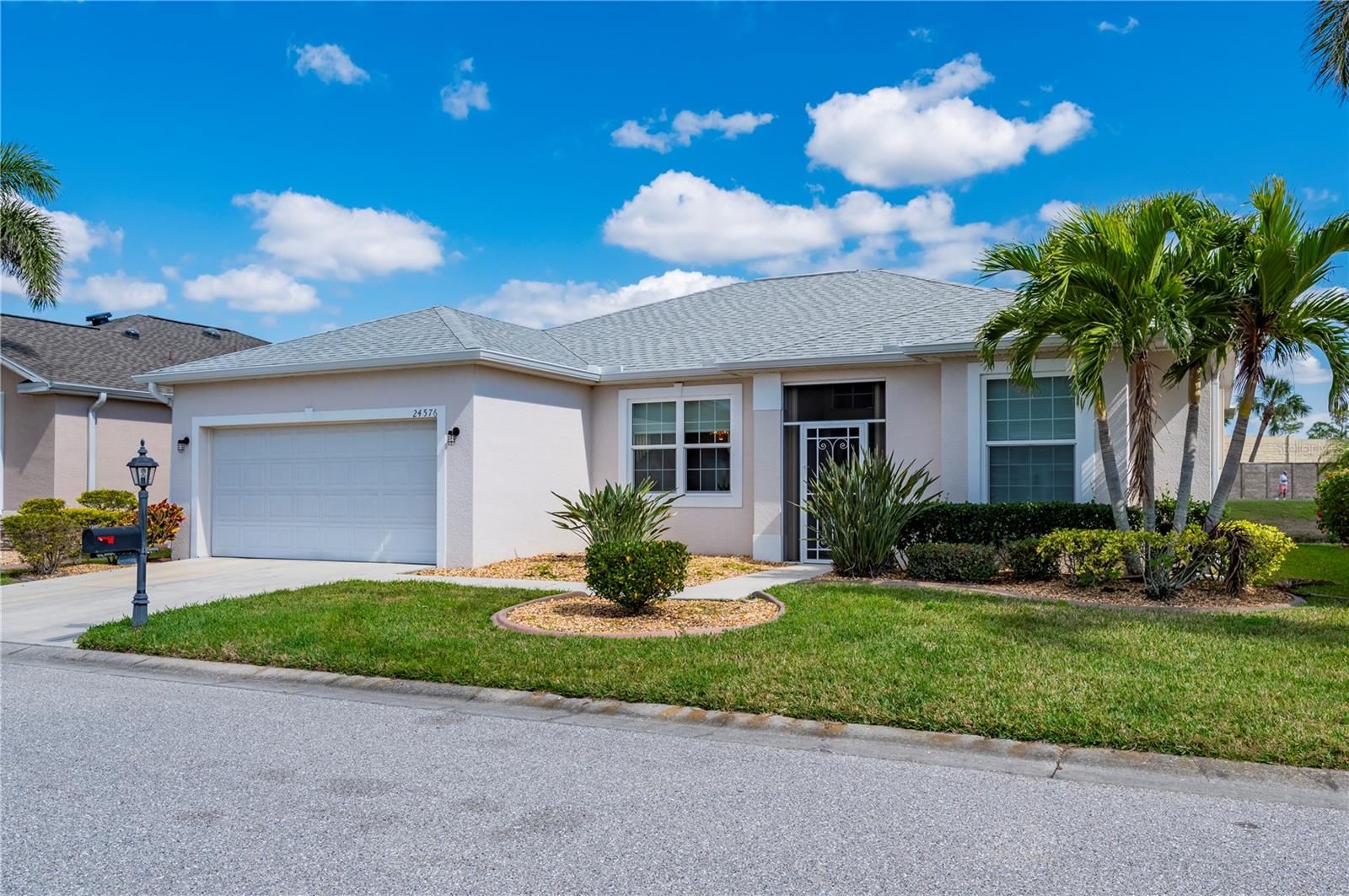 Lovely! Enjoy serene lake and golf course views from this spacious 3-bedroom, 2-bath, 2-car garage home in the desirable 55+ gated golf community of Kings Gate. Built in 2009, this open-concept home offers an airy living area with double sliders leading to an expansive screened lanai—perfect for relaxing and watching herons, ibis, and other native birds. The kitchen features ample cabinetry, a pantry, a breakfast bar, and a cozy dining nook. The oversized primary suite includes lanai access, a walk-in closet, and a luxurious en-suite bath with dual sinks, a soaking tub, and a separate shower. Upgrades include a new roof (2022), A/C (2018), accordion hurricane shutters, impact glass front window, reverse osmosis system, and underground utilities. The Community maintains the irrigation system provides basic cable and keeps your lawn mowed and trimmed. Kings Gate amenities include a full-time Activities Director so there are plenty of fun events scheduled all year long, and you will also enjoy the enormous heated pool and spa, pickleball, tennis, billiards, a complete fitness center, crafts, and on-site golf course and restaurant. Boat/RV storage is available separately. So close to shopping, dining, I-75, and historic Punta Gorda. Fort Myers and Sarasota are nearby, as are several public beaches. Don’t miss this nature-rich retreat—schedule your tour today!