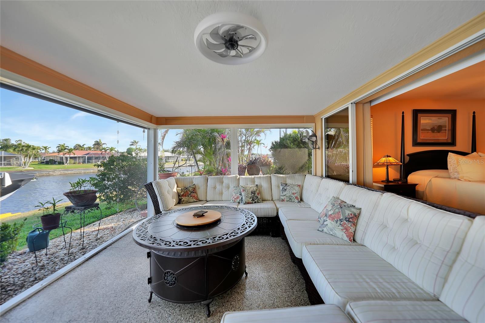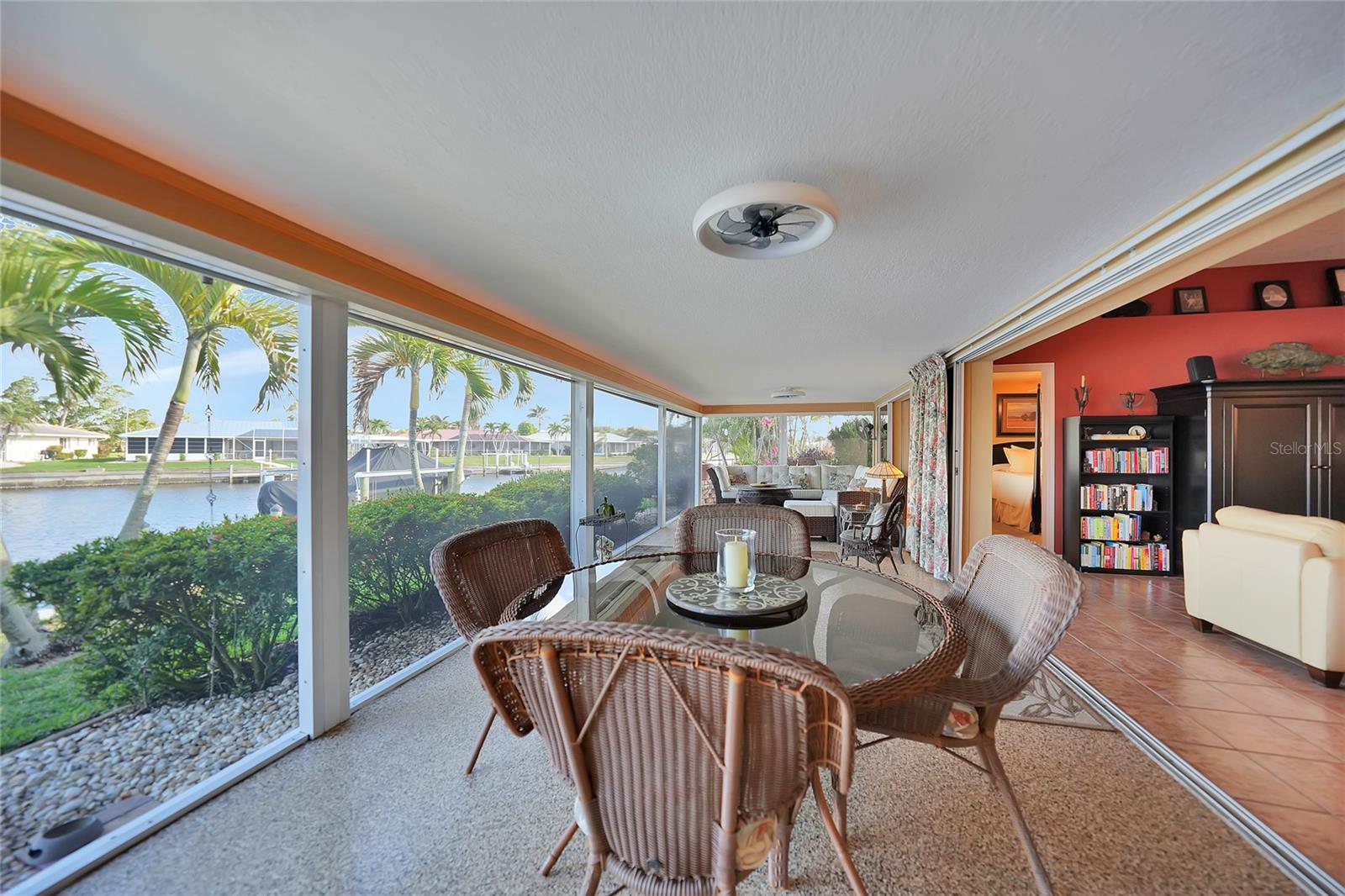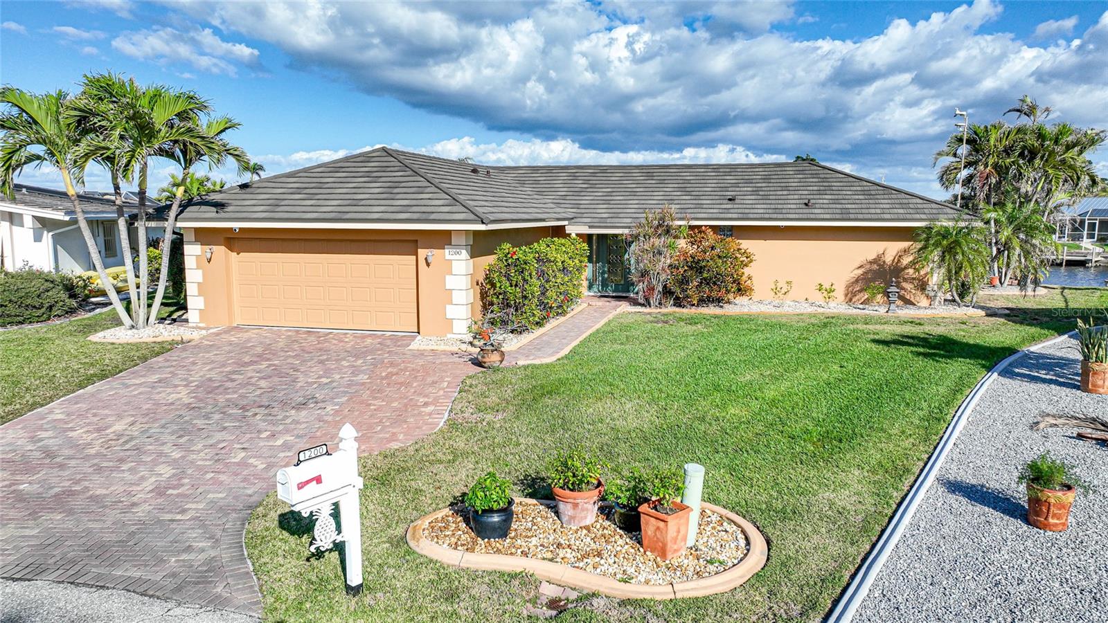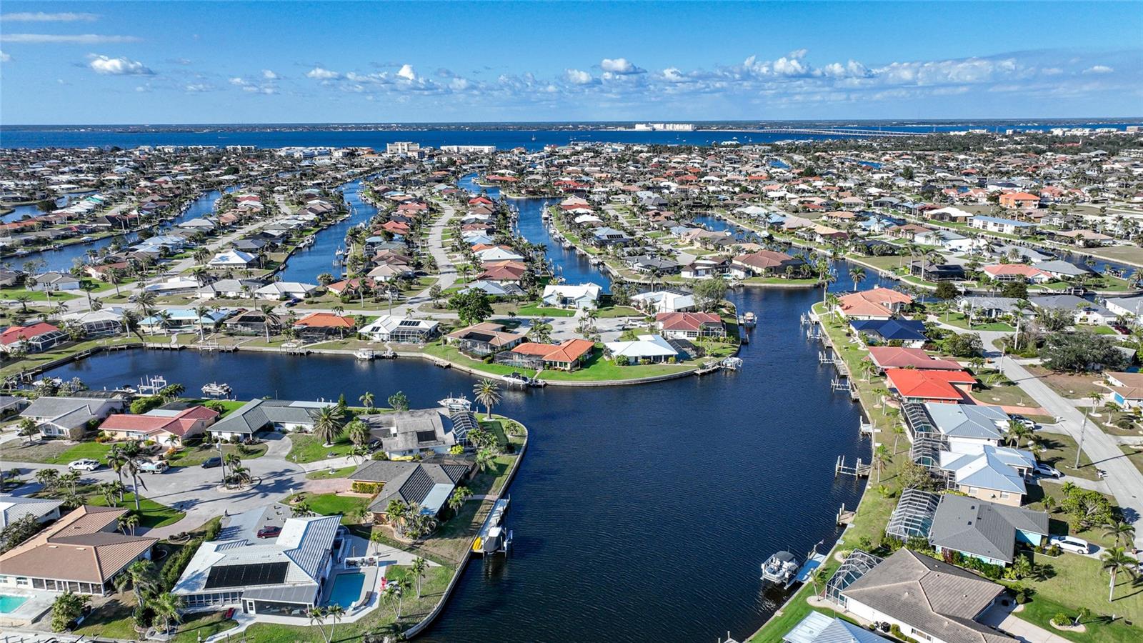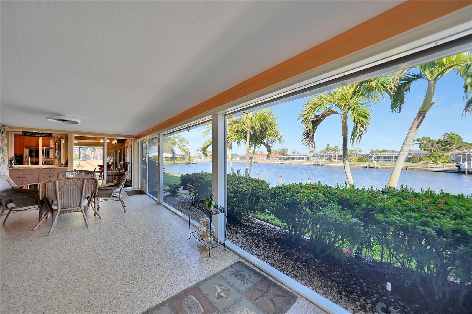 Exceptional, well-maintained PGI home offers all the features of true Florida living— experience the sun and moon rise over the canal from the entire back of the house and the sunset from the pool lanai. In addition to the many amenities that follow, this home is 12 minutes to open water at Fisherman’s Village. AND no damage from Helene or Milton. The open concept floorplan includes the bright, updated granite/stainless kitchen with Breakfast nook, Dining room/Great room with vaulted ceiling and 15’ of glass sliders flowing to the 36’ lanai with wide canal views. 140 feet of waterfront includes 59’ concrete dock and 10K boat lift for all your water toys. Inside, the split bedroom floorplan is perfect for hosting guests. Primary suite includes a slider to the lanai and canal views, ensuite with double sink long vanity, tile shower, and walk-in closet with modular shelving. At the other end of the home are two bedrooms that share a full bath with access to the private pool area. One bedroom is currently being used as an office, the other has a bookcase queen-size Murphy bed and installed closet system. A laundry/storage room connects the kitchen to the two-car garage. New powered hurricane shades on lanai, water heater, metal roof in 2023 with 40-year transferable warranty, A/C 2025. Bring your bathing suit and fishing rod, it’s time to enjoy all that Southwest Florida has to offer. Some furnishings available under separate contract. Be sure to click on the video and virtual tour attached. Make an appointment to view today!