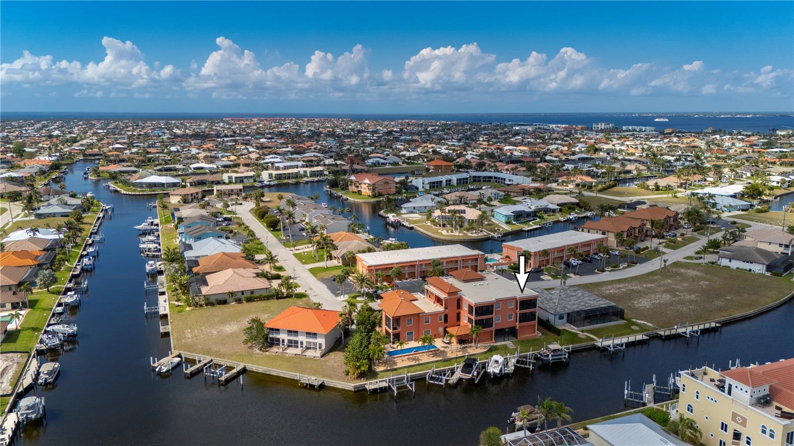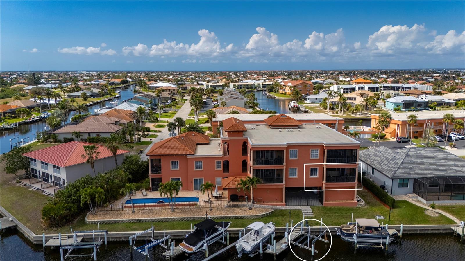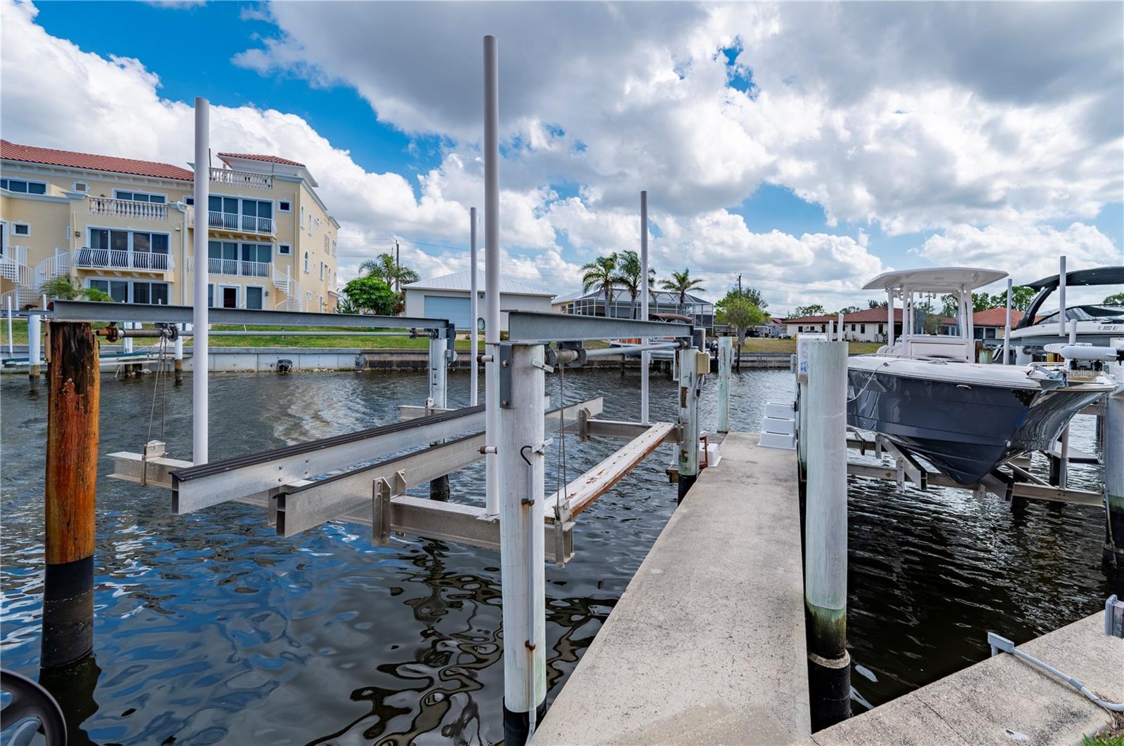 LUXURY WATERFRONT CONDO in Punta Gorda Isles. This elegant & stunning CORNER UNIT offers everything you need for the perfect Florida lifestyle! WATER VIEWS, BOATING to Charlotte Harbor, the Gulf & BEACHES. With a DEEDED BOAT SLIP, a 10,000 pound BOAT LIFT, 2 DEEDED PARKING SPACES in a secure, GATED UNDER-BUILDING GARAGE, INDIVIDUAL STORAGE UNIT, + room for Golf Cart parking & BUILDING ELEVATOR this home is a boater’s dream. Step inside to a spacious, open floor plan with 3 BEDROOMS, 2 BATHROOMS, 2,034 square feet and neutral plank wood-look luxury vinyl & tile flooring throughout. Large windows and WOOD PLANTATION SHUTTERS allow natural light to pour in while offering privacy when needed. The split floor-plan ensures maximum comfort, with the primary suite featuring twin closets, balcony access, water views, an ensuite bath with a walk-in Roman shower, soaking tub, and dual sinks. The guest bedrooms are located on the opposite side of the condo for added privacy, along with a well-appointed guest bath. The large kitchen is designed for both function and style, complete with stainless steel appliances, a breakfast bar, and an adjacent dining area. The expansive living and great room provide plenty of space for entertaining or relaxing. Step onto the oversized, screened-in balcony to soak in the panoramic water views—this is Florida living at its finest. This condo is equipped with modern updates, including new luxury vinyl flooring, modern lighting, a new roof (2025), impact glass on the front door, and remote-controlled electric hurricane shutters for the patio sliding doors for added peace of mind. The private storage area in the garage comes with shelving and a workbench, making organization a breeze. Beyond your front door, enjoy resort-style amenities, including a community heated pool, grill area, fishing, boating and canal-side seating. The location is unbeatable— By boat or car you are just minutes from charming downtown Punta Gorda, Fishermen’s Village, shopping, dining and local favorites like the weekly farmer’s market. Outdoor enthusiasts will love the nearby bike and walking paths, pickleball courts, golf courses, and boating opportunities. Punta Gorda’s vibrant social scene includes live music, waterfront dining, festivals, and more. Whether you’re looking for a peaceful retreat or an active Florida lifestyle, this condo has it all. Don’t miss your chance to own a piece of paradise with unbeatable water views and boating access.