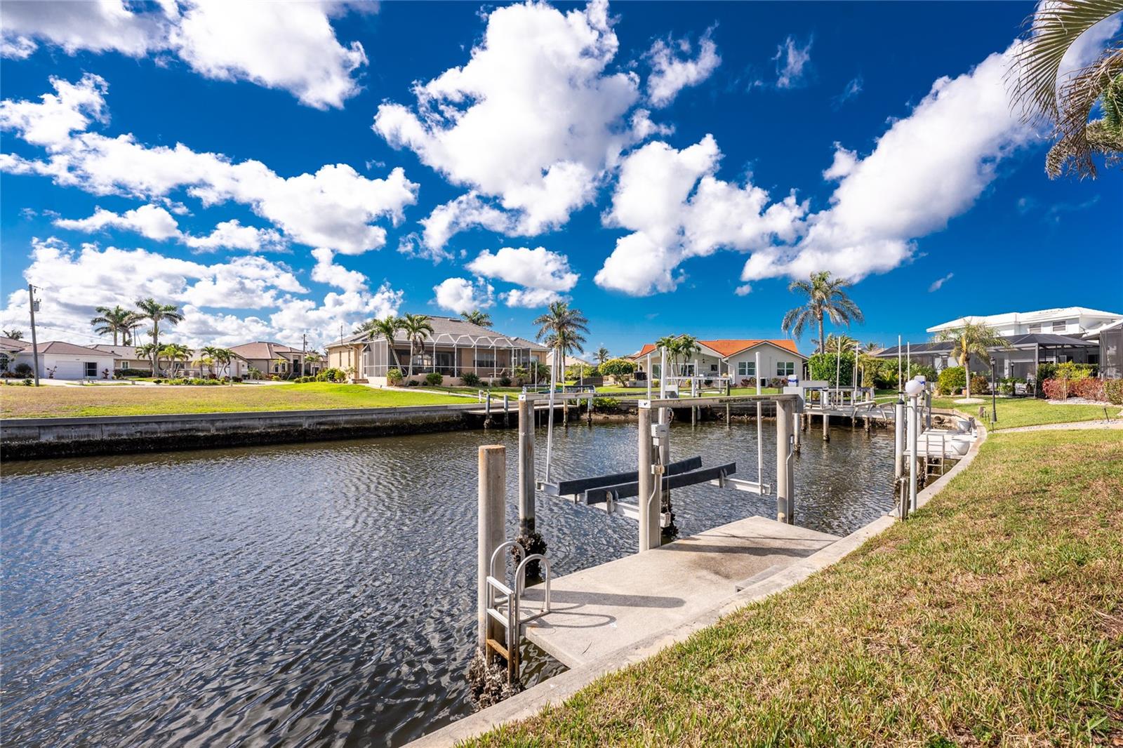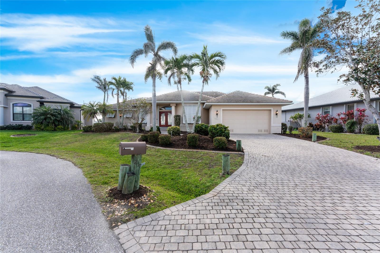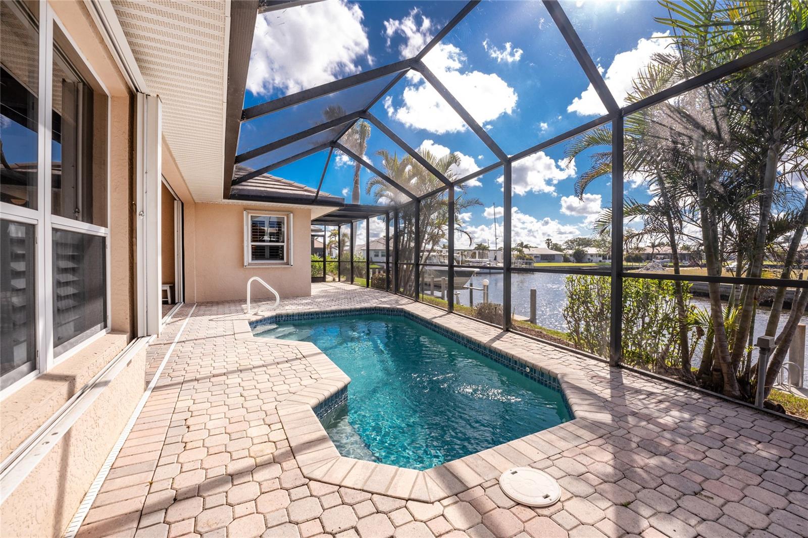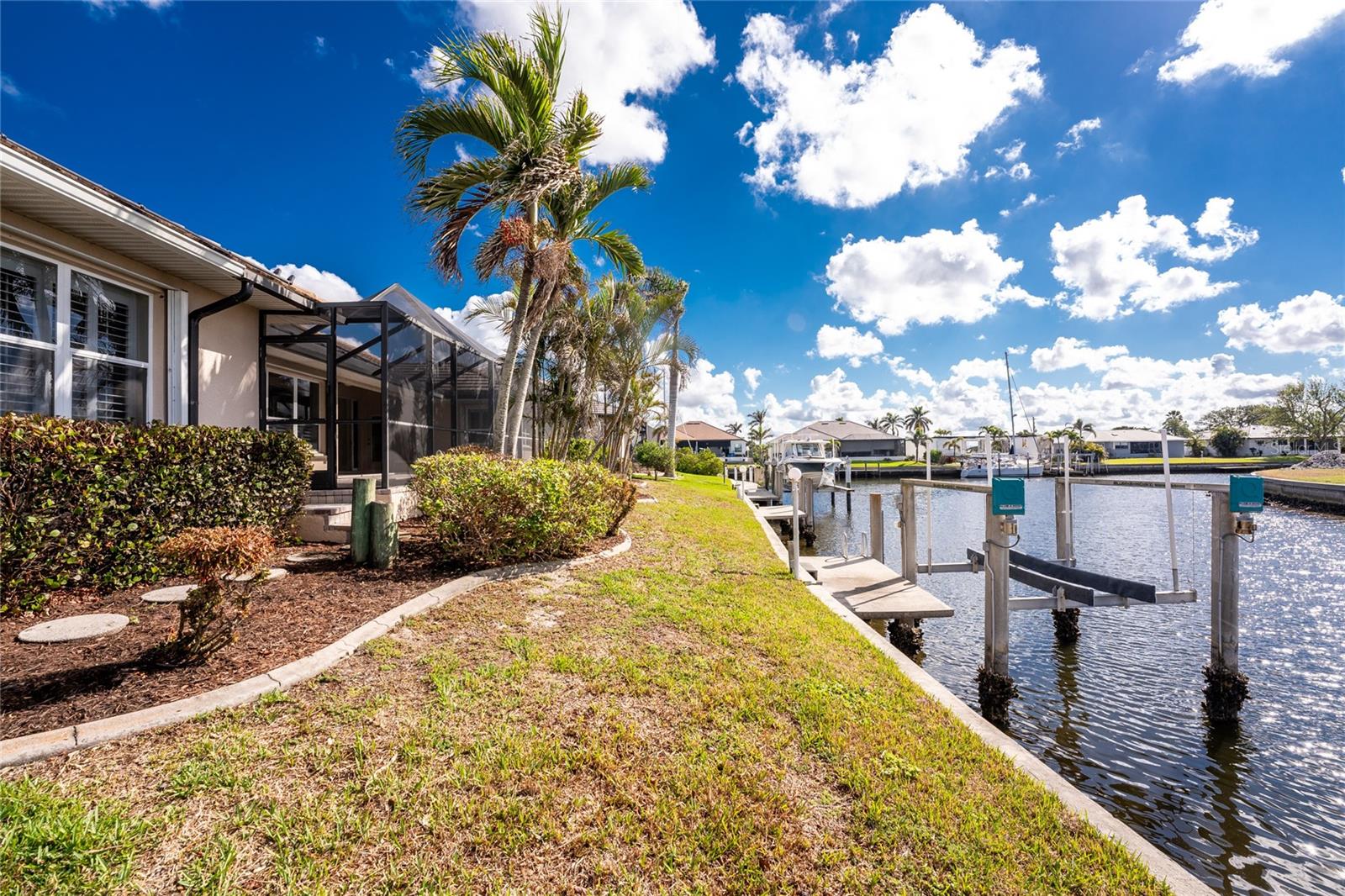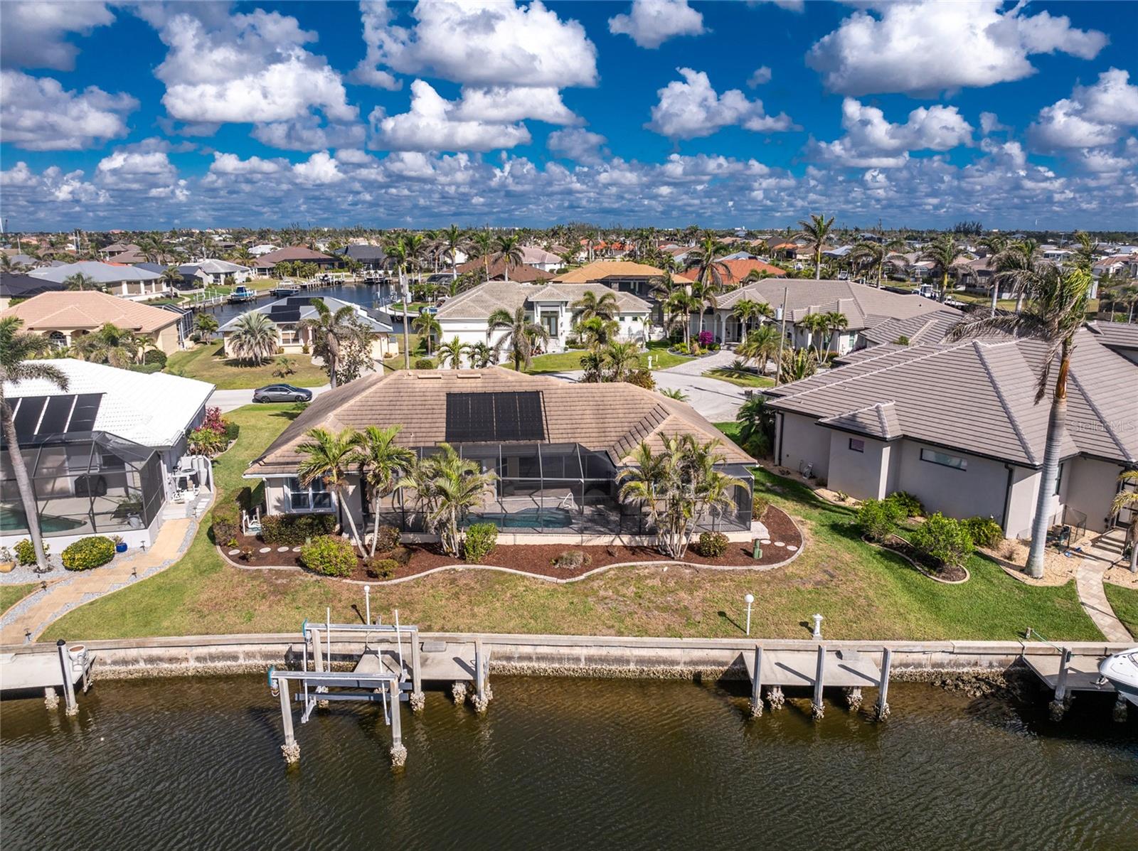 One or more photo(s) has been virtually staged. Elegant waterfront home in prestigious Punta Gorda Isles offers 95 FEET OF SALTWATER FRONT, City owned and maintained concrete seawall with dual docks and an electric boat lift, providing you quick SAILBOAT ACCESS (aka NO BRIDGES) to Charlotte Harbor. This custom-built 3-bedroom, 2-bath home, built by SandStar Custom Homes (now an Arthur Rutenberg Homes franchisee) sits on a QUIET CUL-DE-SAC surrounded by million-dollar properties. SOUTHERN EXPOSURE illuminates the SOLAR-HEATED POOL and an expansive lanai and pool area, all enhanced by premium brick pavers extending to the driveway and walkways. There's also FULL HURRICANE PROTECTION for the entire home. PER THE SELLER, THIS HOME HAS NEVER FLOODED. Interior features showcase meticulous attention to detail with TRAY CEILINGS, CROWN MOLDING, and designer touches including Bermuda exterior shutters and classic plantation shutters throughout. The upgraded kitchen boasts FINE WOOD CABINETRY and FABULOUS GRANITE COUNTERS. Recent improvements include a 2-year-old HVAC system and a 1-year-old water heater. This home also has an efficient Manabloc manifold plumbing system. This charming home should be on your short list. Call for an appointment to see this beautiful home today!