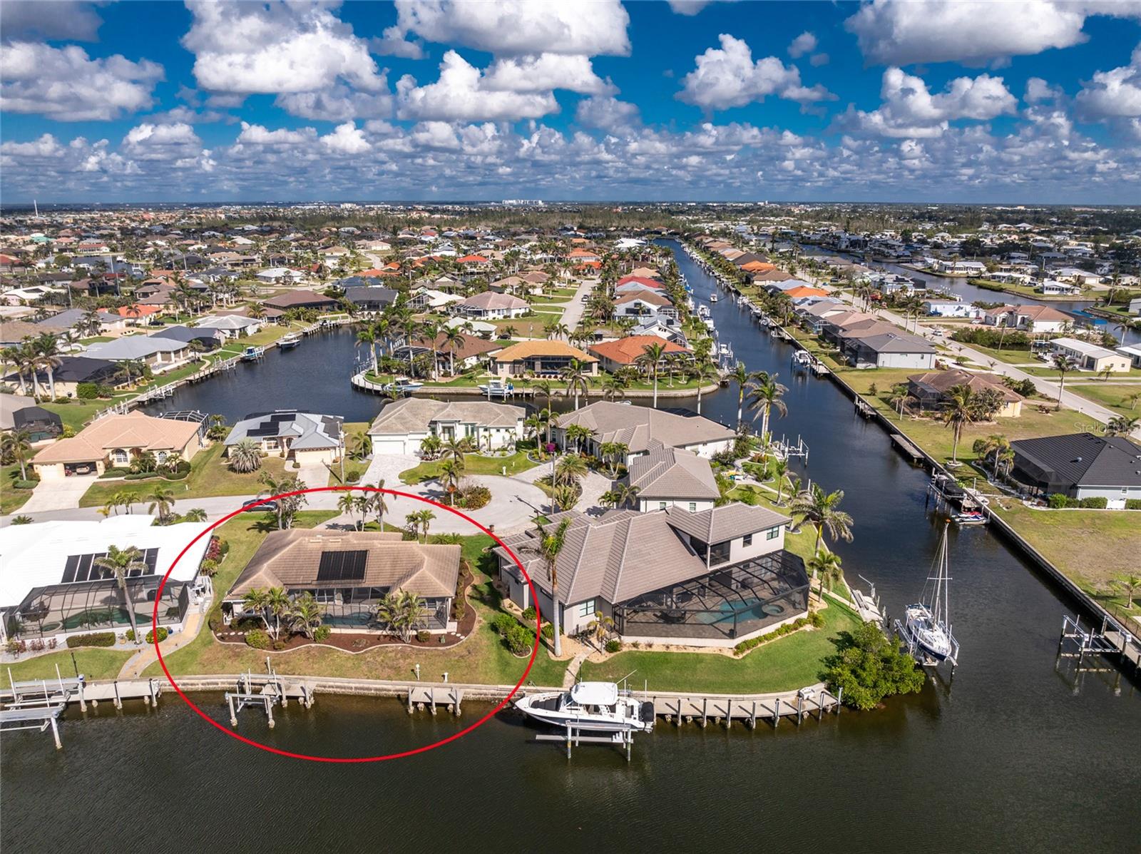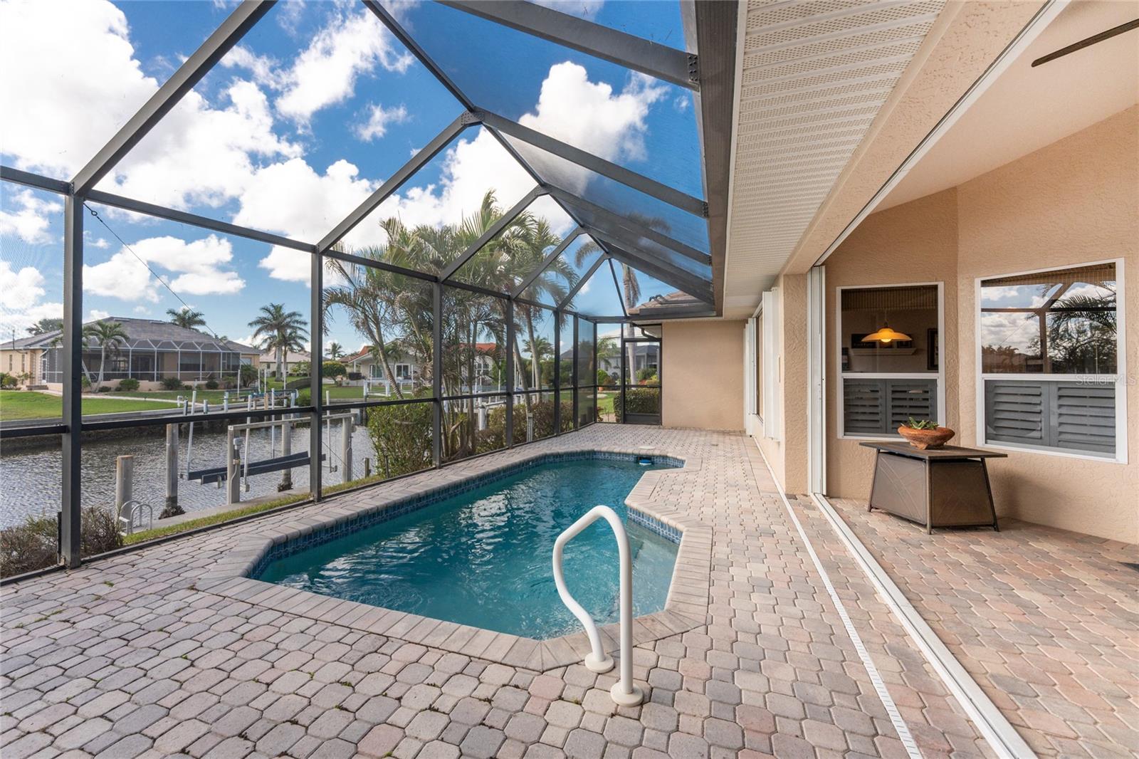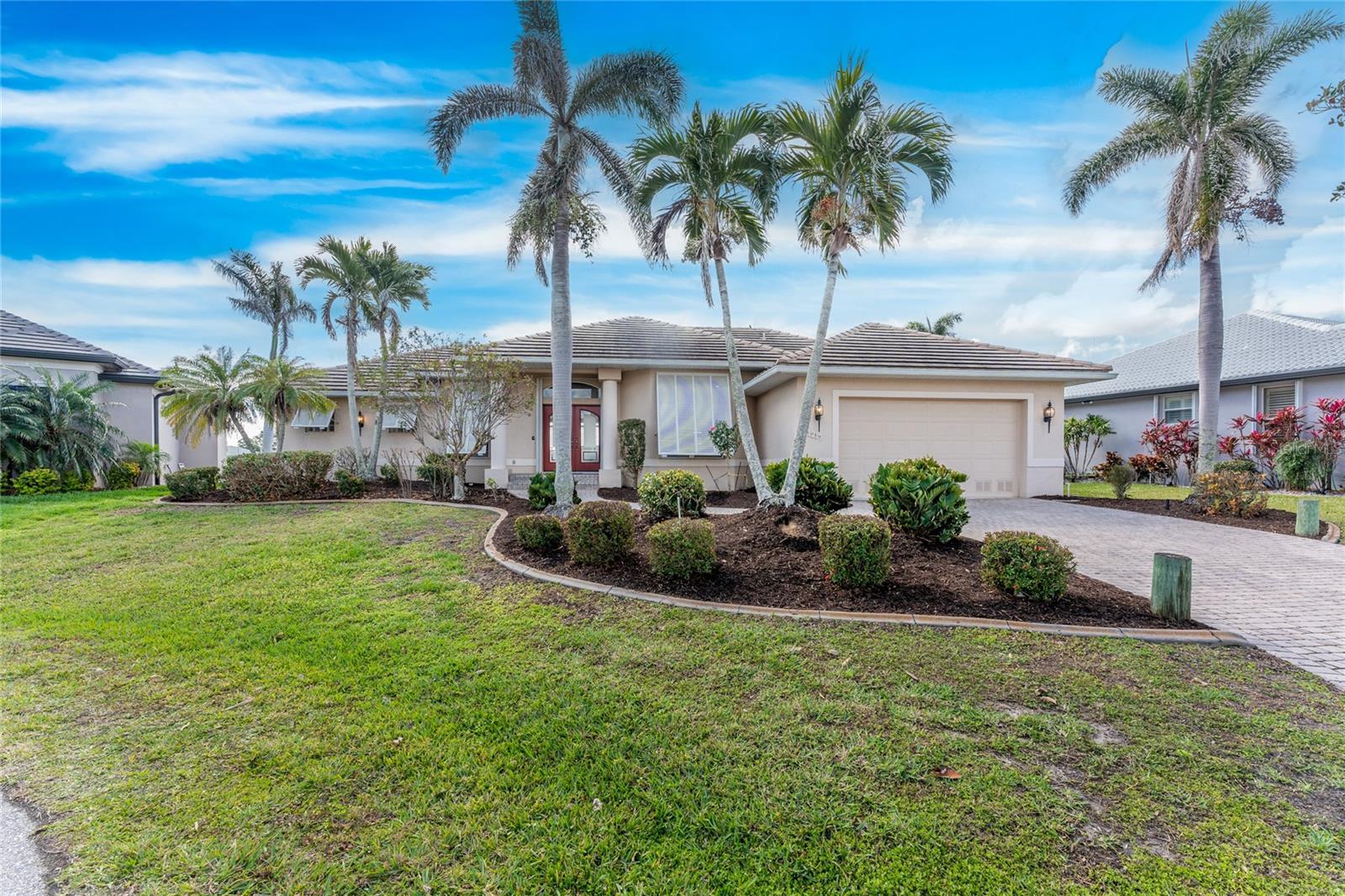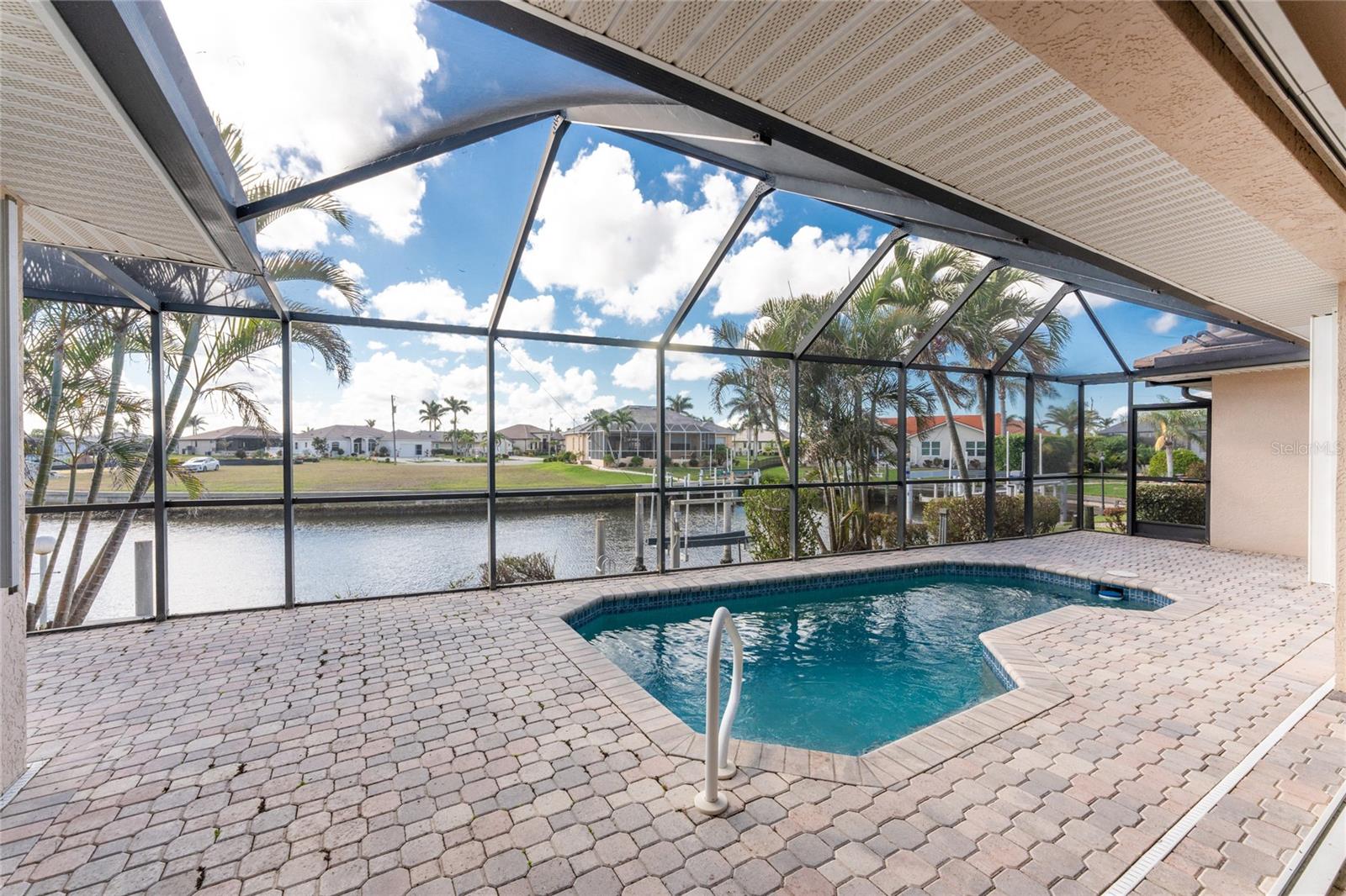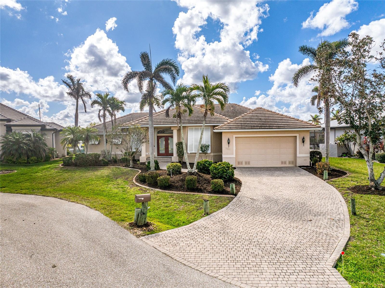 One or more photo(s) has been virtually staged. Elegant waterfront home in prestigious Punta Gorda Isles offers 95 FEET OF SALTWATER FRONT, City owned and maintained concrete seawall with dual docks and an electric boat lift, providing you quick SAILBOAT ACCESS (aka NO BRIDGES) to Charlotte Harbor. This custom-built 3-bedroom, 2-bath home, built by SandStar Custom Homes (now an Arthur Rutenberg Homes franchisee) sits on a QUIET CUL-DE-SAC surrounded by million-dollar properties. SOUTHERN EXPOSURE illuminates the SOLAR-HEATED POOL and an expansive lanai and pool area, all enhanced by premium brick pavers extending to the driveway and walkways. There's also FULL HURRICANE PROTECTION for the entire home. PER THE SELLER, THIS HOME HAS NEVER FLOODED. Interior features showcase meticulous attention to detail with TRAY CEILINGS, CROWN MOLDING, and designer touches including Bermuda exterior shutters and classic plantation shutters throughout. The upgraded kitchen boasts FINE WOOD CABINETRY and FABULOUS GRANITE COUNTERS. Recent improvements include a 2-year-old HVAC system and a 1-year-old water heater. This home also has an efficient Manabloc manifold plumbing system. This charming home should be on your short list. Call for an appointment to see this beautiful home today!