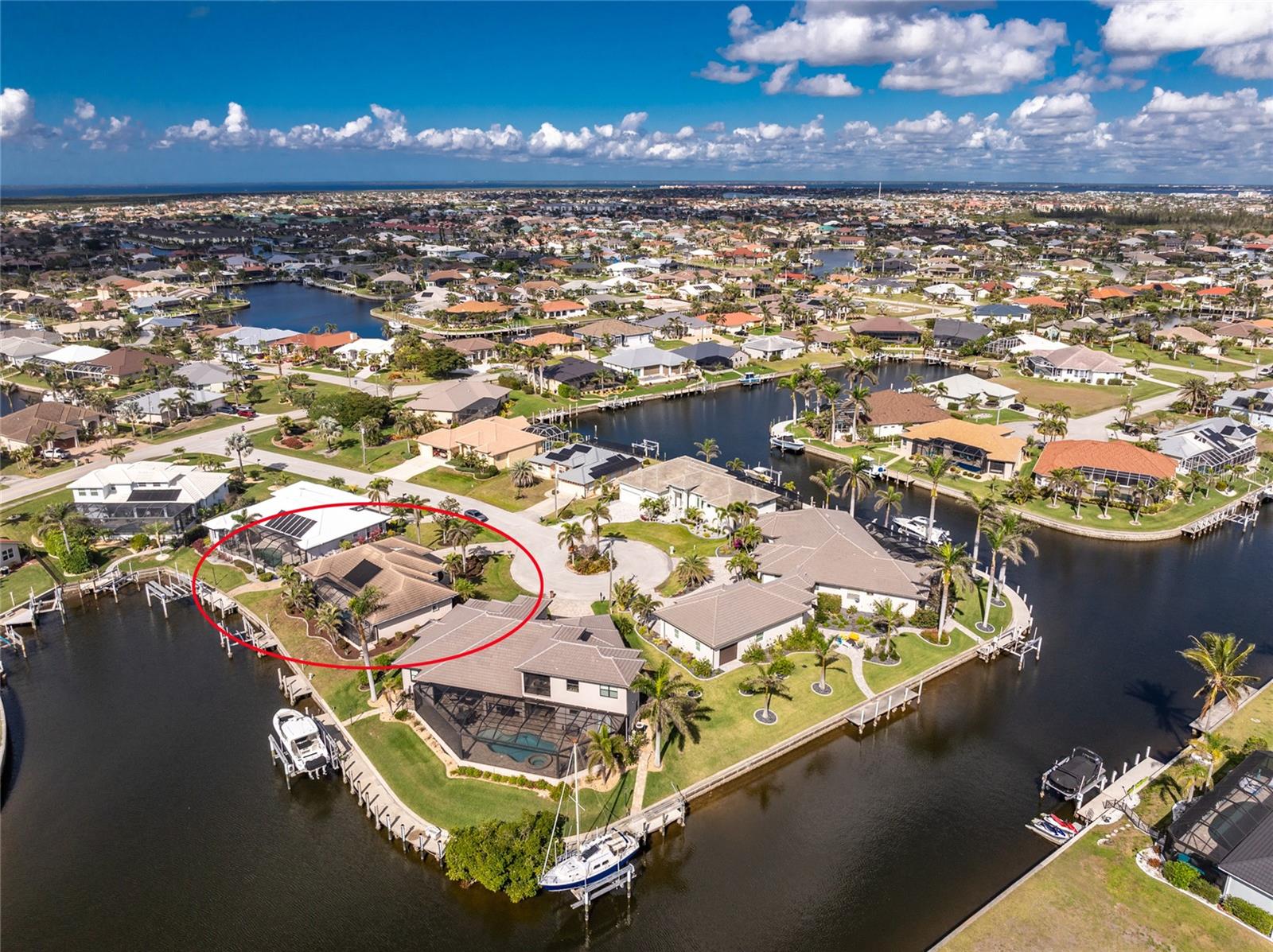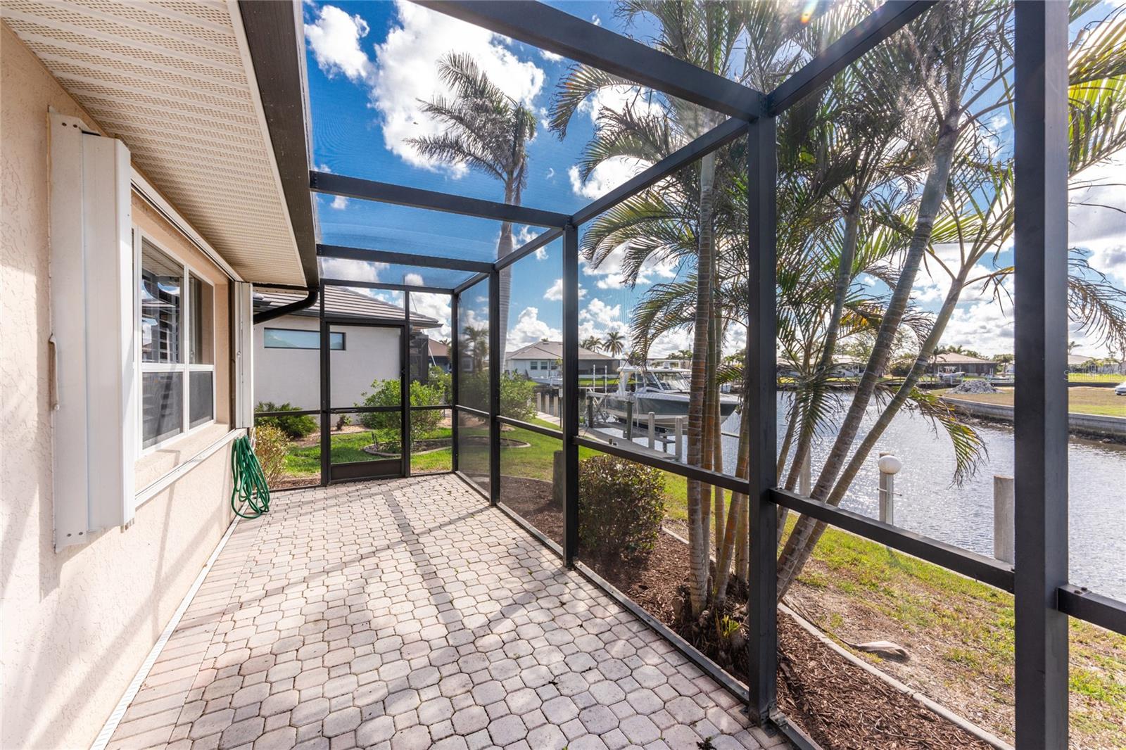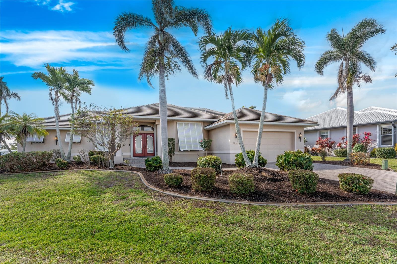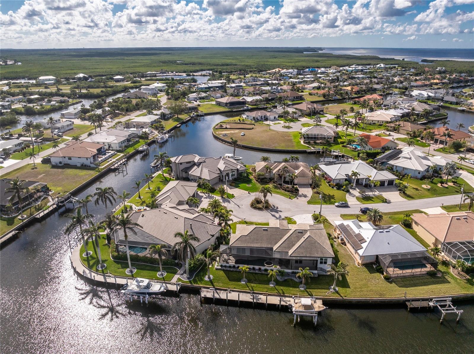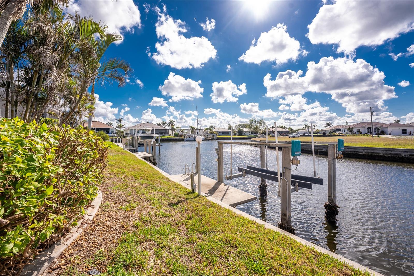 One or more photo(s) has been virtually staged. Elegant waterfront home in prestigious Punta Gorda Isles offers 95 FEET OF SALTWATER FRONT, City owned and maintained concrete seawall with dual docks and an electric boat lift, providing you quick SAILBOAT ACCESS (aka NO BRIDGES) to Charlotte Harbor. This custom-built 3-bedroom, 2-bath home, built by SandStar Custom Homes (now an Arthur Rutenberg Homes franchisee) sits on a QUIET CUL-DE-SAC surrounded by million-dollar properties. SOUTHERN EXPOSURE illuminates the SOLAR-HEATED POOL and an expansive lanai and pool area, all enhanced by premium brick pavers extending to the driveway and walkways. There's also FULL HURRICANE PROTECTION for the entire home. PER THE SELLER, THIS HOME HAS NEVER FLOODED. Interior features showcase meticulous attention to detail with TRAY CEILINGS, CROWN MOLDING, and designer touches including Bermuda exterior shutters and classic plantation shutters throughout. The upgraded kitchen boasts FINE WOOD CABINETRY and FABULOUS GRANITE COUNTERS. Recent improvements include a 2-year-old HVAC system and a 1-year-old water heater. This home also has an efficient Manabloc manifold plumbing system. This charming home should be on your short list. Call for an appointment to see this beautiful home today!