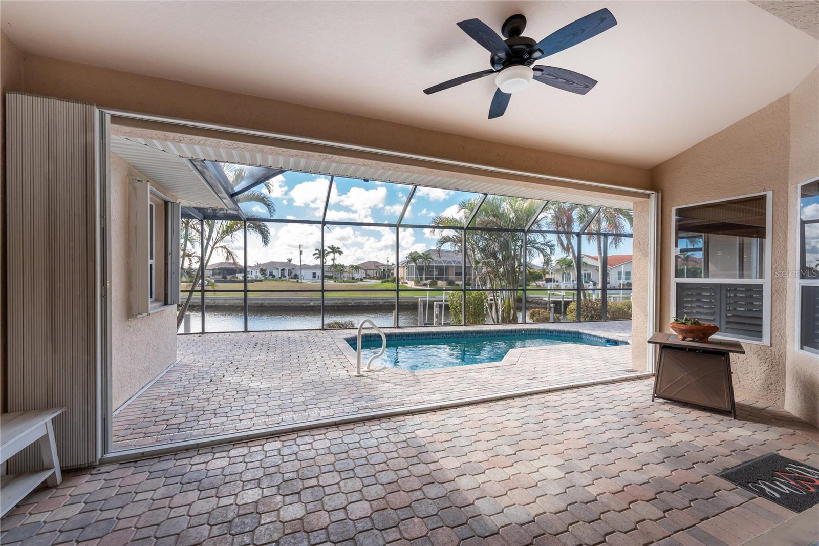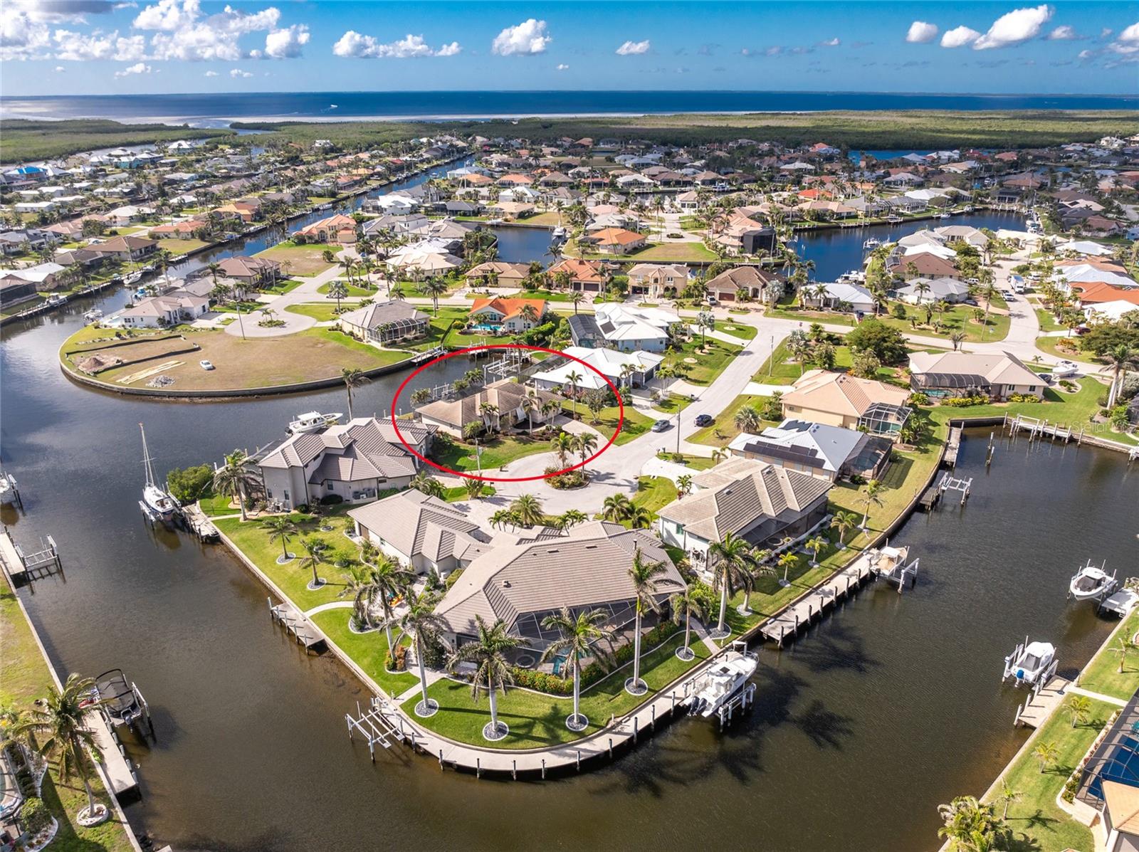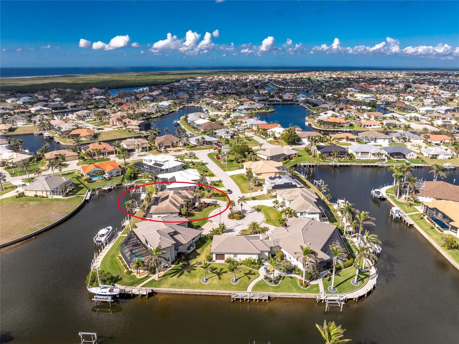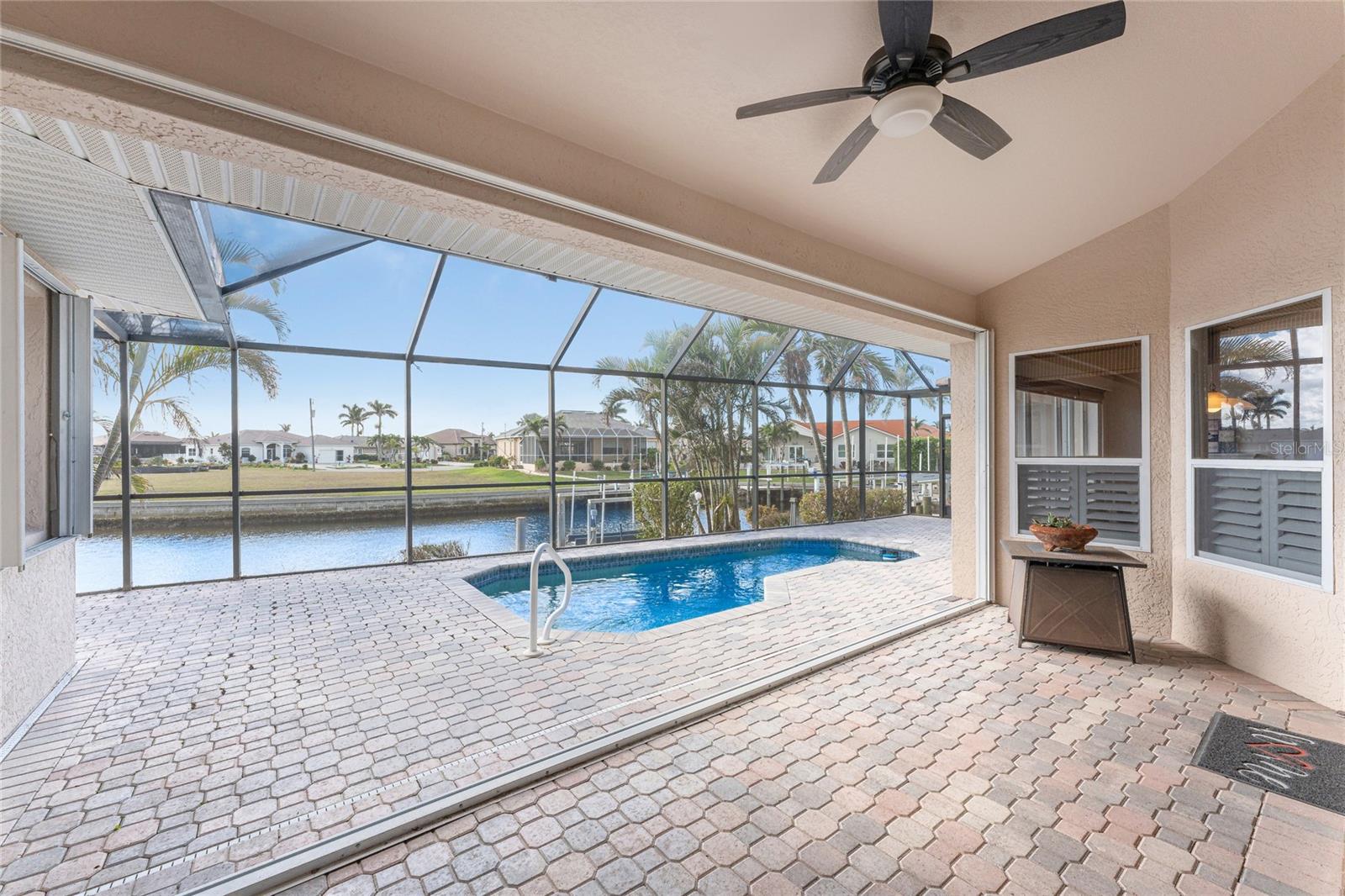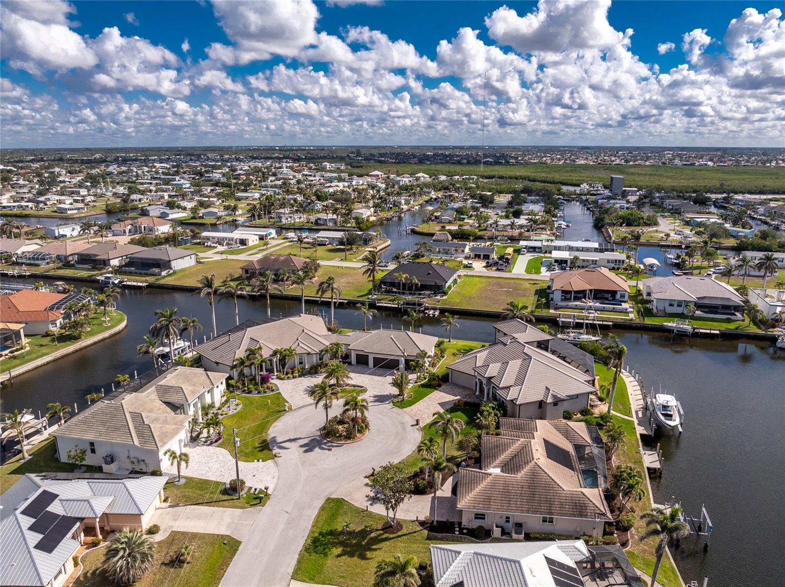 One or more photo(s) has been virtually staged. Elegant waterfront home in prestigious Punta Gorda Isles offers 95 FEET OF SALTWATER FRONT, City owned and maintained concrete seawall with dual docks and an electric boat lift, providing you quick SAILBOAT ACCESS (aka NO BRIDGES) to Charlotte Harbor. This custom-built 3-bedroom, 2-bath home, built by SandStar Custom Homes (now an Arthur Rutenberg Homes franchisee) sits on a QUIET CUL-DE-SAC surrounded by million-dollar properties. SOUTHERN EXPOSURE illuminates the SOLAR-HEATED POOL and an expansive lanai and pool area, all enhanced by premium brick pavers extending to the driveway and walkways. There's also FULL HURRICANE PROTECTION for the entire home. PER THE SELLER, THIS HOME HAS NEVER FLOODED. Interior features showcase meticulous attention to detail with TRAY CEILINGS, CROWN MOLDING, and designer touches including Bermuda exterior shutters and classic plantation shutters throughout. The upgraded kitchen boasts FINE WOOD CABINETRY and FABULOUS GRANITE COUNTERS. Recent improvements include a 2-year-old HVAC system and a 1-year-old water heater. This home also has an efficient Manabloc manifold plumbing system. This charming home should be on your short list. Call for an appointment to see this beautiful home today!
