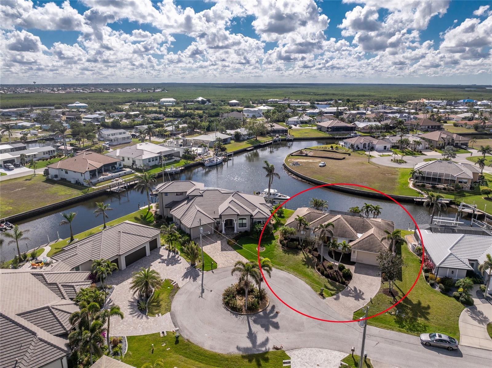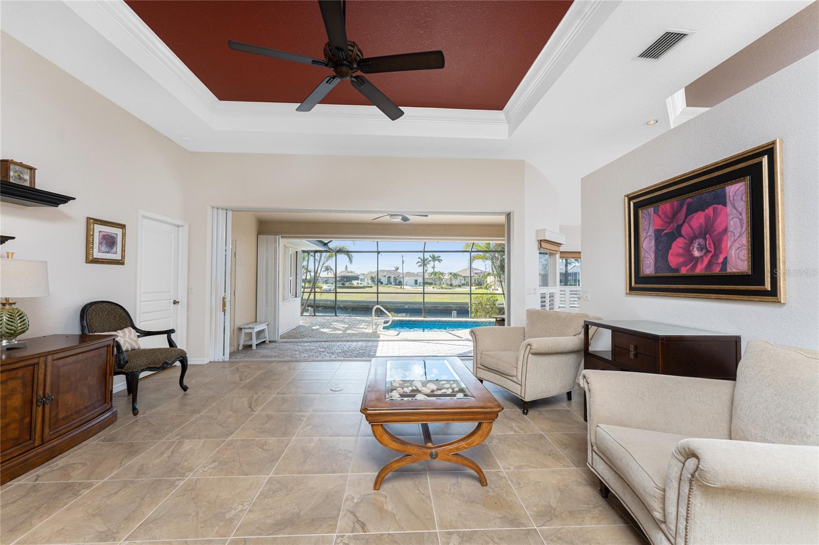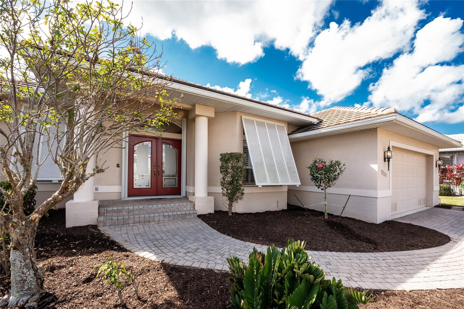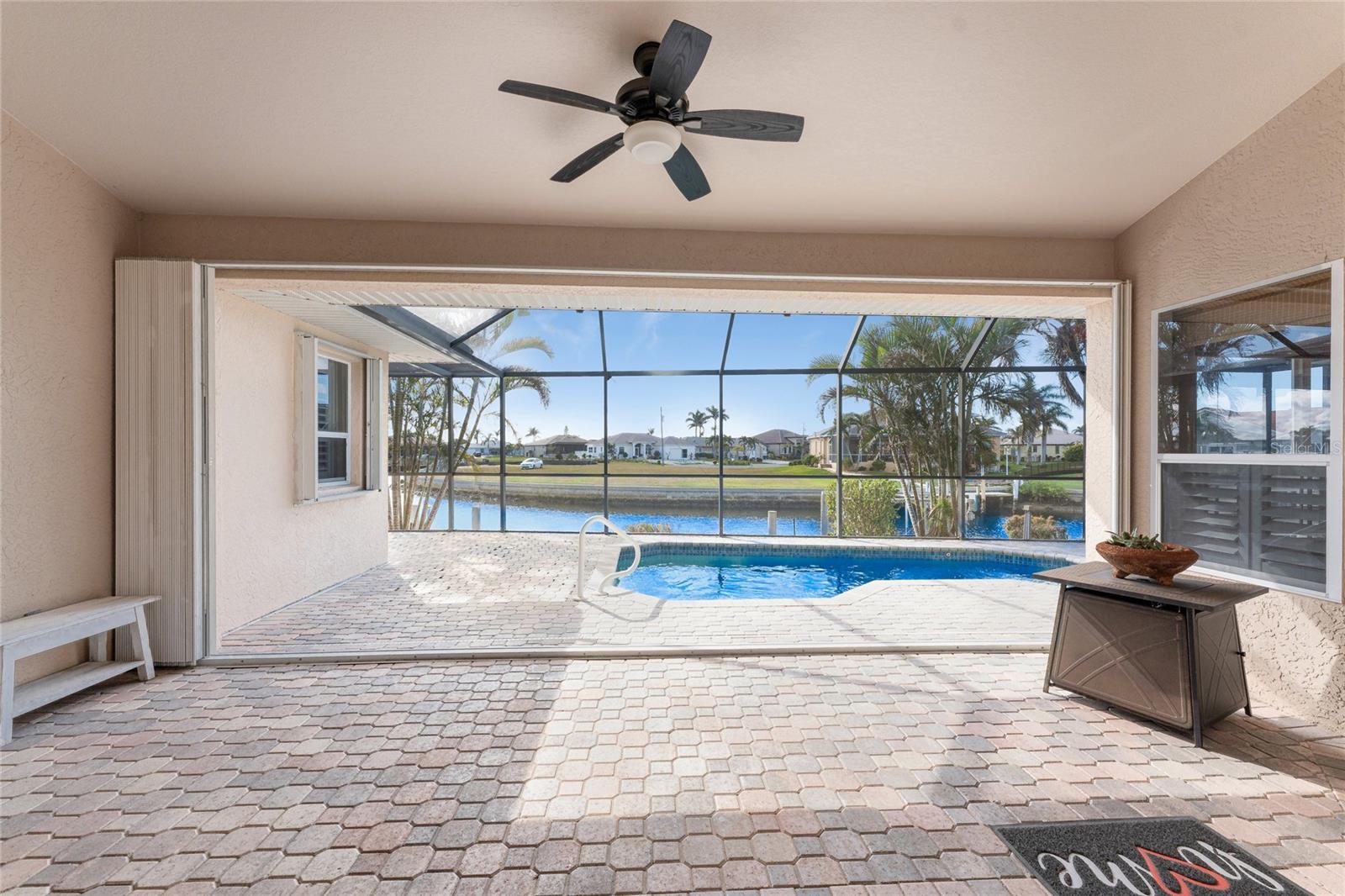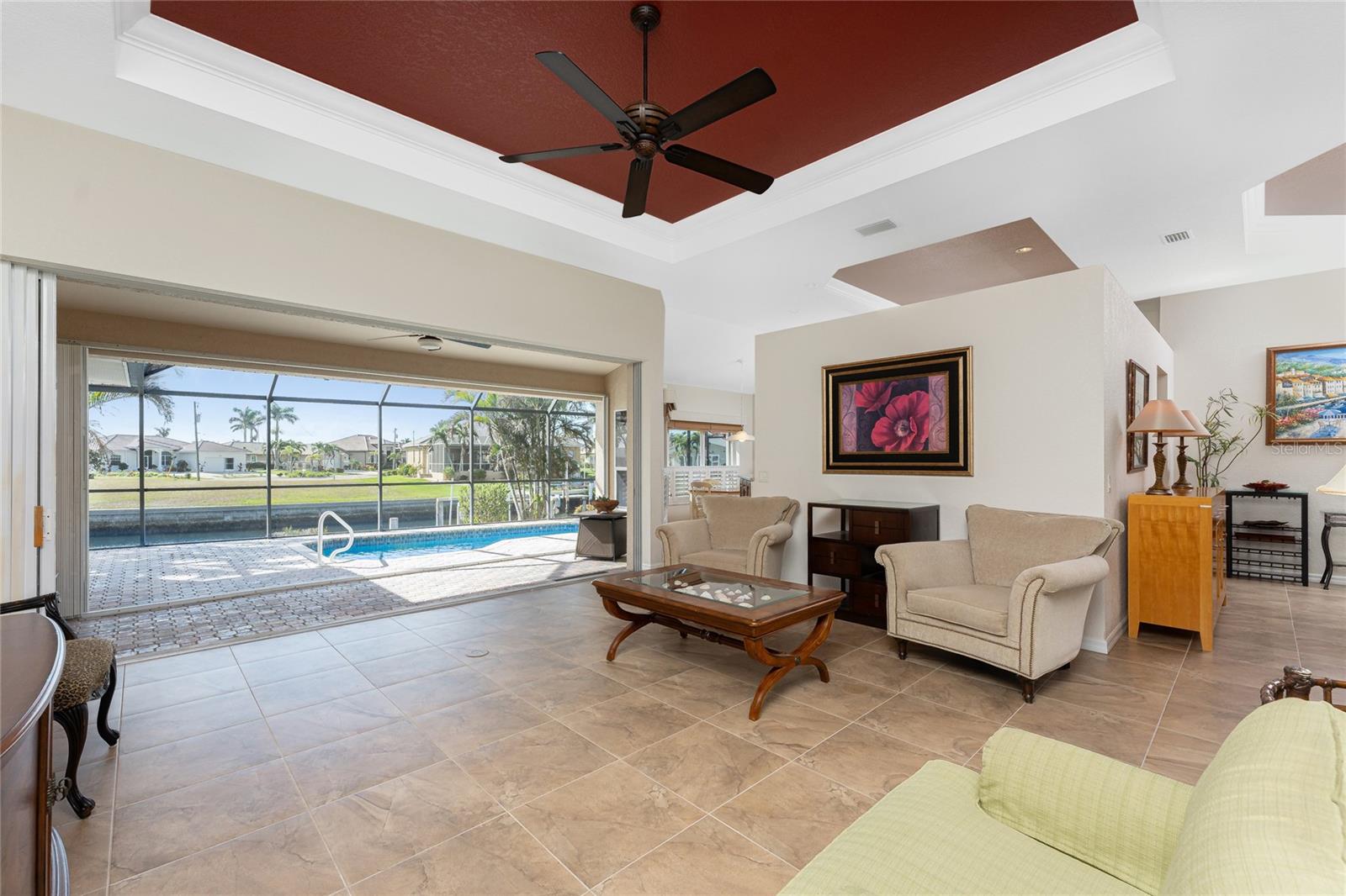 One or more photo(s) has been virtually staged. Elegant waterfront home in prestigious Punta Gorda Isles offers 95 FEET OF SALTWATER FRONT, City owned and maintained concrete seawall with dual docks and an electric boat lift, providing you quick SAILBOAT ACCESS (aka NO BRIDGES) to Charlotte Harbor. This custom-built 3-bedroom, 2-bath home, built by SandStar Custom Homes (now an Arthur Rutenberg Homes franchisee) sits on a QUIET CUL-DE-SAC surrounded by million-dollar properties. SOUTHERN EXPOSURE illuminates the SOLAR-HEATED POOL and an expansive lanai and pool area, all enhanced by premium brick pavers extending to the driveway and walkways. There's also FULL HURRICANE PROTECTION for the entire home. PER THE SELLER, THIS HOME HAS NEVER FLOODED. Interior features showcase meticulous attention to detail with TRAY CEILINGS, CROWN MOLDING, and designer touches including Bermuda exterior shutters and classic plantation shutters throughout. The upgraded kitchen boasts FINE WOOD CABINETRY and FABULOUS GRANITE COUNTERS. Recent improvements include a 2-year-old HVAC system and a 1-year-old water heater. This home also has an efficient Manabloc manifold plumbing system. This charming home should be on your short list. Call for an appointment to see this beautiful home today!