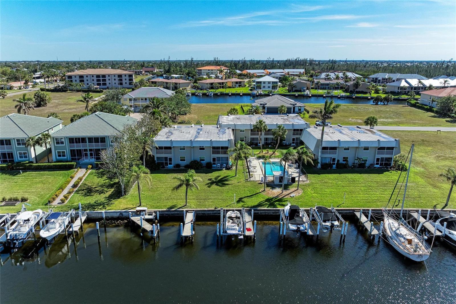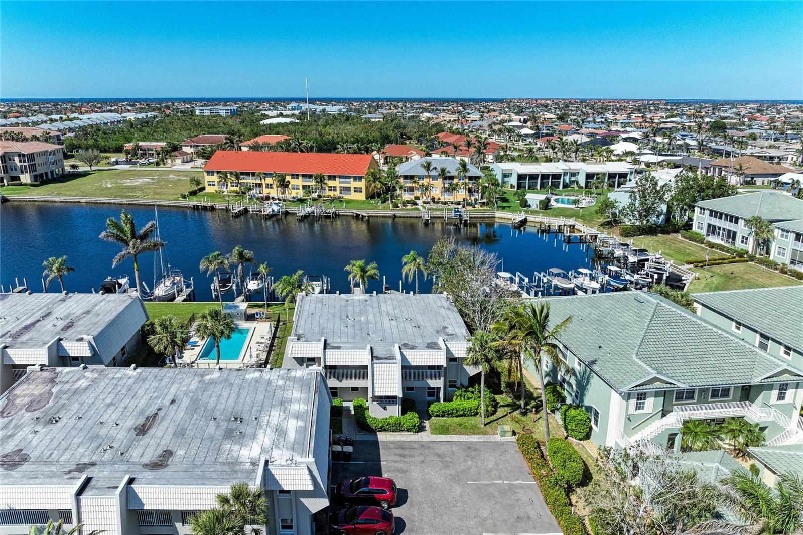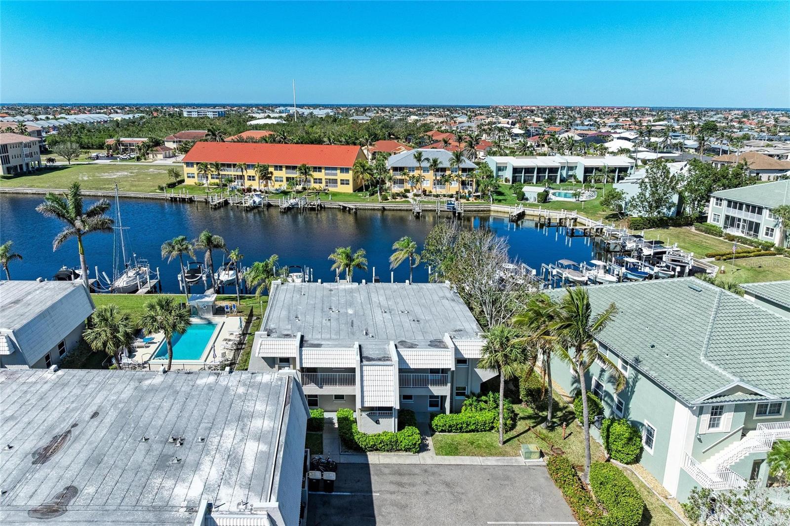 NEW PRICE! NO RISING WATER INTRUSION FROM ANY STORMS AT THIS COMMUNITY FOR ANY OF THE CONDOS. *High and dry 2nd floor location* Owner is MOTIVATED to sell this beautiful, AFFORDABLE condo in popular location! EXTRA WIDE SALTWATER CANAL frontage with *ASSIGNED BOAT DOCK* IN YOUR BACKYARD 60 FEET from your condo with NO BRIDGES and SAILBOAT FRIENDLY WATERS! This top floor, END UNIT boasts a private screened lanai overlooking the serene waterfront perfect for enjoying evening SUNSETS with a rear Western exposure! NEW IMPACT GLASS WINDOWS for your peace of mind! Walk right up to this 2 bedroom, 2 bath TOP FLOOR condo that offers open concept living. Benefit from the warm wood look flooring in the main living space and bedrooms that is easy to clean and maintain! There is all hard flooring throughout this property (no carpet). The kitchen offers neutral cabinetry, tile flooring and matching appliances! The primary bedroom has sliding glass doors to the lanai and an en-suite bathroom + HUGE WALK IN CLOSET. Your guest bedroom has a ceiling fan and wall closet for added storage space! The guest bathroom has a vanity, solid surface countertops and a combination tub/shower. BRAND NEW STACKABLE WASHER/DRYER in laundry closet. There is also a BRAND NEW HOT WATER HEATER, new smoke detectors and your A/C system was just serviced and cleaned! Additionally there is a KINETICO WHOLE HOME WATER SYSTEM that conveys with the purchase of the condo. Relax on the screened lanai with sunshades and watch the boats go by or go for a swim in the COMMUNITY POOL! You are allowed to put in a BOAT LIFT if you desire. Laporta Boca is a smaller waterfront community nestled in Punta Gorda Isles WITH AFFORDABLE HOA fees that includes exterior building maintenance, lawn mowing/landscaping, pool maintenance, water and sewer and more! Punta Gorda features miles of bike paths along the Charlotte Harbor, unique shops & dining, weekend Farmer's markets and many outdoor festivals! This Southwest Florida location is ideal for year-round enjoyment of boating, fishing, golfing, Several Gulf beaches (reachable in under 1 hour), fine and casual dining, parks, public tennis courts and shopping. Allegiant Airport is located 5 miles away with tons of flights to many destinations in the US! Fisherman's Village and Historic Downtown Punta Gorda are just over 2 miles away! Call today for a private showing!