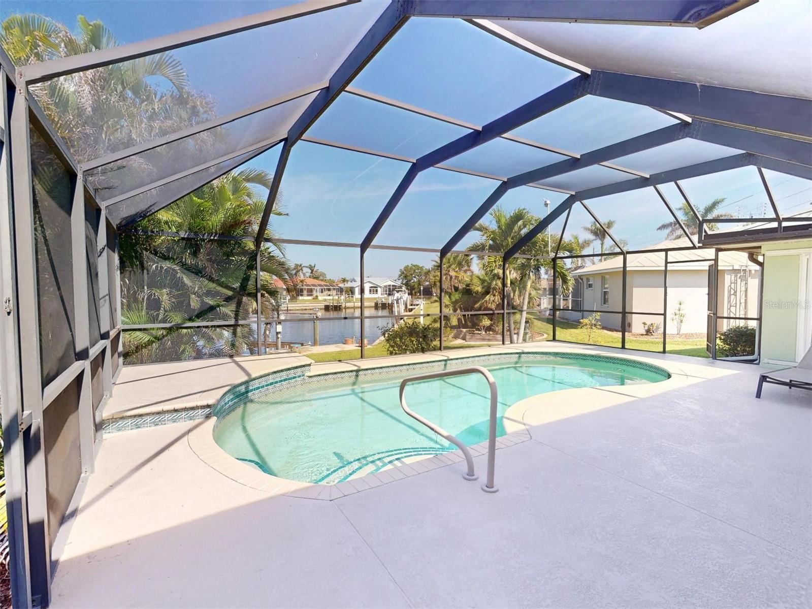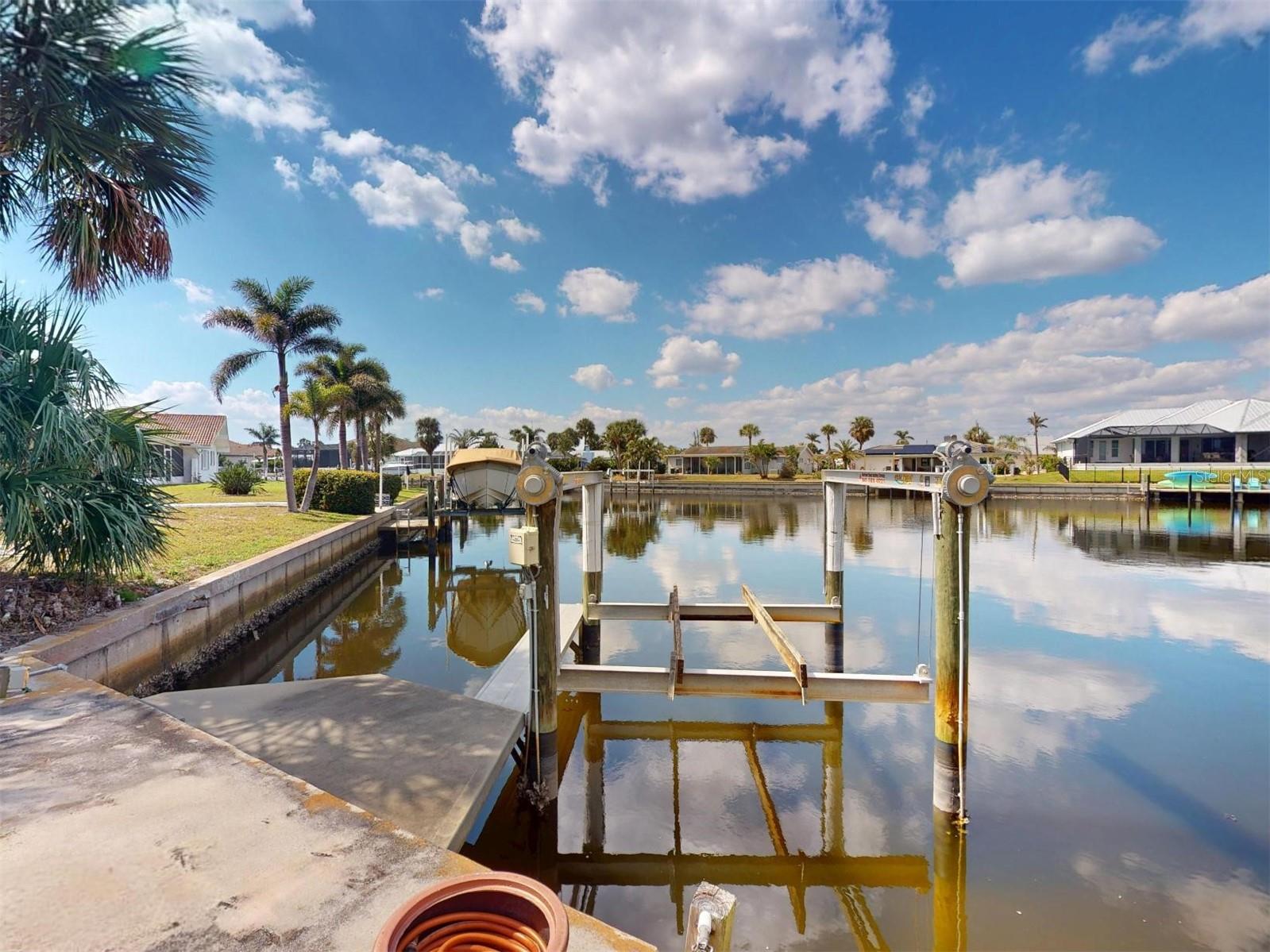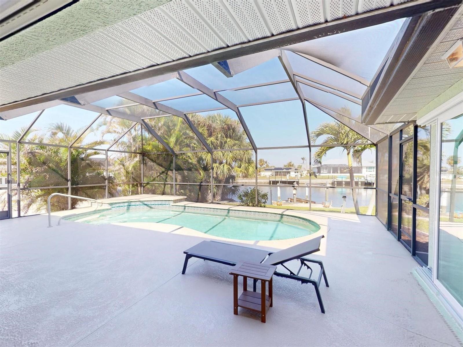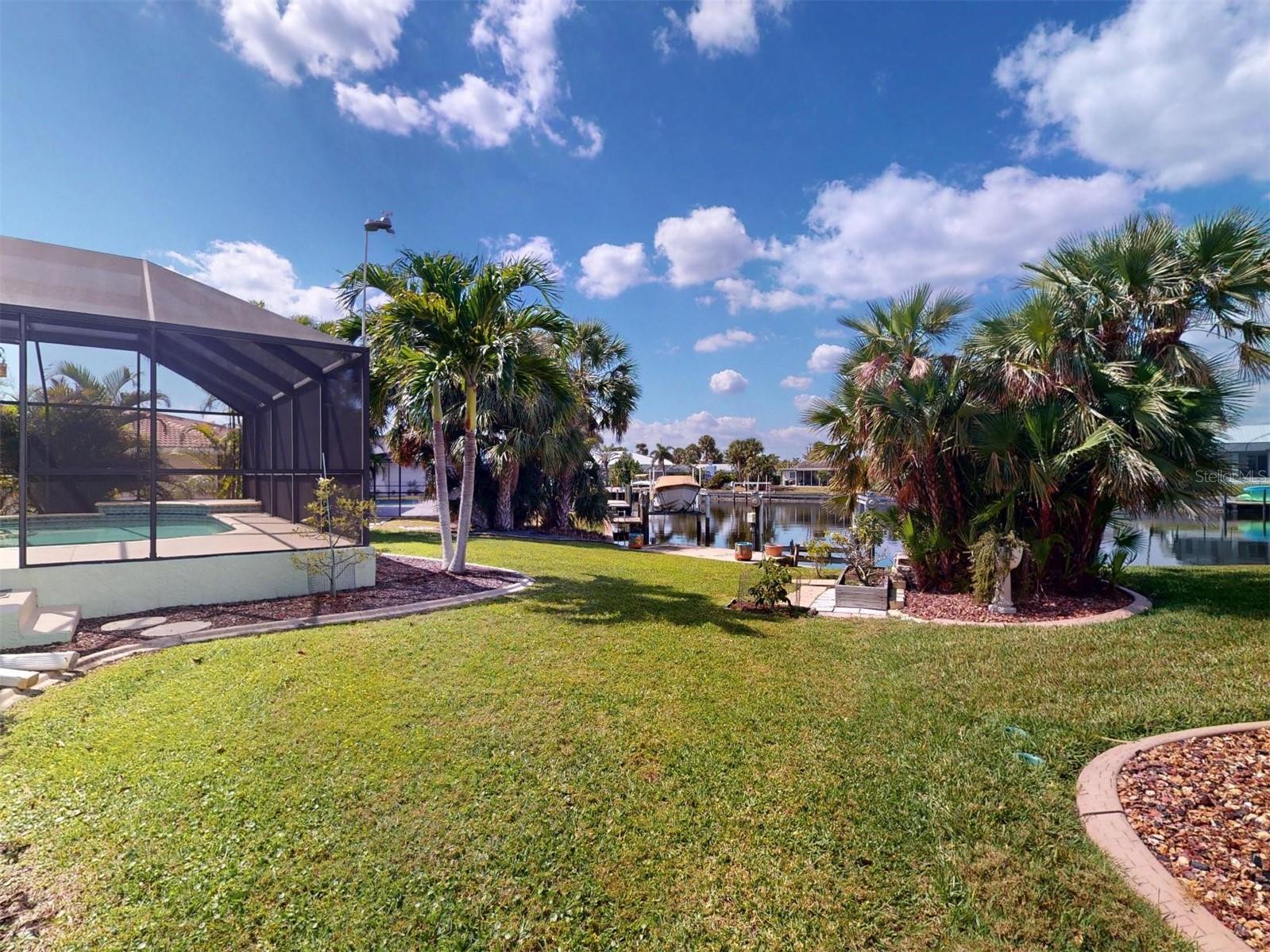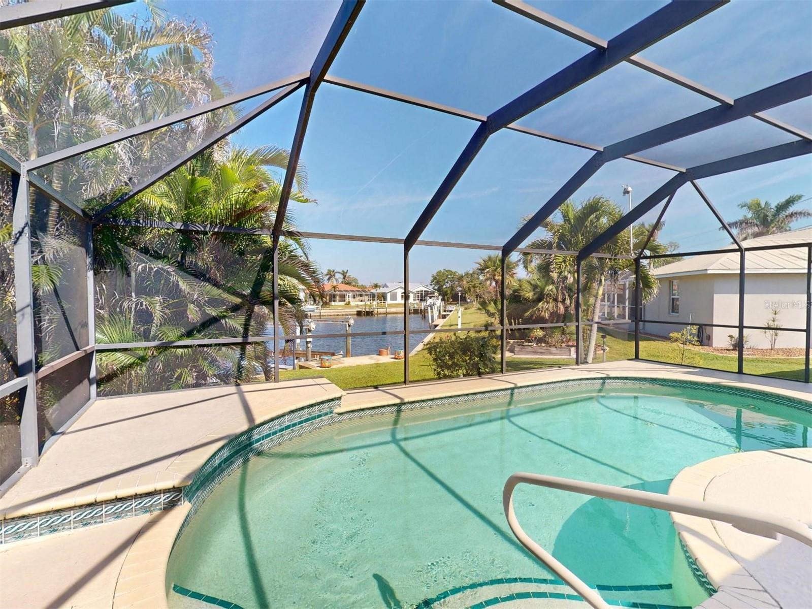 Above and beyond….the extras in this stunning 3 car garage, waterfront pool home add up! The view of the lagoon is by far one of the best features-the view is expansive and sunsets dramatic! The dock and lift are situated to provide an easy access and turn around for an extremely quick ride by boat to open water! The sellers have had to relocate for personal reasons and encourage you to present them an offer so you can love this setting as much as they did. The open and bright rooms surround the heart of the home in the kitchen family room combo with dramatic granite countertop that compliments the wood cabinetry. A bank of cabinetry with pull out shelves gives you easy access to pantry items. The six burner GAS cooktop, wall oven and built in microwave along with warming drawer make this a chefs delight…all while taking in the view of the pool and lagoon. The dining nook makes a cozy place for coffee or meals while dolphin watching. Both the master bath and guest bath are done in unique and dramatic finishes to give a spa like feel. The master suite is a retreat from the world while still taking in the calm water view. Outdoors you can entertain with ample space for guests and sunbathing along with the piped in gas grill and built in stainless sink for grilling or cleaning the days catch! The landscaping is impeccable- desert rose and foxtail palms keep the tropical vibe going all through the yard. The concrete dock and drop down step on station lead to the new lift with additional shore power hook up.. AND THERE IS MORE…metal roof (2023)IMPACT RESISTANT windows (2017) and remote control roll down shutters for protection, central vacuum system, whole home water system by Pelican, irrigation system and alarm system, HVAC new in 2020…could you ask for more? This is a quick ride to open water- less than 15 minutes and you are enjoying our fabulous Charlotte Harbor- leading to the gulf and all points SW Florida has to offer. BE SURE TO CLICK ON THE VIRTUAL TOUR TO TAKE A WALK THROUGH YOUR NEXT HOME!