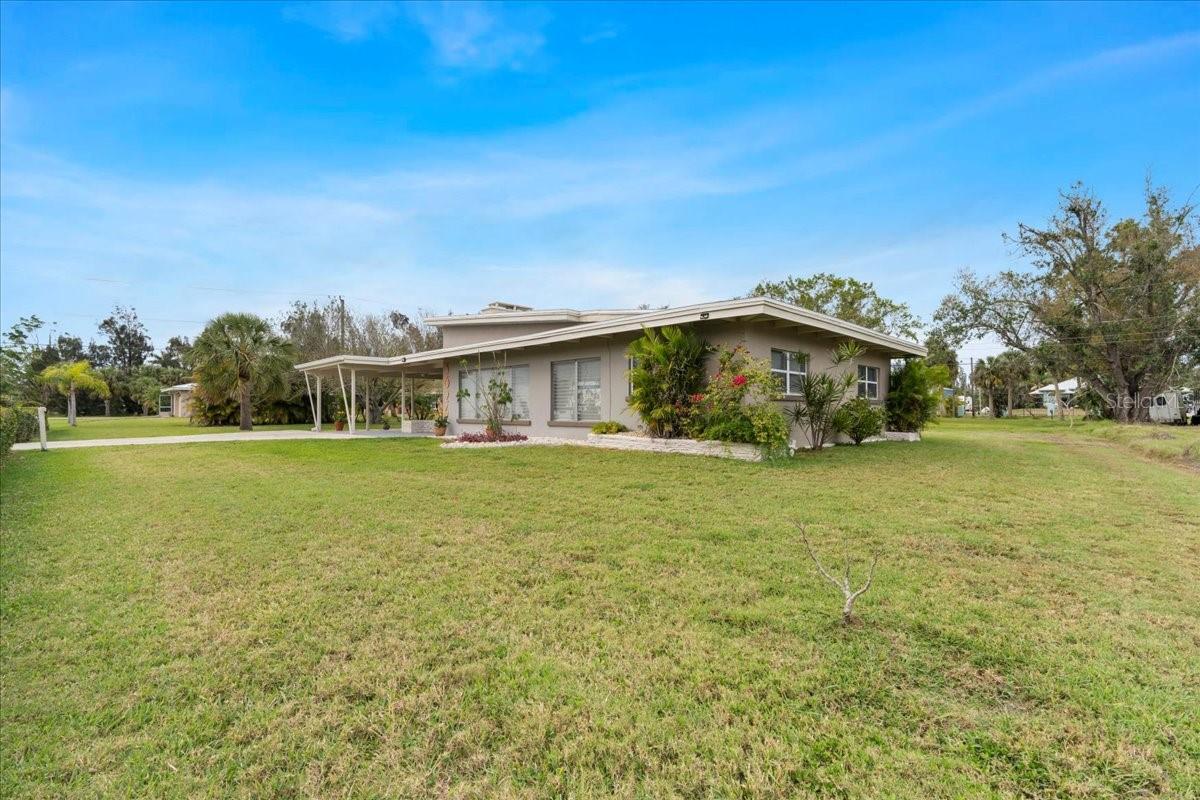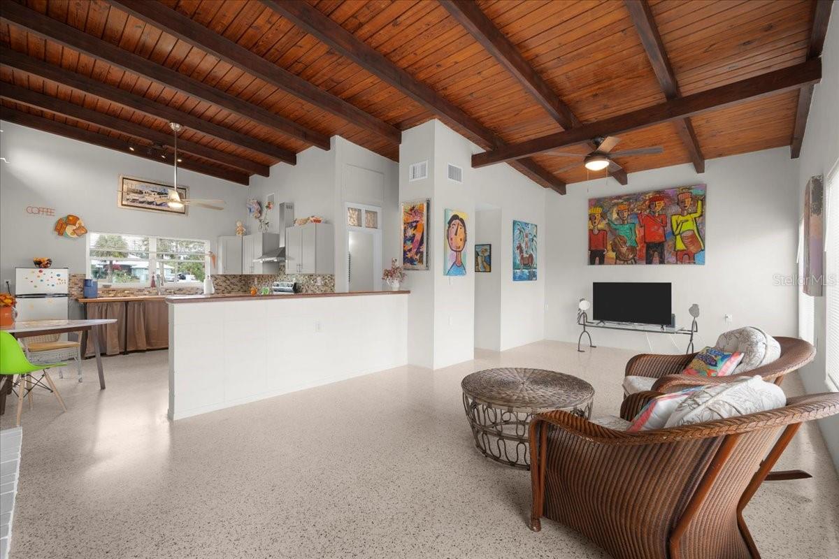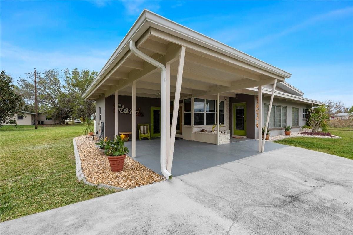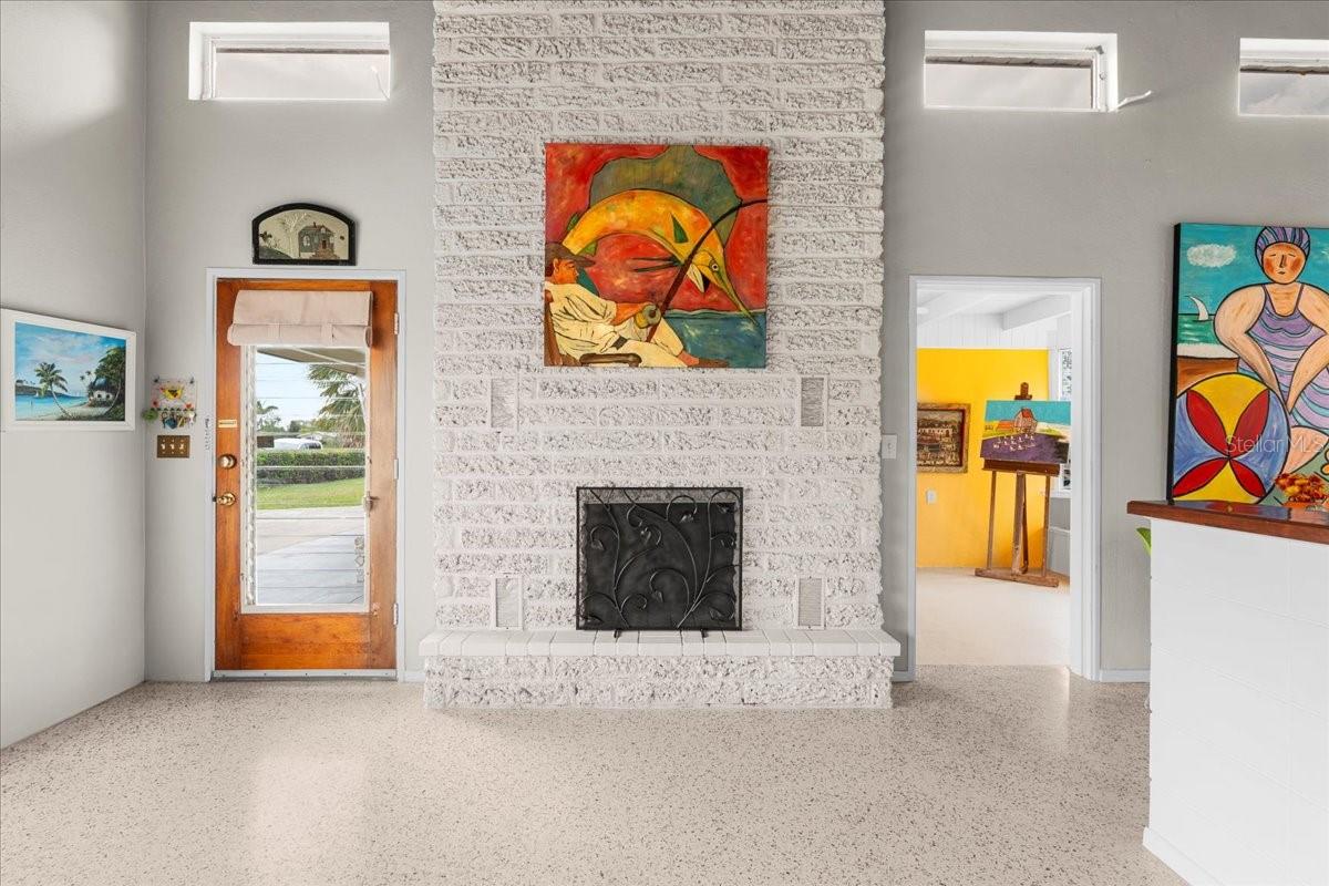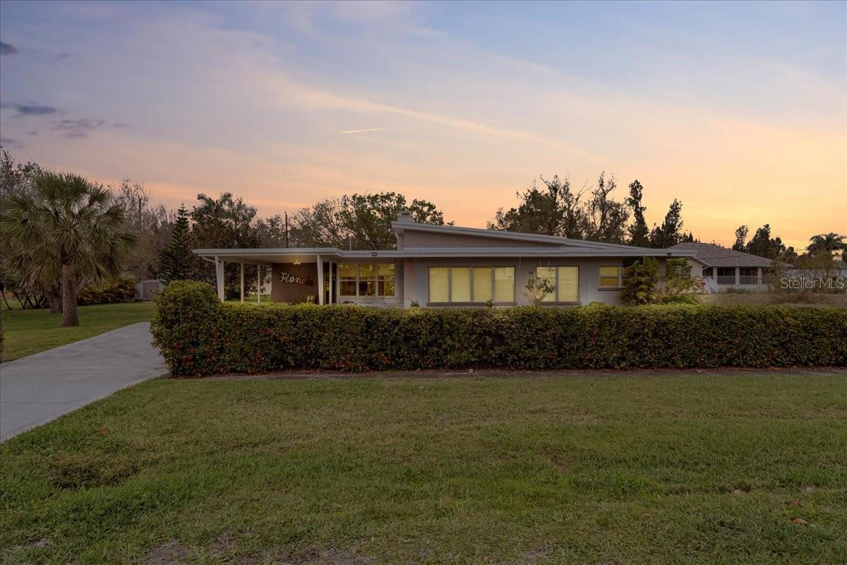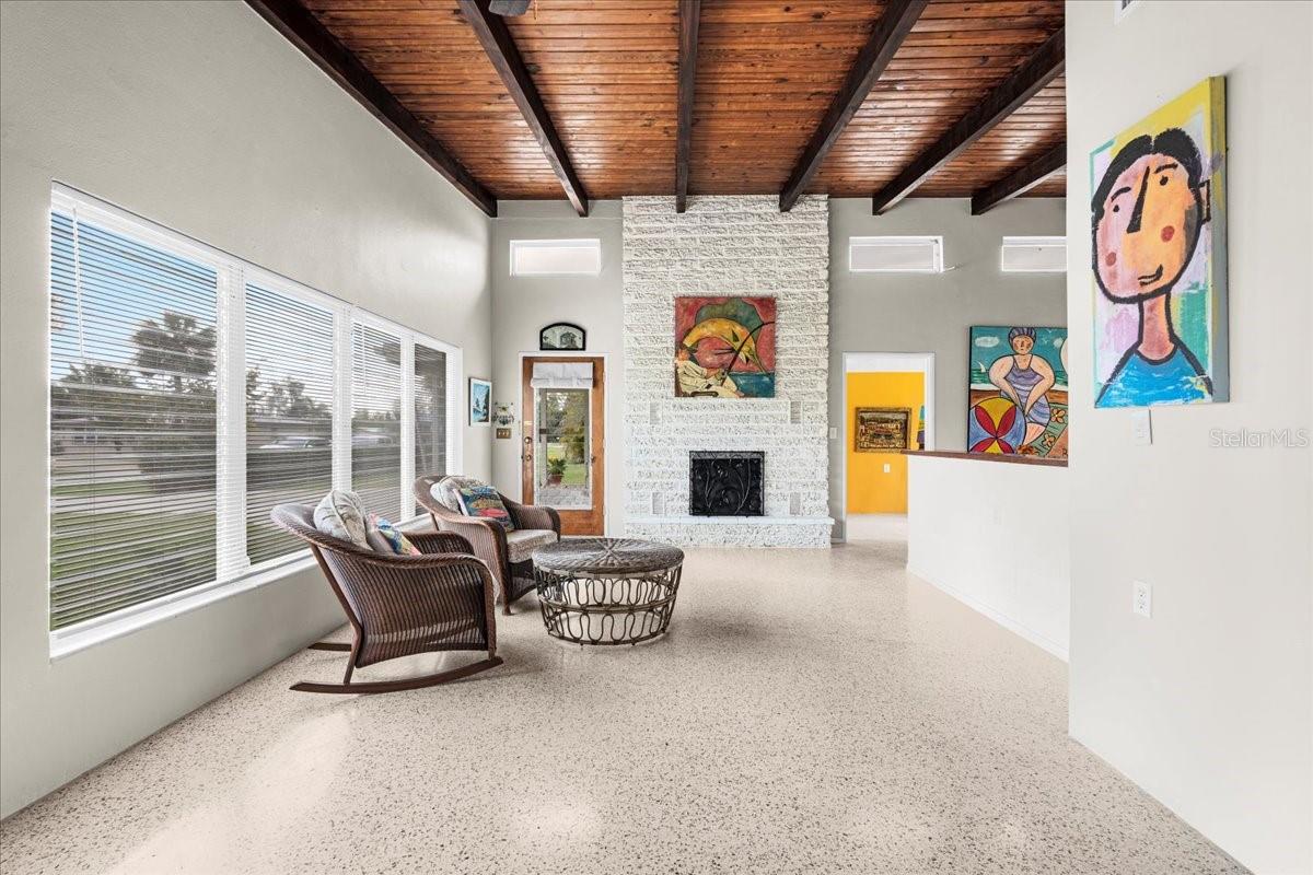 Welcome to this stunning MID-CENTURY modern BLOCK home, a true architectural gem nestled on a spacious DOUBLE LOT only moments from downtown Punta Gorda! Custom-built in the 1950s, this unique home seamlessly blends vintage charm with modern updates, creating a space that is both stylish and functional. Thoughtfully designed, it features beautiful TERRAZZO flooring throughout, striking 16' high wood inlay accent ceilings and transom windows that flood the open-concept interior with natural light. At the heart of the living area, a one-of-a-kind custom made wood burning fireplace adds warmth and character, making it the perfect space to relax or entertain. The beautifully updated kitchen is everything you really need, boasting BUTCHER BLOCK countertops, soft-close solid wood cabinets, a seamless tile backsplash, and a brand-new stainless steel stove with vented hood! Adjacent to the kitchen and living area, a versatile BONUS room offers the perfect spot for an art studio, crafting room, or even a cozy reading nook. The primary suite and additional bedroom feature wood ceilings that scream Florida charm. The primary bathroom has been updated with a stunning tiled walk-in shower, with a niche and sliding glass door. All your storage needs are met with numerous hallway storage closets and a dedicated laundry room off your carport with built-in storage shelfing and washer/dryer hookups add to the home’s practicality. Significant updates provide peace of mind, including a NEW ROOF (2022), new ELECTRICAL panel (2020), brand-new NEW A/C and HOT WATER HEATER, and many updated windows throughout the home. Outside, you'll notice the beautifully landscaped rocked beds, lined with concrete curbing and perfectly pruned front hedges, frame the thoughtfully planted Florida landscaping, enhancing its curb appeal. The private backyard, provides a plethora of room for activities, complimented with a paver LANAI & privacy fence, creating a tranquil escape for morning coffee or ideal for grilling out! Ideally located, this home is just minutes from downtown Punta Gorda, where you can explore waterfront dining, boutique shopping, and lively events at Laishley Park. Just down the street, the Darst Park Boat Ramp located only walking distance away, offers easy access to the Peace River and intercoastal waters for boating, kayaking, and fishing. Nature lovers will appreciate being near the beautiful Punta Gorda Botanical Gardens, a serene spot perfect for a peaceful stroll among lush Florida flora. For a true local favorite, Peace River Seafood is just around the corner, serving up the freshest blue crab and seafood in a laid-back, authentic Florida atmosphere. With quick access to I-75, commuting is a breeze while still enjoying the charm of this vibrant community. With its unique architectural details, thoughtful upgrades, and unbeatable location, this mid-century modern masterpiece is truly one of a kind. Schedule your showing today and experience its charm firsthand!