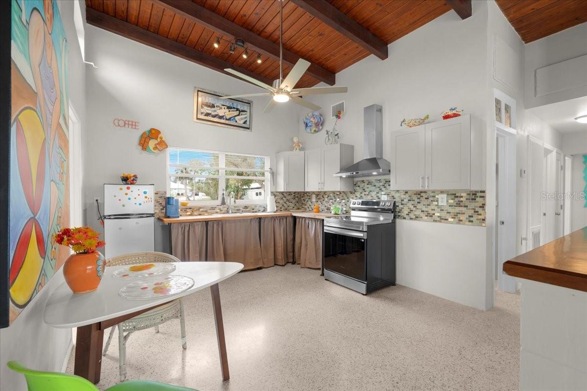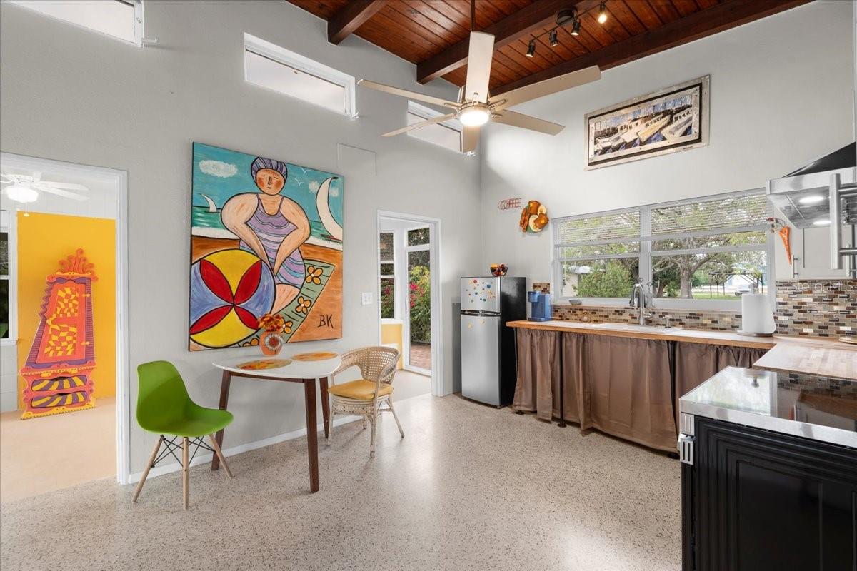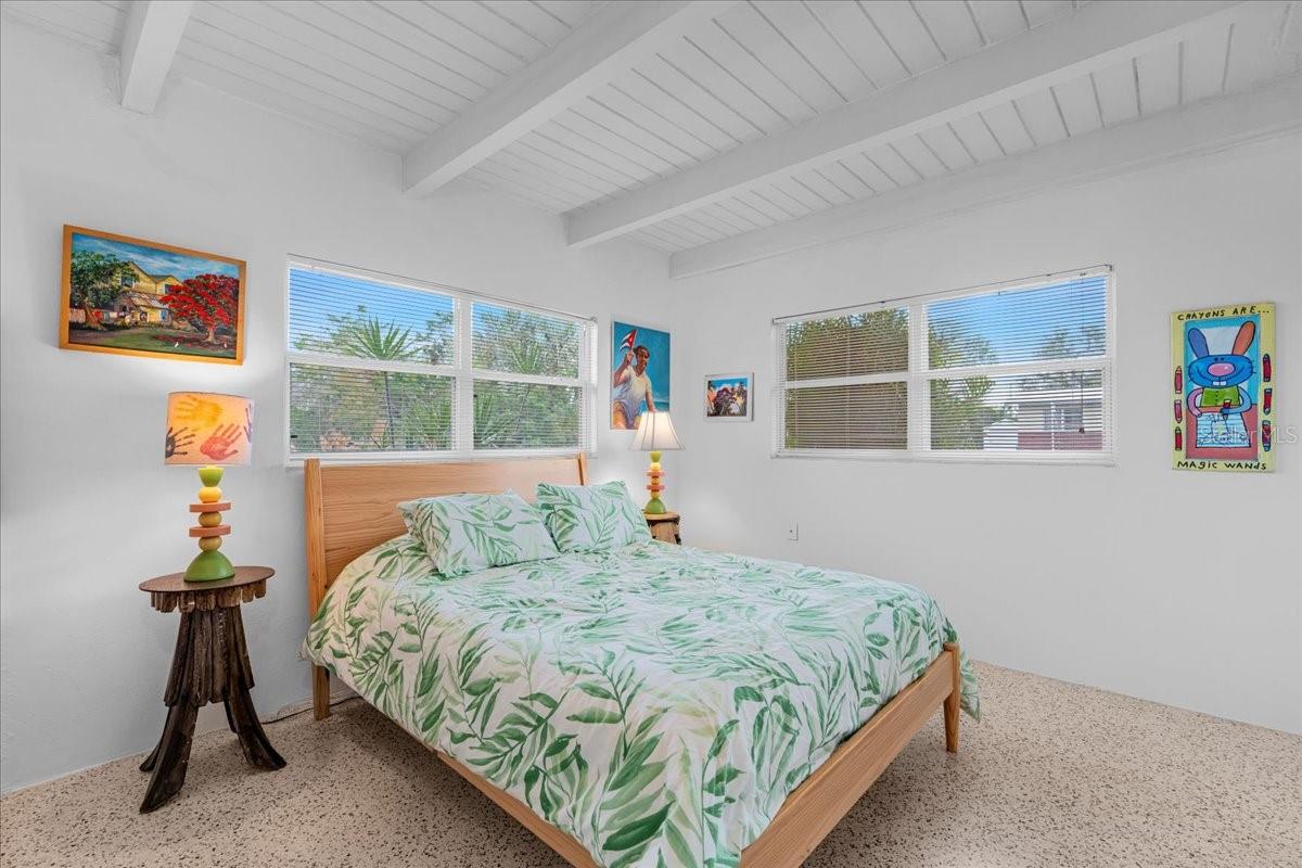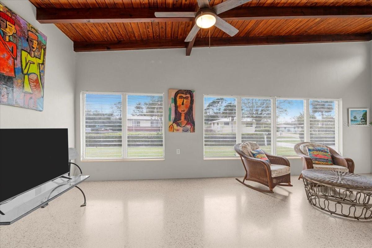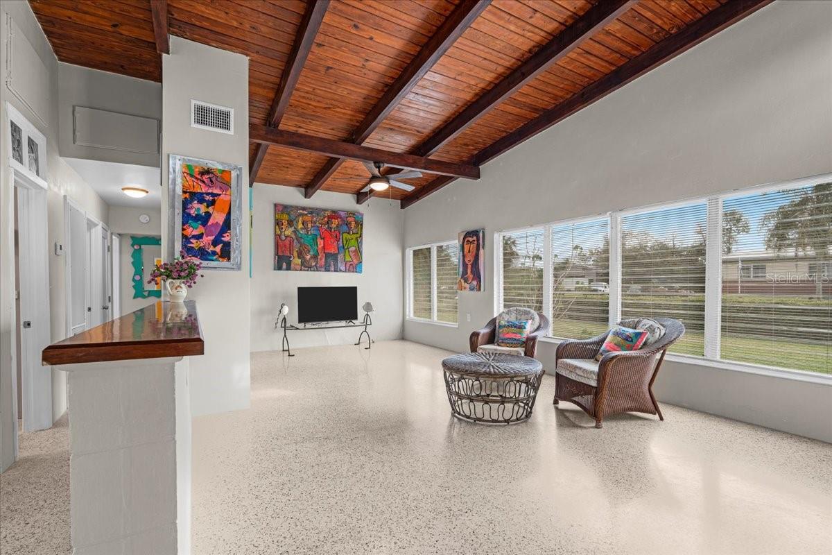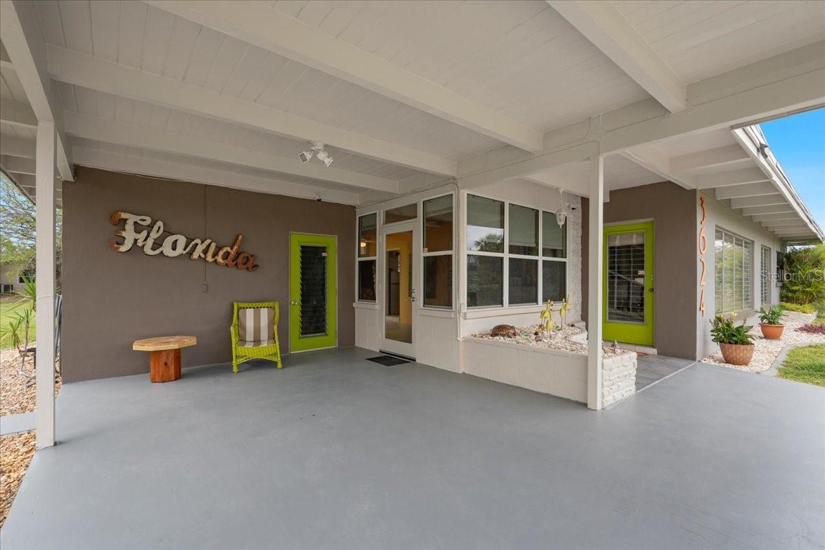 Welcome to this stunning MID-CENTURY modern BLOCK home, a true architectural gem nestled on a spacious DOUBLE LOT only moments from downtown Punta Gorda! Custom-built in the 1950s, this unique home seamlessly blends vintage charm with modern updates, creating a space that is both stylish and functional. Thoughtfully designed, it features beautiful TERRAZZO flooring throughout, striking 16' high wood inlay accent ceilings and transom windows that flood the open-concept interior with natural light. At the heart of the living area, a one-of-a-kind custom made wood burning fireplace adds warmth and character, making it the perfect space to relax or entertain. The beautifully updated kitchen is everything you really need, boasting BUTCHER BLOCK countertops, soft-close solid wood cabinets, a seamless tile backsplash, and a brand-new stainless steel stove with vented hood! Adjacent to the kitchen and living area, a versatile BONUS room offers the perfect spot for an art studio, crafting room, or even a cozy reading nook. The primary suite and additional bedroom feature wood ceilings that scream Florida charm. The primary bathroom has been updated with a stunning tiled walk-in shower, with a niche and sliding glass door. All your storage needs are met with numerous hallway storage closets and a dedicated laundry room off your carport with built-in storage shelfing and washer/dryer hookups add to the home’s practicality. Significant updates provide peace of mind, including a NEW ROOF (2022), new ELECTRICAL panel (2020), brand-new NEW A/C and HOT WATER HEATER, and many updated windows throughout the home. Outside, you'll notice the beautifully landscaped rocked beds, lined with concrete curbing and perfectly pruned front hedges, frame the thoughtfully planted Florida landscaping, enhancing its curb appeal. The private backyard, provides a plethora of room for activities, complimented with a paver LANAI & privacy fence, creating a tranquil escape for morning coffee or ideal for grilling out! Ideally located, this home is just minutes from downtown Punta Gorda, where you can explore waterfront dining, boutique shopping, and lively events at Laishley Park. Just down the street, the Darst Park Boat Ramp located only walking distance away, offers easy access to the Peace River and intercoastal waters for boating, kayaking, and fishing. Nature lovers will appreciate being near the beautiful Punta Gorda Botanical Gardens, a serene spot perfect for a peaceful stroll among lush Florida flora. For a true local favorite, Peace River Seafood is just around the corner, serving up the freshest blue crab and seafood in a laid-back, authentic Florida atmosphere. With quick access to I-75, commuting is a breeze while still enjoying the charm of this vibrant community. With its unique architectural details, thoughtful upgrades, and unbeatable location, this mid-century modern masterpiece is truly one of a kind. Schedule your showing today and experience its charm firsthand!