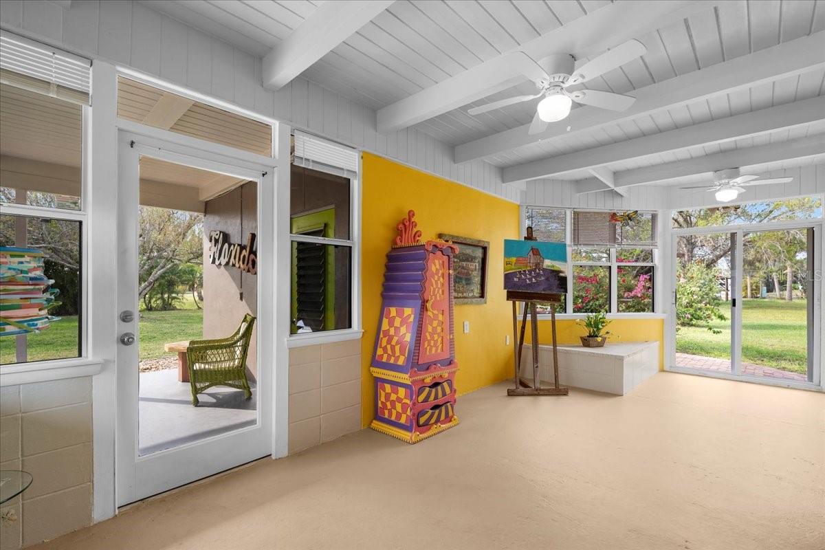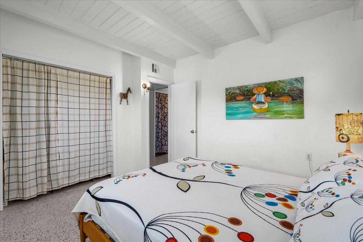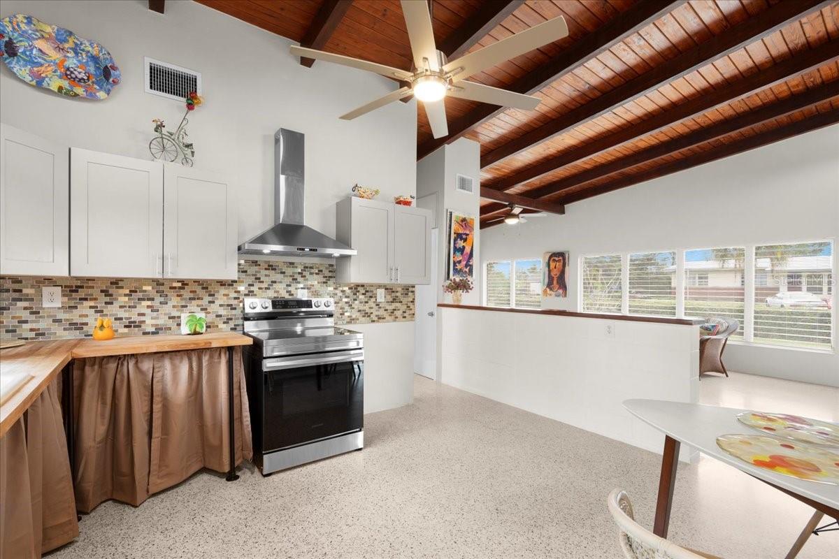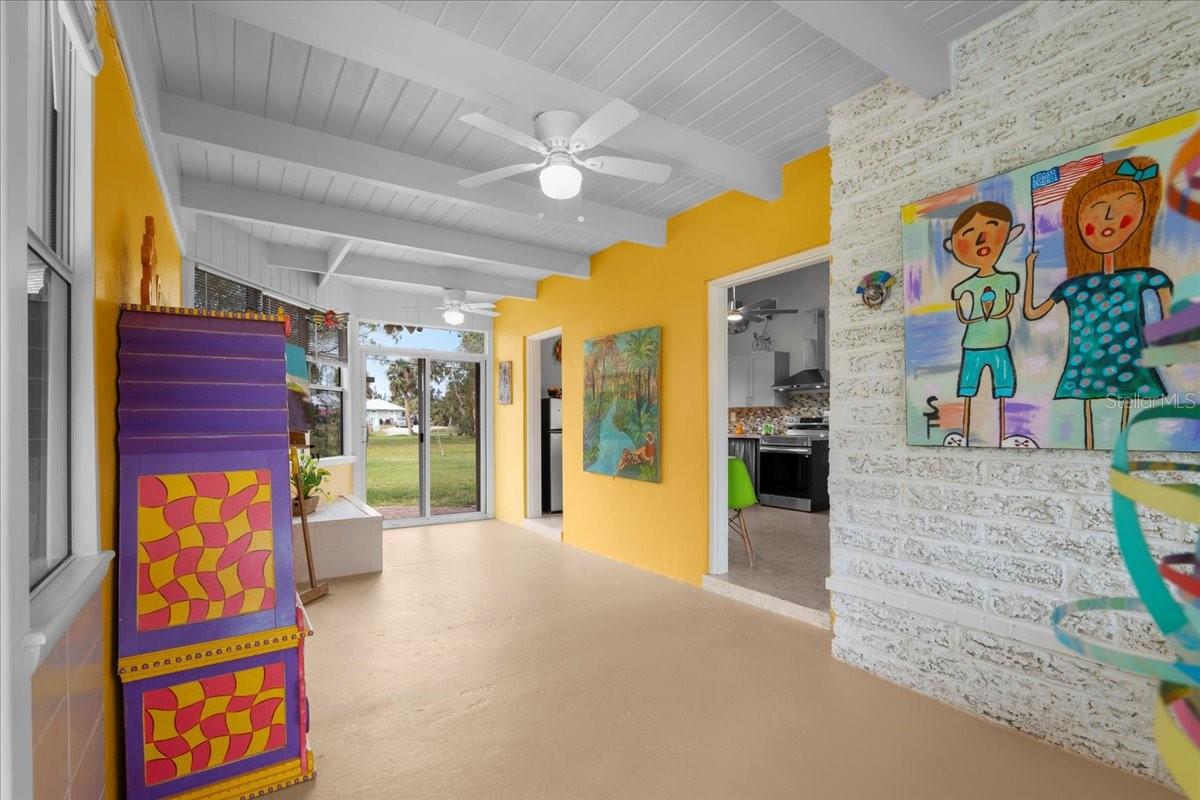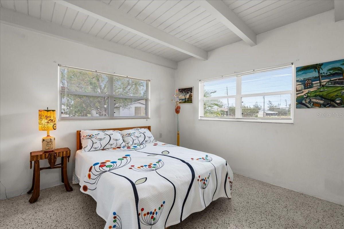 Welcome to this stunning MID-CENTURY modern BLOCK home, a true architectural gem nestled on a spacious DOUBLE LOT only moments from downtown Punta Gorda! Custom-built in the 1950s, this unique home seamlessly blends vintage charm with modern updates, creating a space that is both stylish and functional. Thoughtfully designed, it features beautiful TERRAZZO flooring throughout, striking 16' high wood inlay accent ceilings and transom windows that flood the open-concept interior with natural light. At the heart of the living area, a one-of-a-kind custom made wood burning fireplace adds warmth and character, making it the perfect space to relax or entertain. The beautifully updated kitchen is everything you really need, boasting BUTCHER BLOCK countertops, soft-close solid wood cabinets, a seamless tile backsplash, and a brand-new stainless steel stove with vented hood! Adjacent to the kitchen and living area, a versatile BONUS room offers the perfect spot for an art studio, crafting room, or even a cozy reading nook. The primary suite and additional bedroom feature wood ceilings that scream Florida charm. The primary bathroom has been updated with a stunning tiled walk-in shower, with a niche and sliding glass door. All your storage needs are met with numerous hallway storage closets and a dedicated laundry room off your carport with built-in storage shelfing and washer/dryer hookups add to the home’s practicality. Significant updates provide peace of mind, including a NEW ROOF (2022), new ELECTRICAL panel (2020), brand-new NEW A/C and HOT WATER HEATER, and many updated windows throughout the home. Outside, you'll notice the beautifully landscaped rocked beds, lined with concrete curbing and perfectly pruned front hedges, frame the thoughtfully planted Florida landscaping, enhancing its curb appeal. The private backyard, provides a plethora of room for activities, complimented with a paver LANAI & privacy fence, creating a tranquil escape for morning coffee or ideal for grilling out! Ideally located, this home is just minutes from downtown Punta Gorda, where you can explore waterfront dining, boutique shopping, and lively events at Laishley Park. Just down the street, the Darst Park Boat Ramp located only walking distance away, offers easy access to the Peace River and intercoastal waters for boating, kayaking, and fishing. Nature lovers will appreciate being near the beautiful Punta Gorda Botanical Gardens, a serene spot perfect for a peaceful stroll among lush Florida flora. For a true local favorite, Peace River Seafood is just around the corner, serving up the freshest blue crab and seafood in a laid-back, authentic Florida atmosphere. With quick access to I-75, commuting is a breeze while still enjoying the charm of this vibrant community. With its unique architectural details, thoughtful upgrades, and unbeatable location, this mid-century modern masterpiece is truly one of a kind. Schedule your showing today and experience its charm firsthand!
